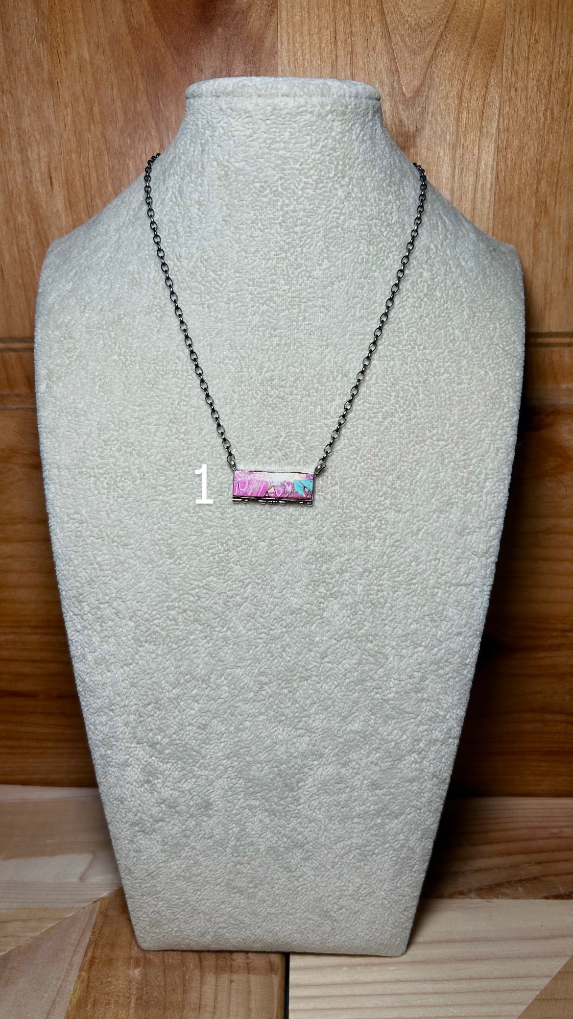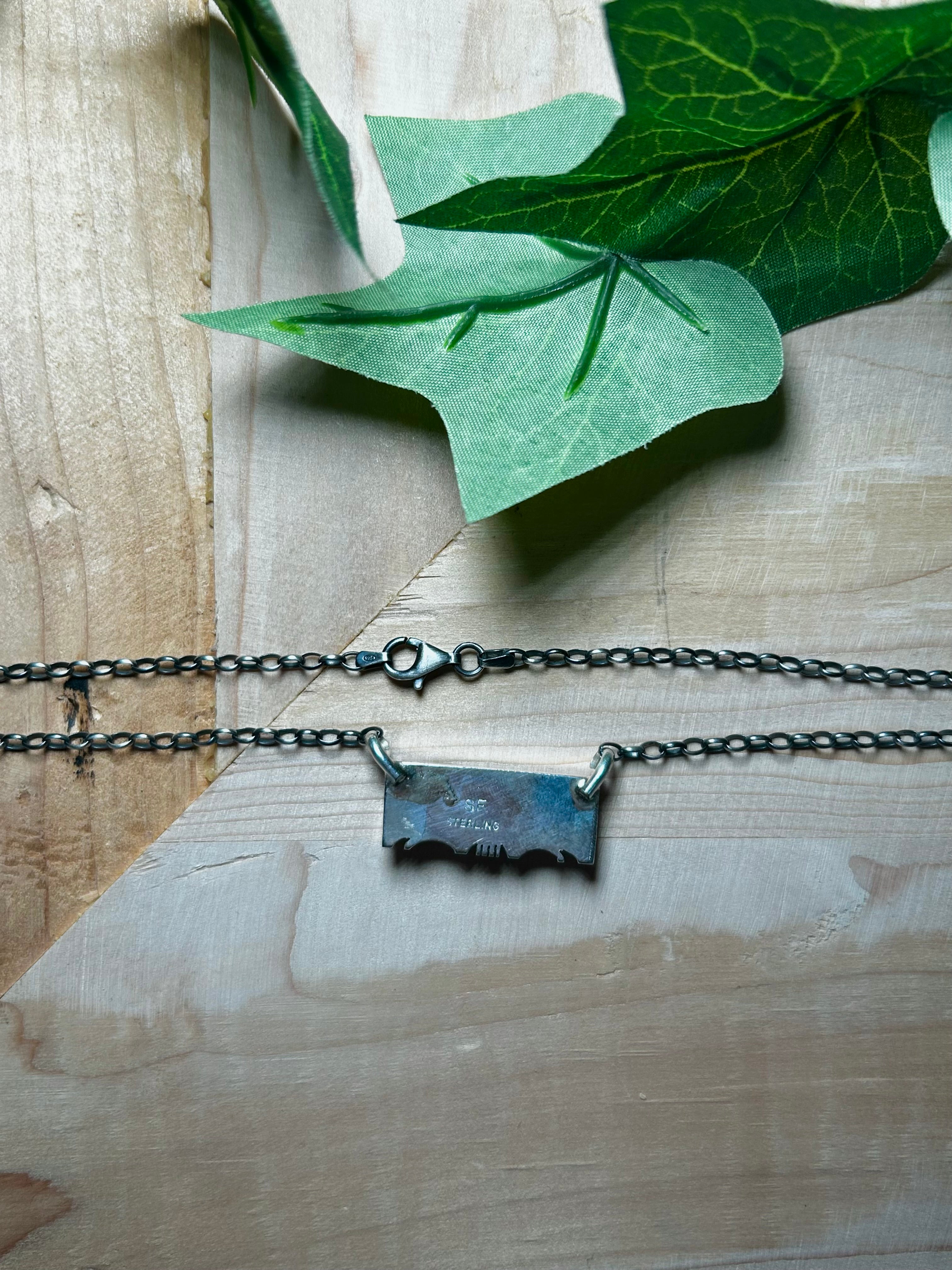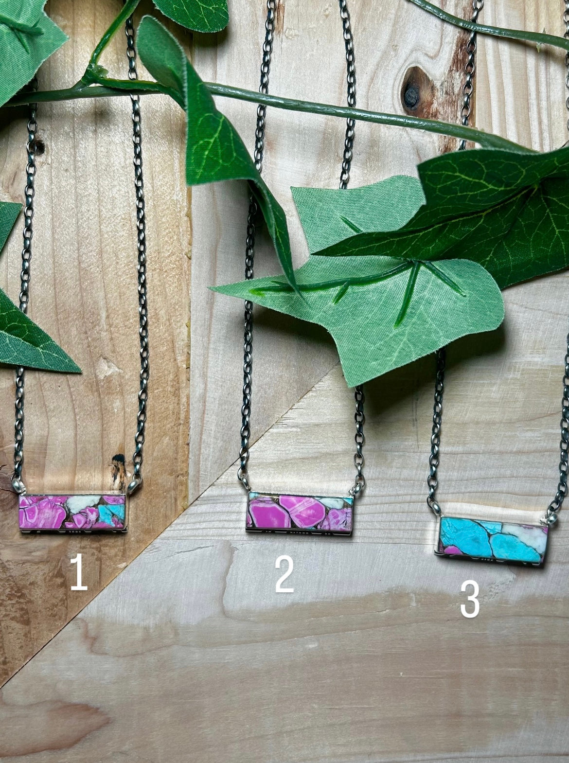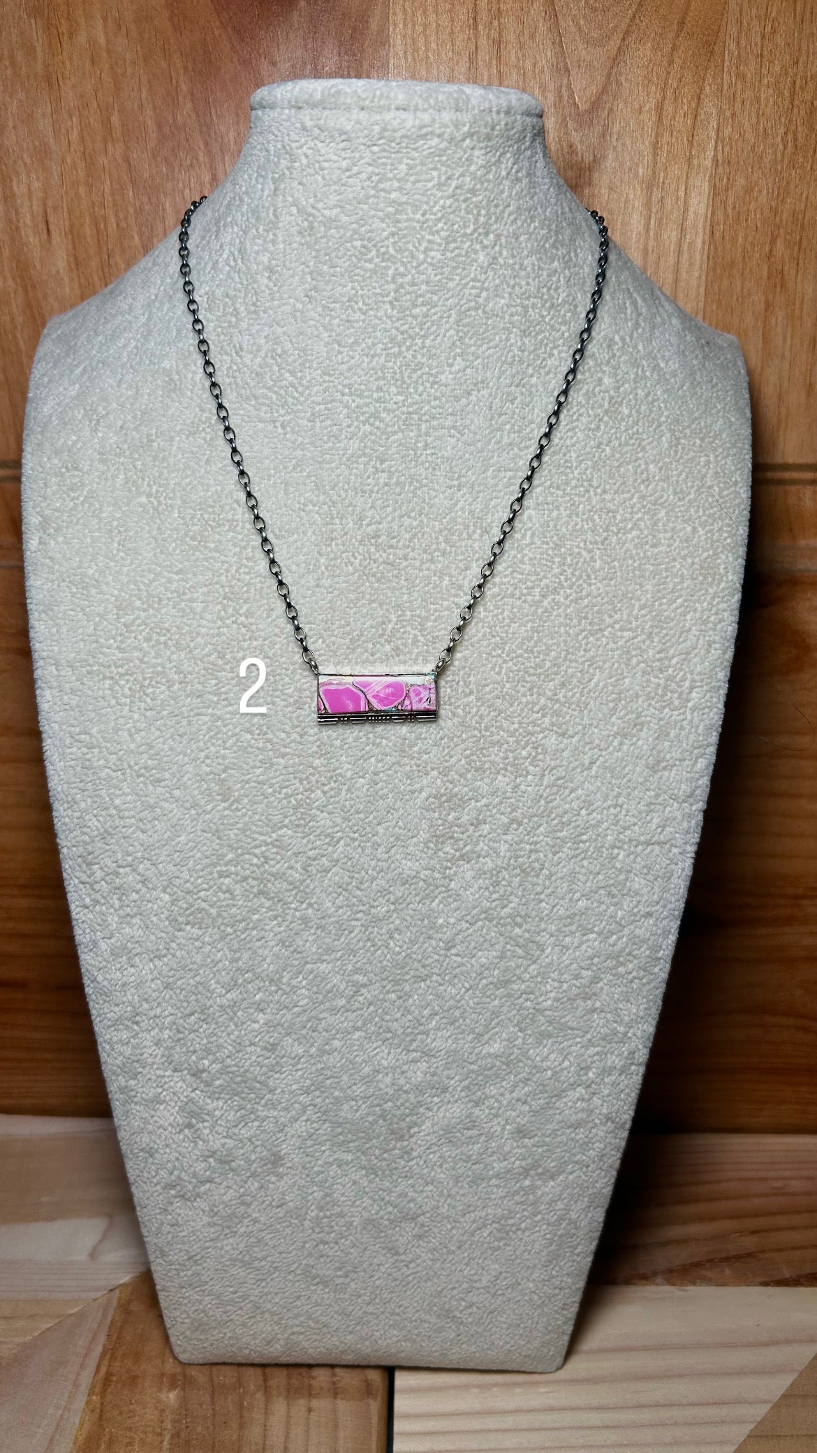 Steve Francisco Cotton Candy Mohave & Sterling Silver Necklace. It measures 16 inches long with hang while the chain by itself measures 17 3/4 inches long. Signed by the artist and stamped sterling silver.