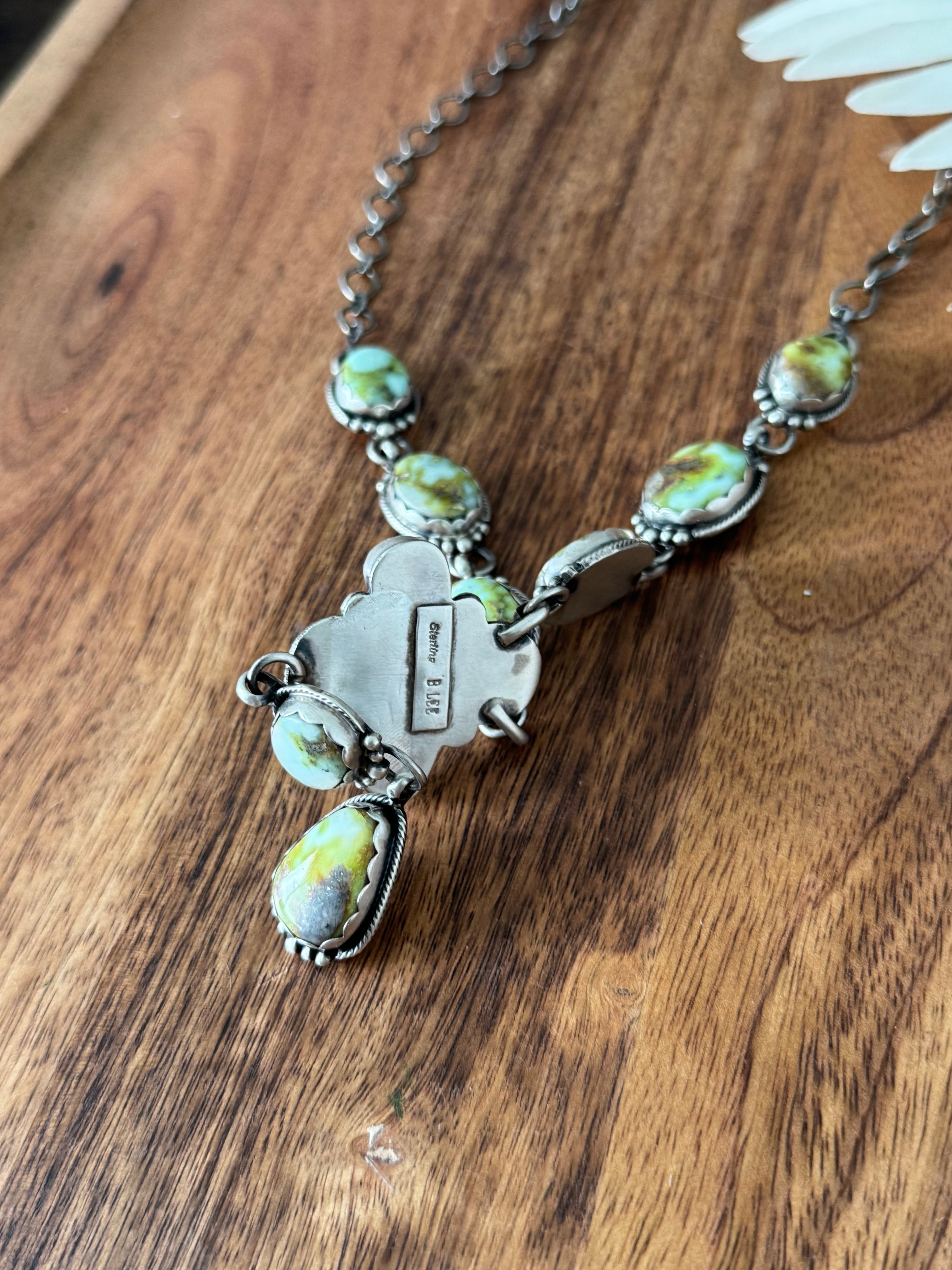Beautiful necklace. Betta Lee Palomino Variscite & Sterling Silver Necklace. It measures 27 inches long with hang while the chain by itself measures 20 inches long. Signed by the artist and stamped sterling silver.