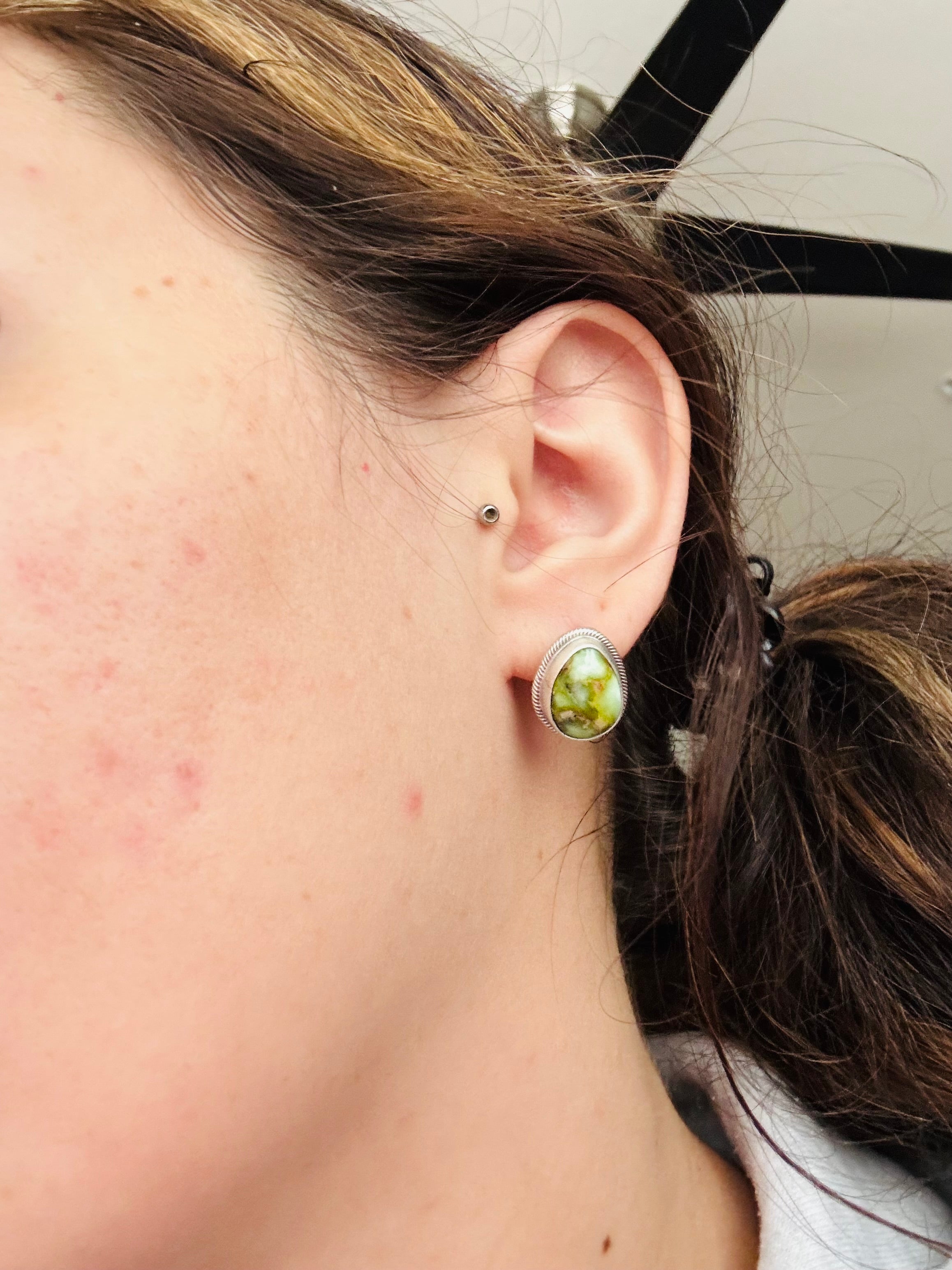 Beautiful post earrings. Sheryl Martinez Palomino Variscite & Sterling Silver Post Earrings. It measures 3/4 of an inch long and just under 3/8 of an inch wide. Signed and stamped.