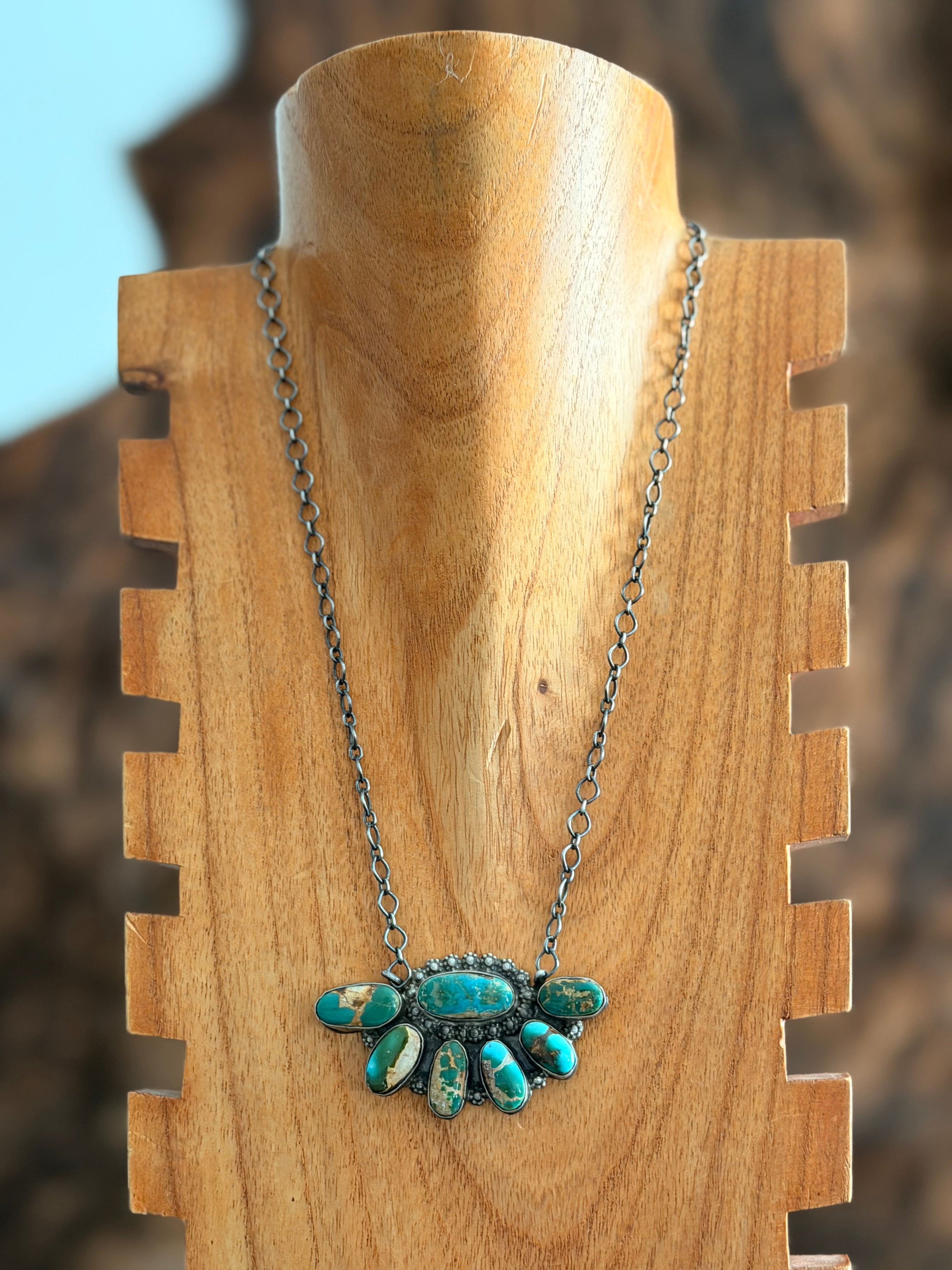Lorenzo Juan Natural Royston Turquoise & Sterling Silver Cluster Necklace. It measures 21 1/2 inches long with hang while the chain by itself measures 19 inches long. Signed by the artist and stamped sterling silver.
