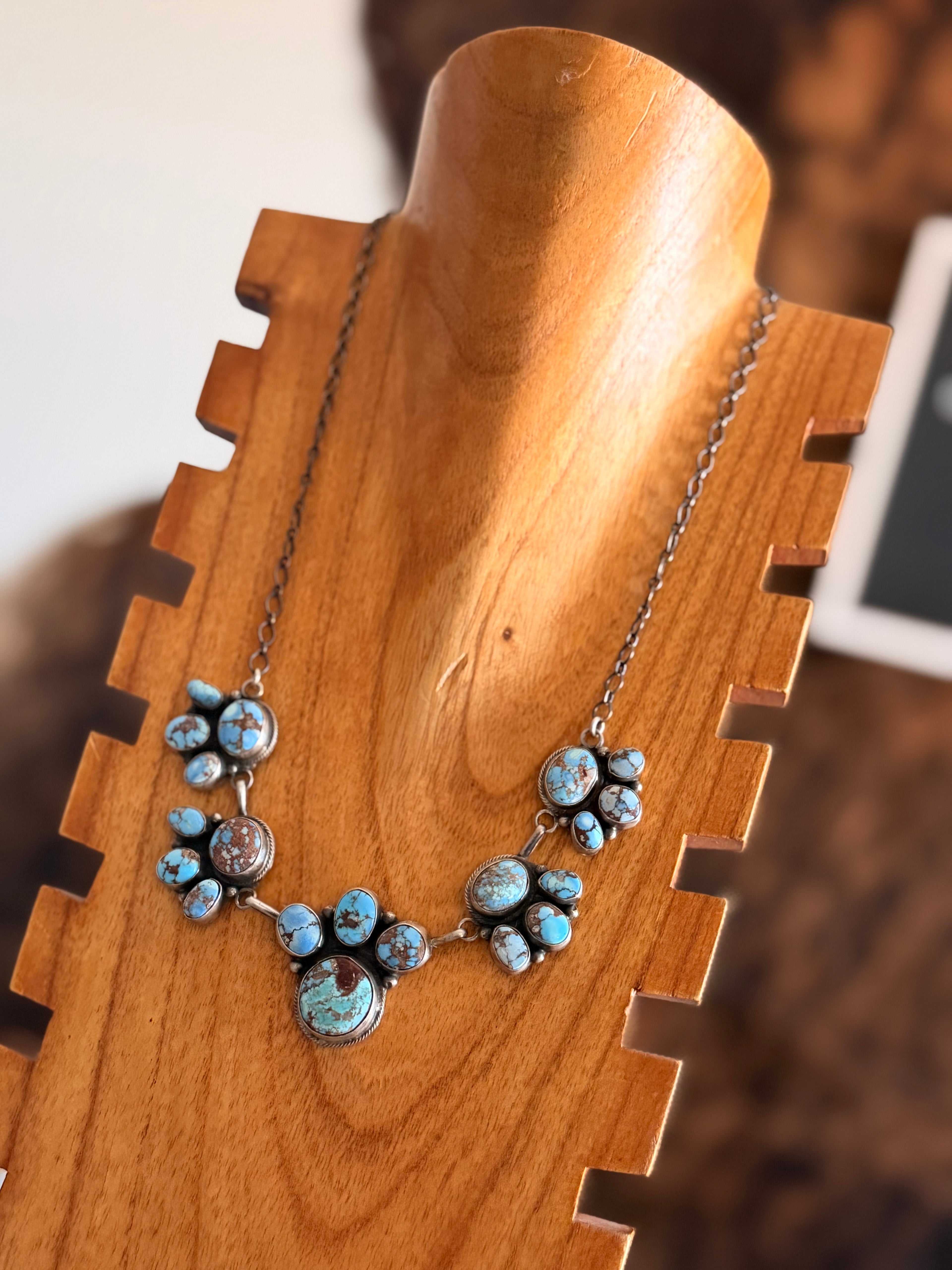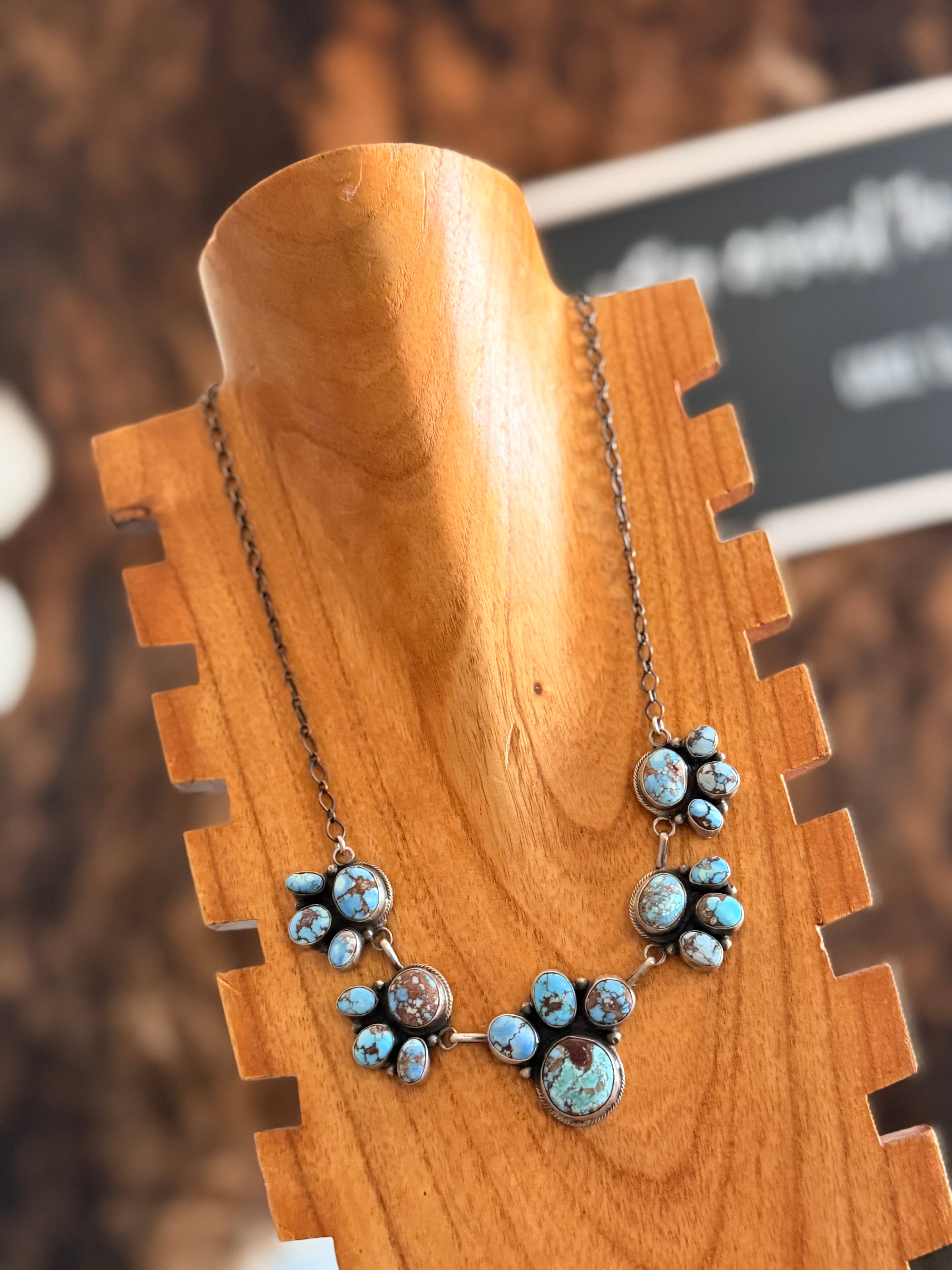 Lydia Begay Golden Hills Turquoise & Sterling Silver Cluster Necklace Set. The necklace measures 22 inches while the chain measures 20 inches long. Signed by the artist and stamped sterling silver.