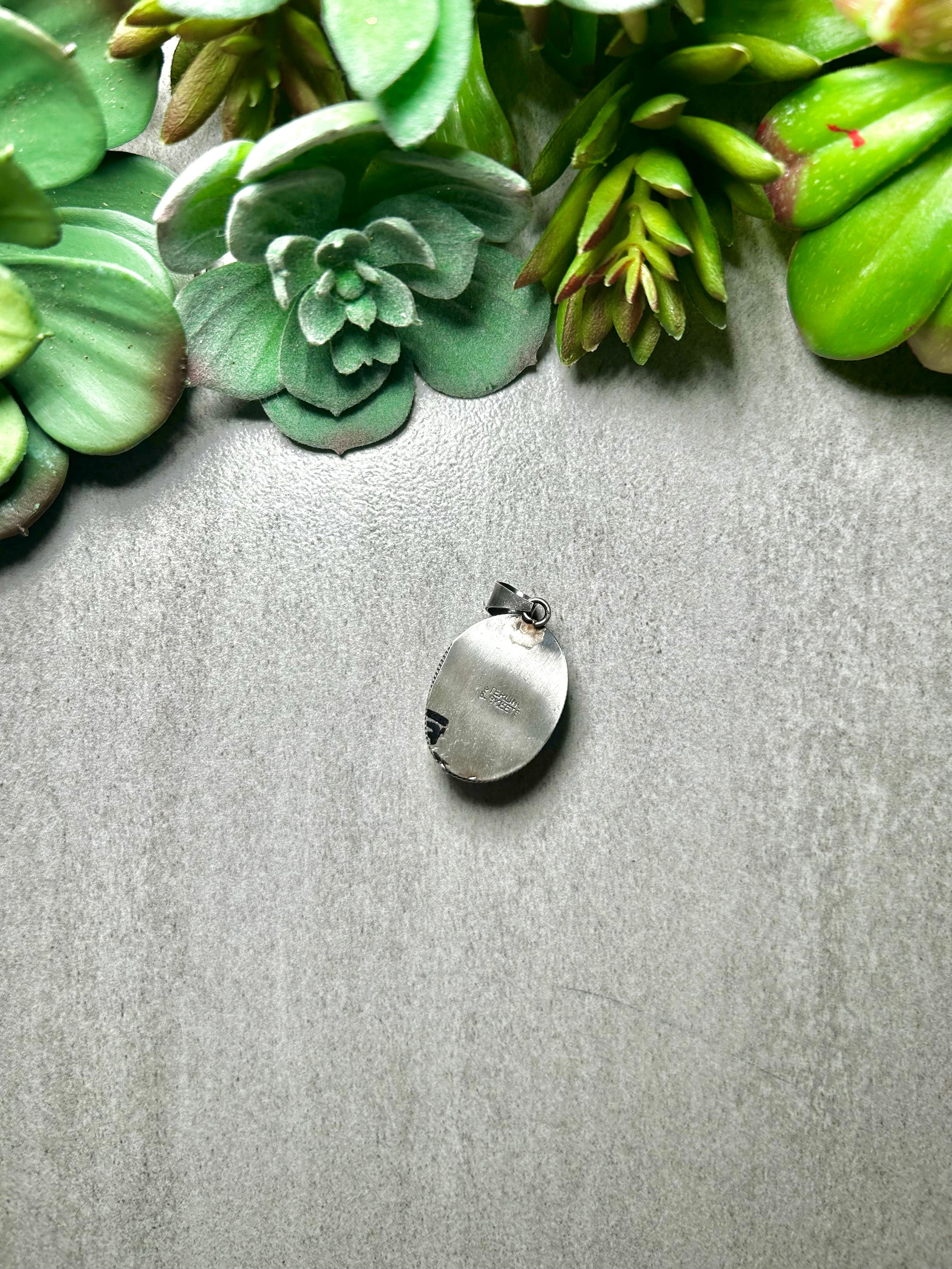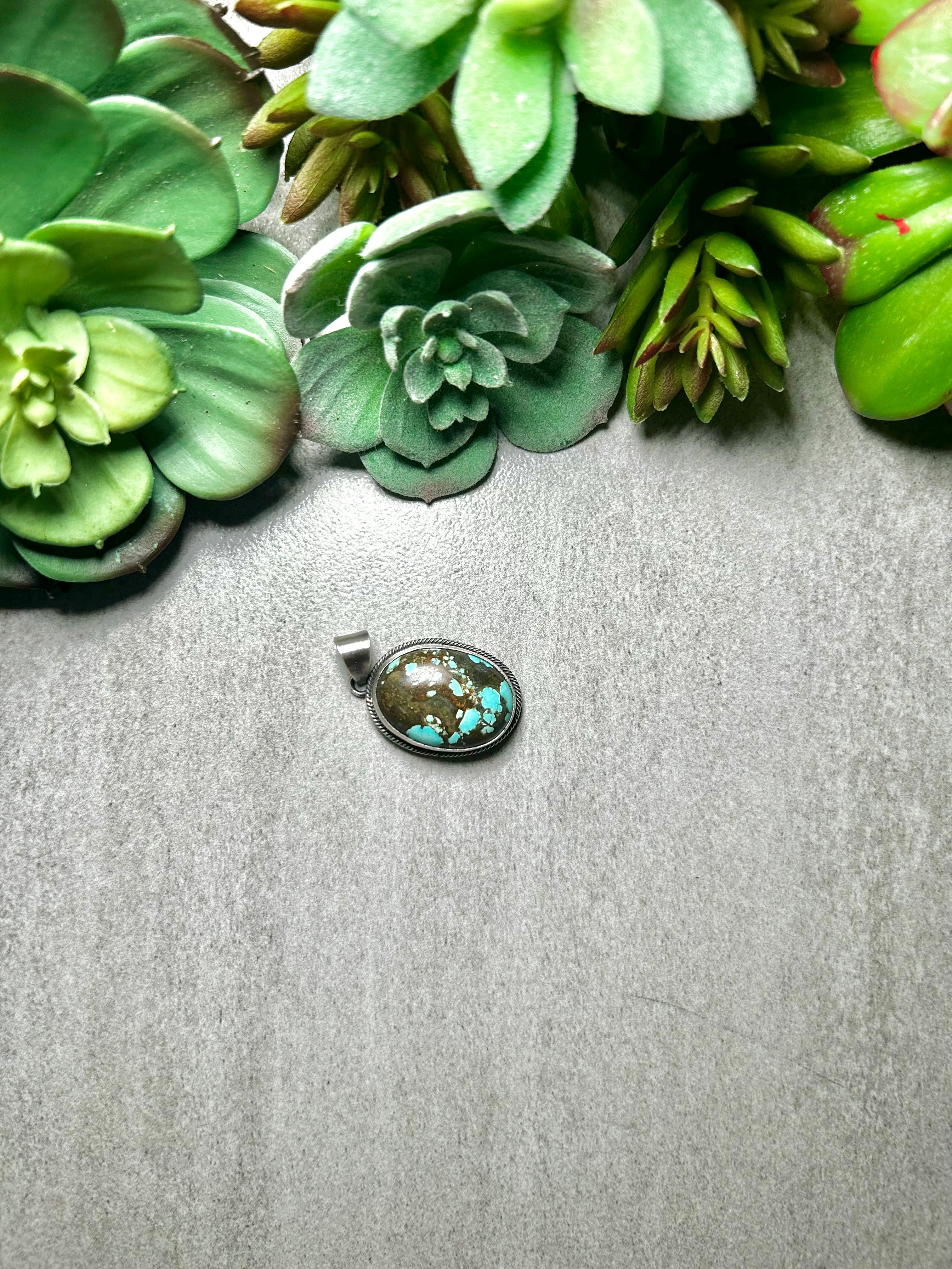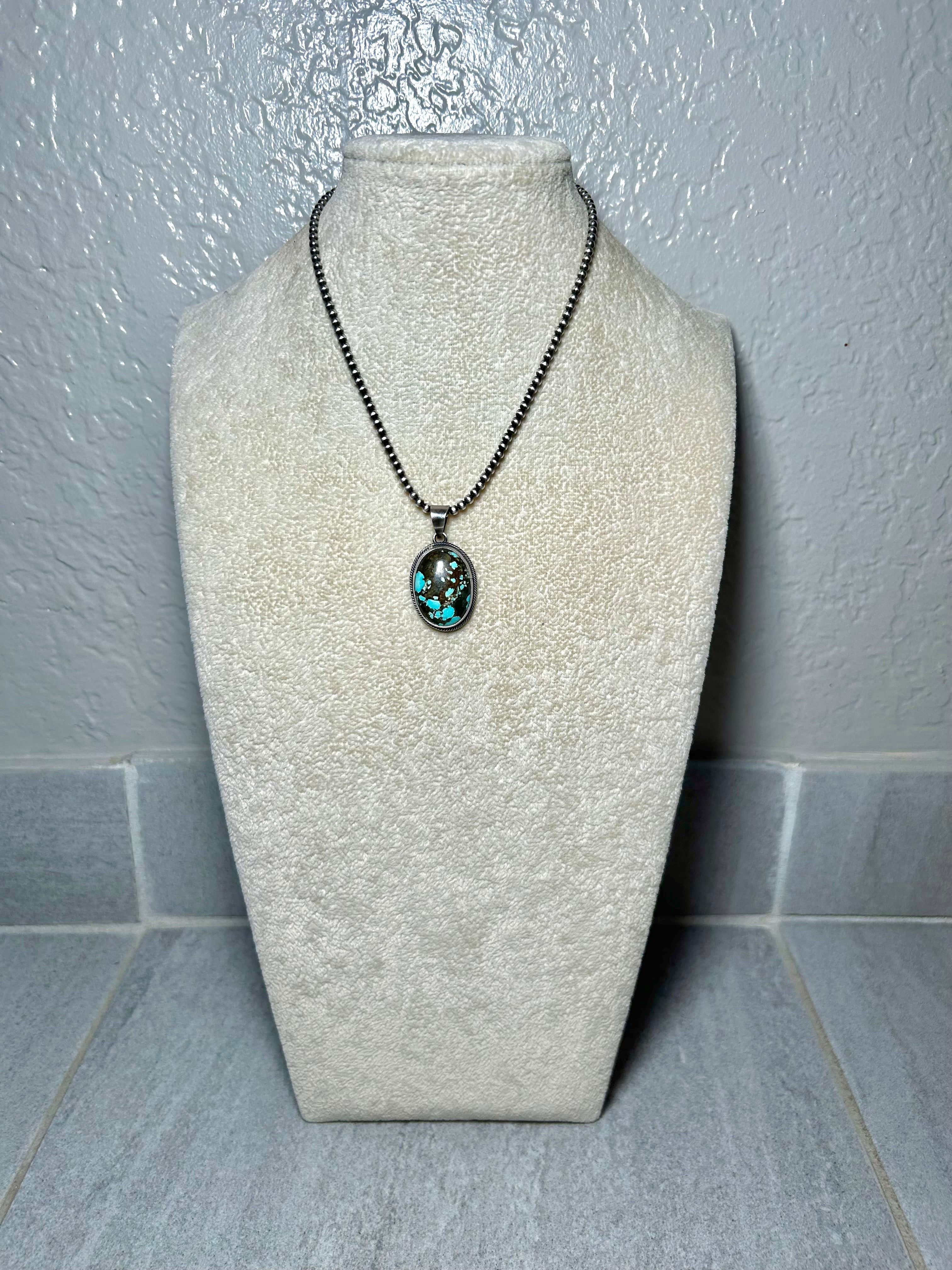 Scott Skeet #8 Turquoise & Sterling Silver Pendant. It measures 1 1/2 inches long and 7/8 of an inch wide. Pendant Only! Signed by the artist and stamped sterling silver.