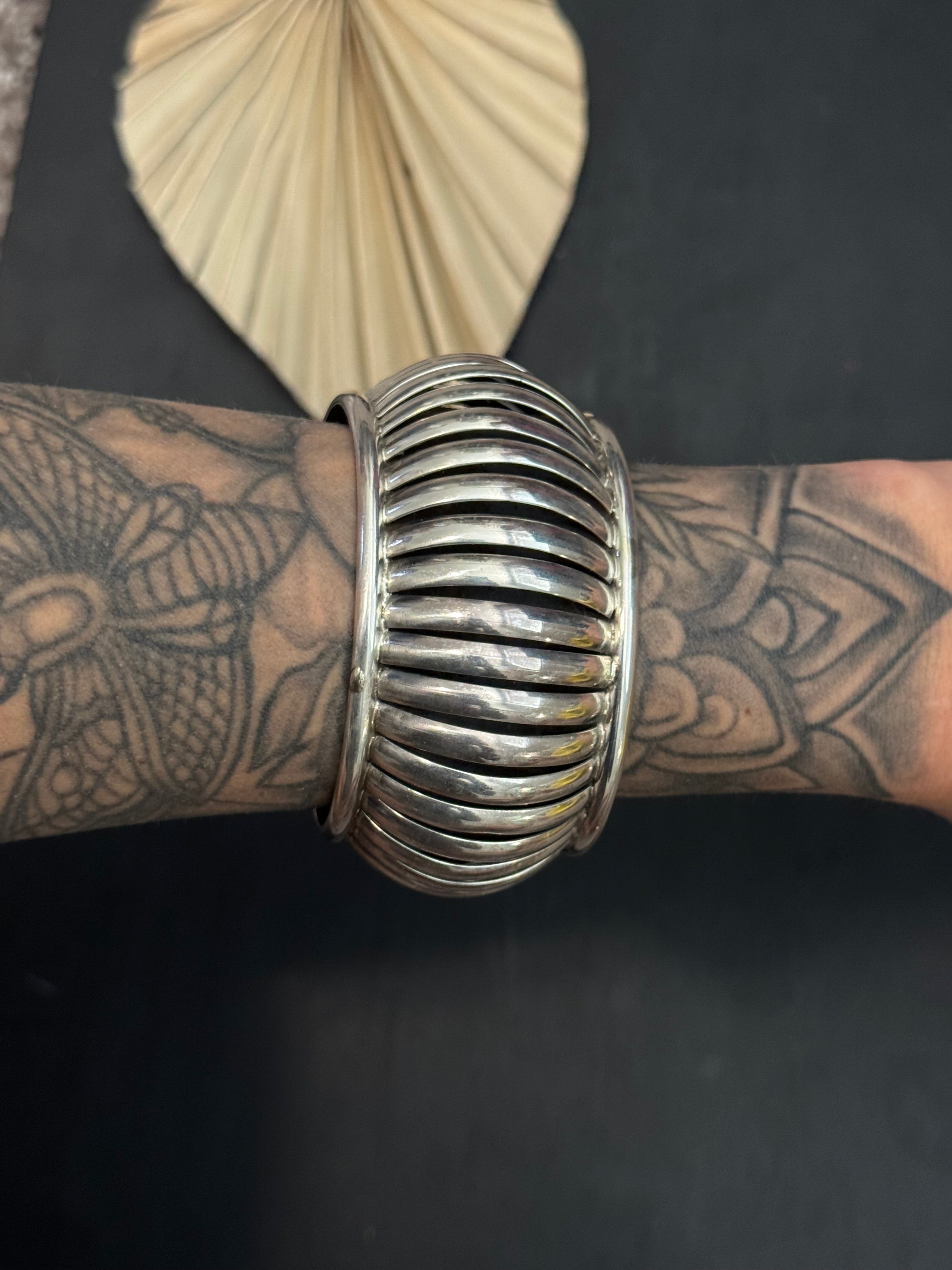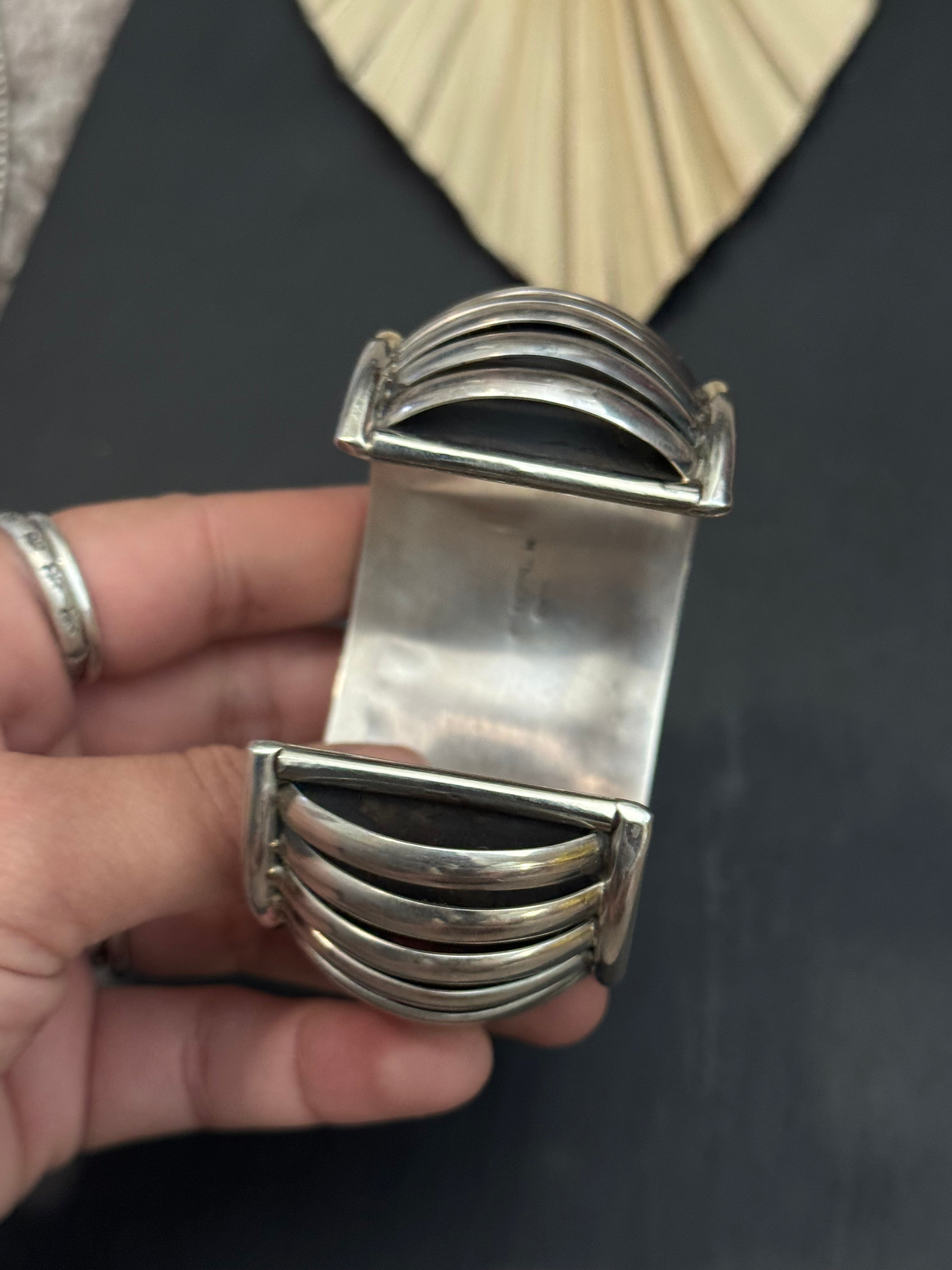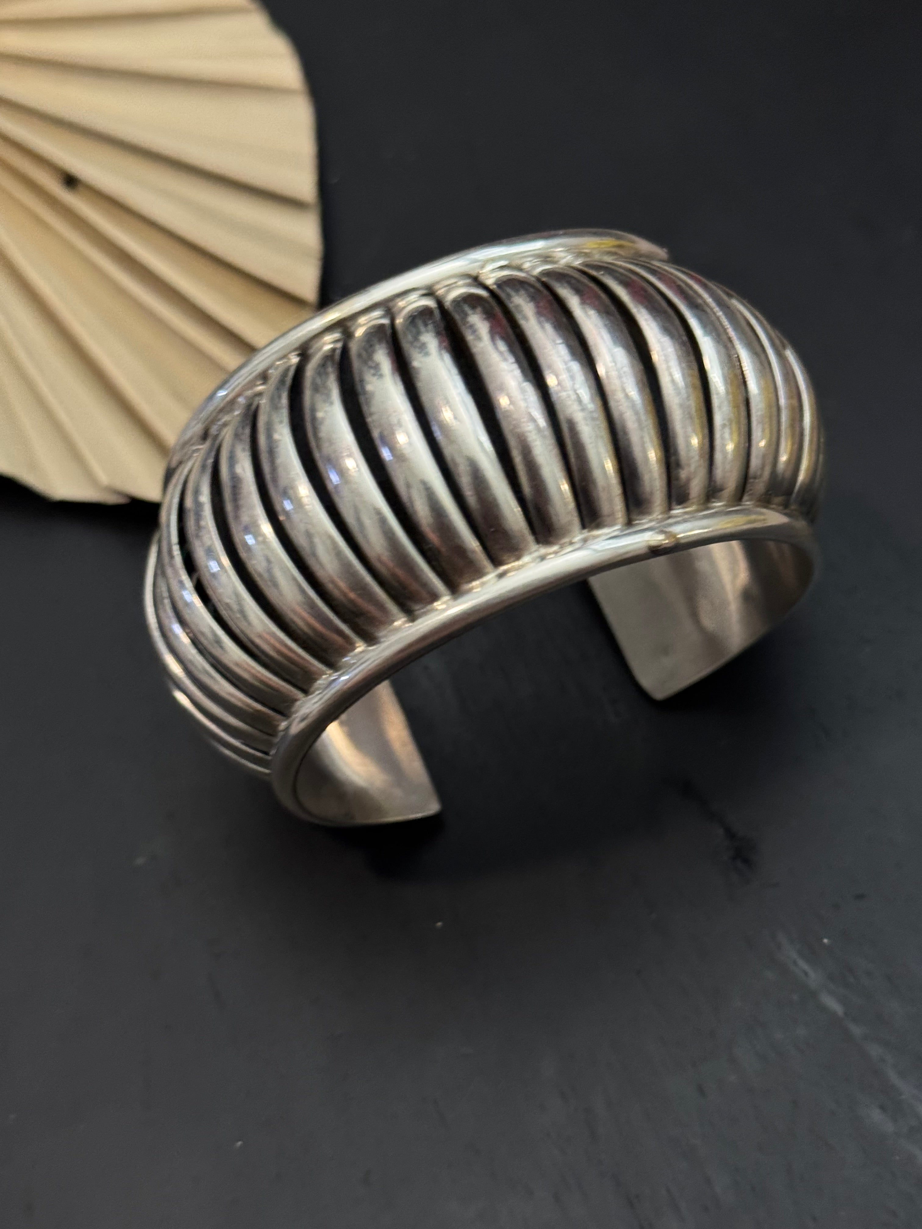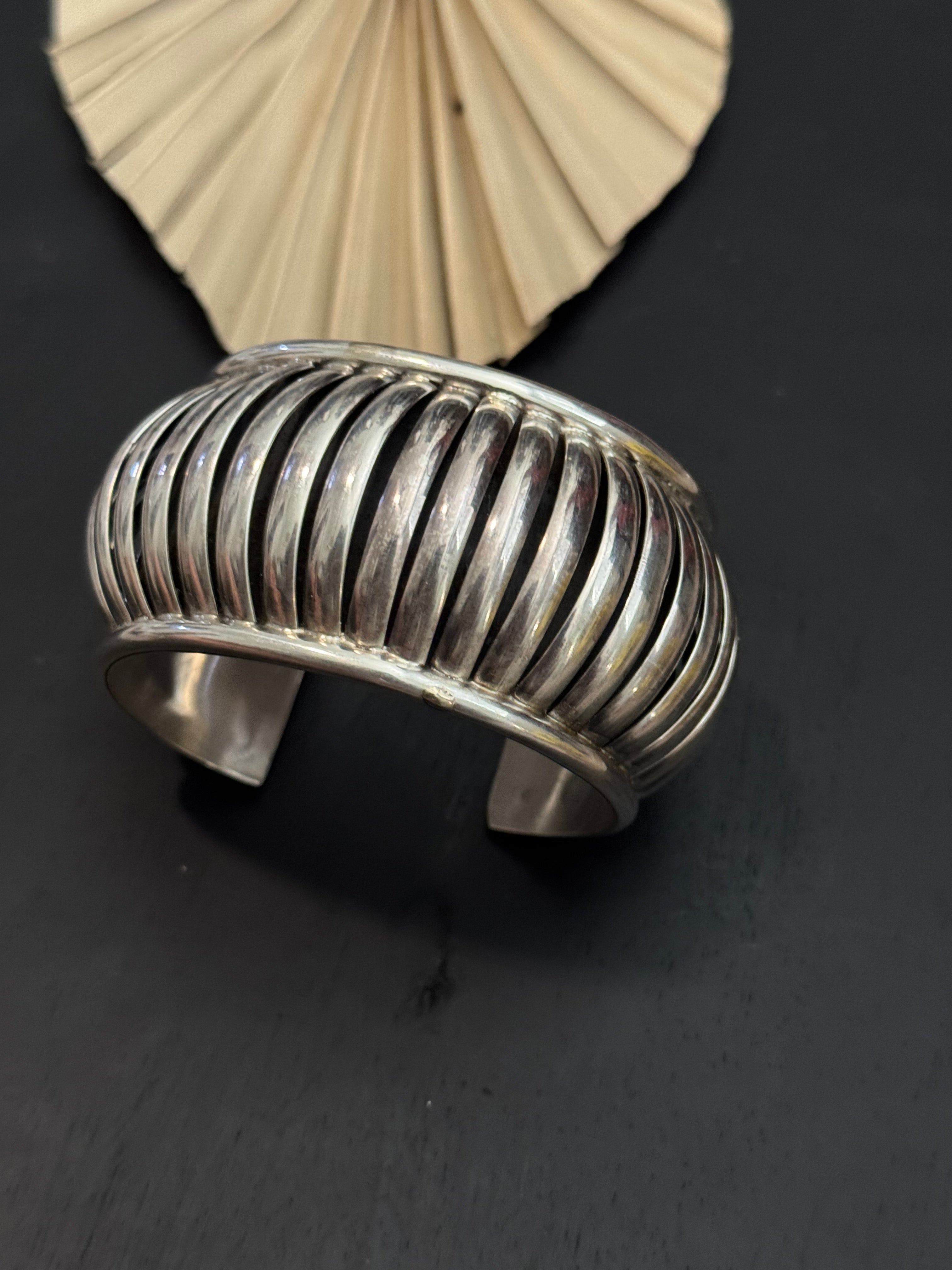 Mike Thomas Jr Sterling Silver Cuff Bracelet. It measures 1 1/2 inches wide with an inside circumference of 5 7/8 inches and a gap of 1 1/4 inches. Signed by the artist and stamped sterling silver.