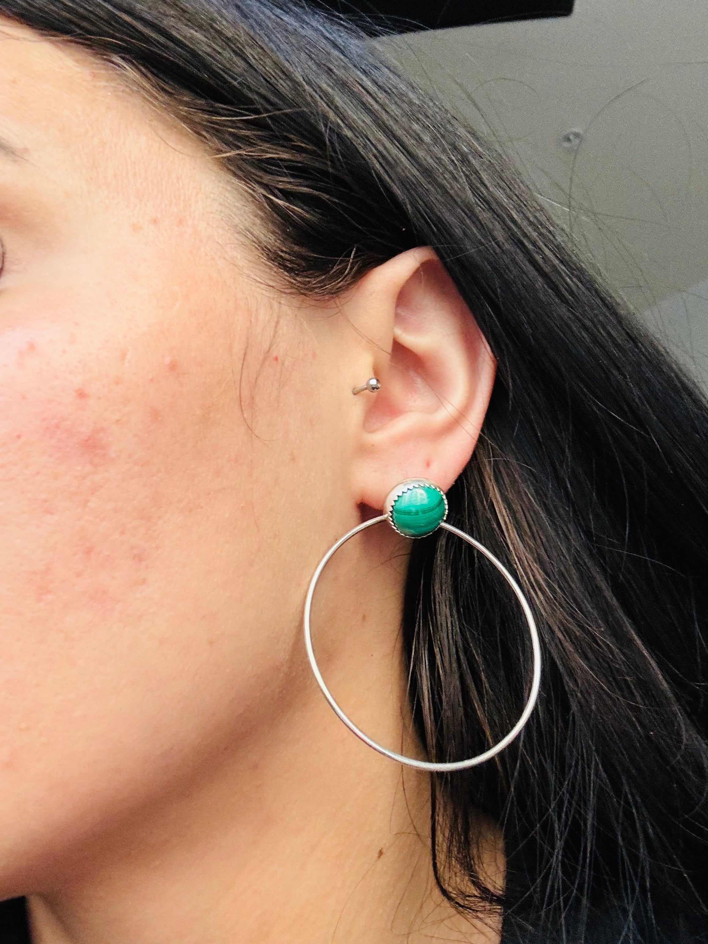 Look at these amazing Navajo Malachite & Sterling Silver Post Dangle Earrings. They measure 2 1/4 inches long and 1 5/8 inches wide. Stamped sterling silver. Stones will differ due to natural stones.