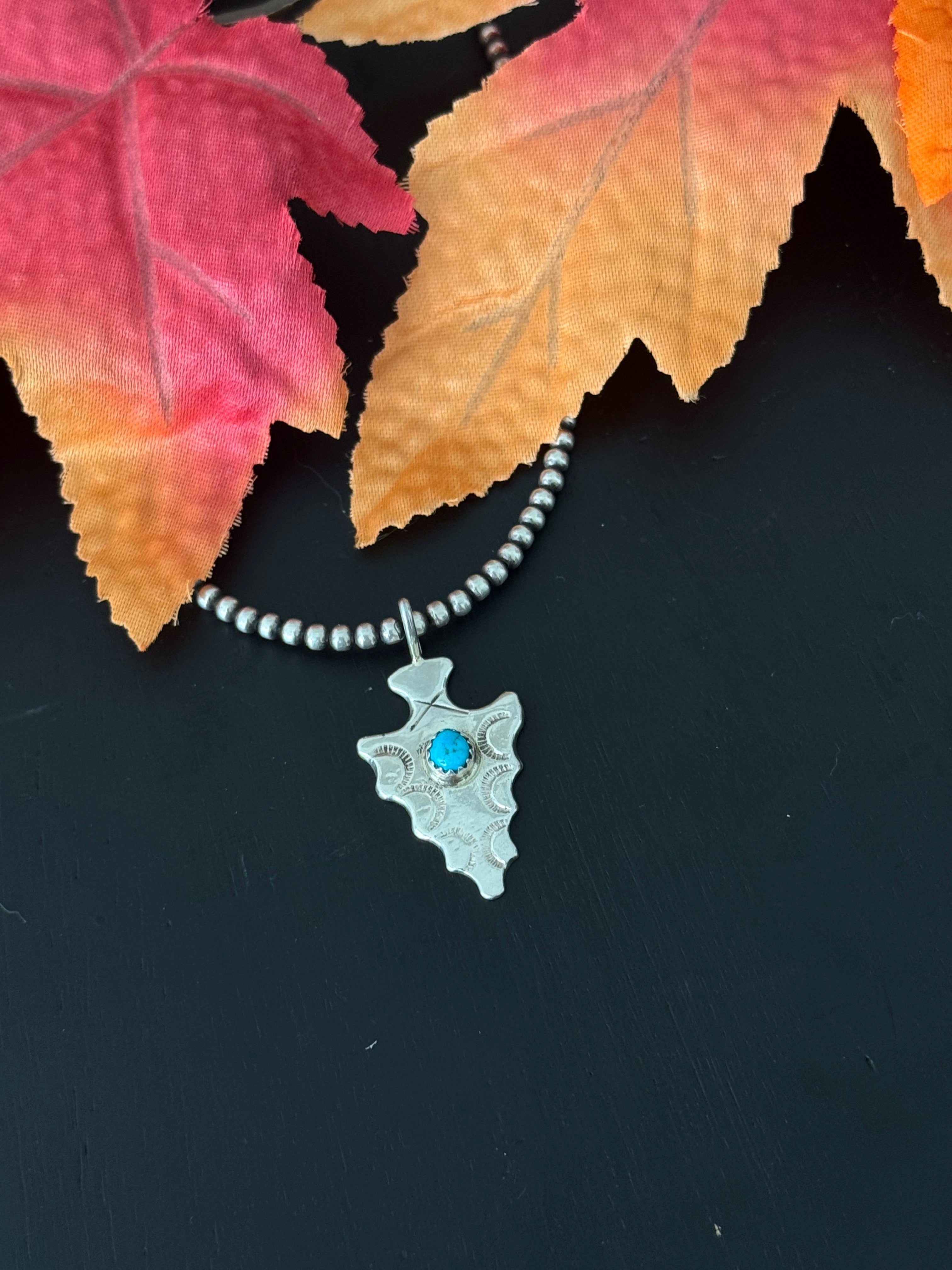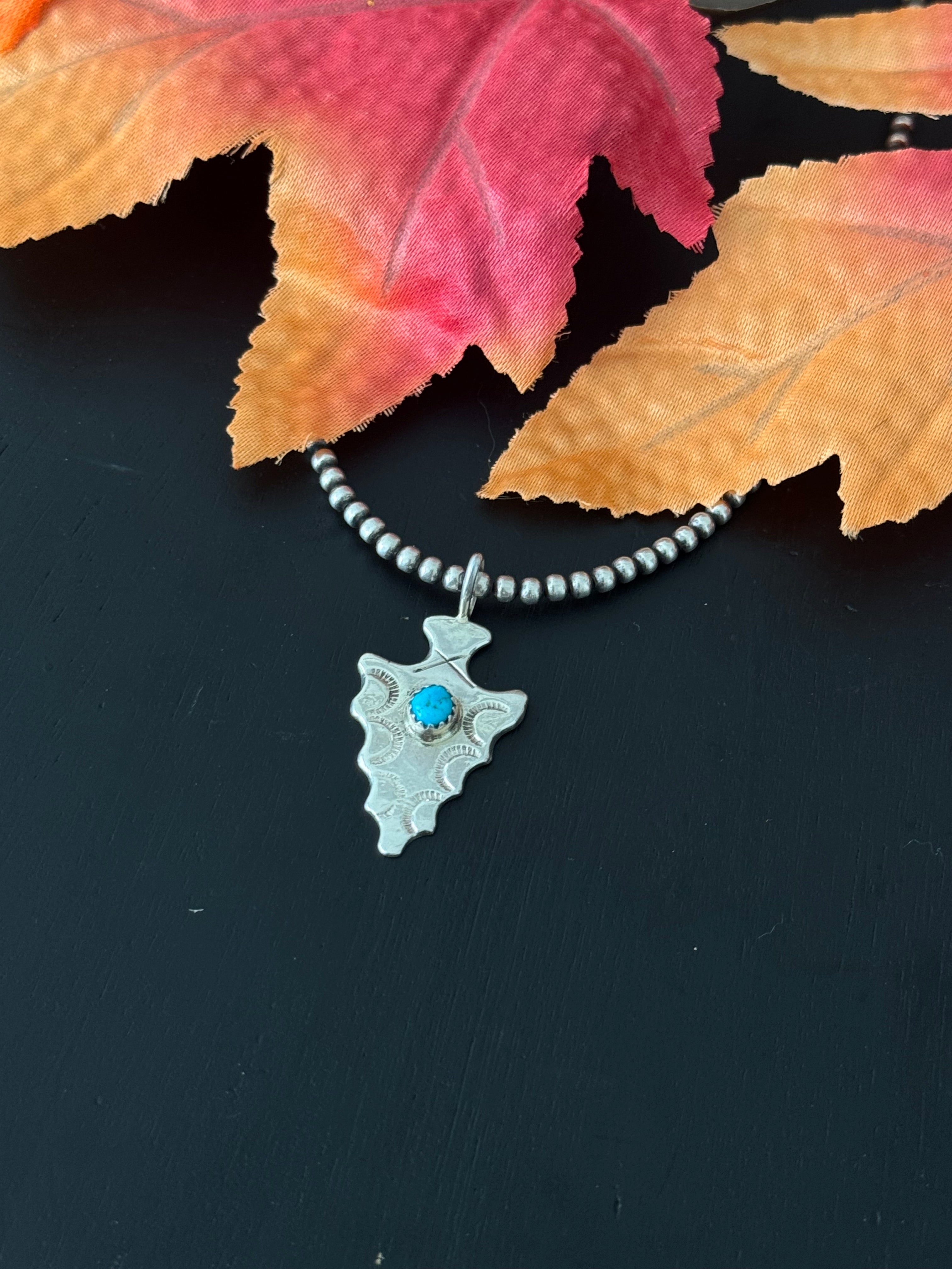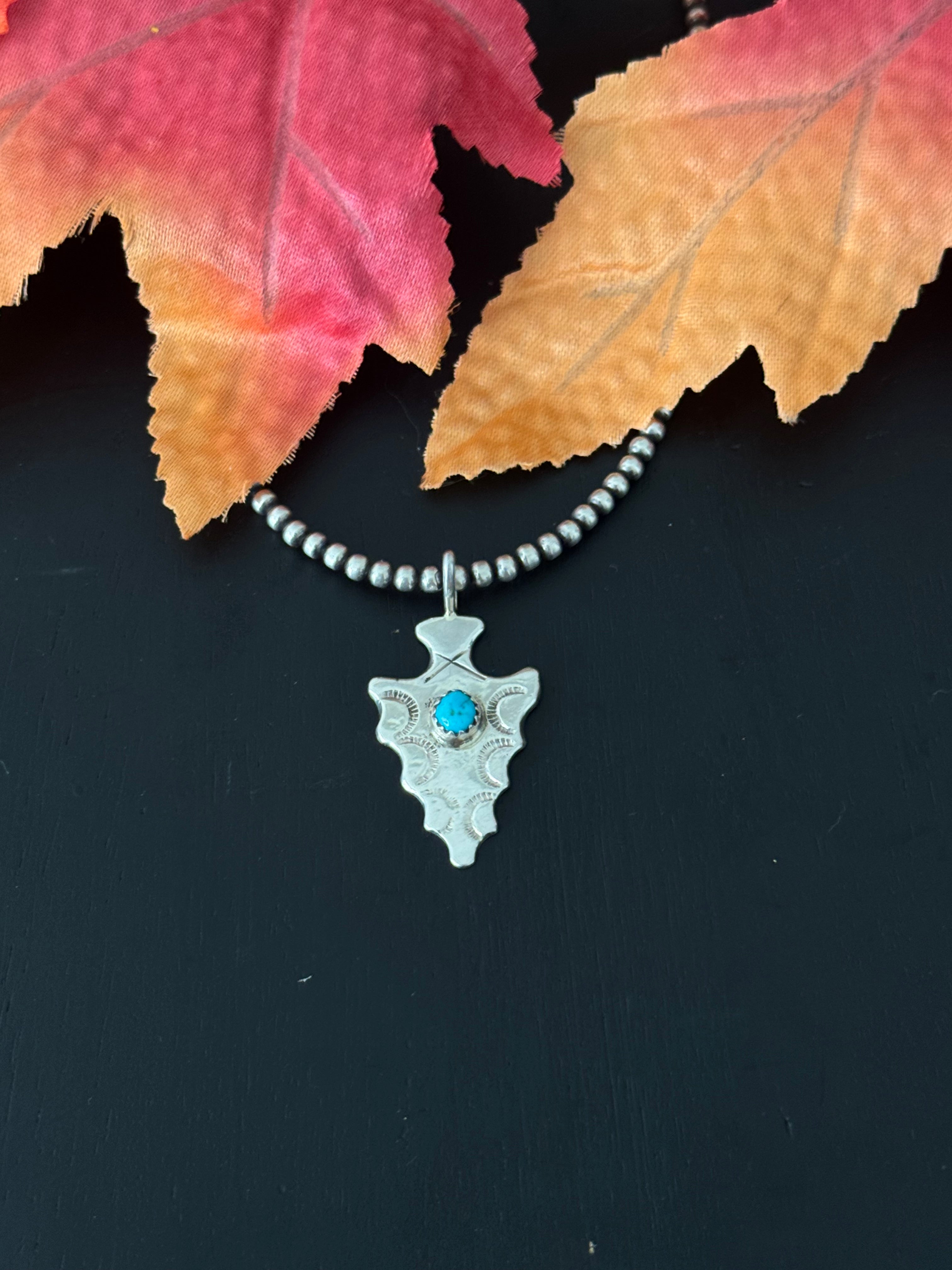 Beautiful pendant. Navajo Handmade Kingman Turquoise & Sterling Silver Arrow Pendants. It measures 1 3/8 inches long and 3/4 of an inch wide. Pendant Only. Signed by the artist and stamped sterling silver. Stones will differ due to natural stones.