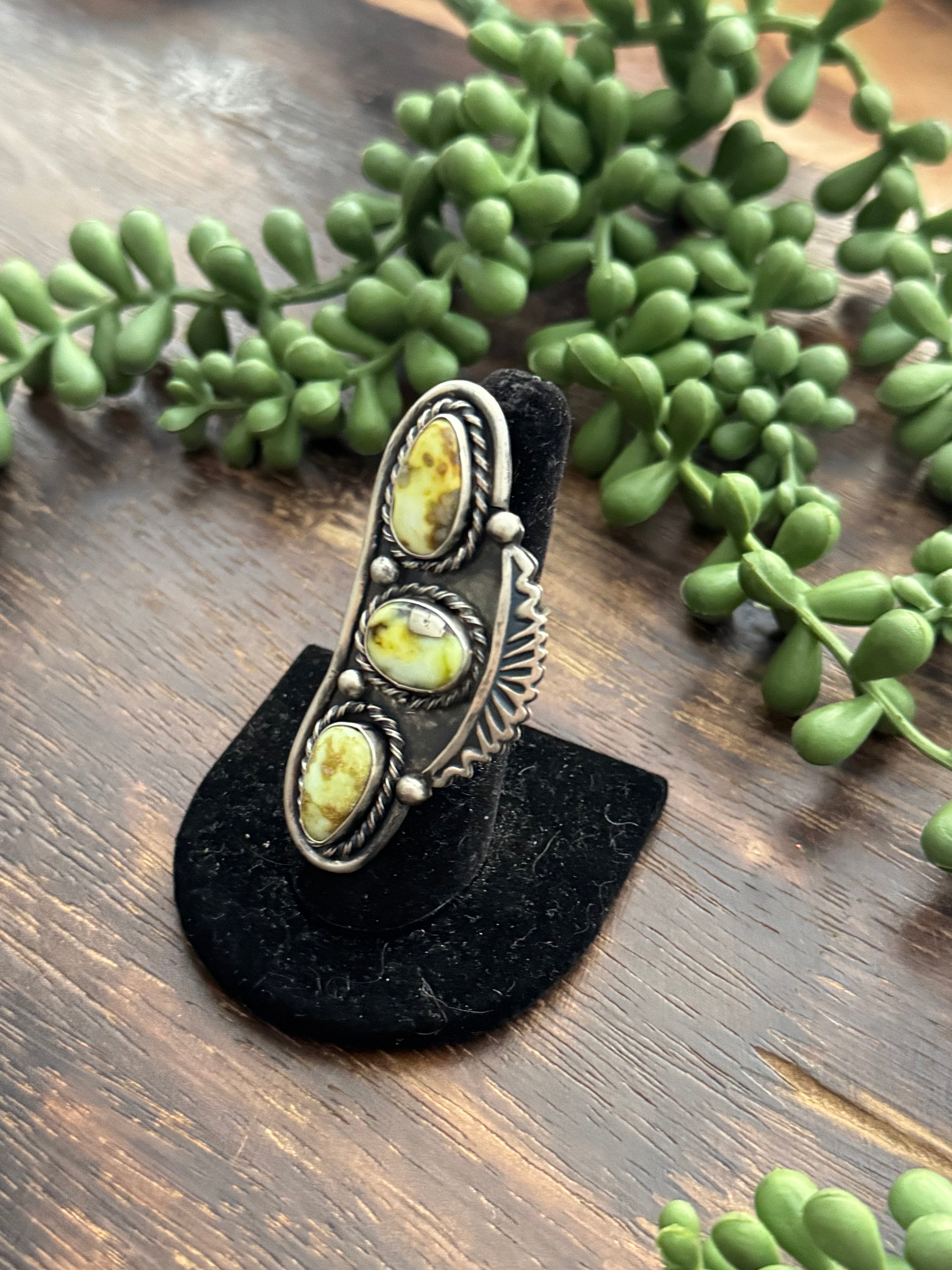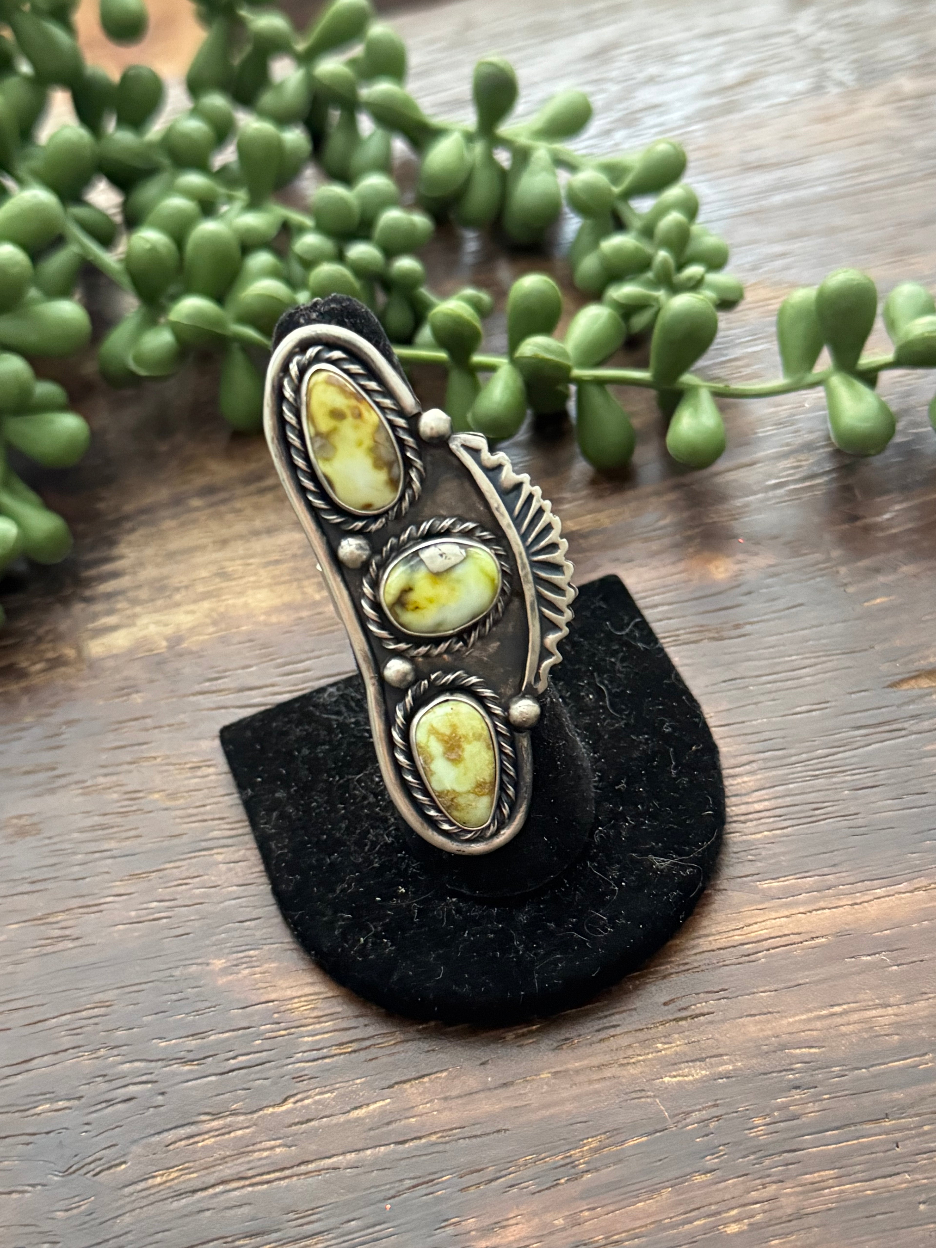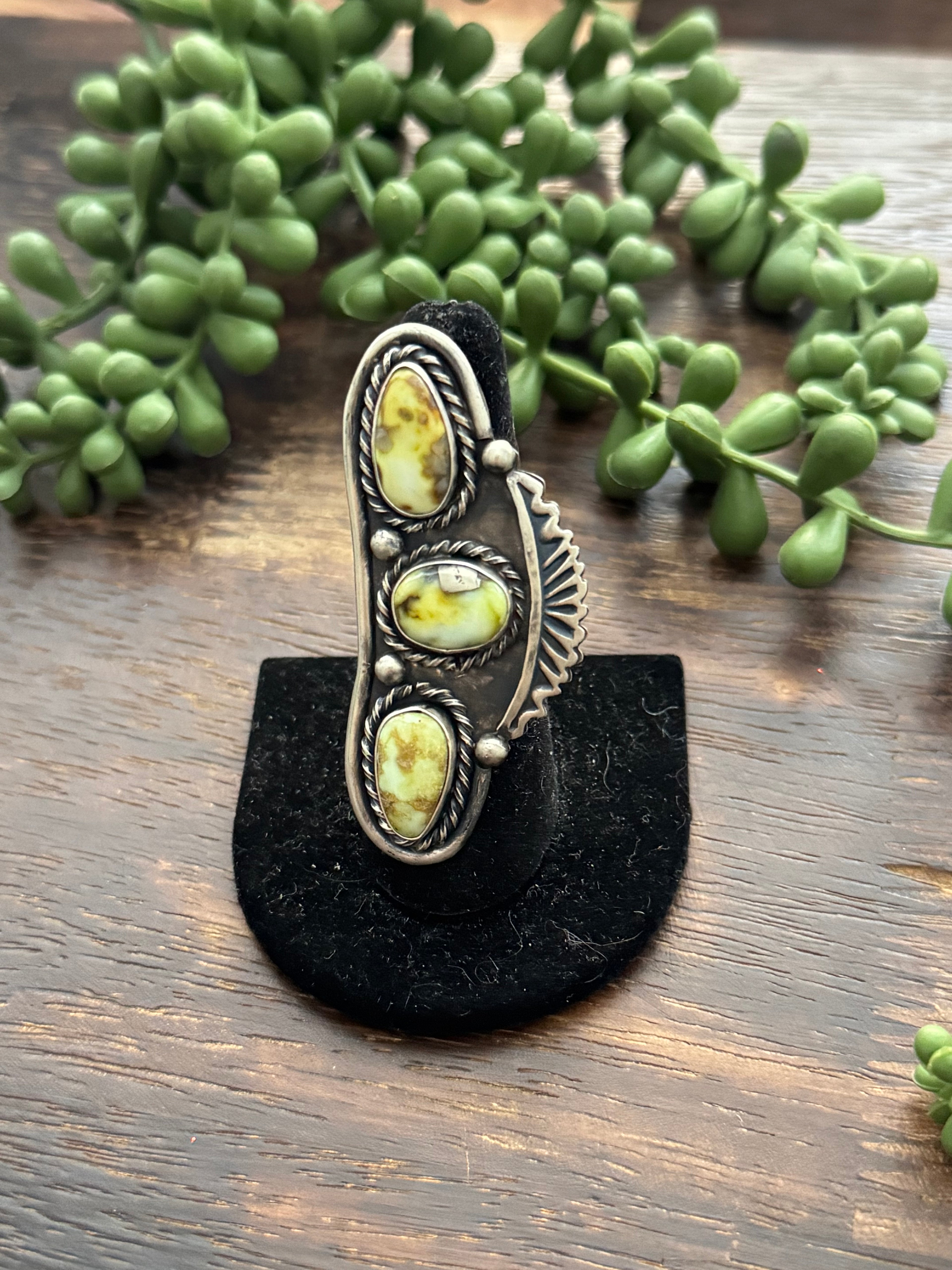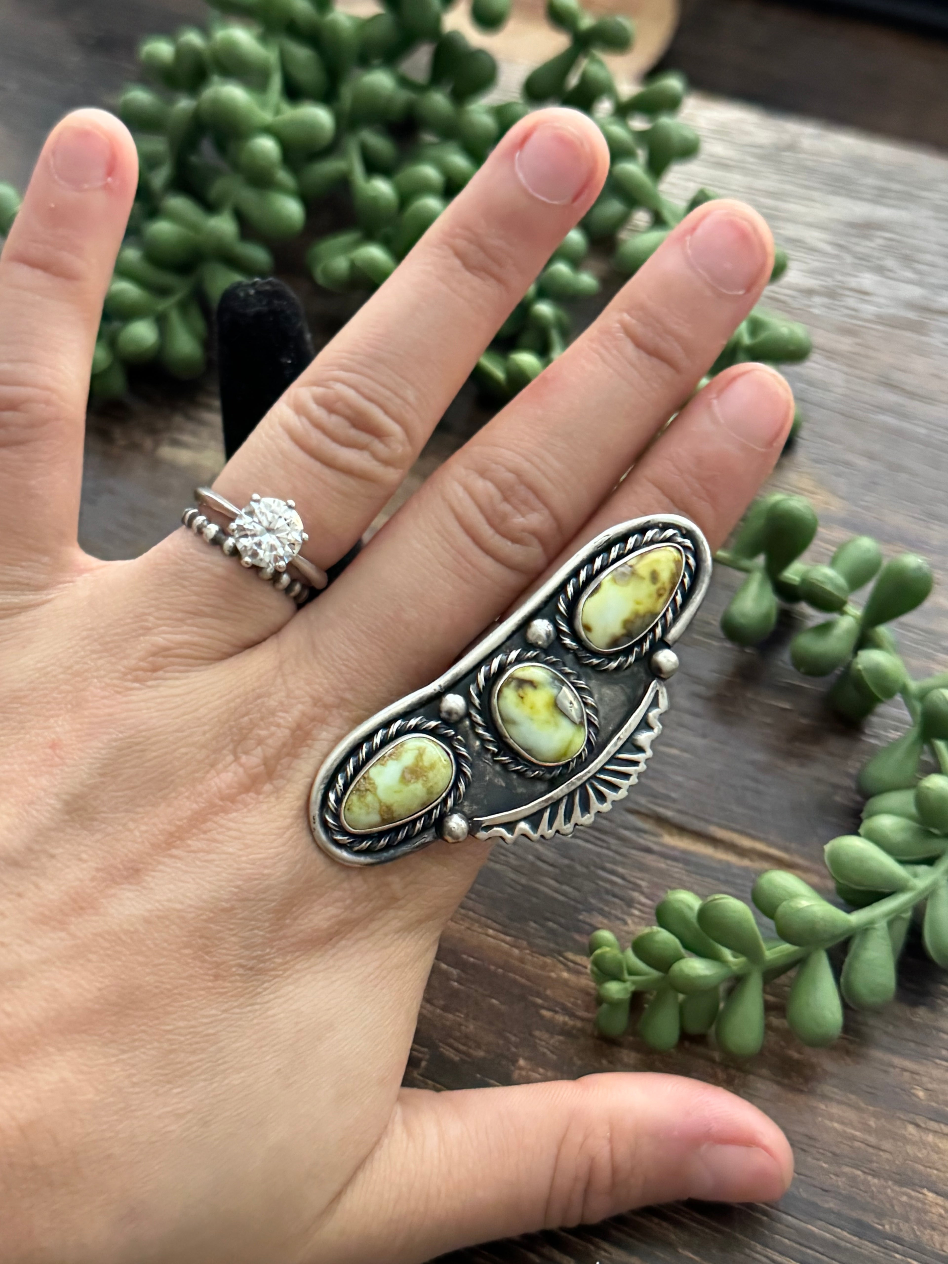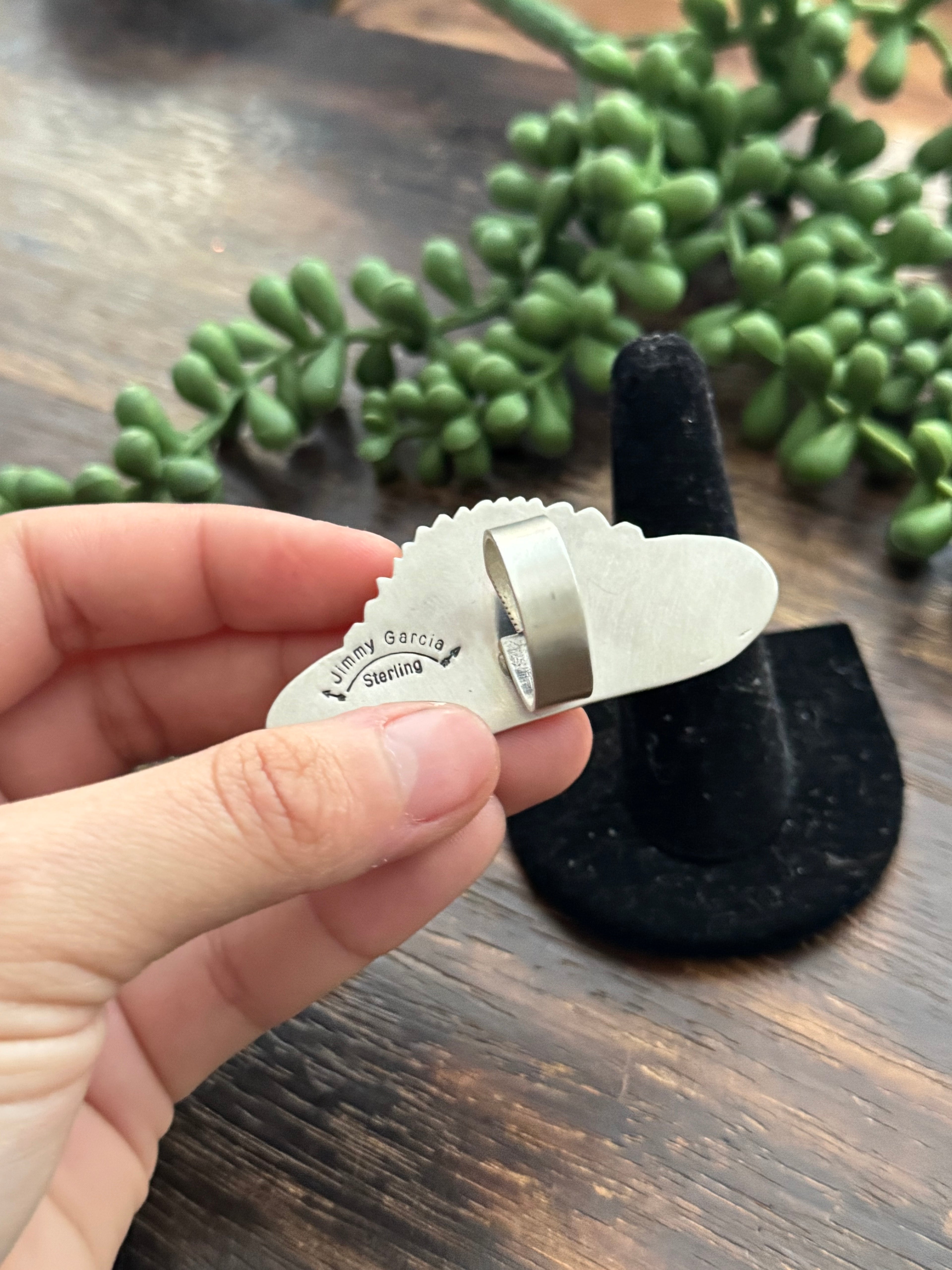 Amazing ring. Jimmy Garcia Palomino Variscite & Sterling Silver Adjustable Ring. It measures 2 3/8 inches long and 1 inch wide. Signed by the artist and stamped sterling silver.