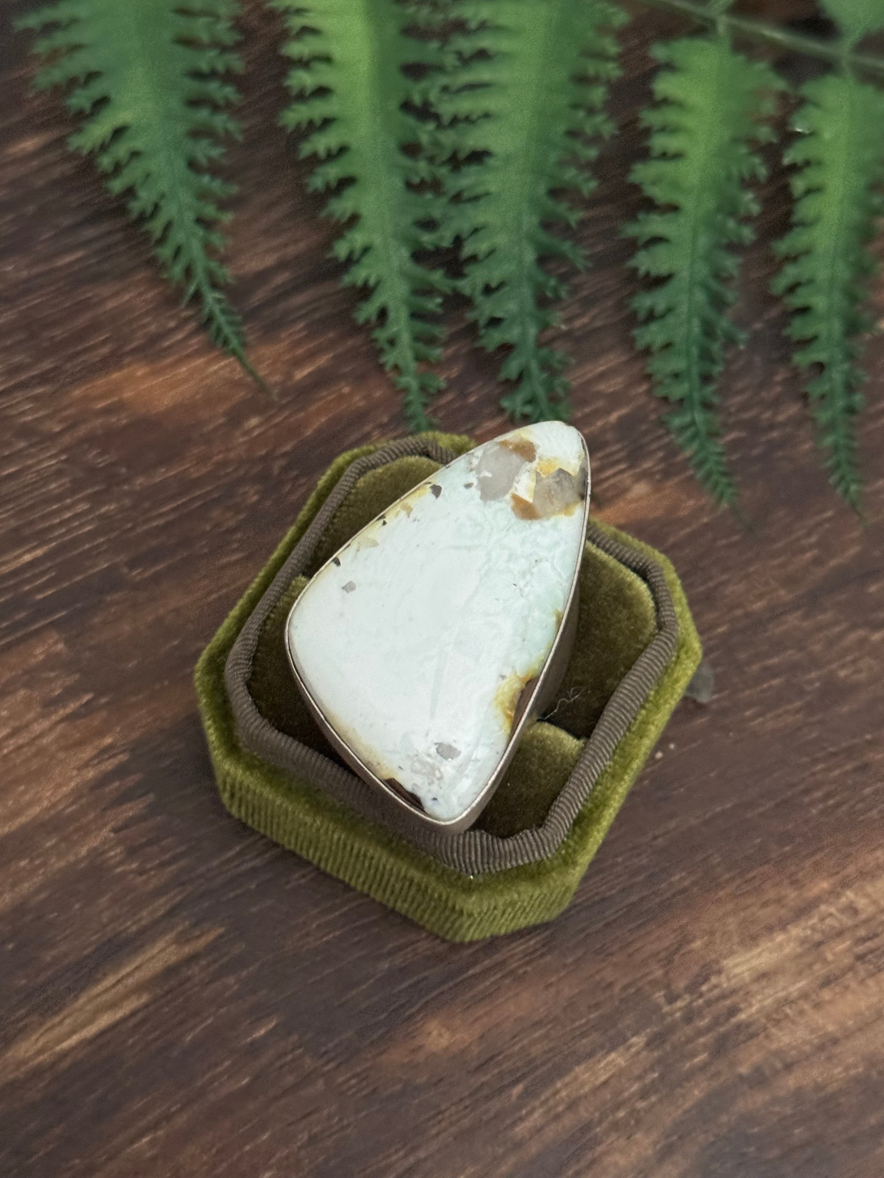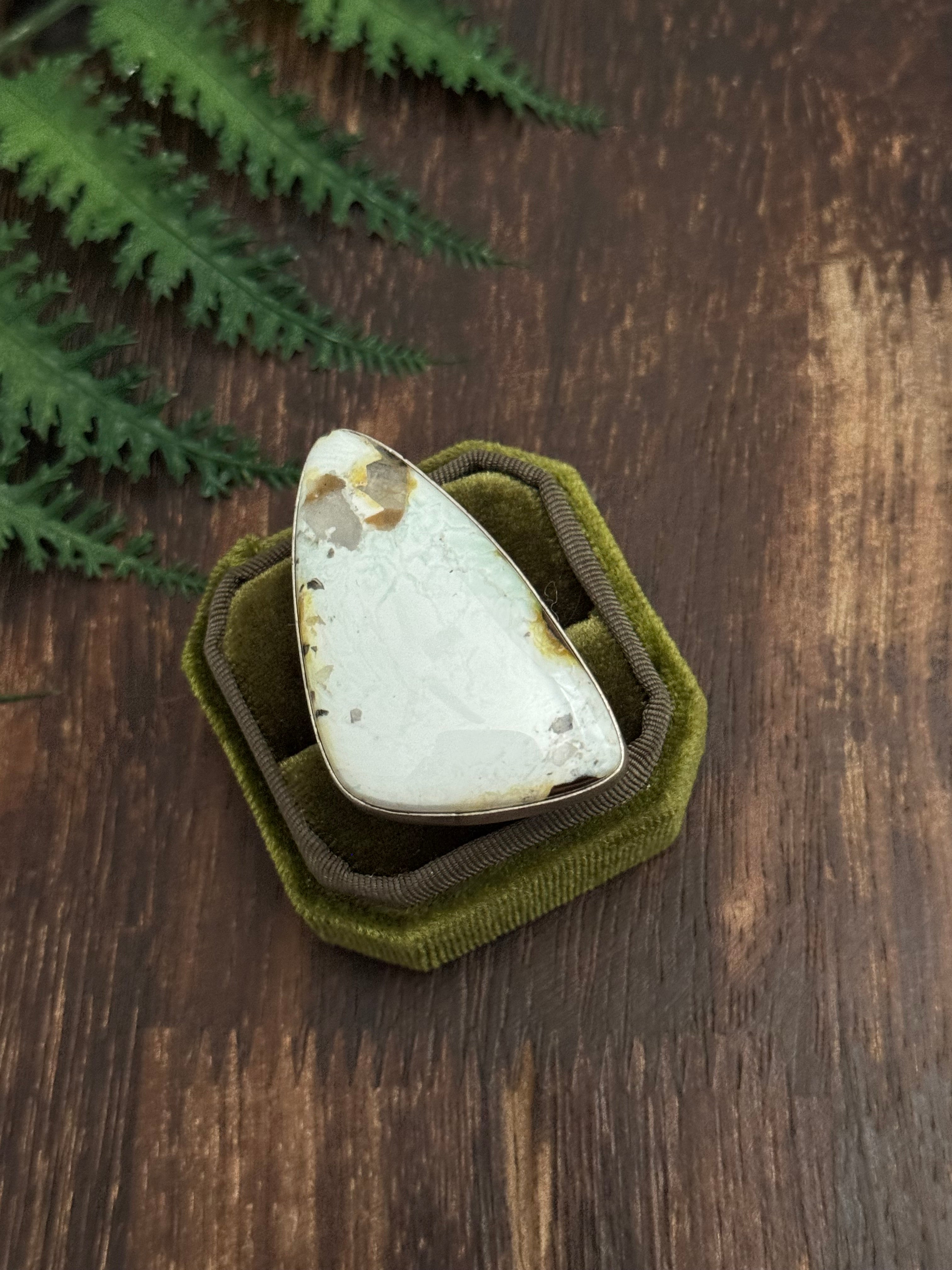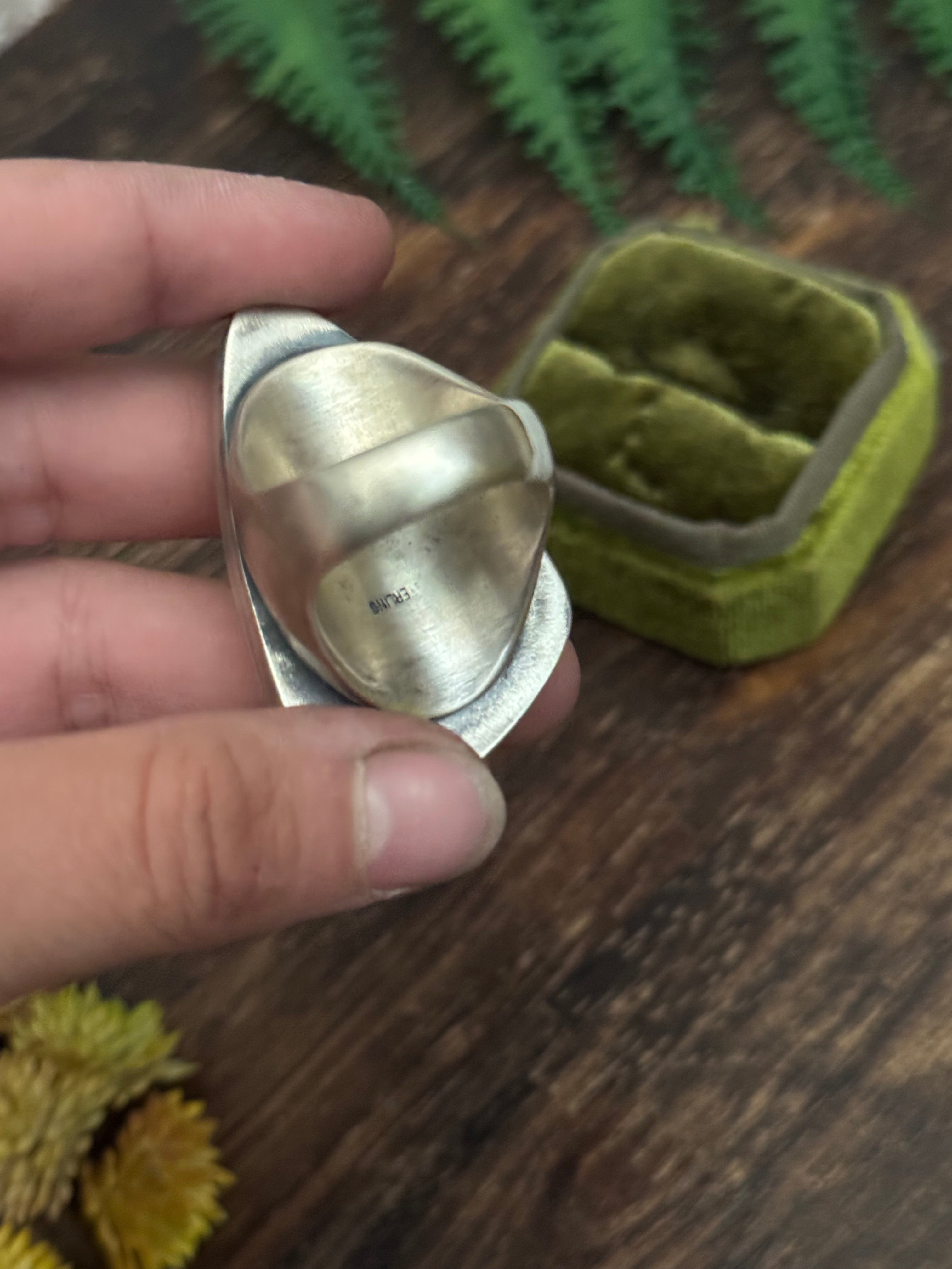 Amazing ring. Navajo Handmade Palomino Variscite & Sterling Silver Ring Size 10.5. It measures just over 1 7/8 inches long and 1 1/8 inches wide. Signed by the artist and stamped sterling silver.