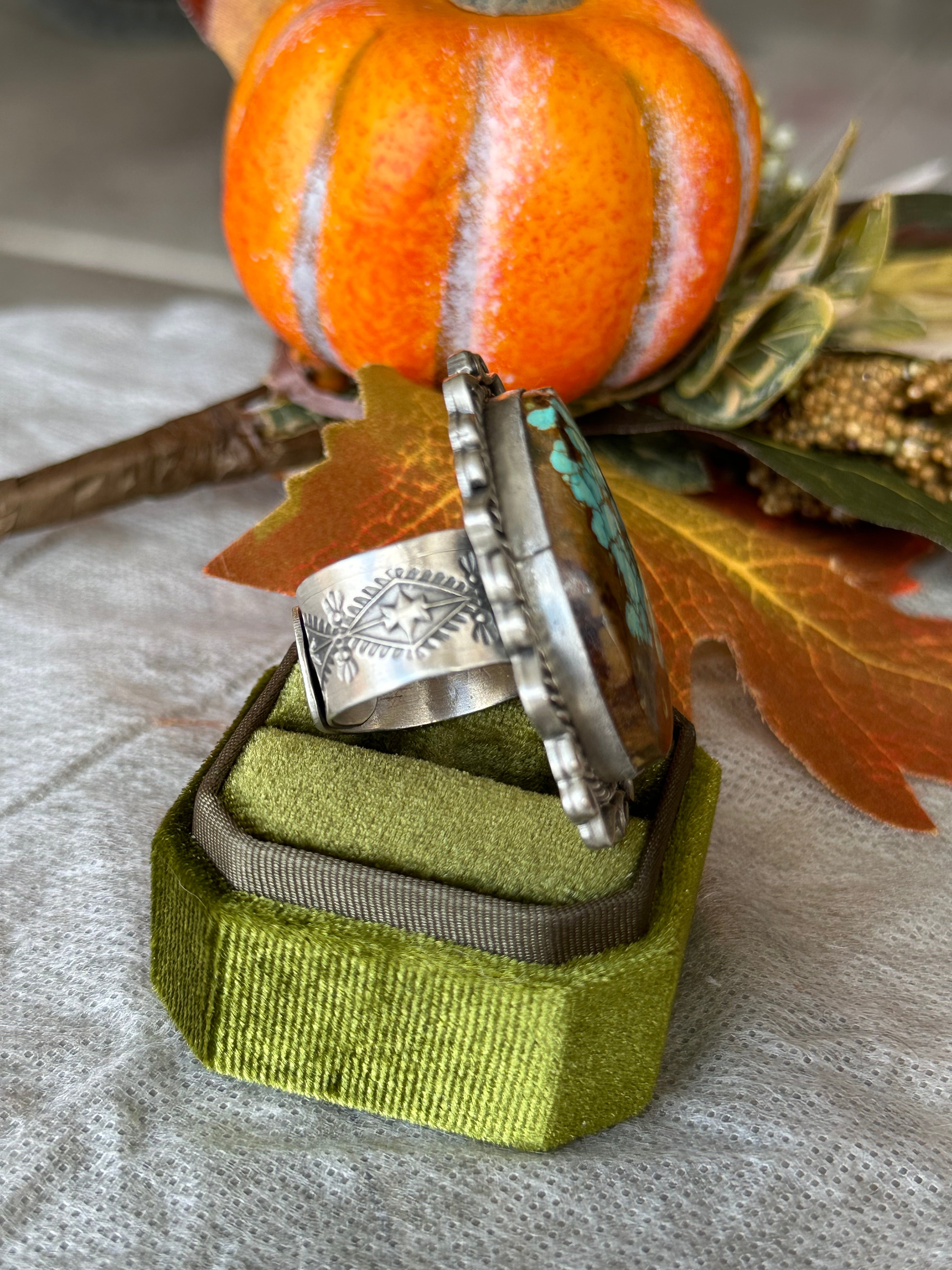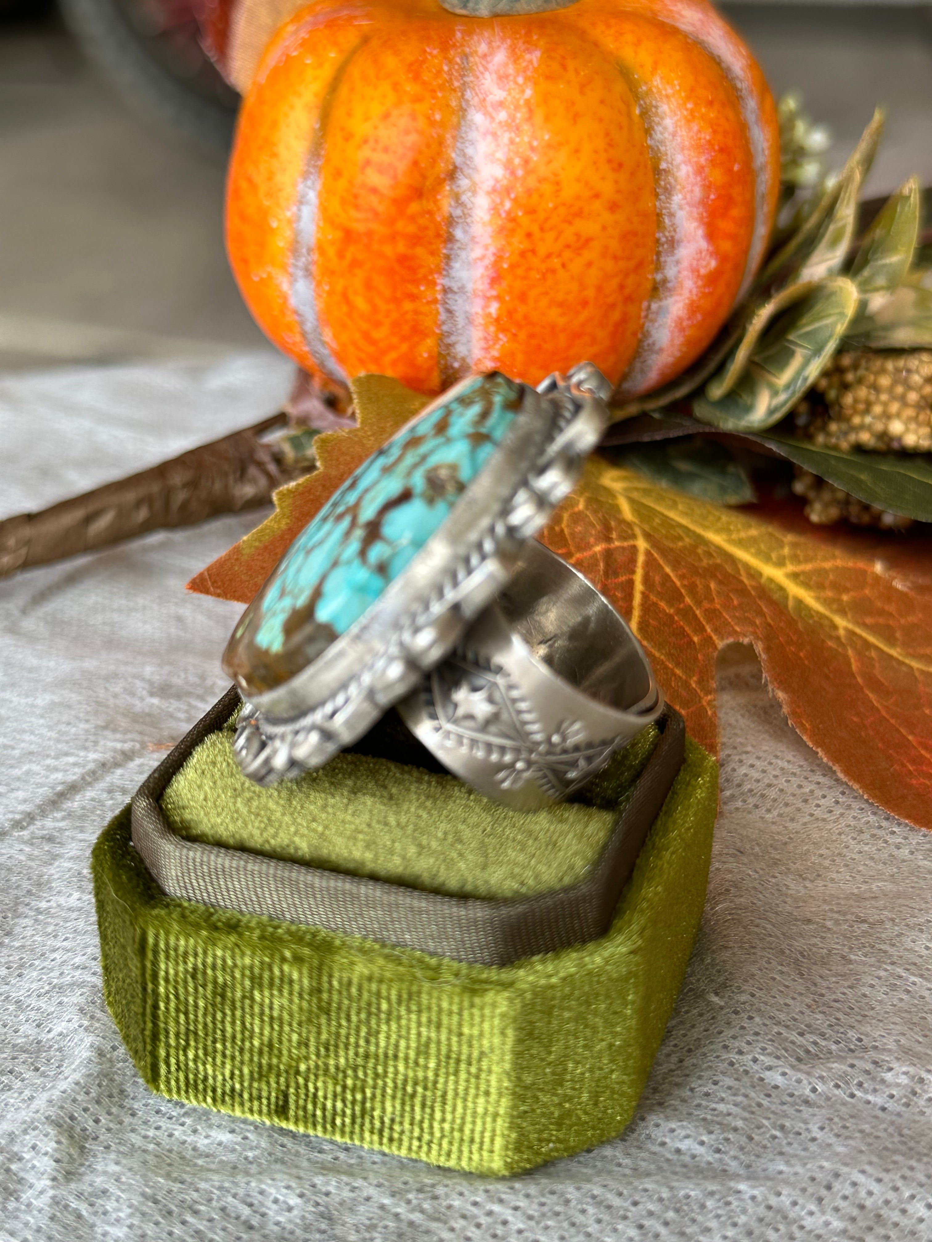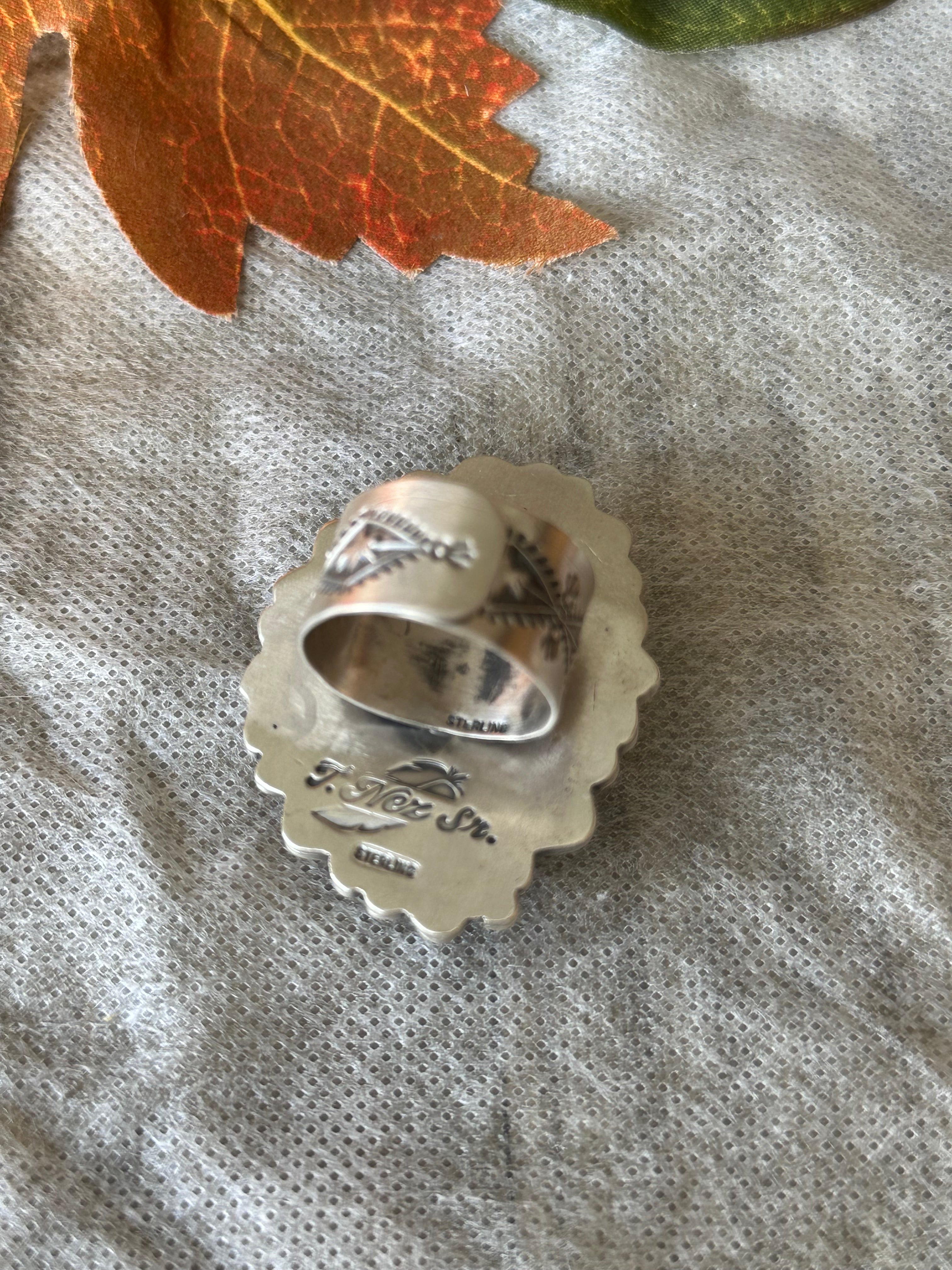 Navajo Handmade #8 Turquoise & Sterling Silver Adjustable Ring Sitting on Size 9. It measures 2 inches long and 1 1/2 inches wide. Signed by the artist and stamped sterling silver.