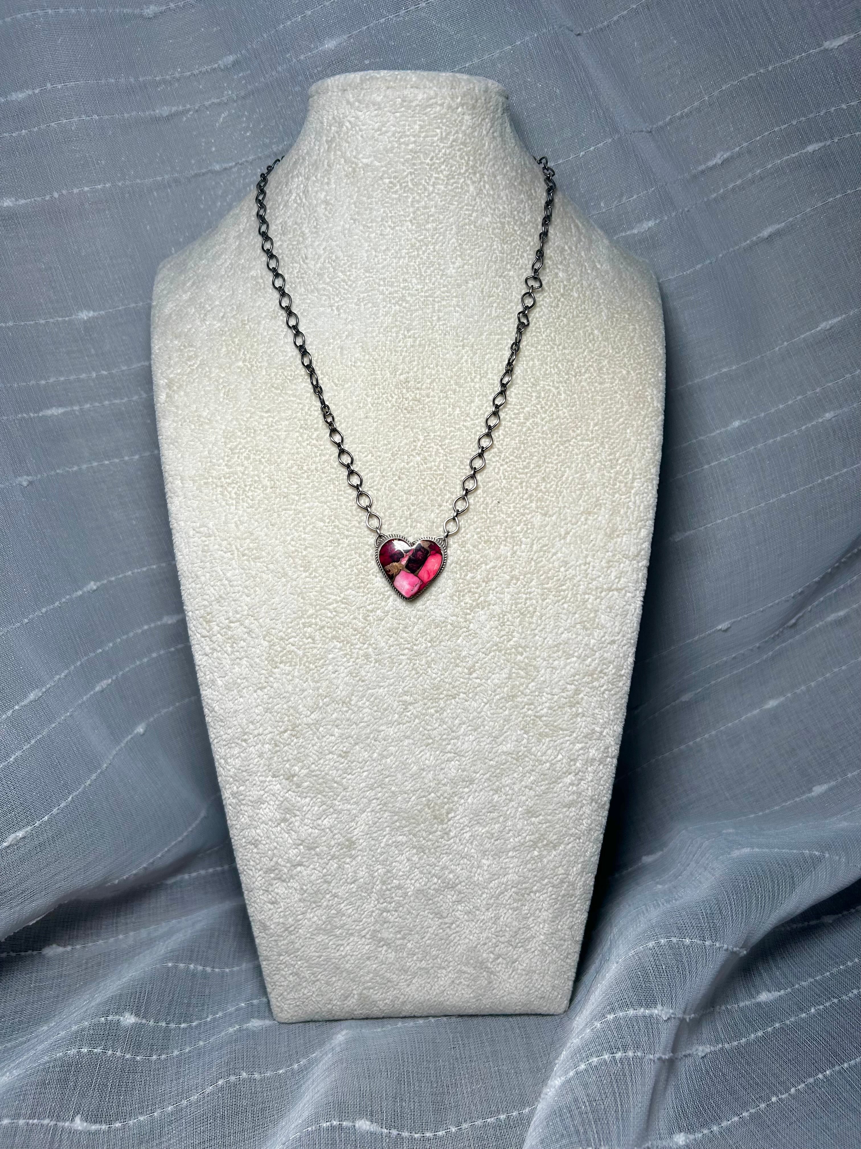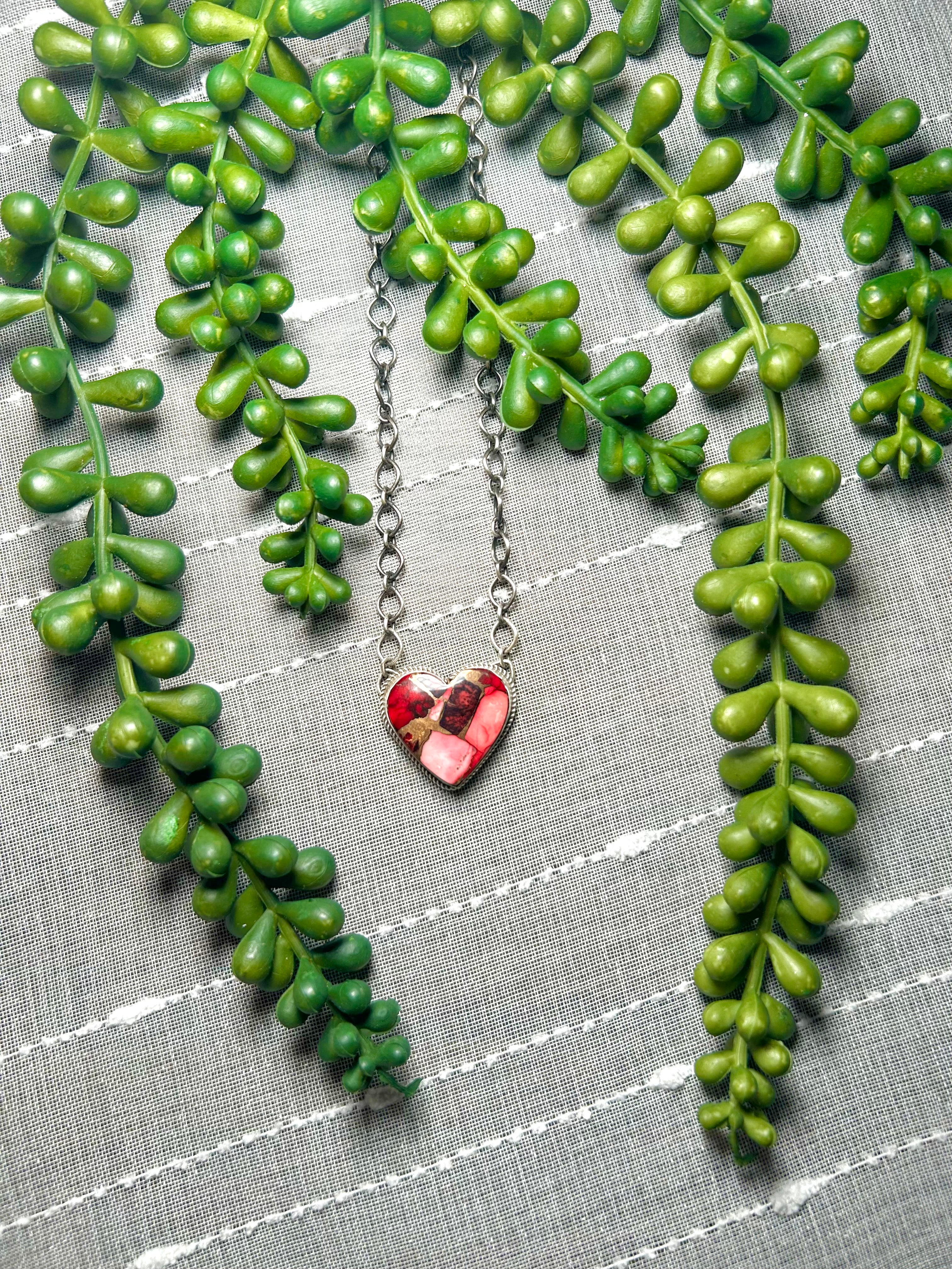 Navajo Made Rose Dahlia & Sterling Silver Necklace. It measures 19 inches long with hang while the chain measures 17 inches long. Signed by the artist and stamped sterling silver.