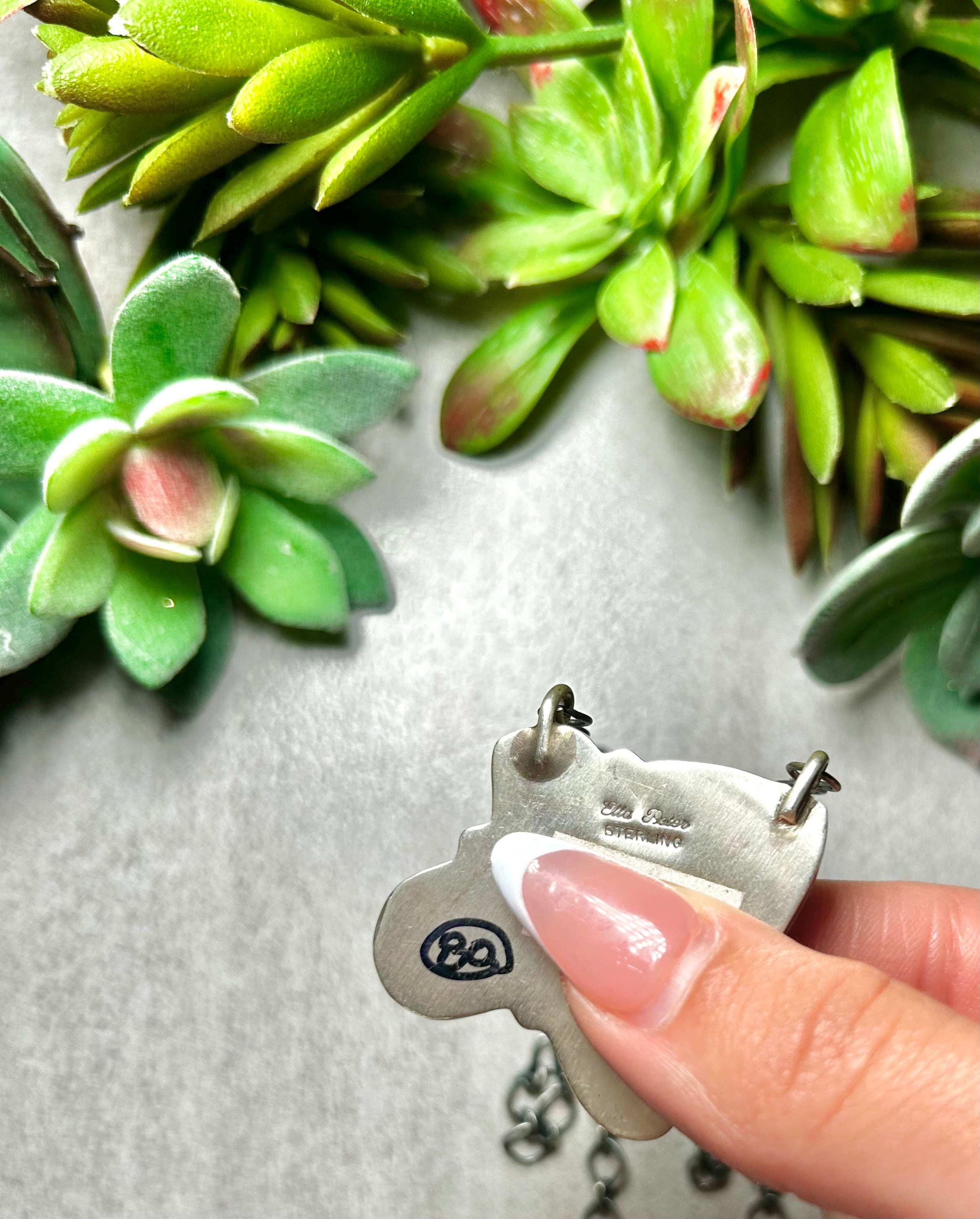 Ella Peters #8 Turquoise & Sterling Silver Necklace. It measures 20 1/2 inches long with hang while the chain measures 18 inches long. Signed by the artist and stamped sterling silver.