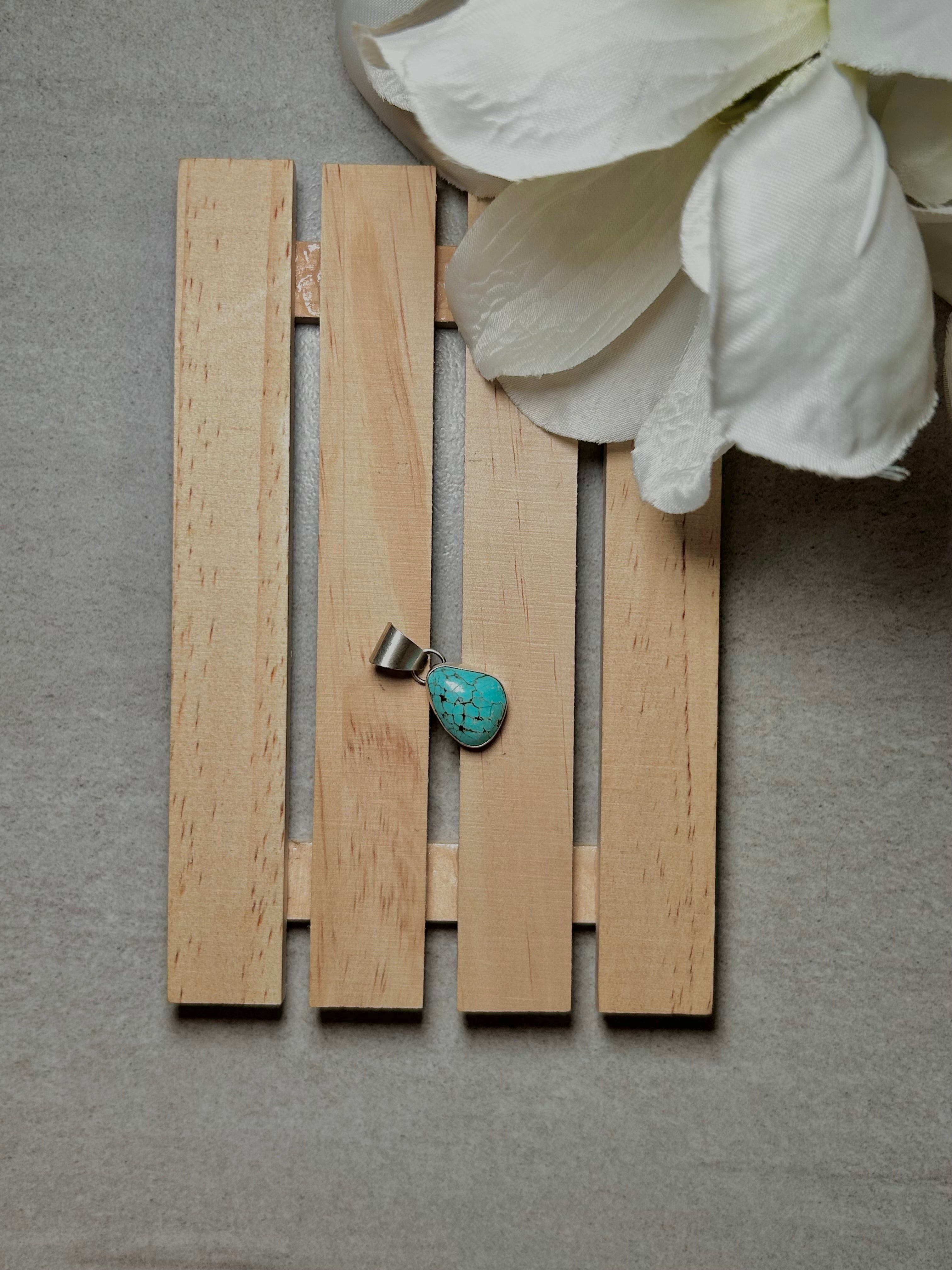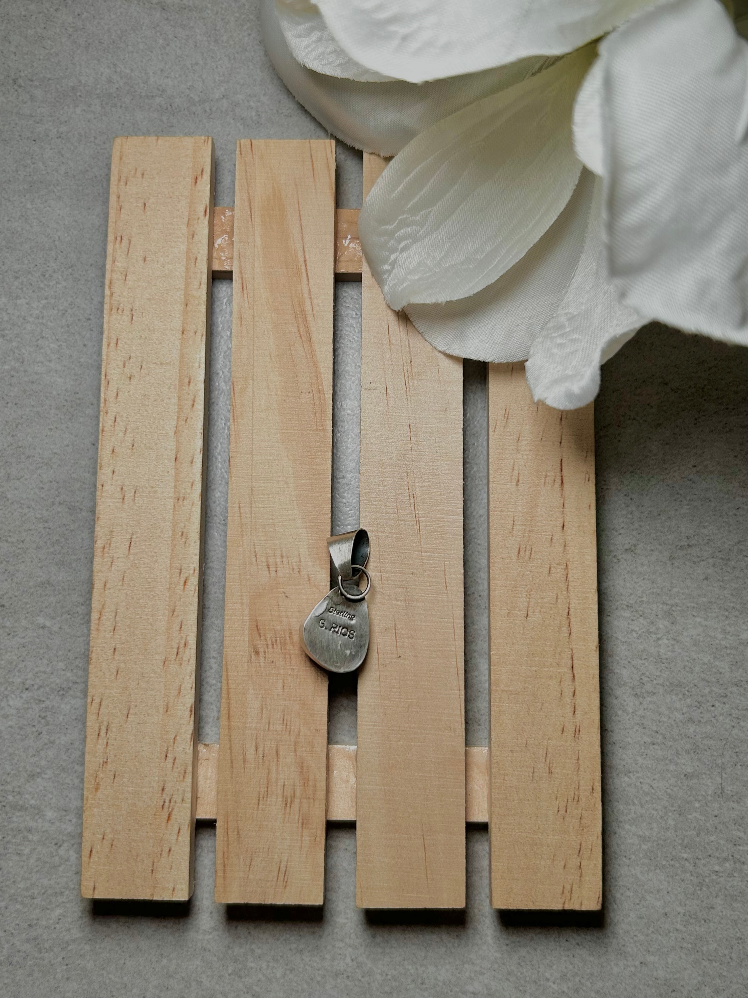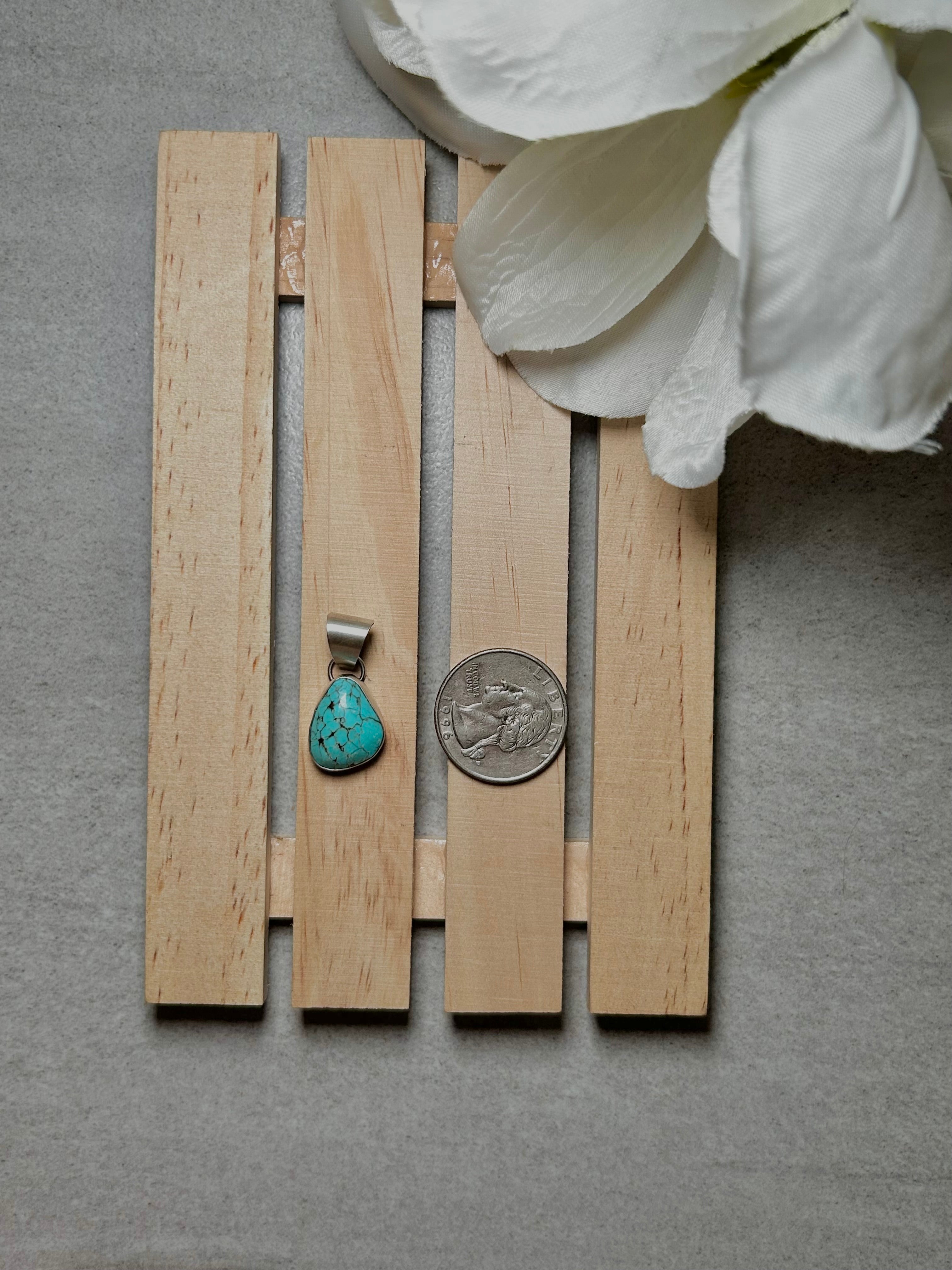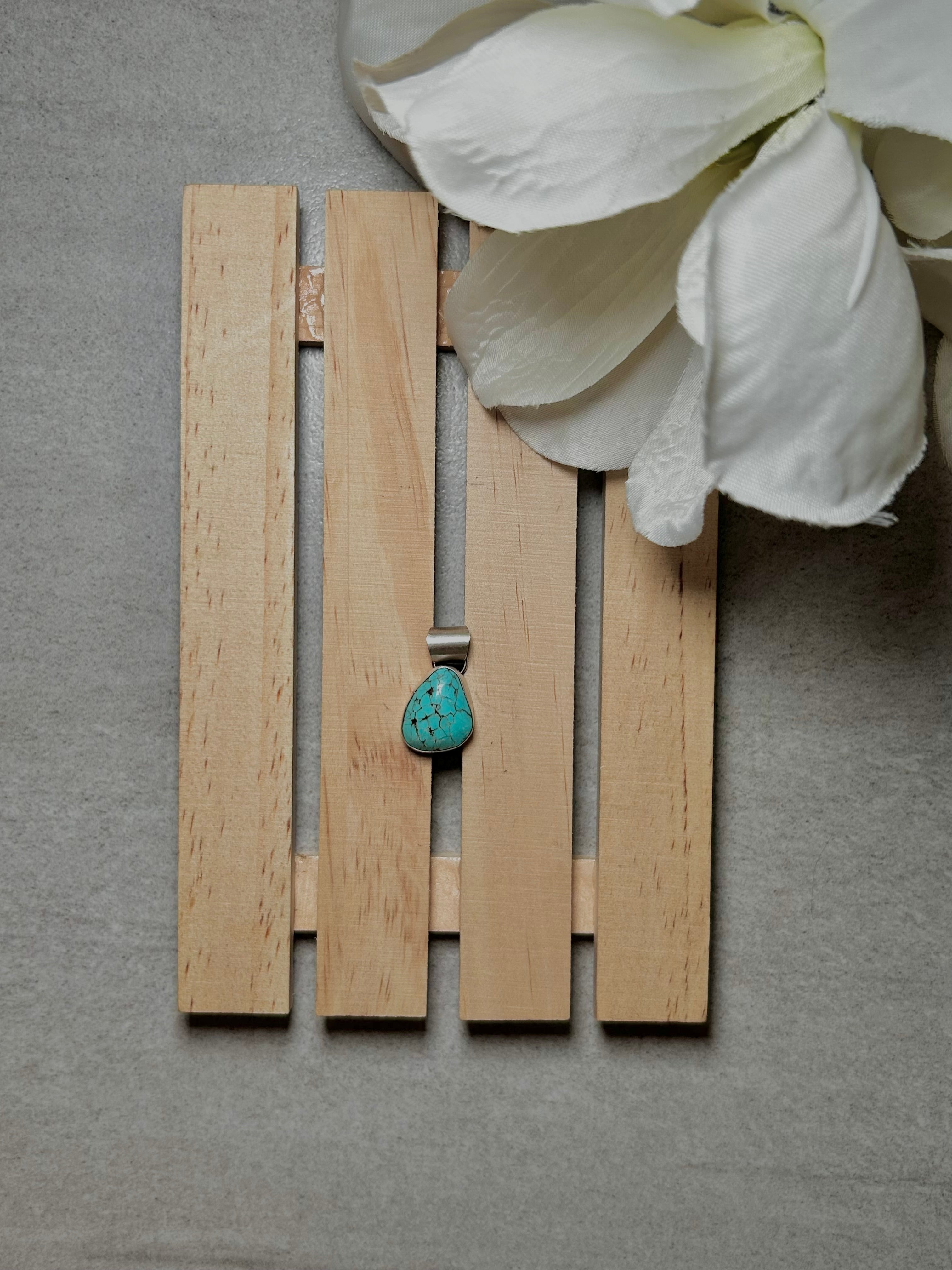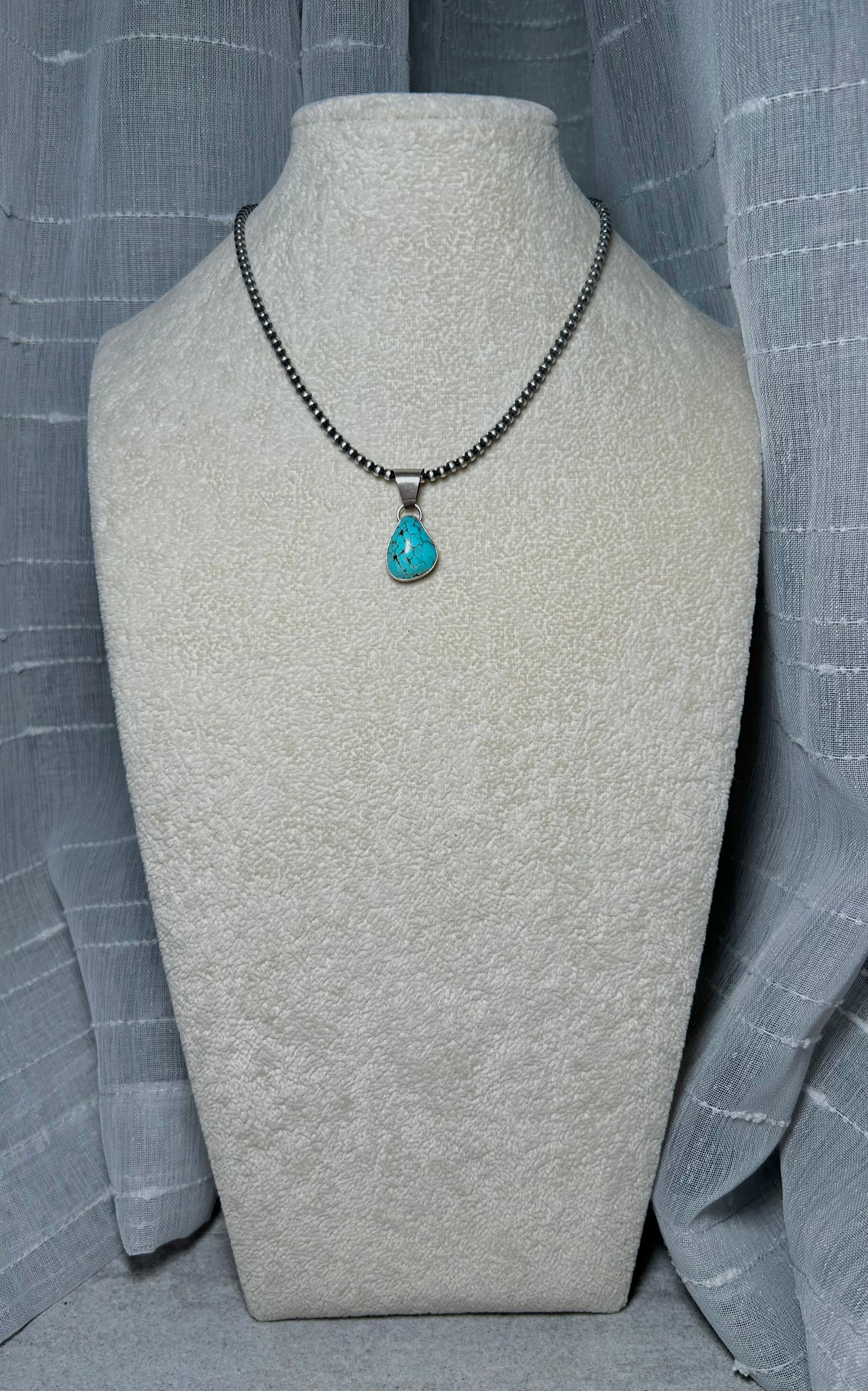 Navajo Made #8 Turquoise & Sterling Silver Pendant. It measures 1 1/8 inches long and 1/2 of an inch wide. Pendant Only. Signed by the artist and stamped sterling silver.