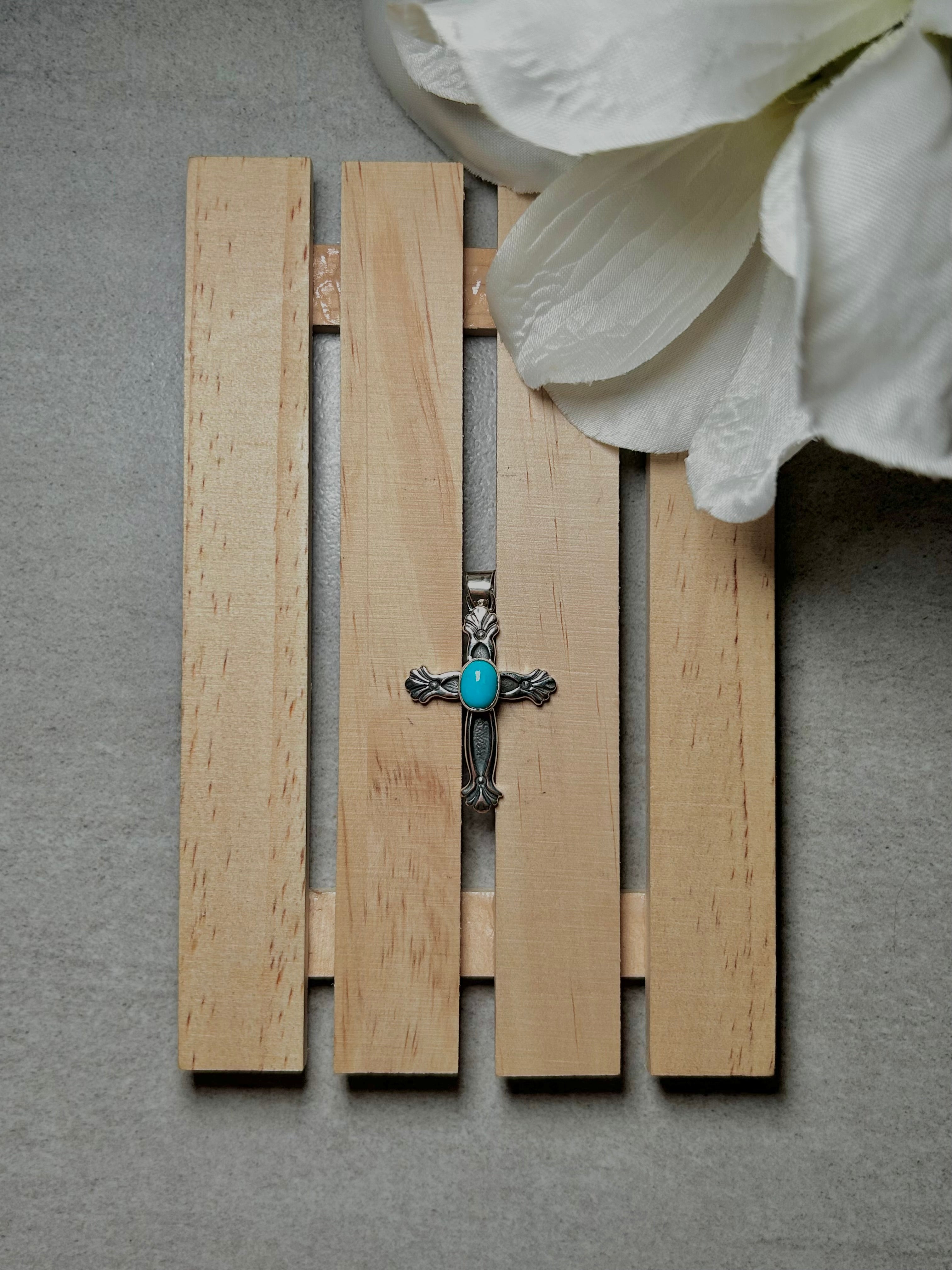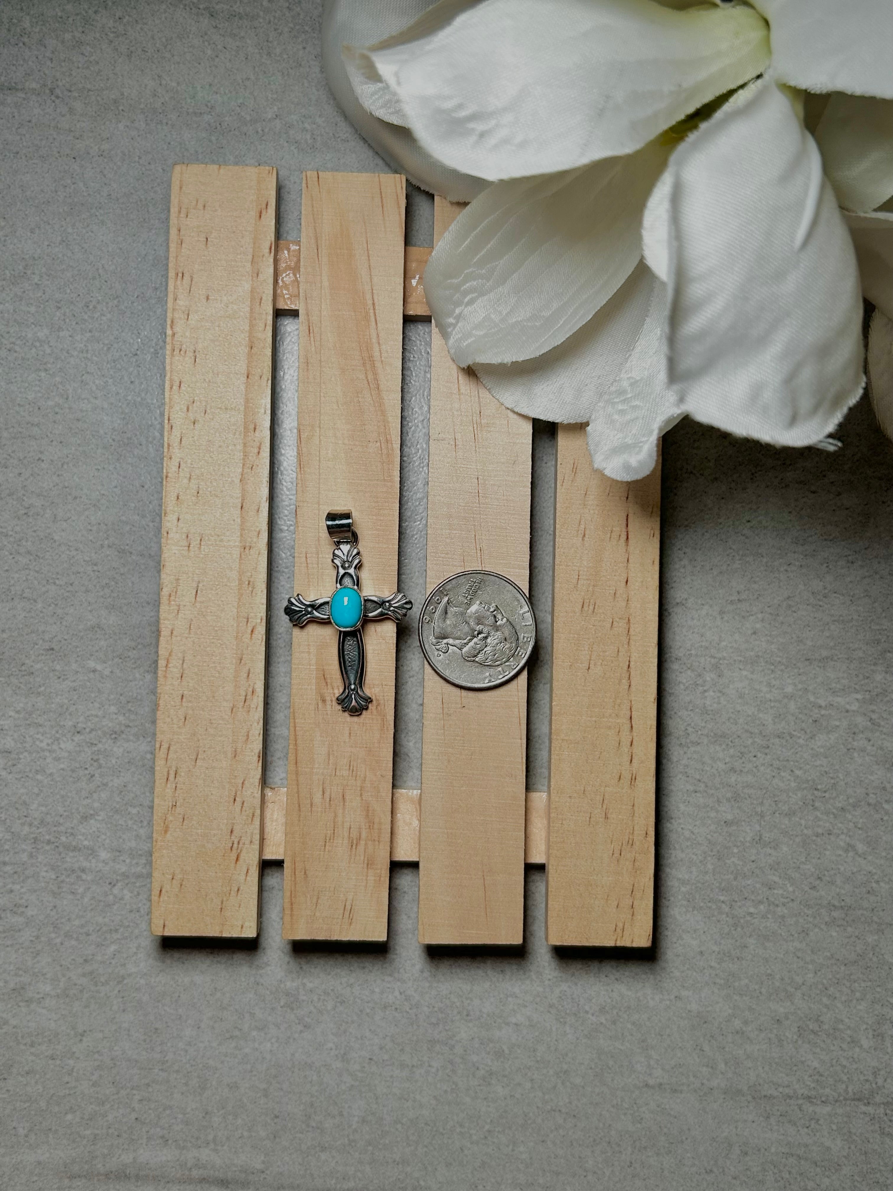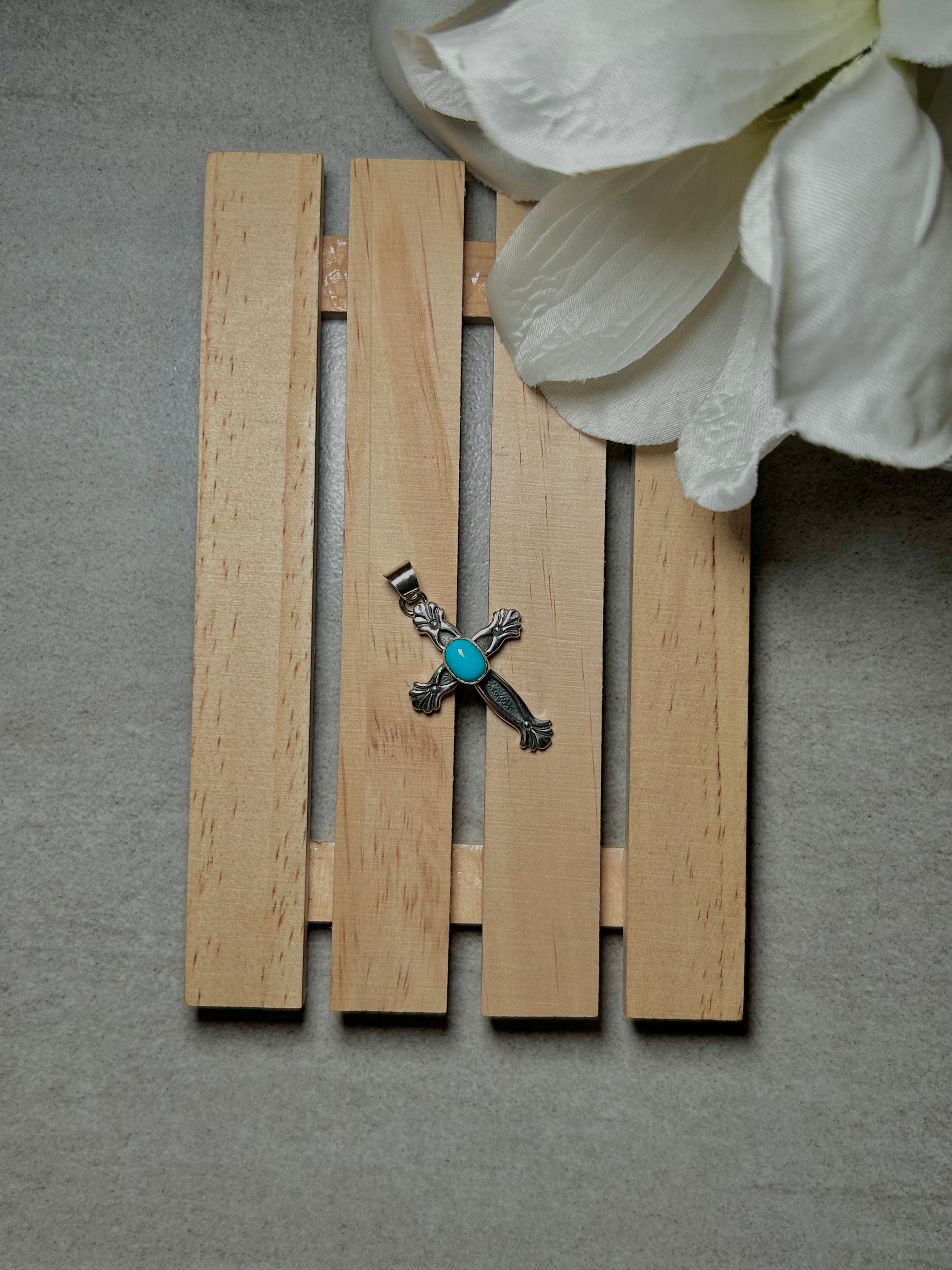 Navajo Made Kingman Turquoise & Sterling Silver Pendant. It measures 1 3/4 inches long and 1 inch wide. Pendant Only. Signed by the artist and stamped sterling silver.