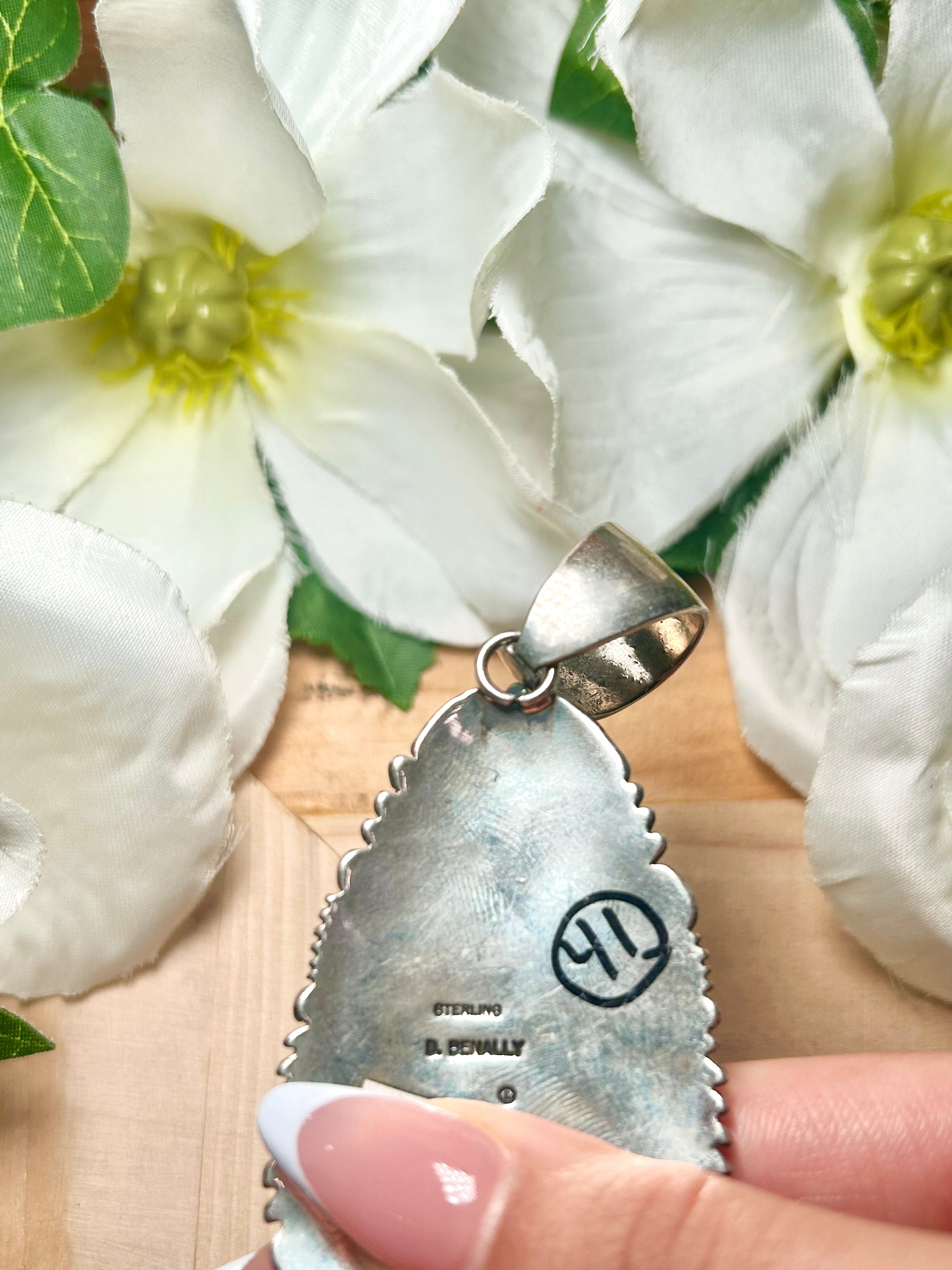 Navajo Made Royston Turquoise & Sterling Silver Pendant. It measures 3 inches long and 1 1/2 inches wide. Pendant Only! Signed by the artist and stamped sterling silver.