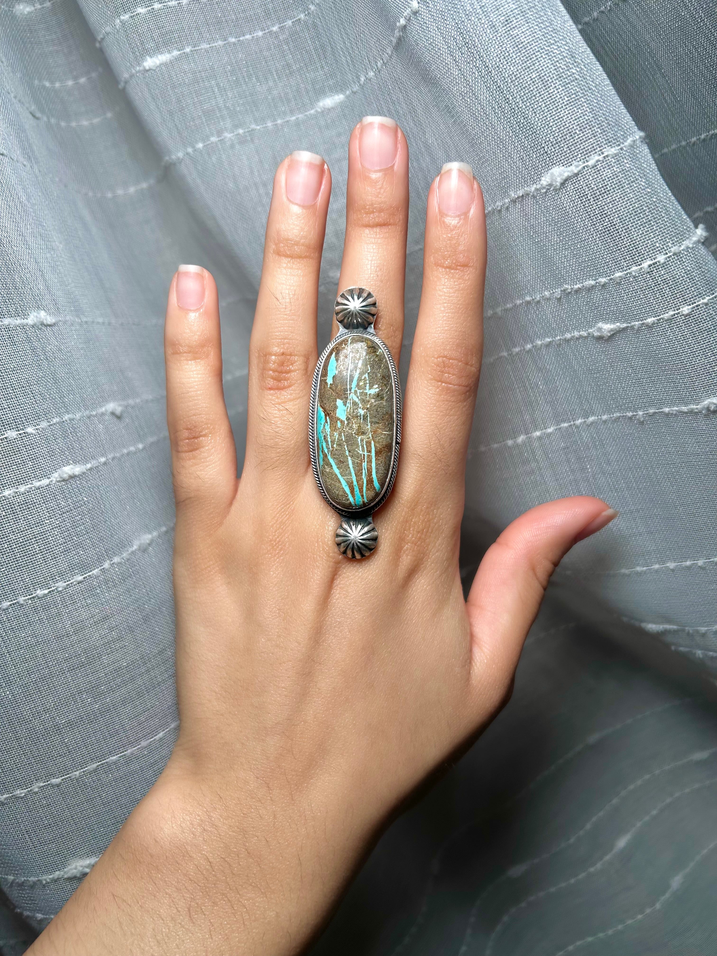 Navajo Made Pilot Mountain Turquoise & Sterling Silver Ring Size 6. It measures 2 3/8 inches long and 3/4 of an inch wide. Signed by the artist and stamped sterling silver.