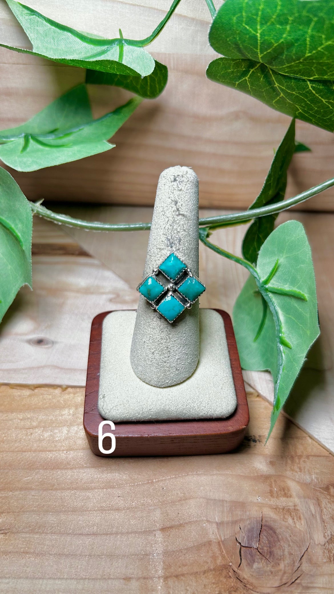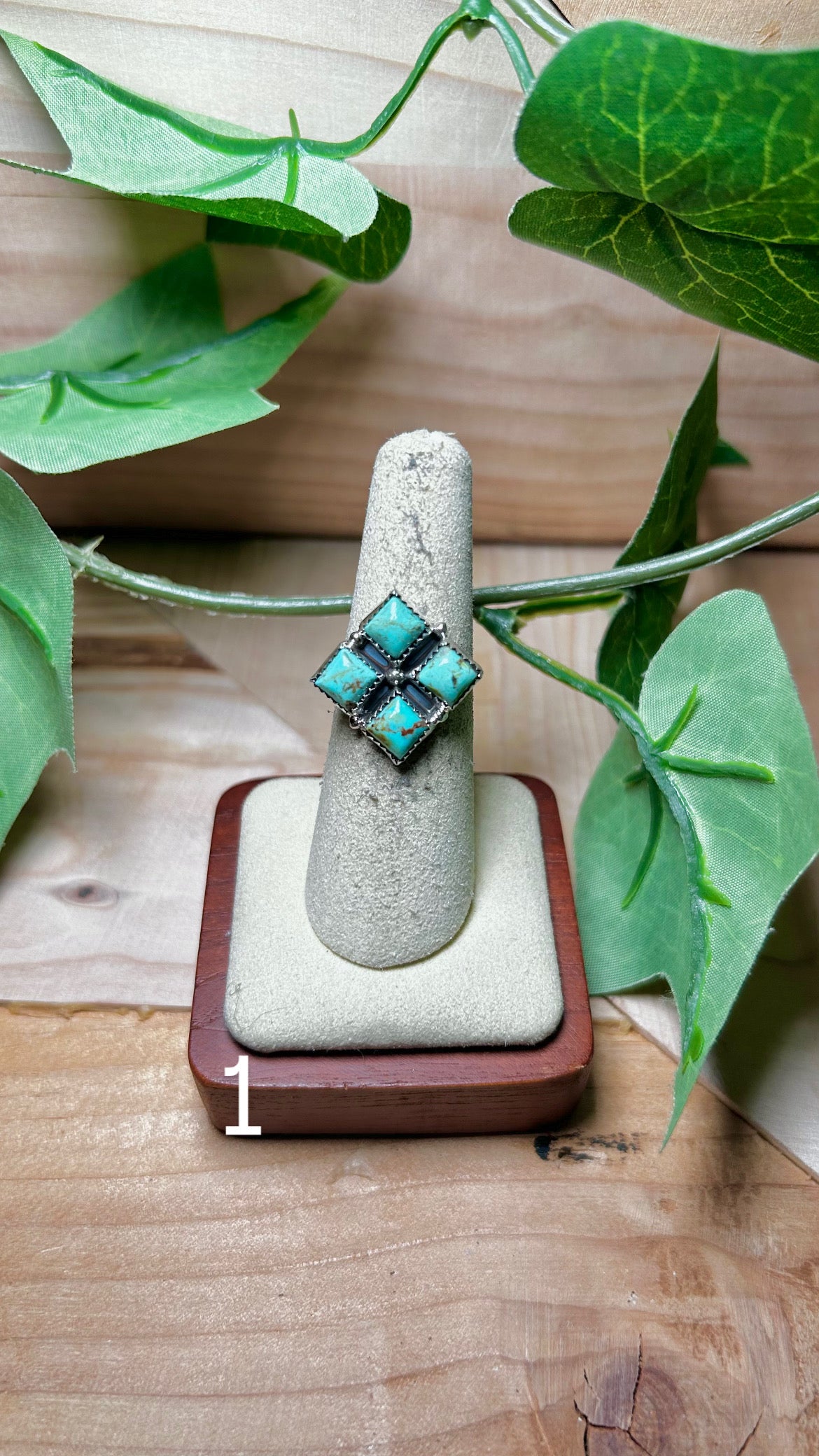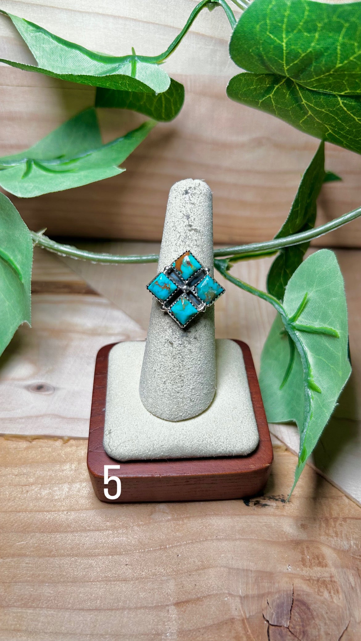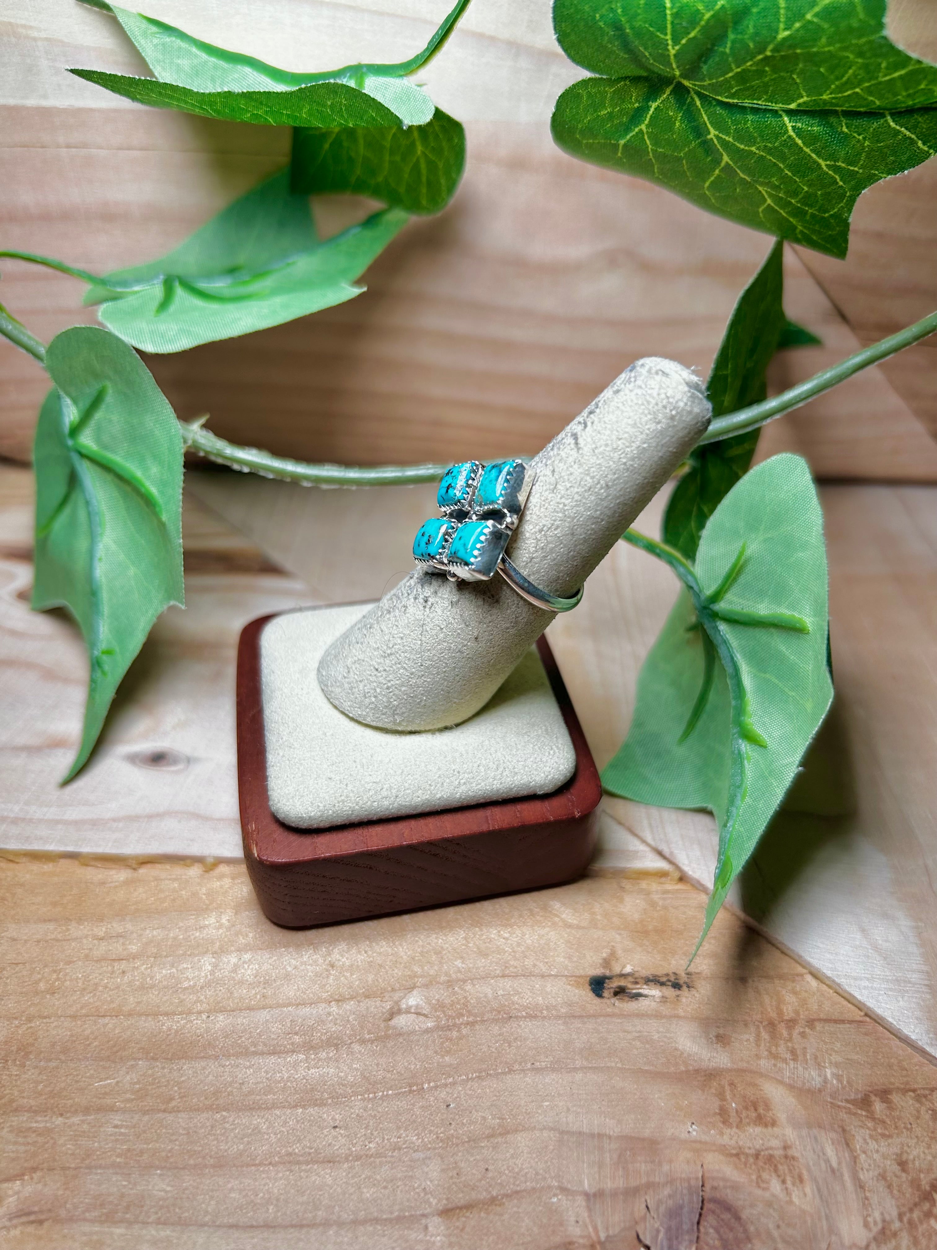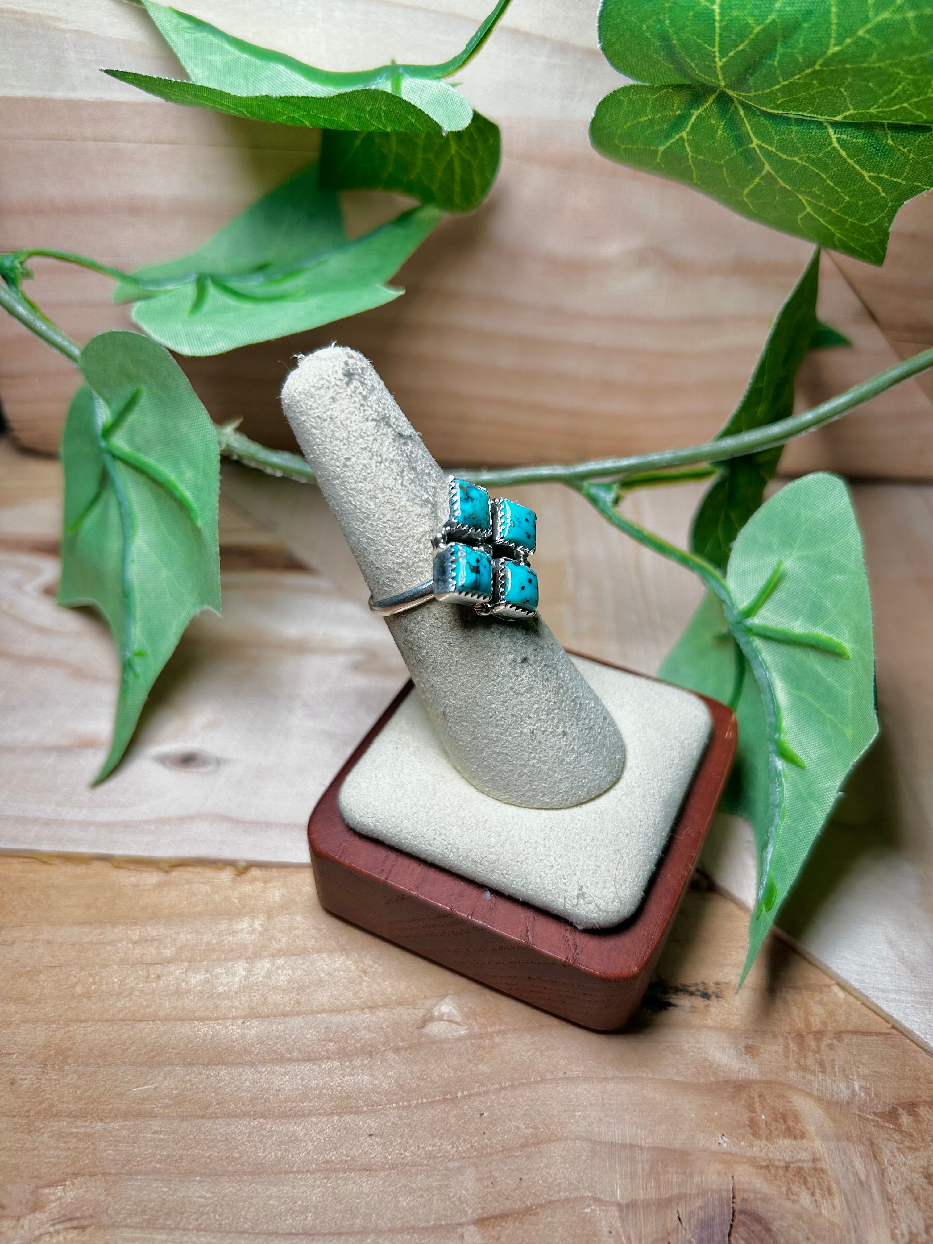 Annie Spencer Kingman Turquoise & Sterling Sliver Cluster Ring. It measures 7/8 of an inch long and 7/8 of an inch wide. Signed by the artist and stamped sterling silver.