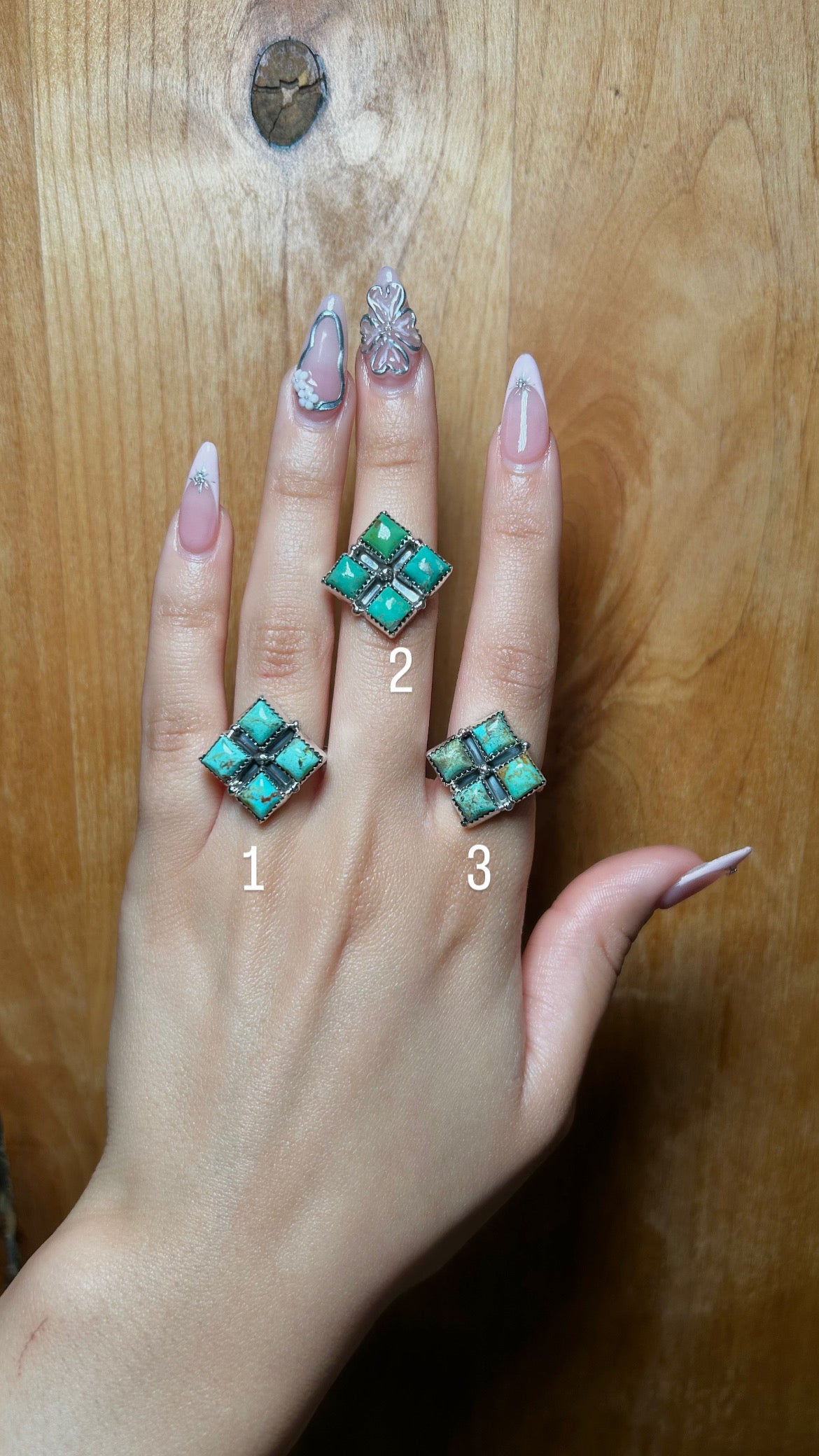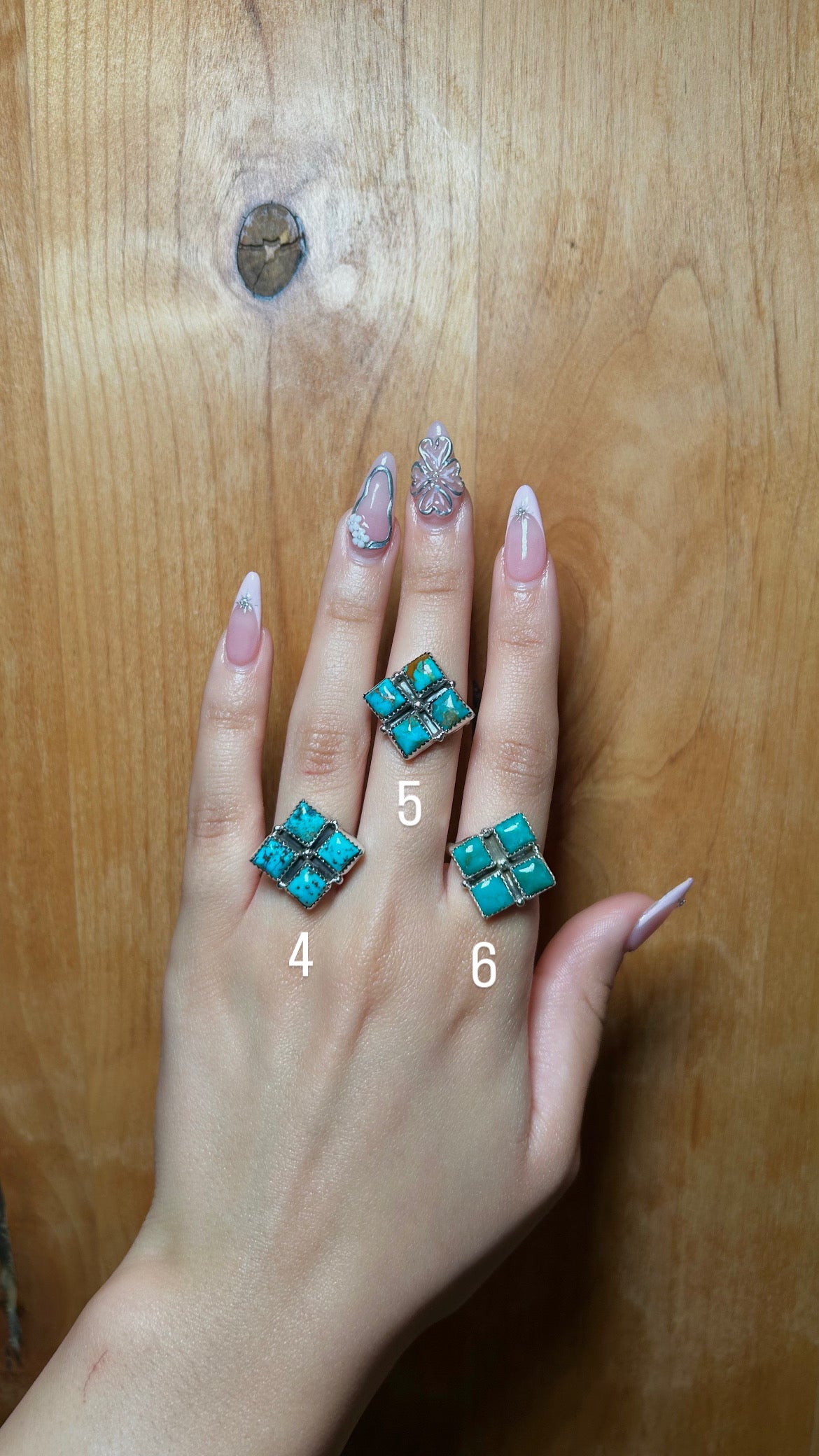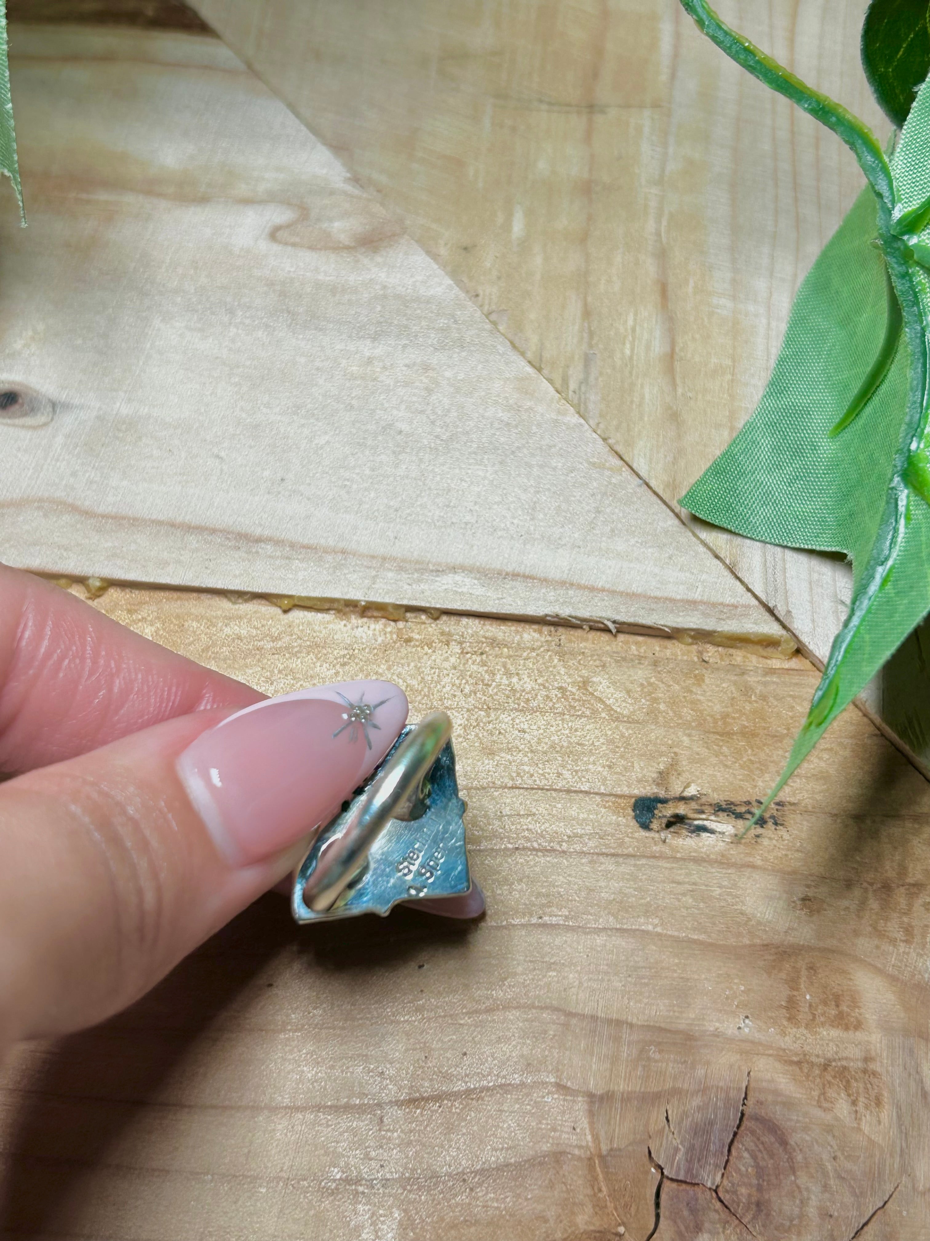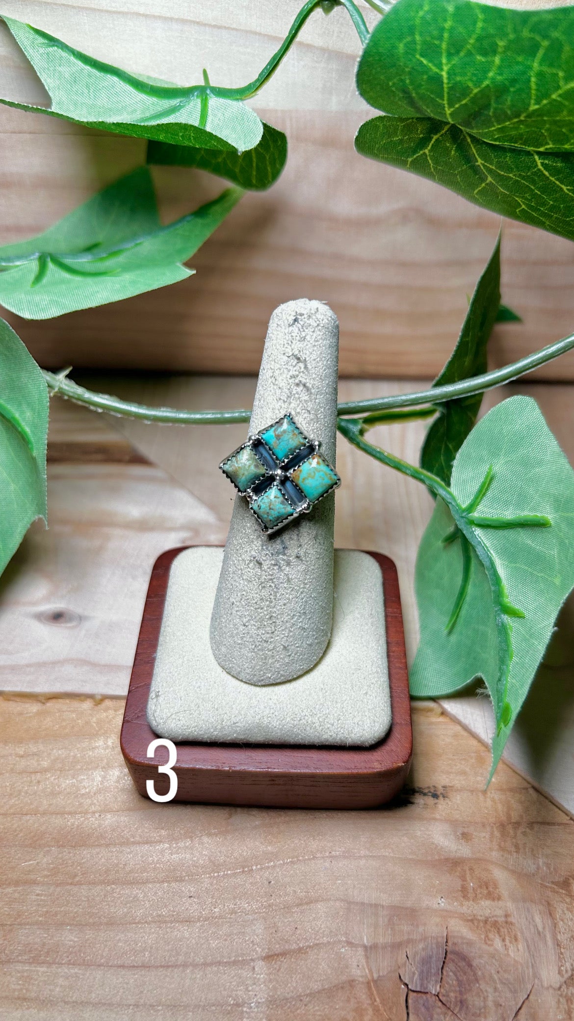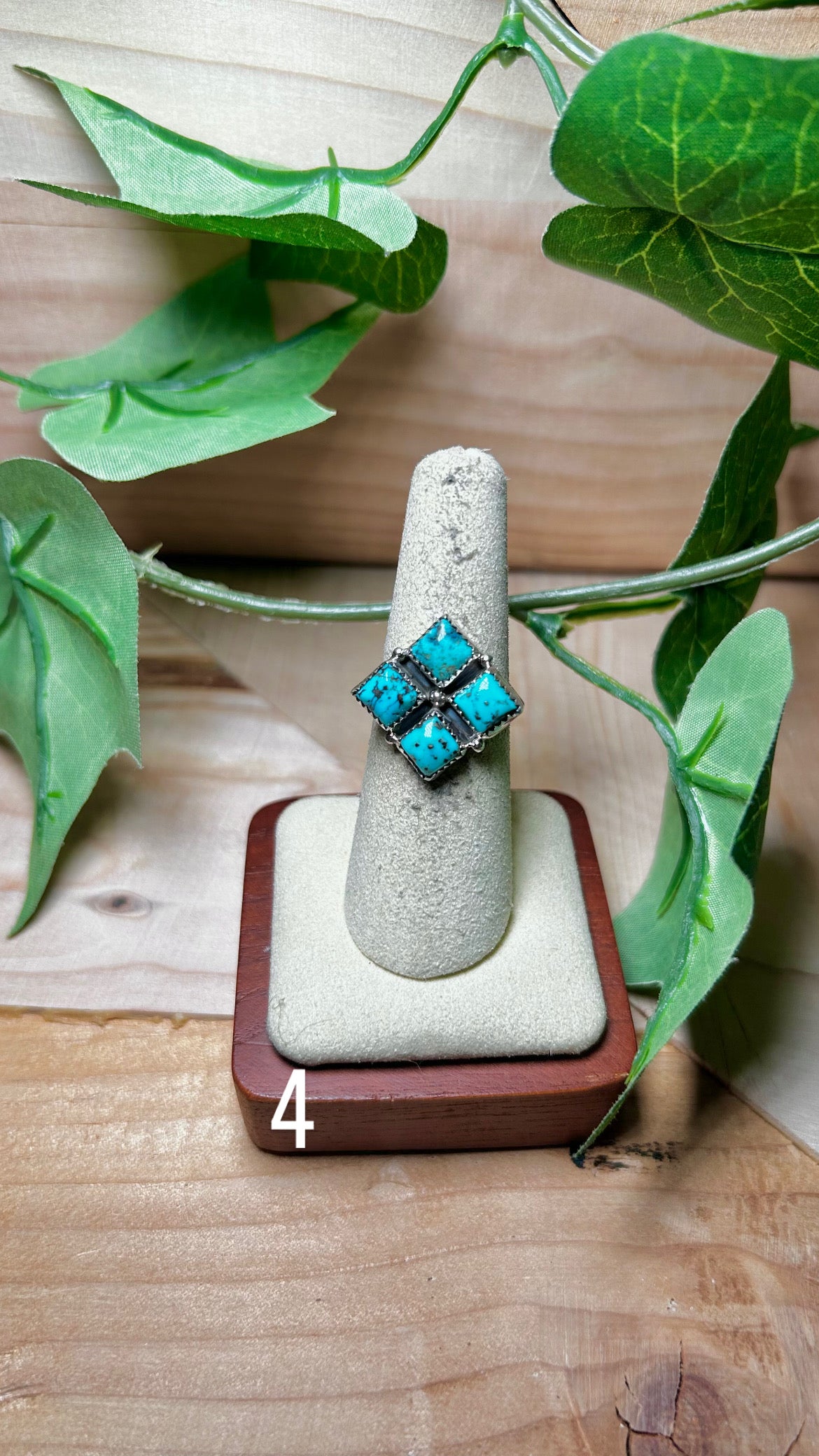 Annie Spencer Kingman Turquoise & Sterling Sliver Cluster Ring. It measures 7/8 of an inch long and 7/8 of an inch wide. Signed by the artist and stamped sterling silver.