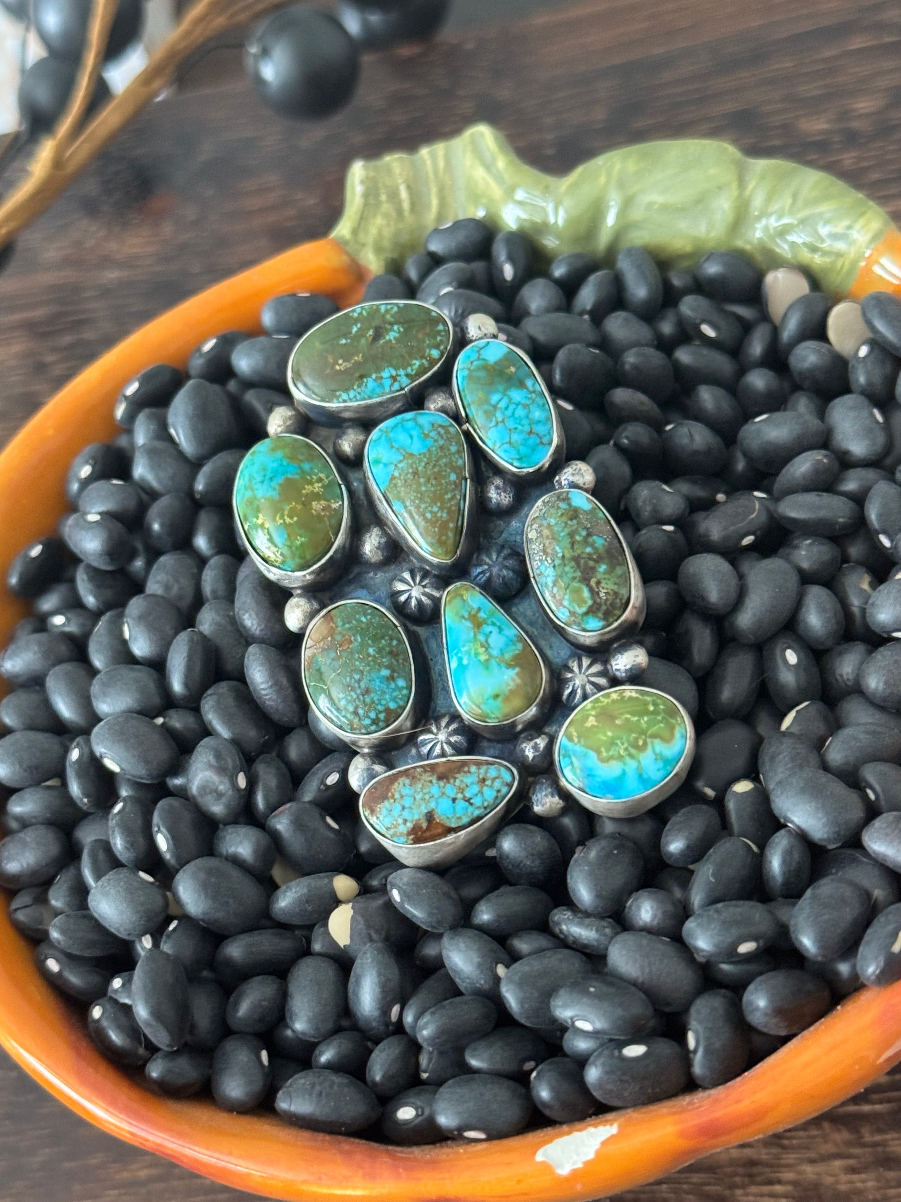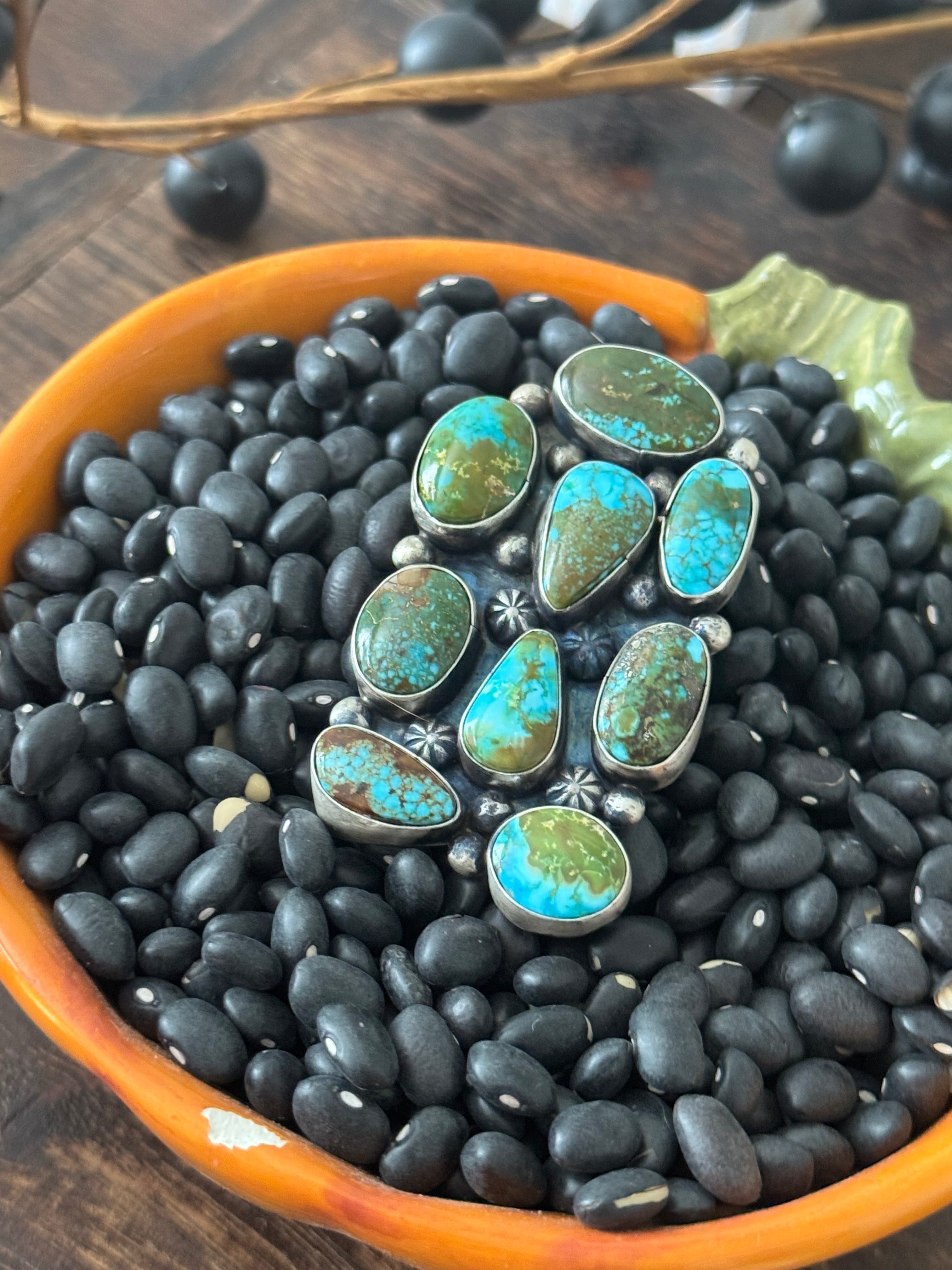 A stunning piece. Navajo Made Birdseye Kingman Turquoise and Sterling Silver Ring Size 9. It measures 2 inches long and 1 1/2 inches wide. Signed by the artist and stamped sterling silver.