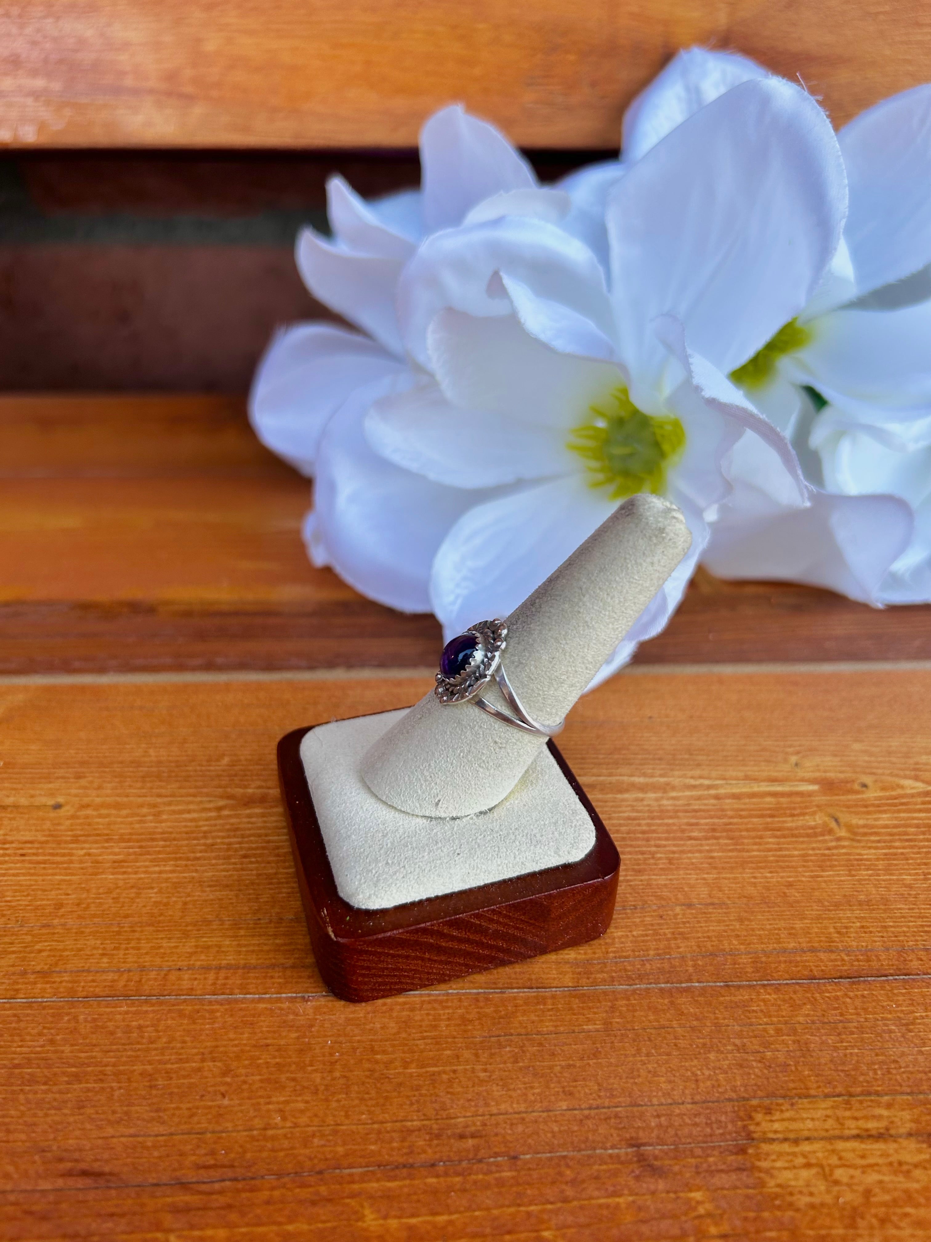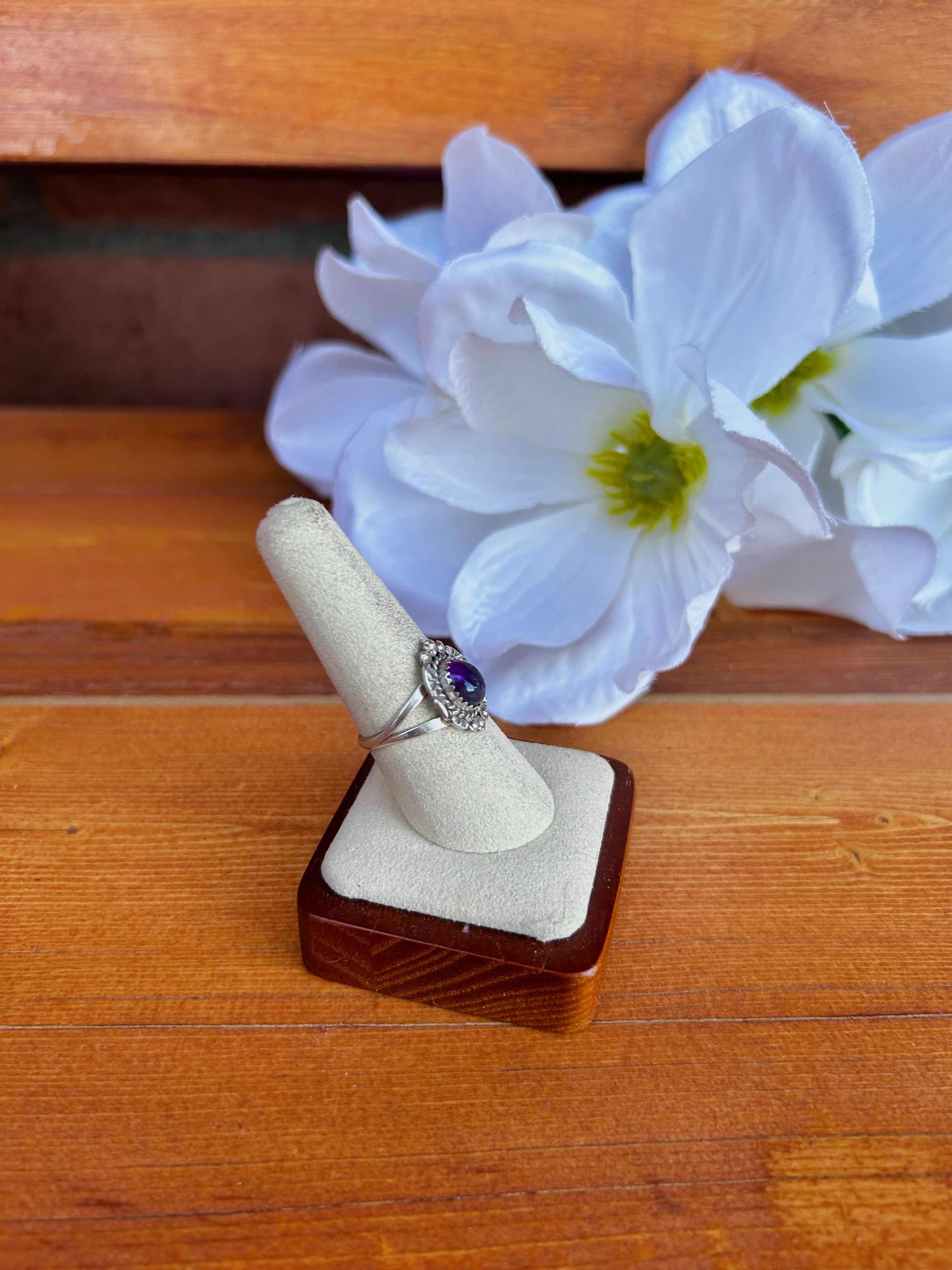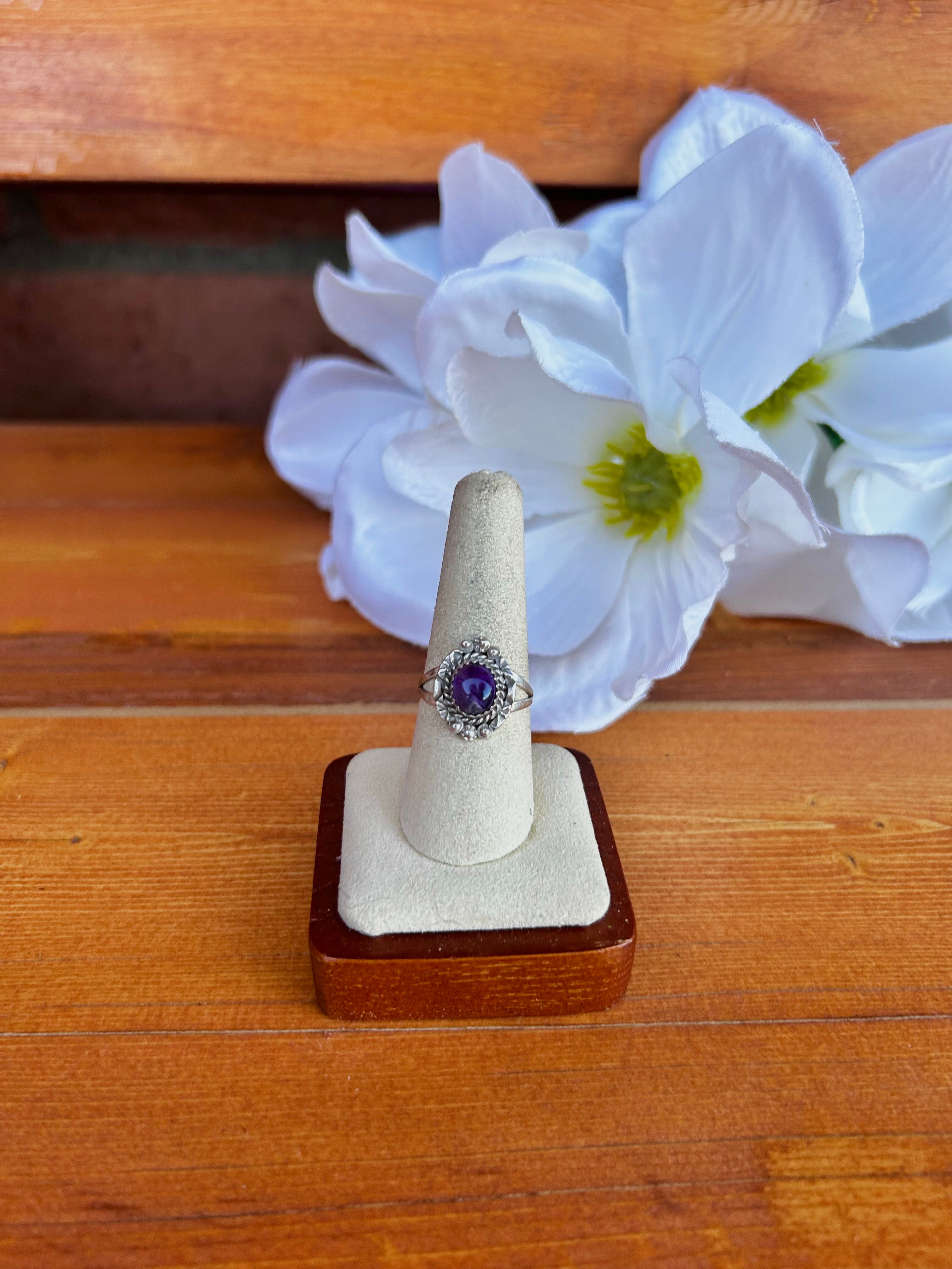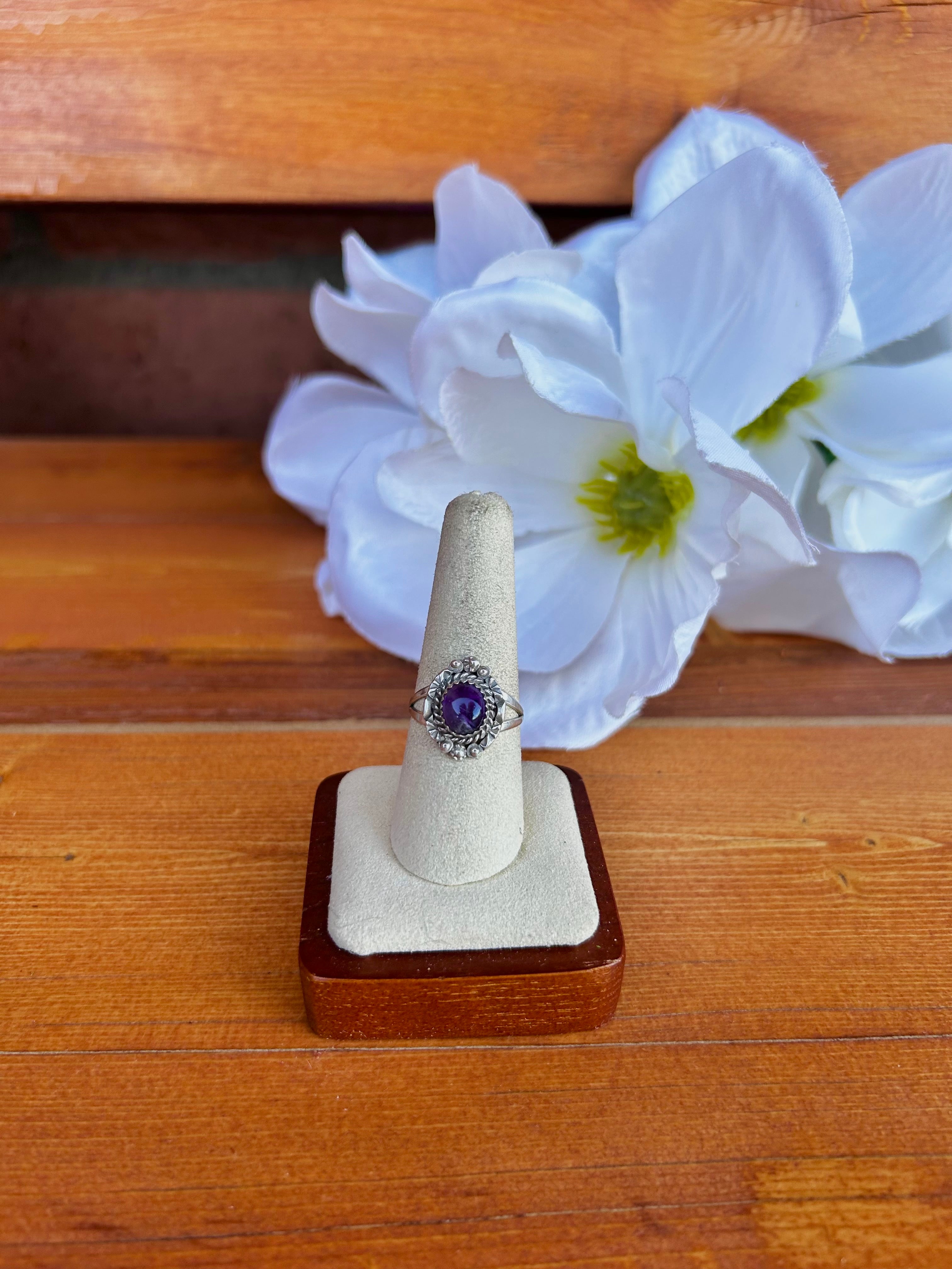 Navajo Made Amethyst & Sterling Silver Ring. It measures 5/8 of an inch long and 1/2 of an inch wide. Signed by the artist and stamped sterling silver. Stones may vary due to natural stones