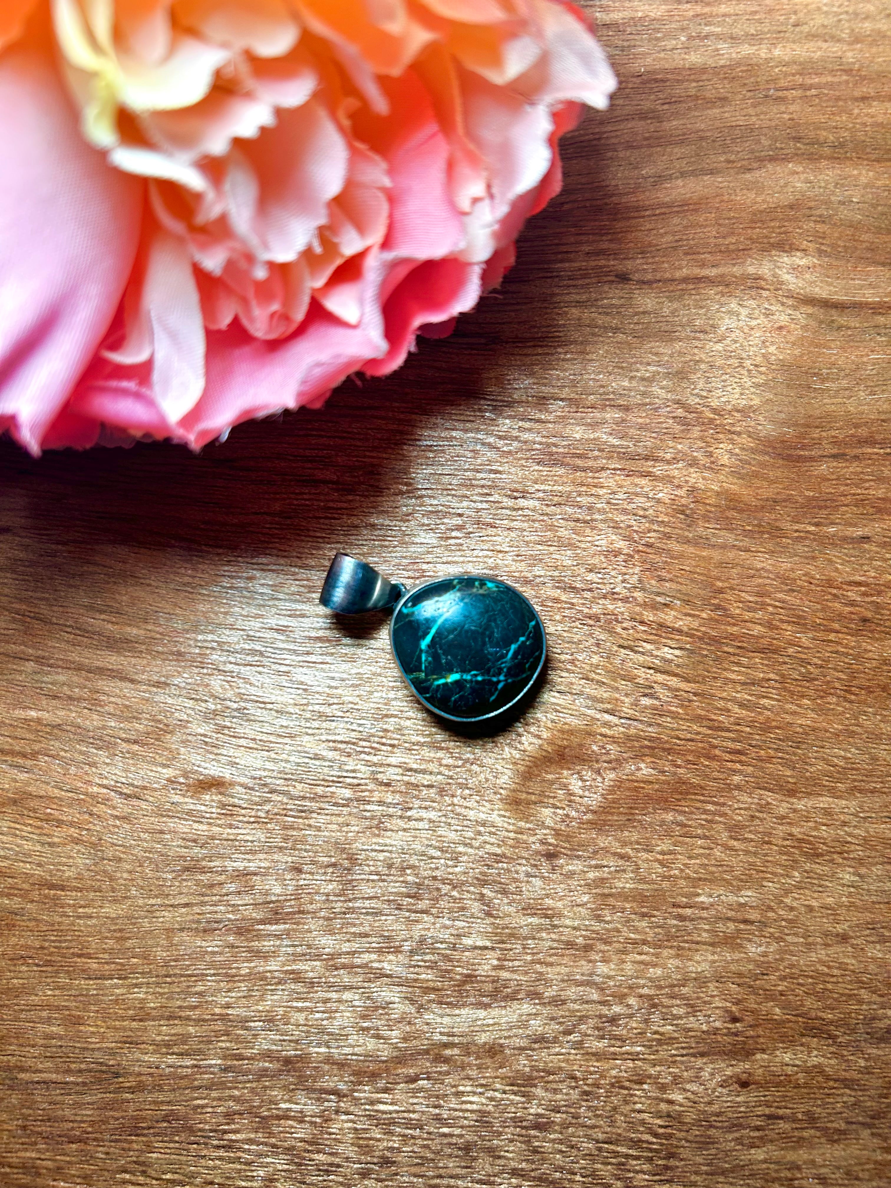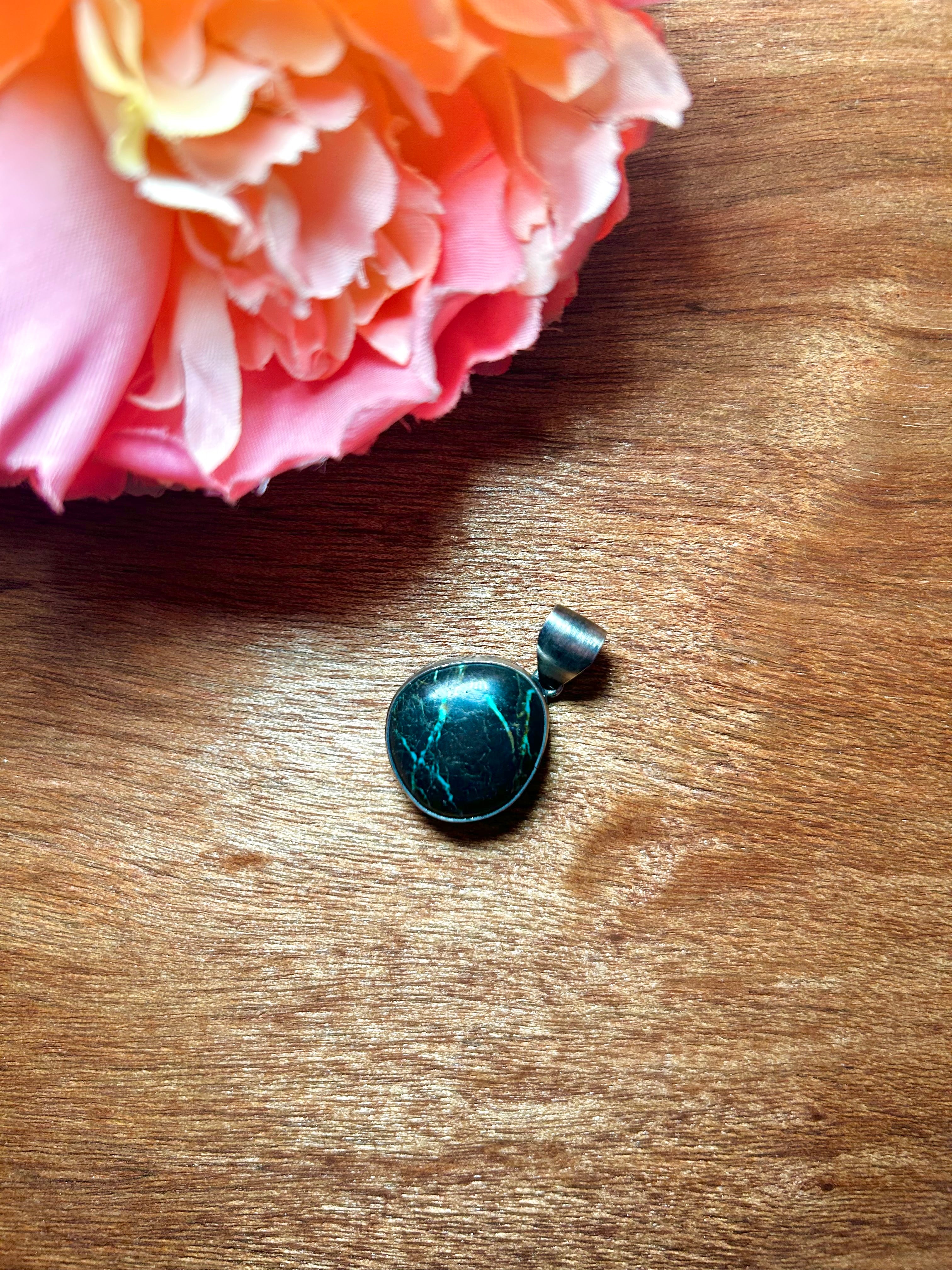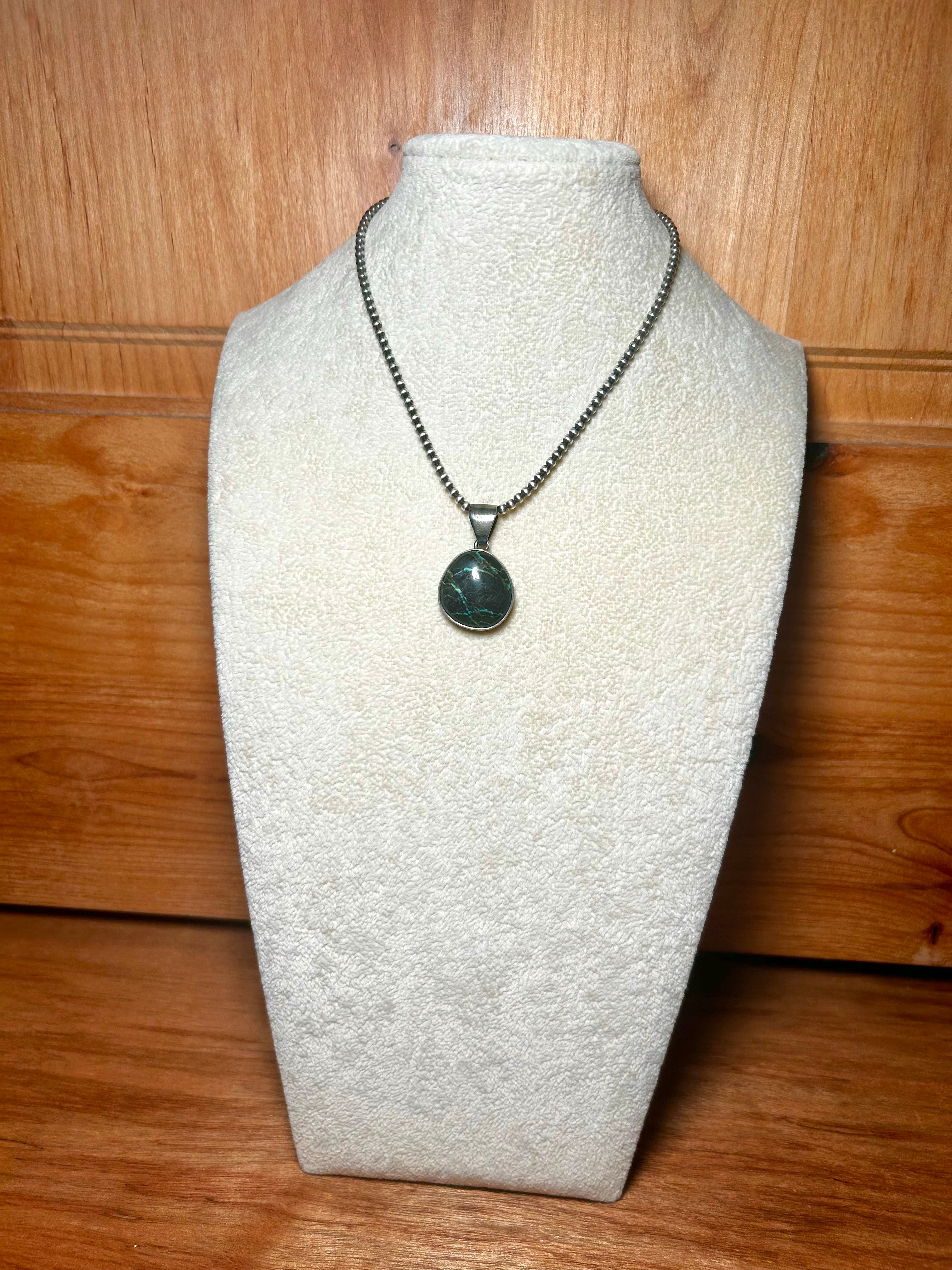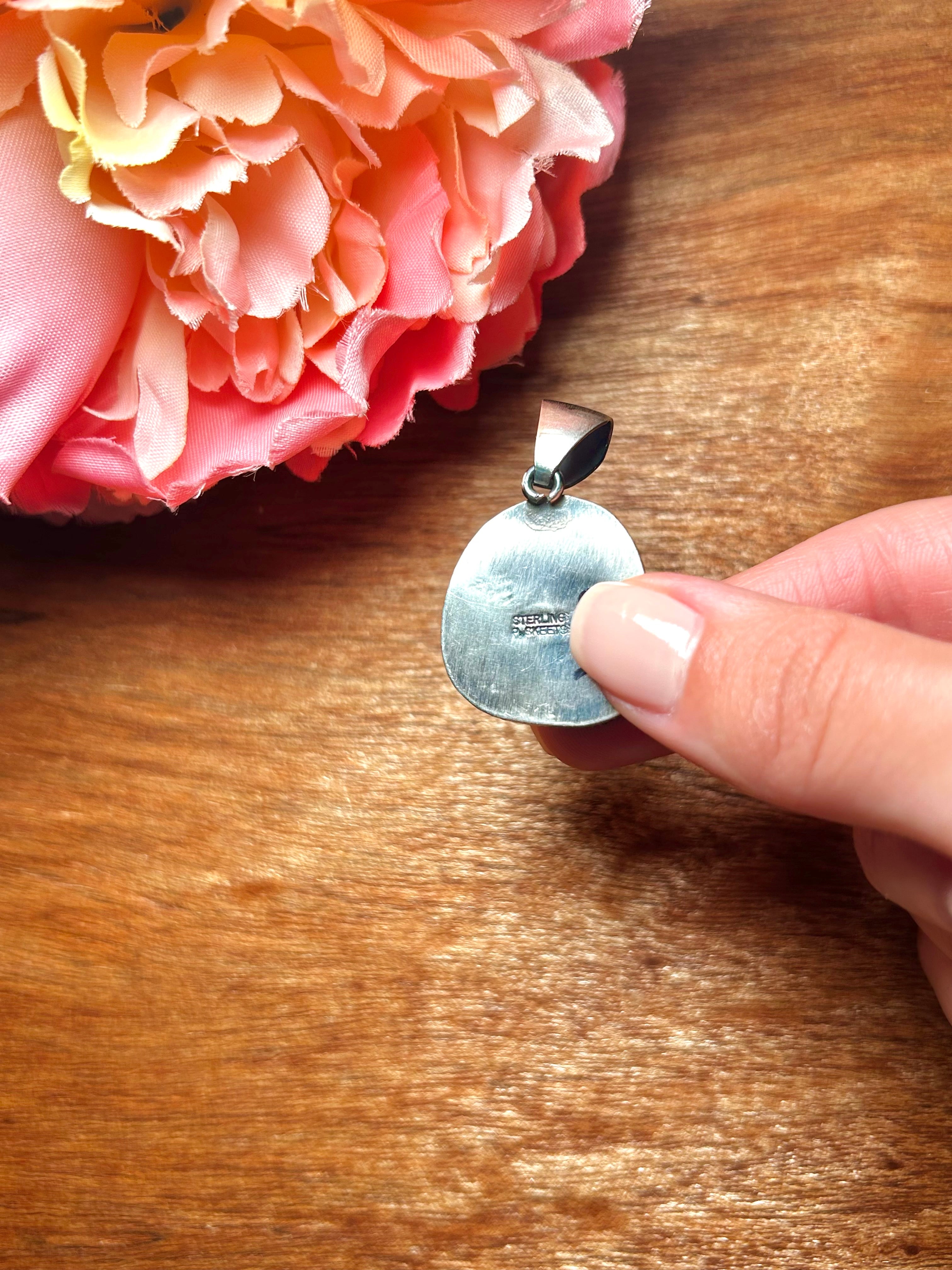Navajo Made Blue Moon Turquoise & Sterling Silver Pendant. It measures 1 1/2 inches long and 7/8 of an inch wide. Pendant Only. Signed by the artist and stamped sterling silver. Stones will vary due to natural stones