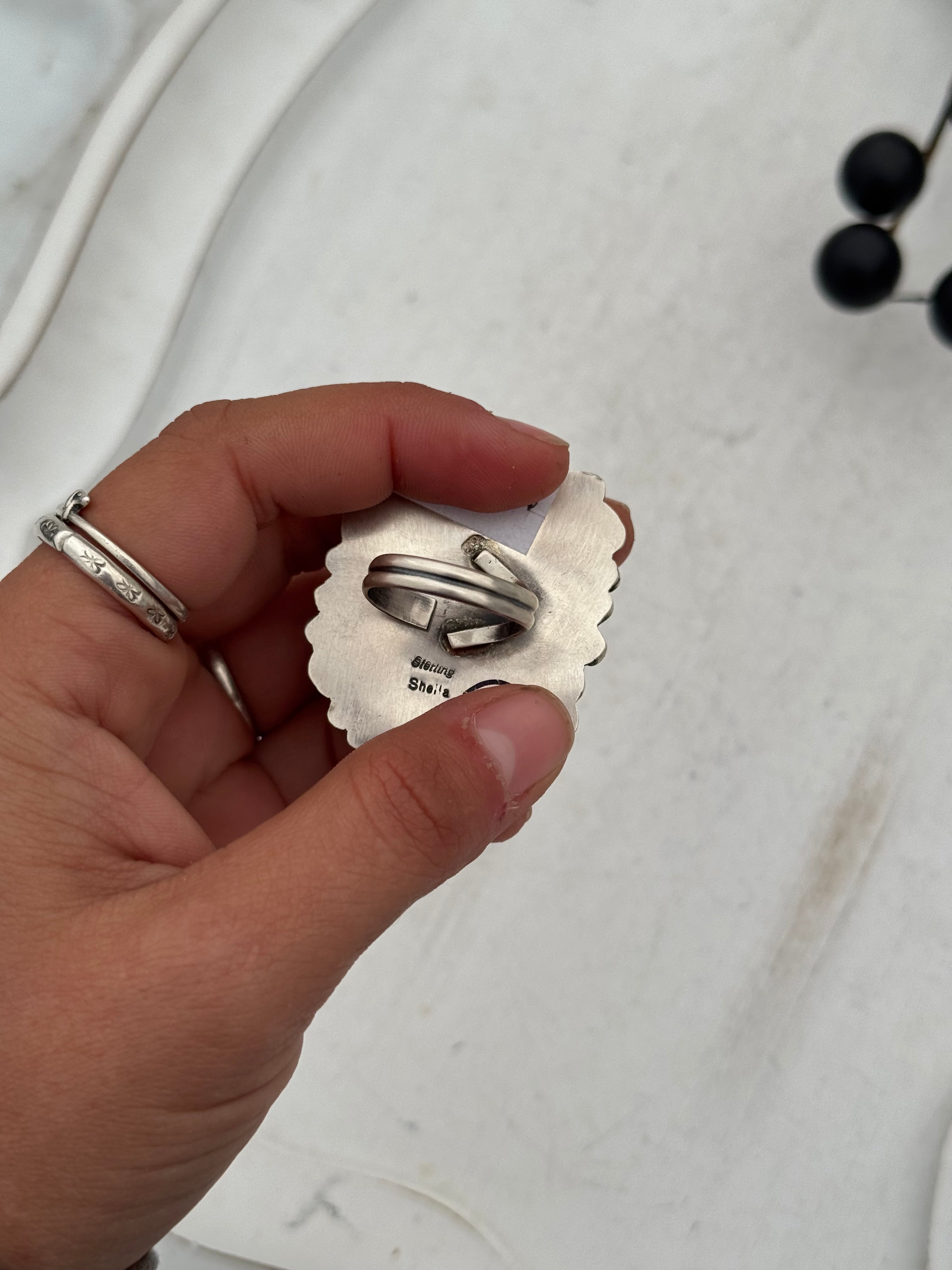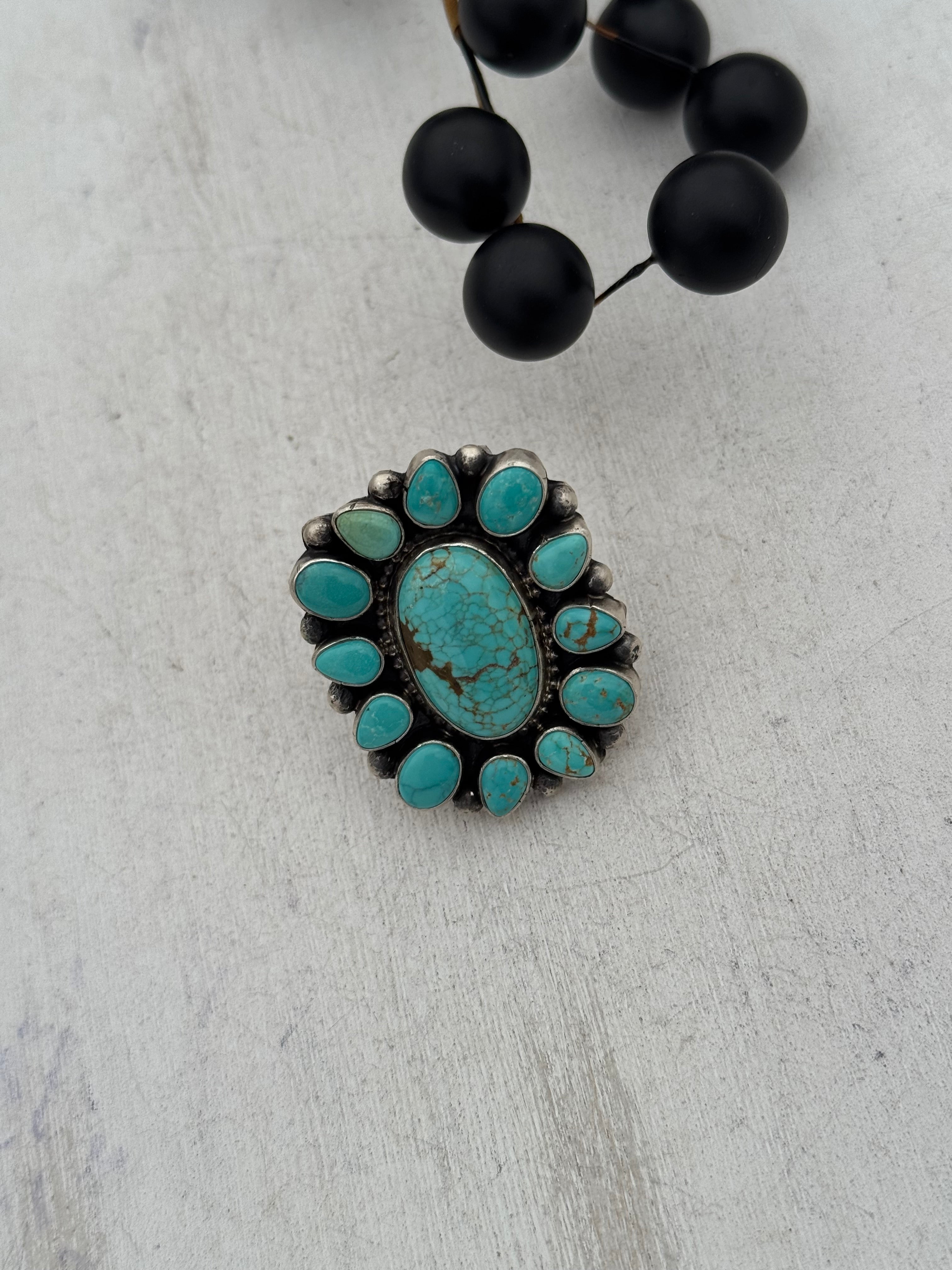 Navajo Made Mine 8 Turquoise & Sterling Silver Adjustable Cluster Ring. It measures 1 3/4 inches long and 1 1/2 inches wide. Signed by the artist and stamped sterling silver.