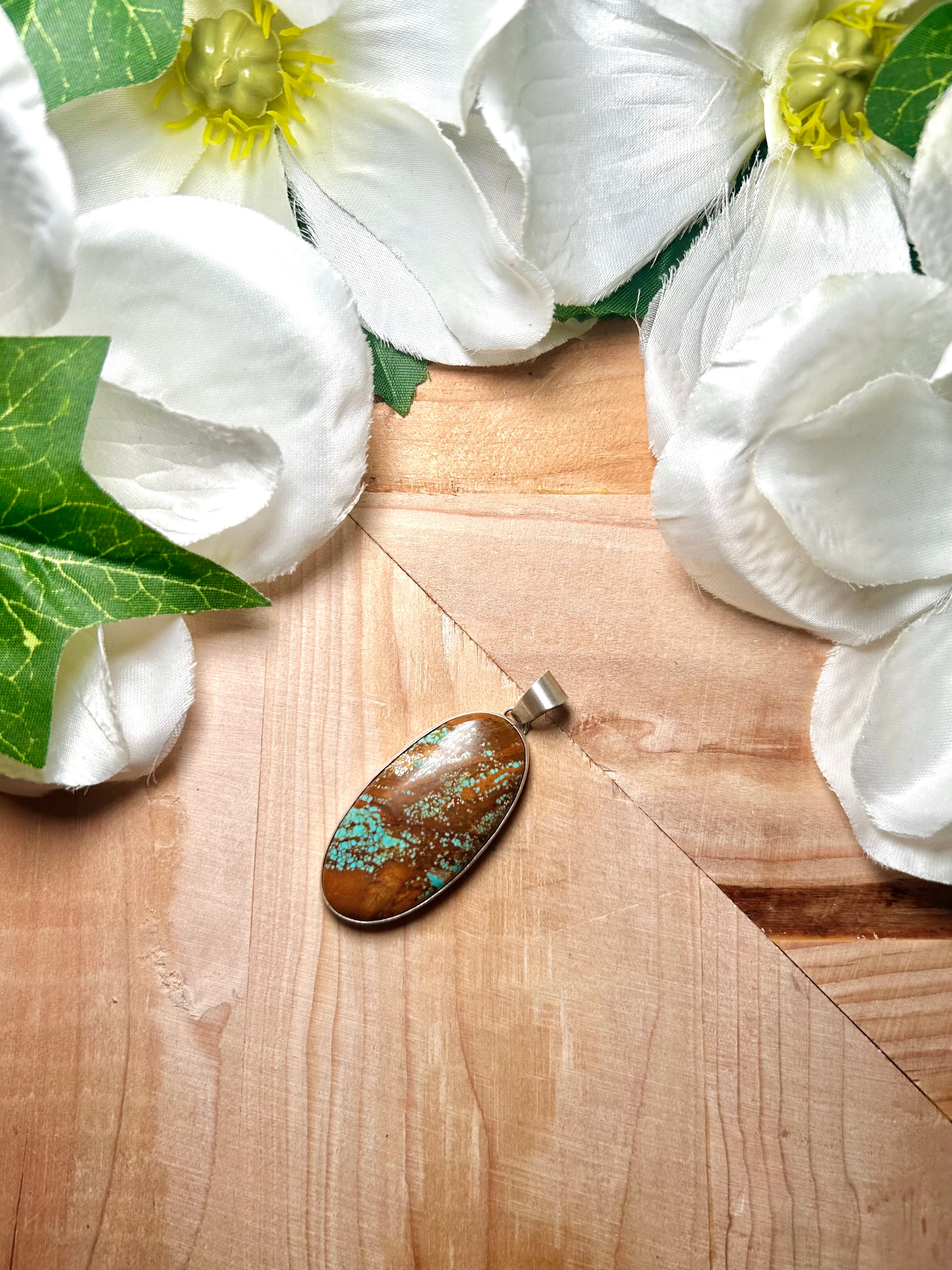 Navajo Made #8 Turquoise & Sterling Silver Pendant. It measures 2 1/8 inches long and 7/8 of an inch wide. Pendant Only! Signed by the artist and stamped sterling silver.