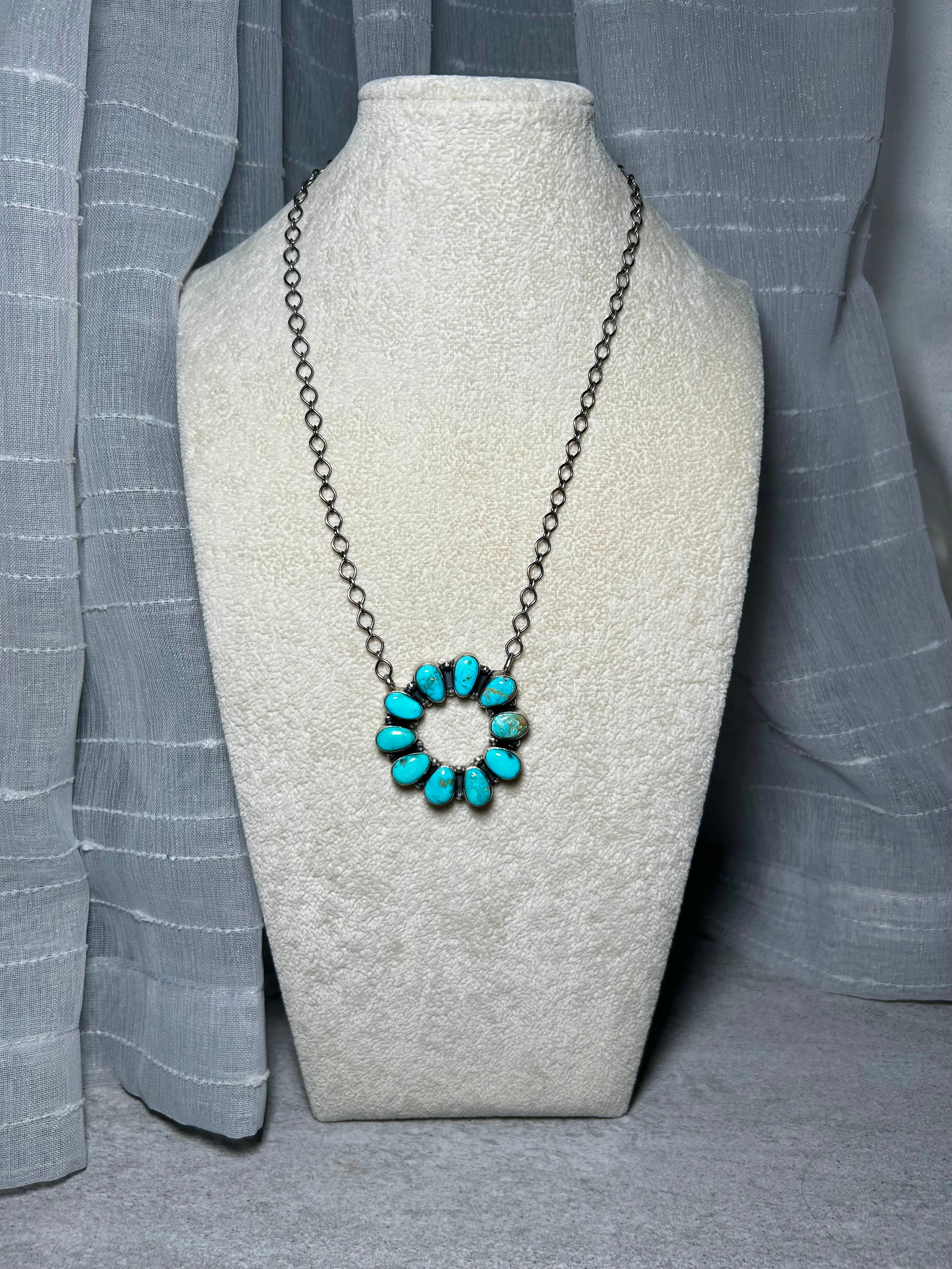 Navajo Made Royston turquoise & Sterling Silver Cluster Necklace. It measures 21 inches long with hang while the chain by itself measures 18 inches long. Signed by the artist and stamped sterling silver.