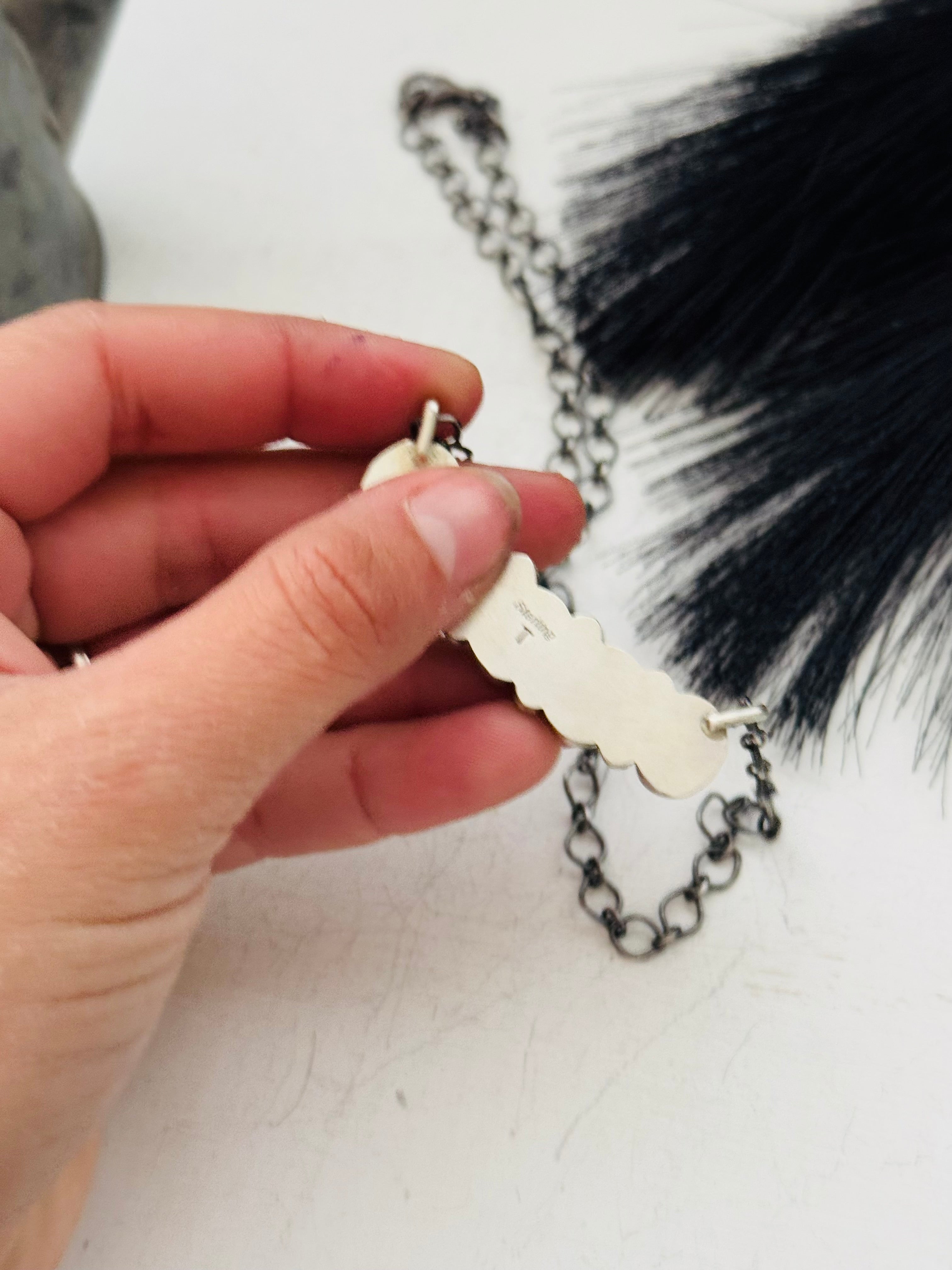 Timothy Yazzie Charoite & Sterling Silver Necklace. It measures 20 inches long with hang while the chain by itself measures 19 inches long. Signed by the artist and stamped sterling silver. Stones will differ due to natural stones.