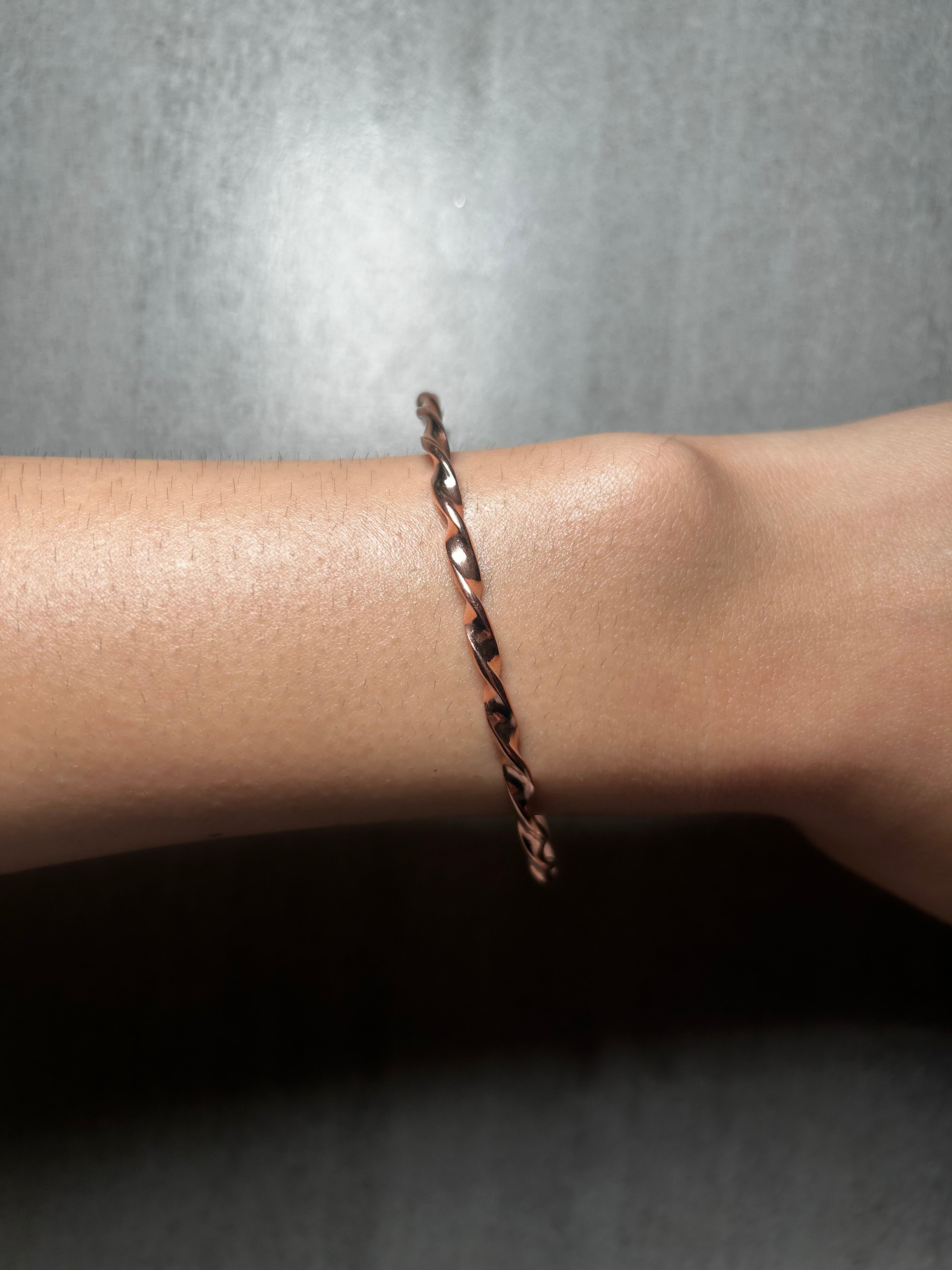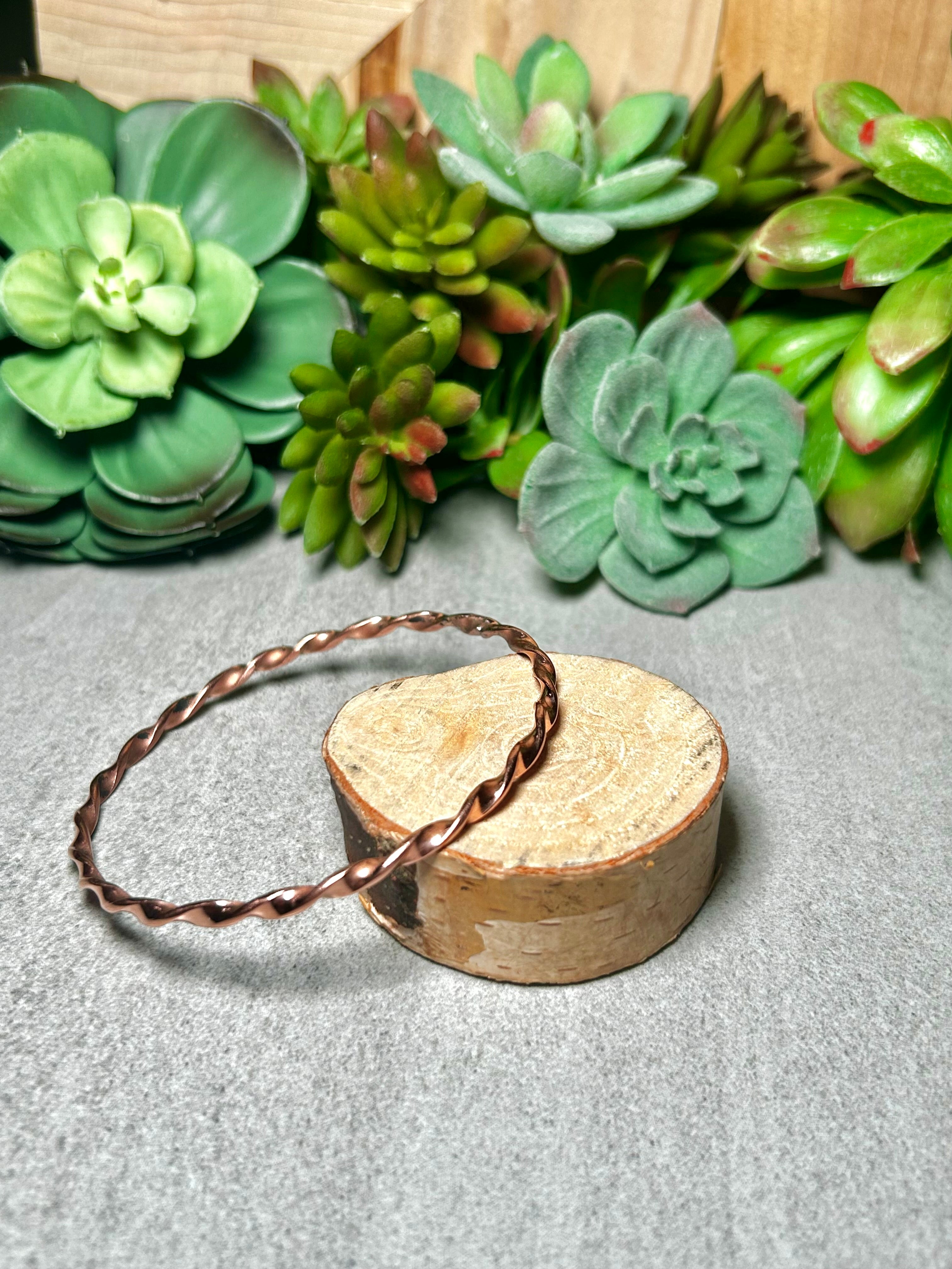 Navajo Made Copper Bangle Bracelet. It has an inside circumference of 8 inches and it measures 1/8 of an inch wide. Signed by artist and stamped sterling silver.
