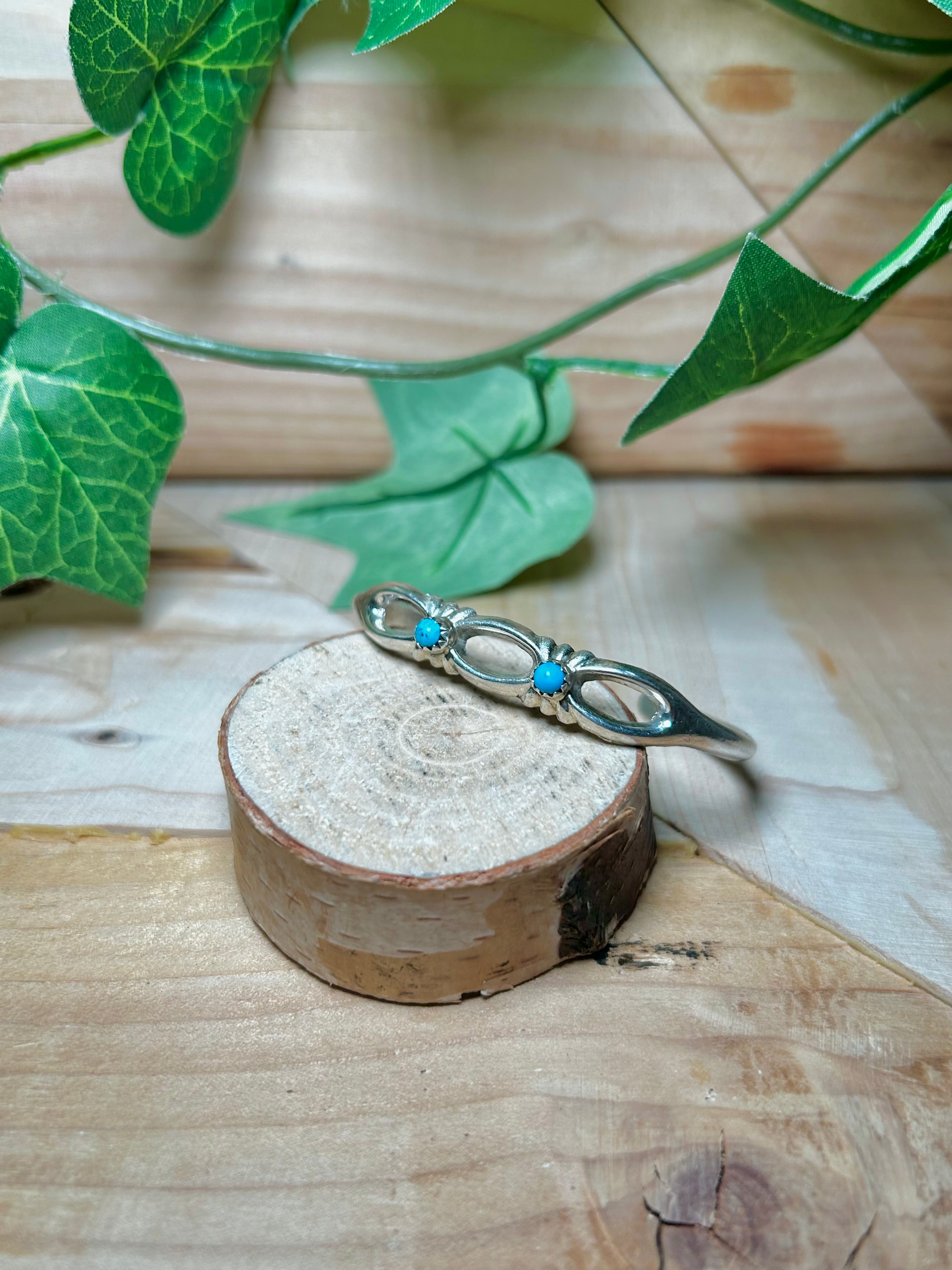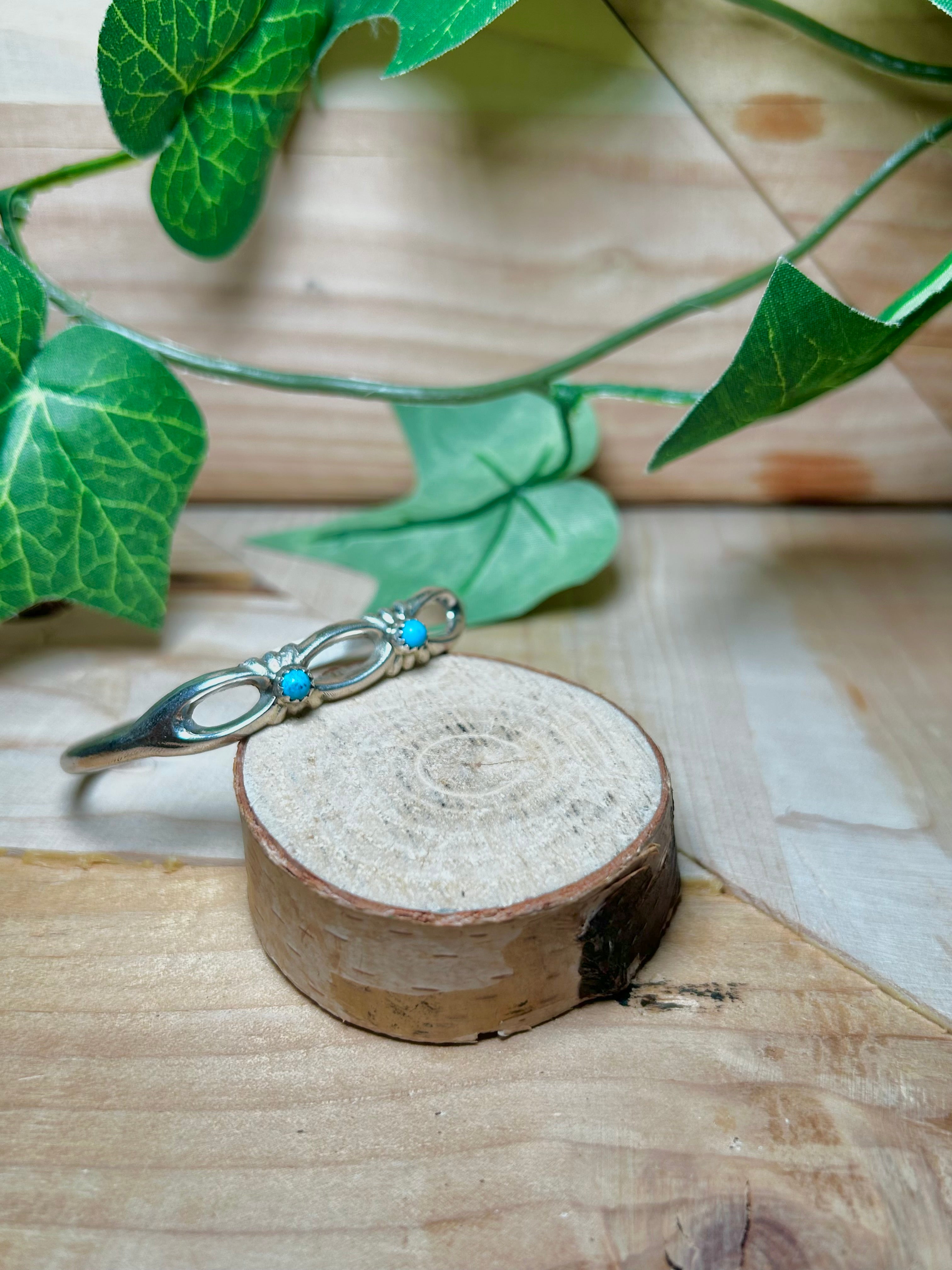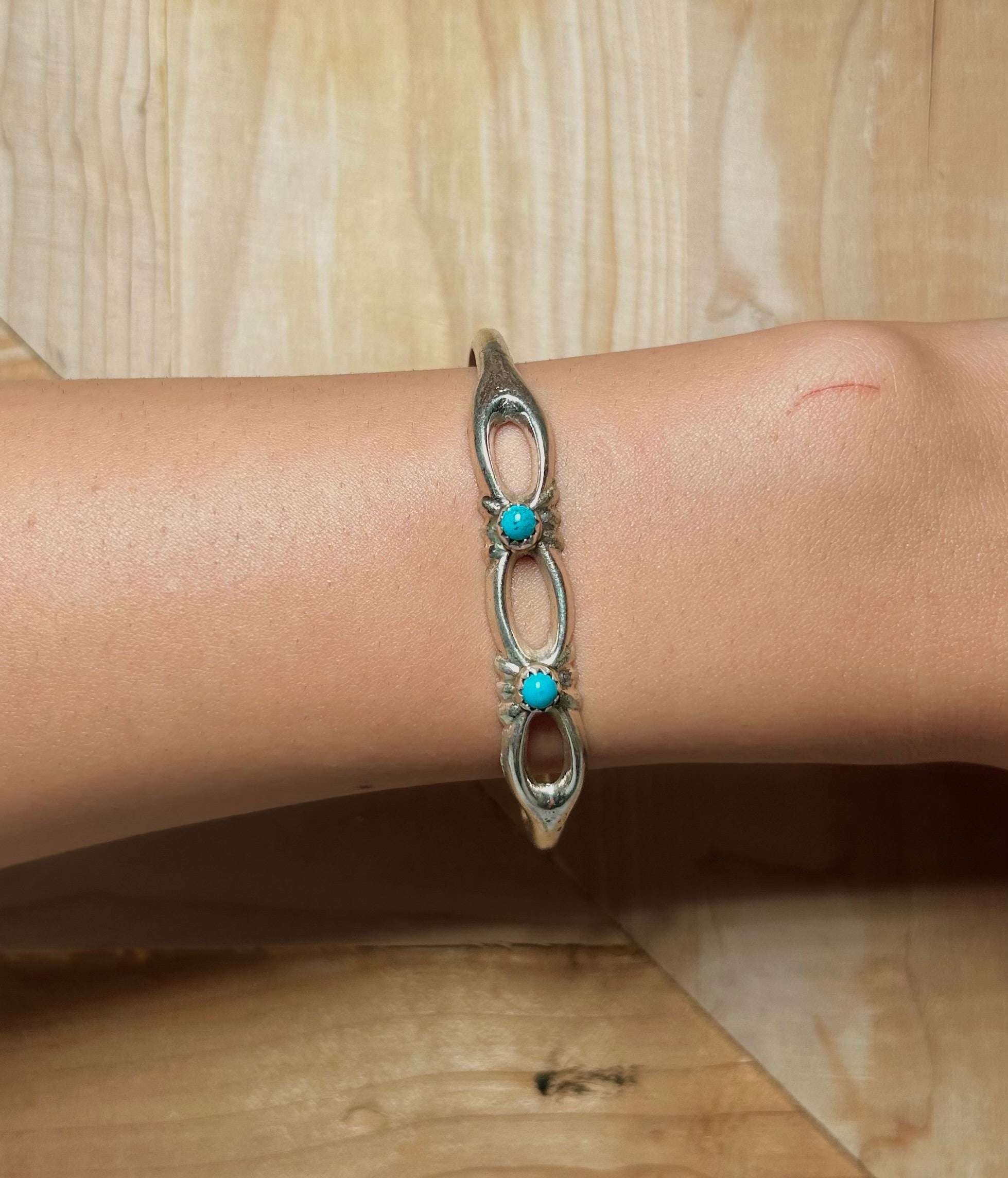Navajo Made Kingman Turquoise & Sterling Silver Cuff Bracelet. It measures a 3/8 of an inch wide with an inside circumference of 5 1/4 inches and a gap of 1 1/8 inches. Signed by the artist and stamped sterling silver.