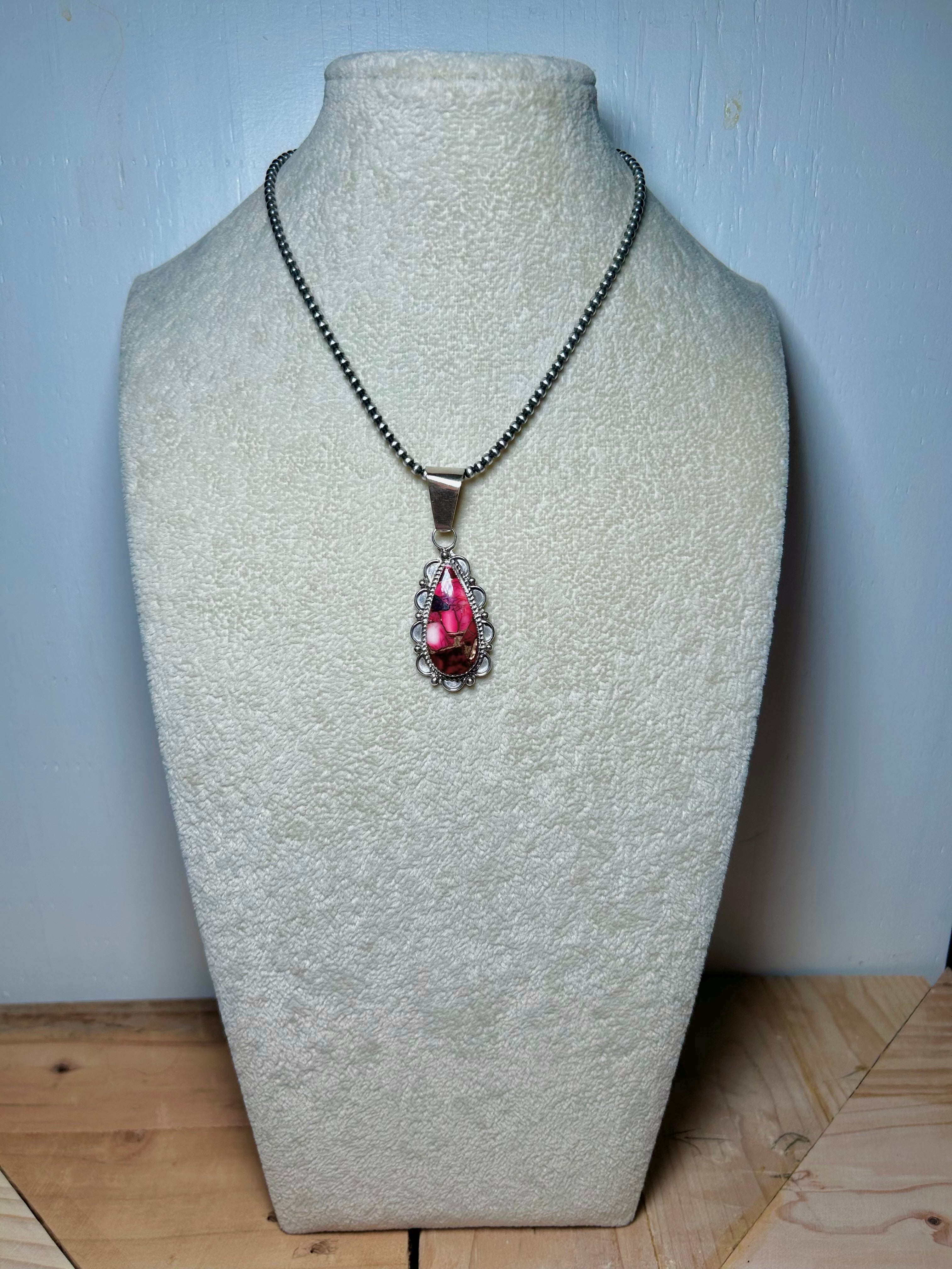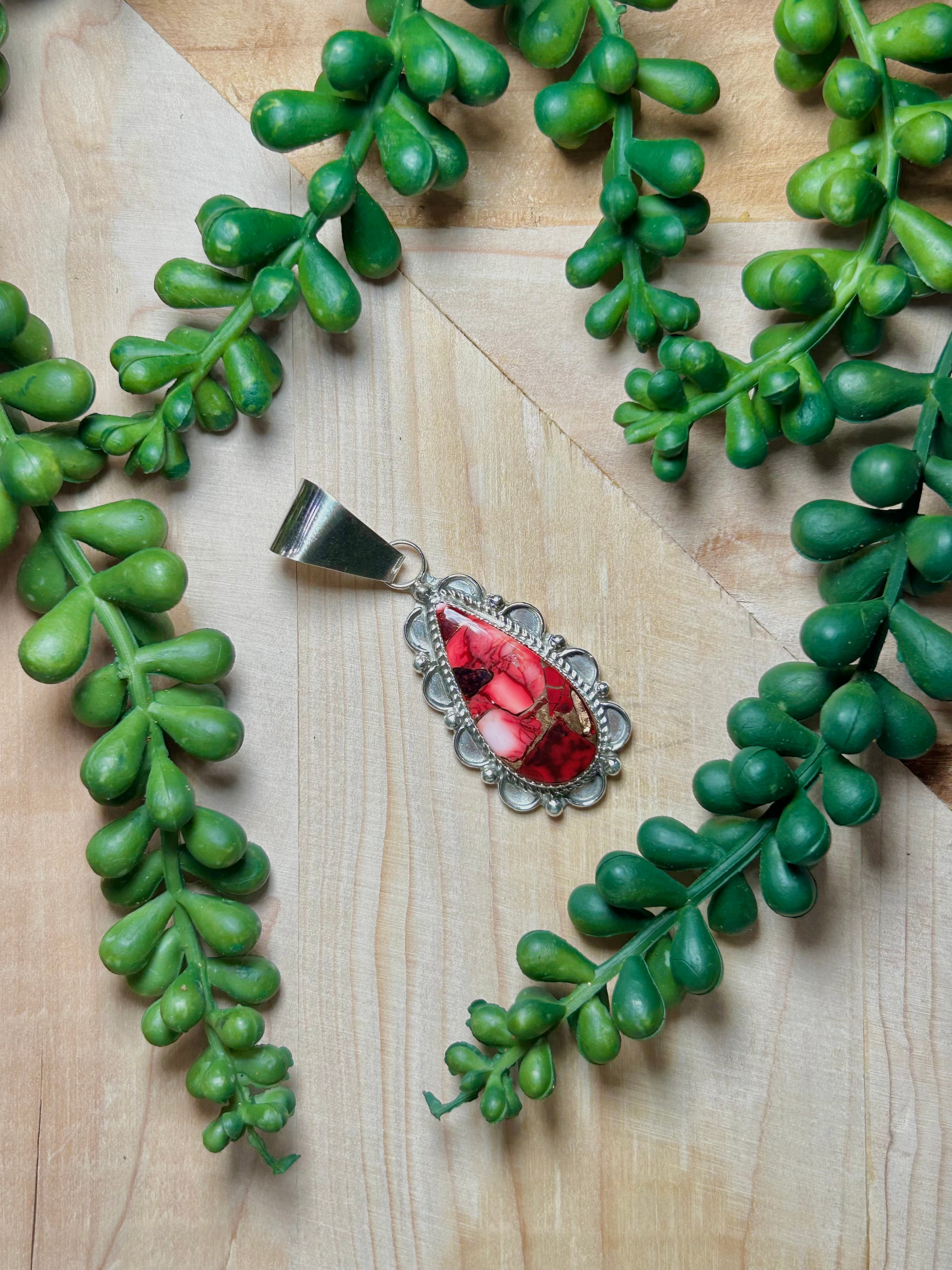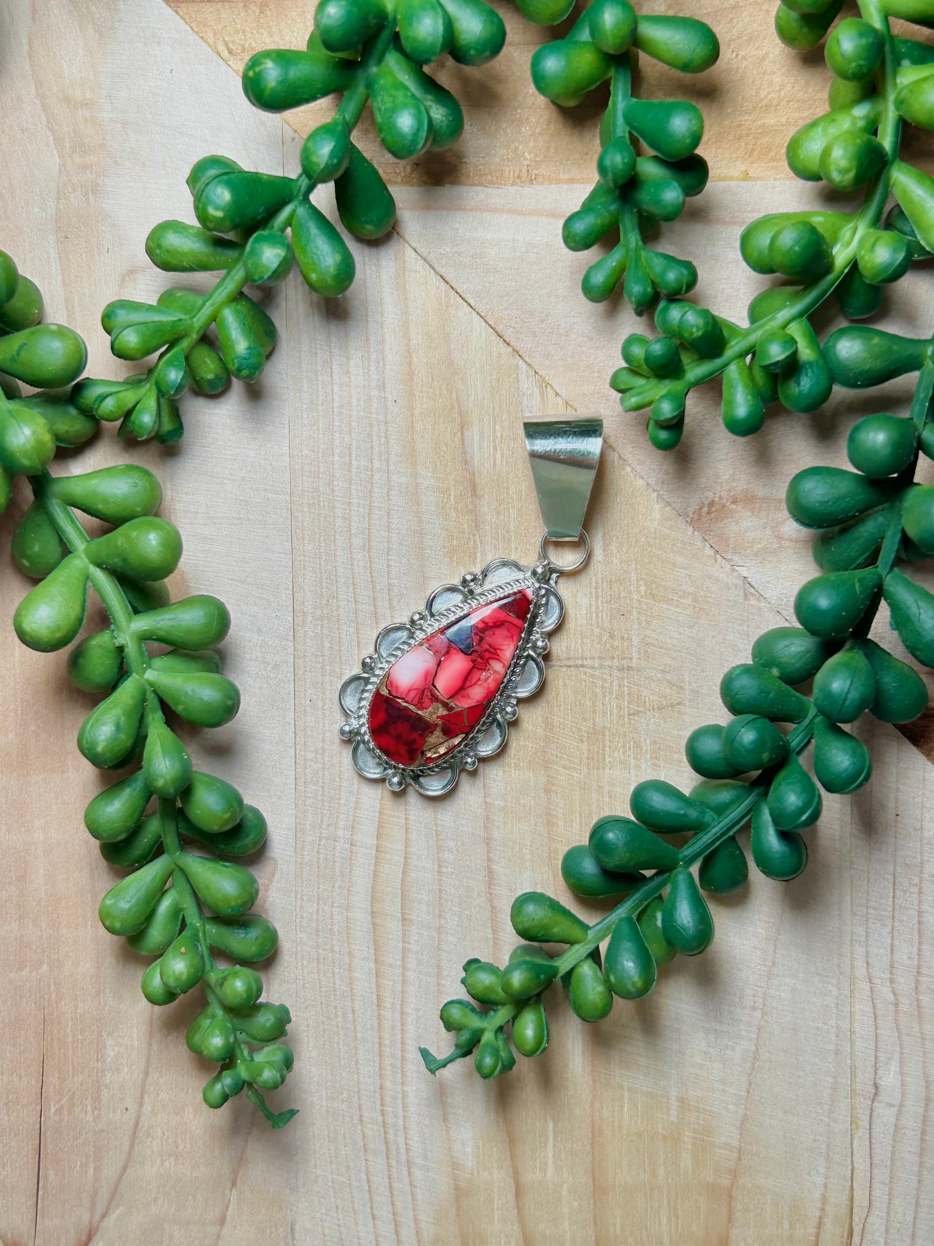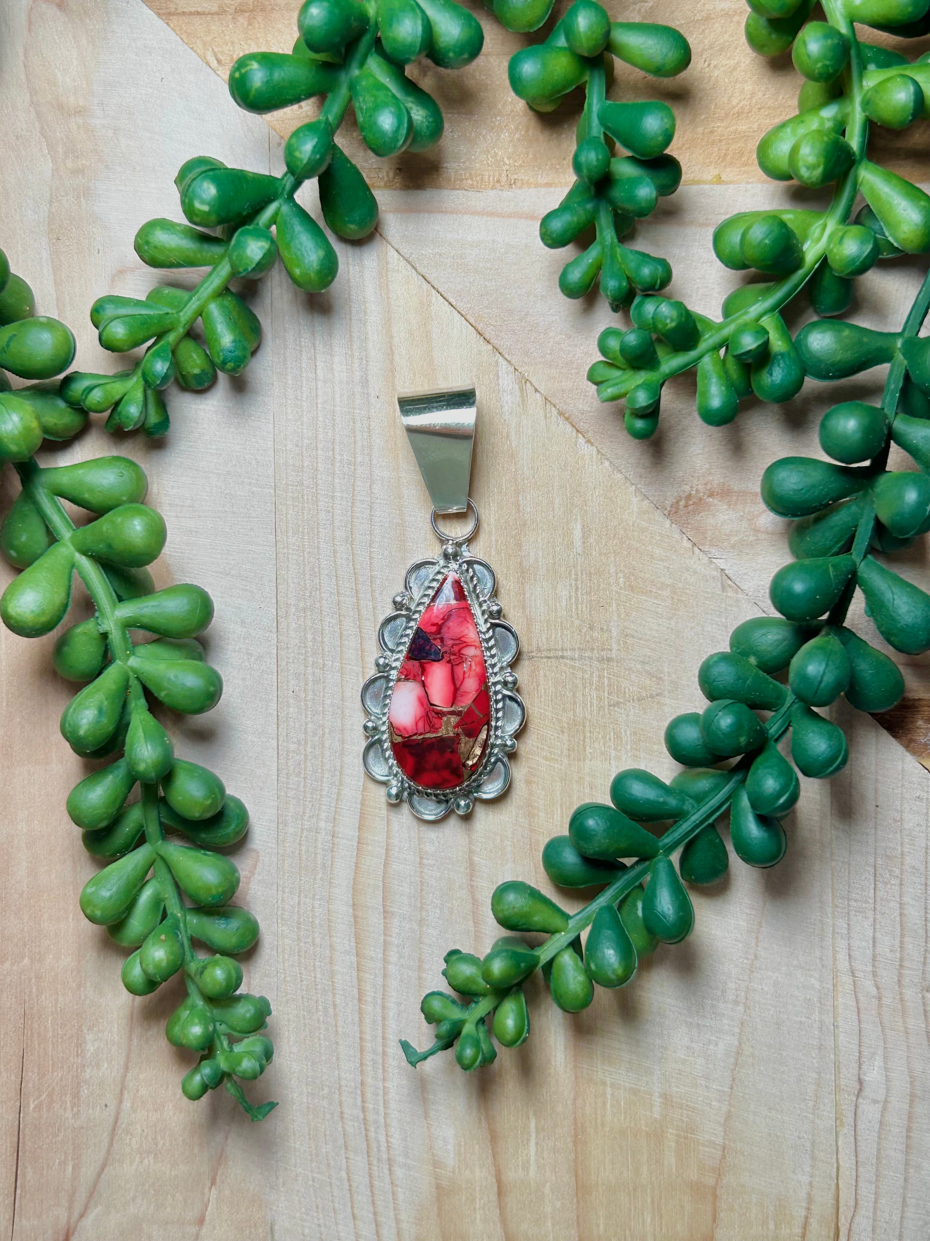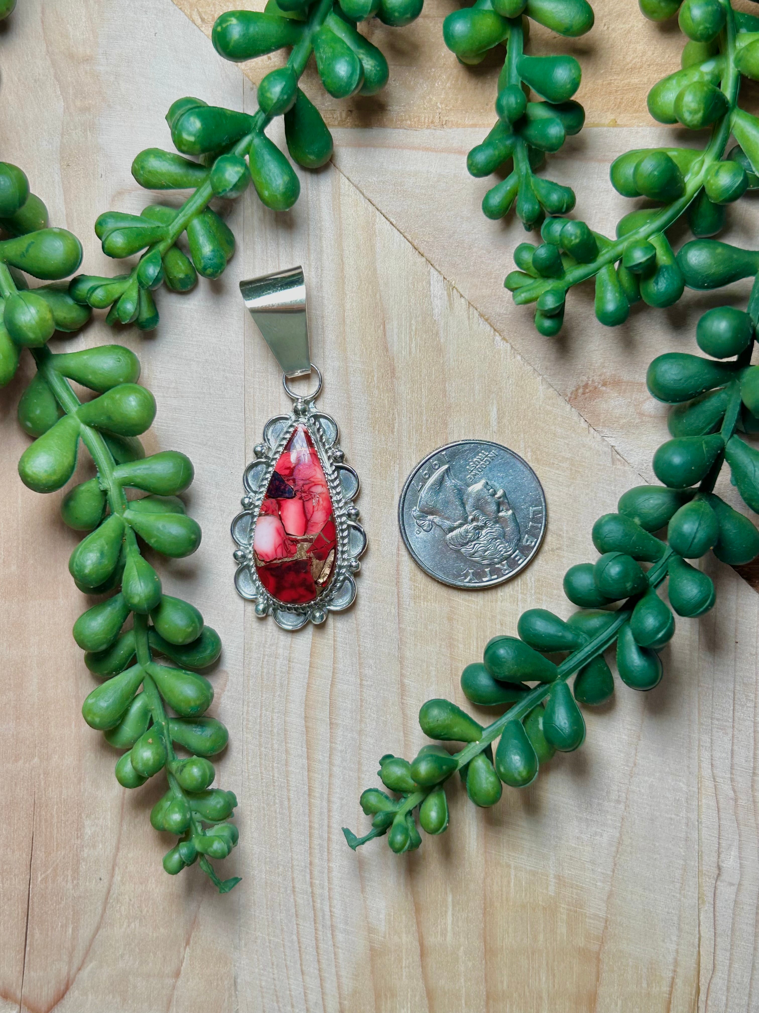 Navajo Made Rose Dahlia & Sterling Silver Cluster Pendant. It measures 2 1/4 inches long and 7/8 of an inch wide. Pendant Only. Signed by the artist and stamped sterling silver.