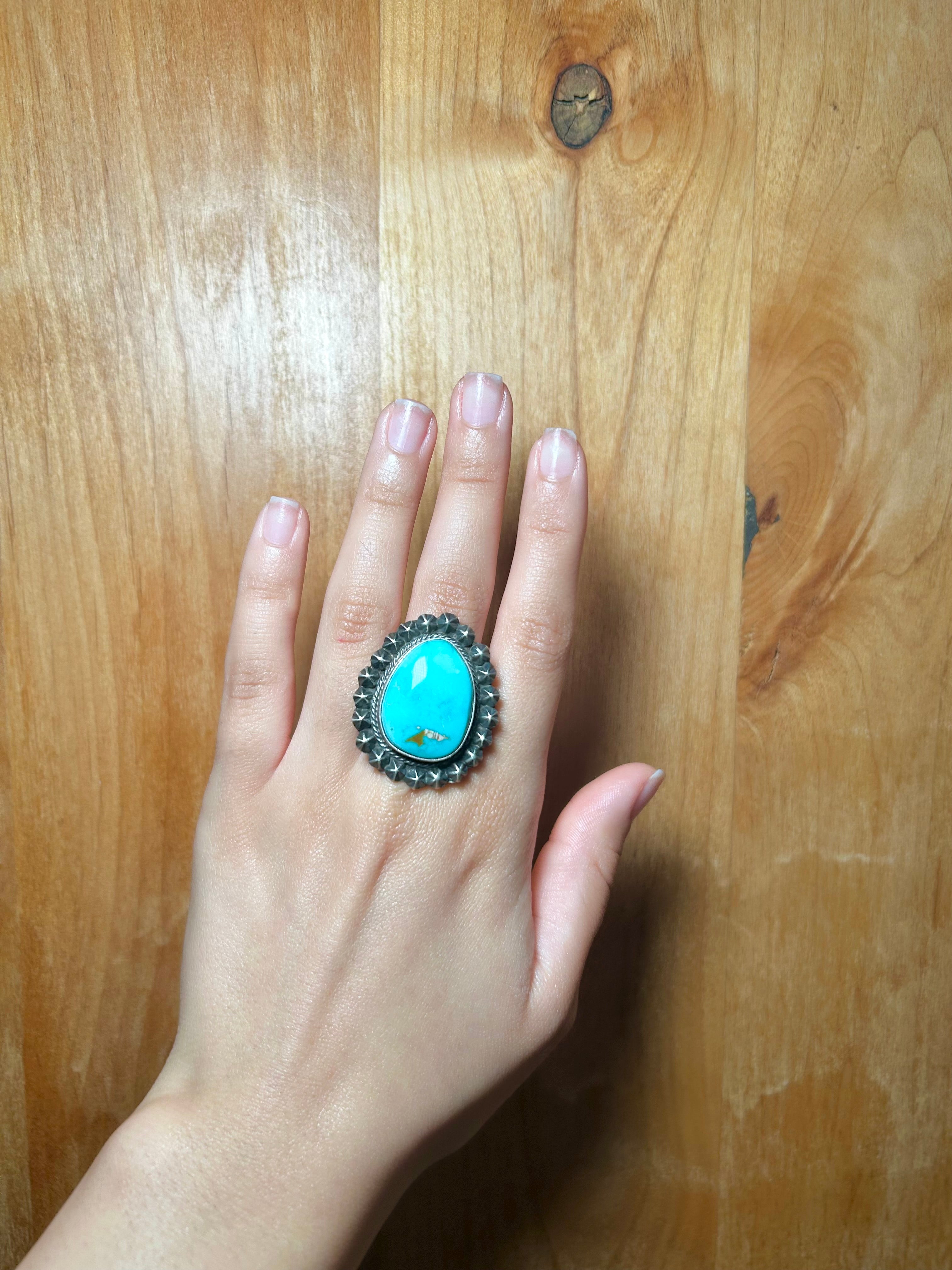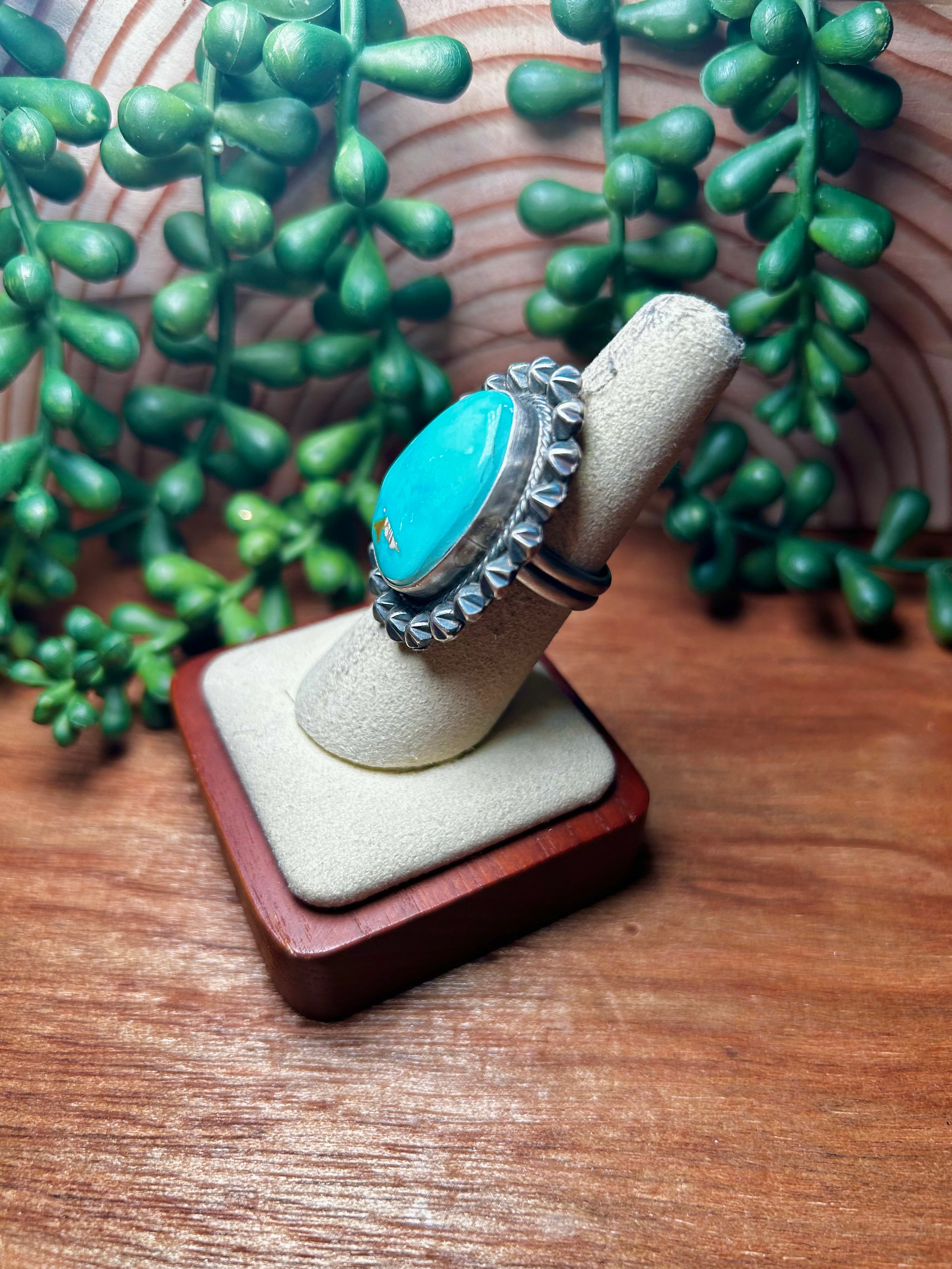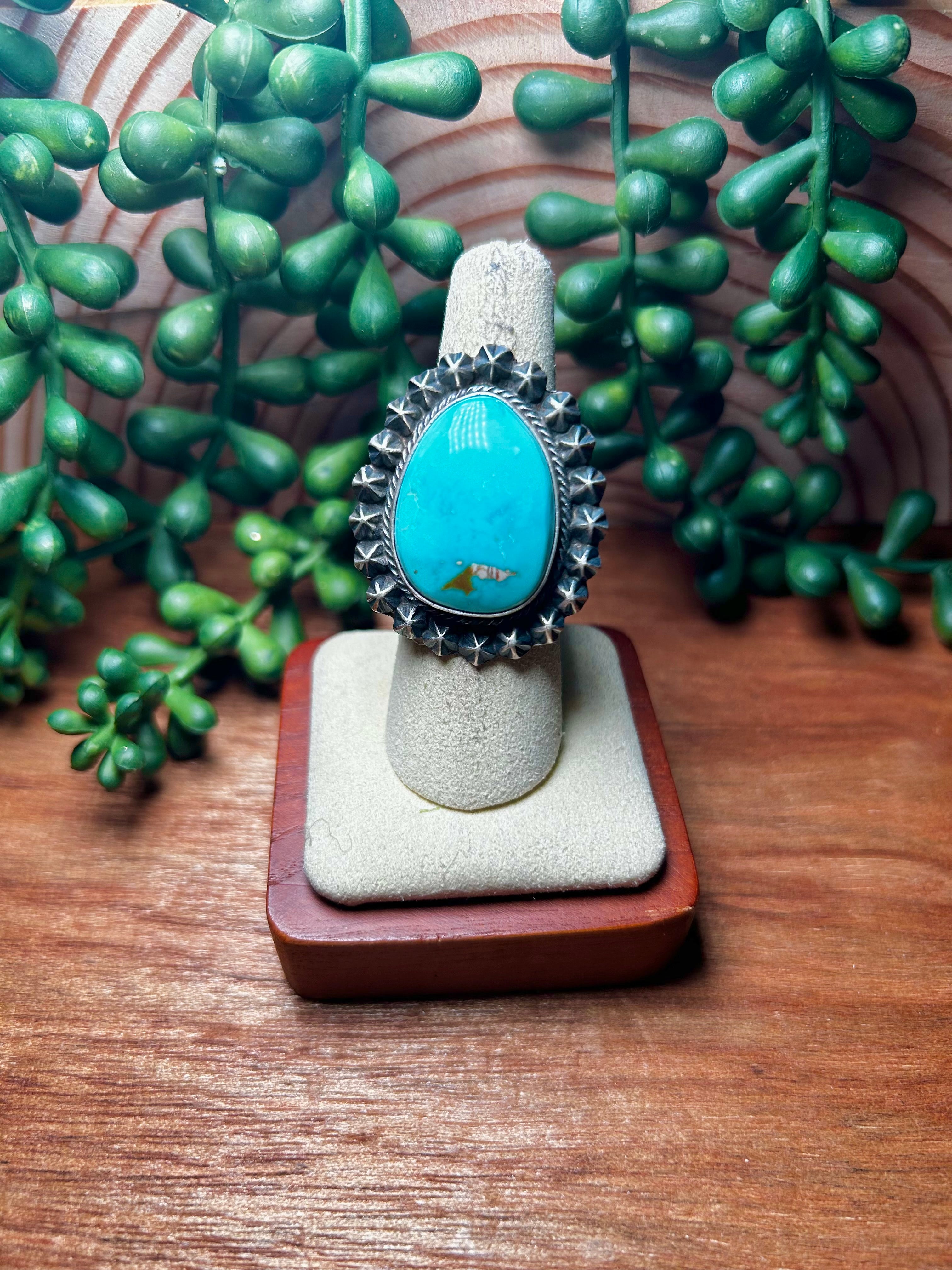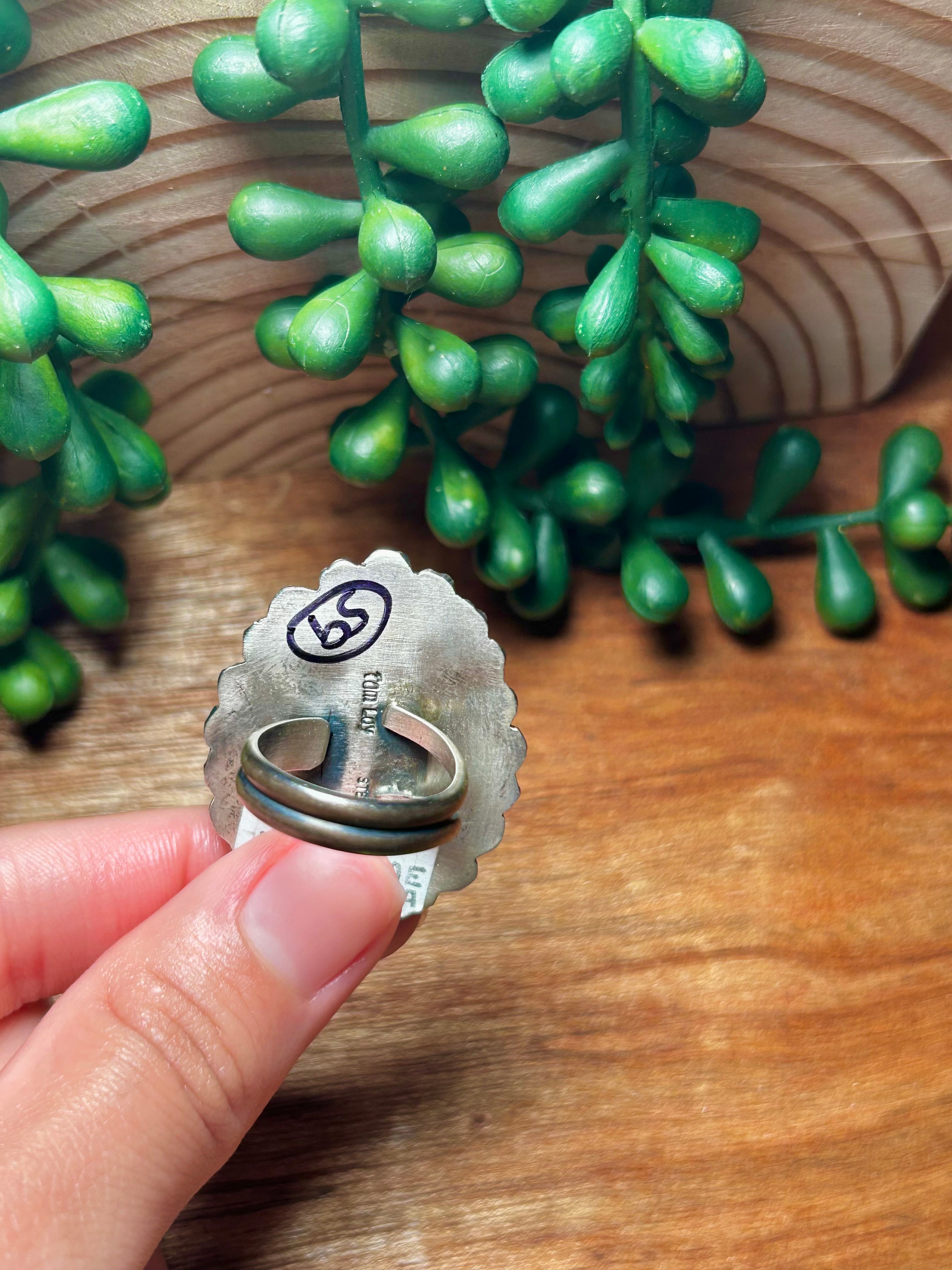 Tom Loy Royston Turquoise & Sterling Silver Adjustable Ring It measures 1 1/2 inches long and 1 1/8 inches wide. Signed by the artist and stamped sterling silver.
