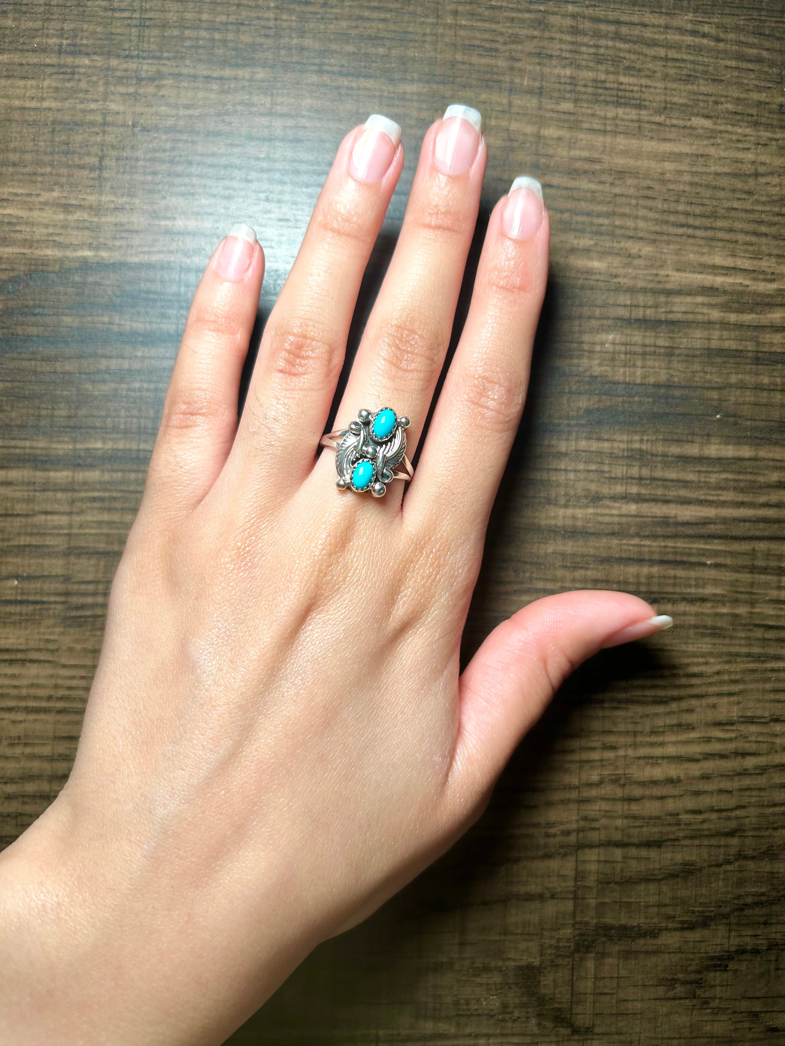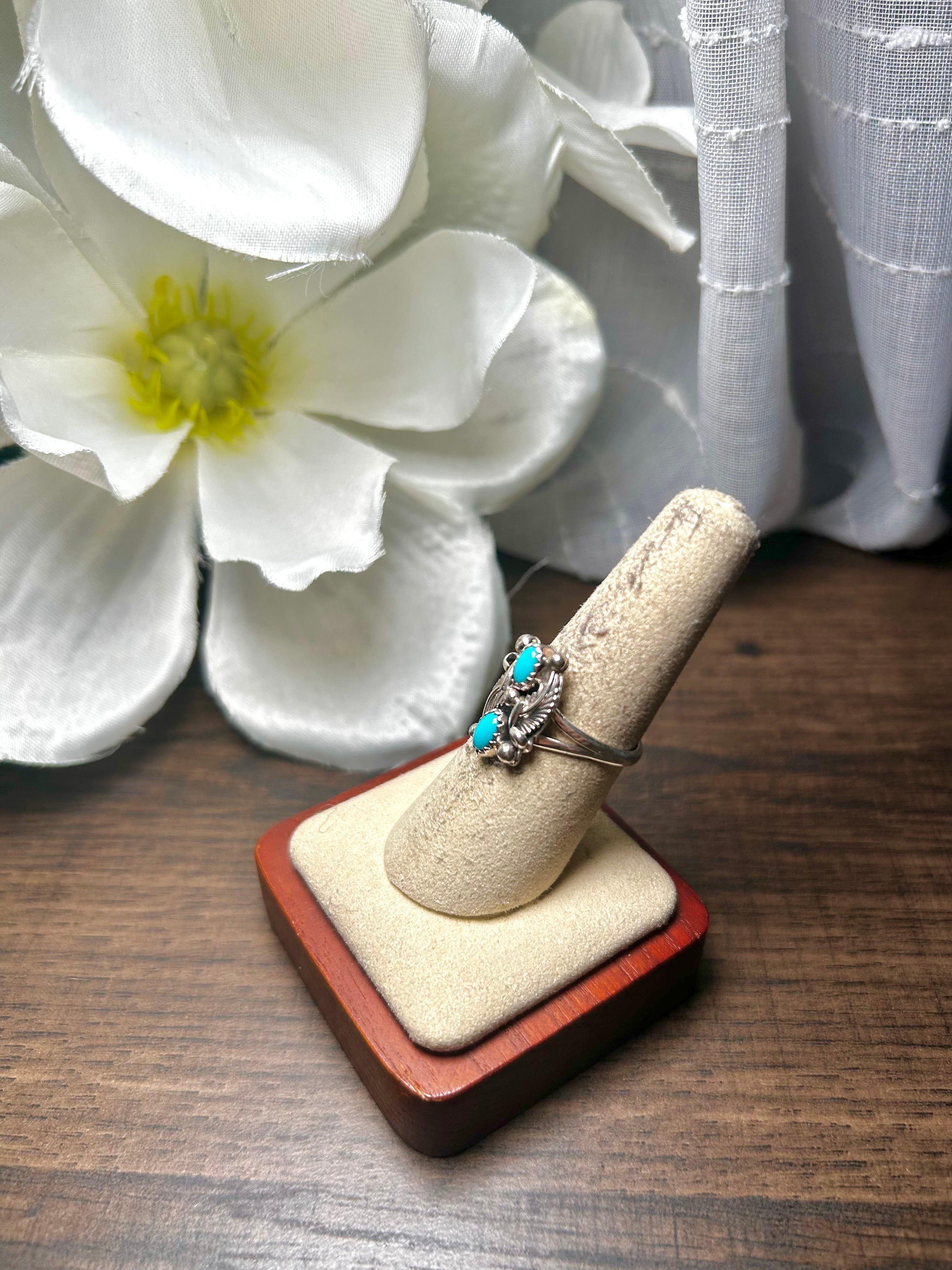Navajo Made Kingman Turquoise & Sterling Silver Ring. It measures 5/8 of an inch long and 1/2 of an inch wide. Signed by artist and stamped sterling silver.