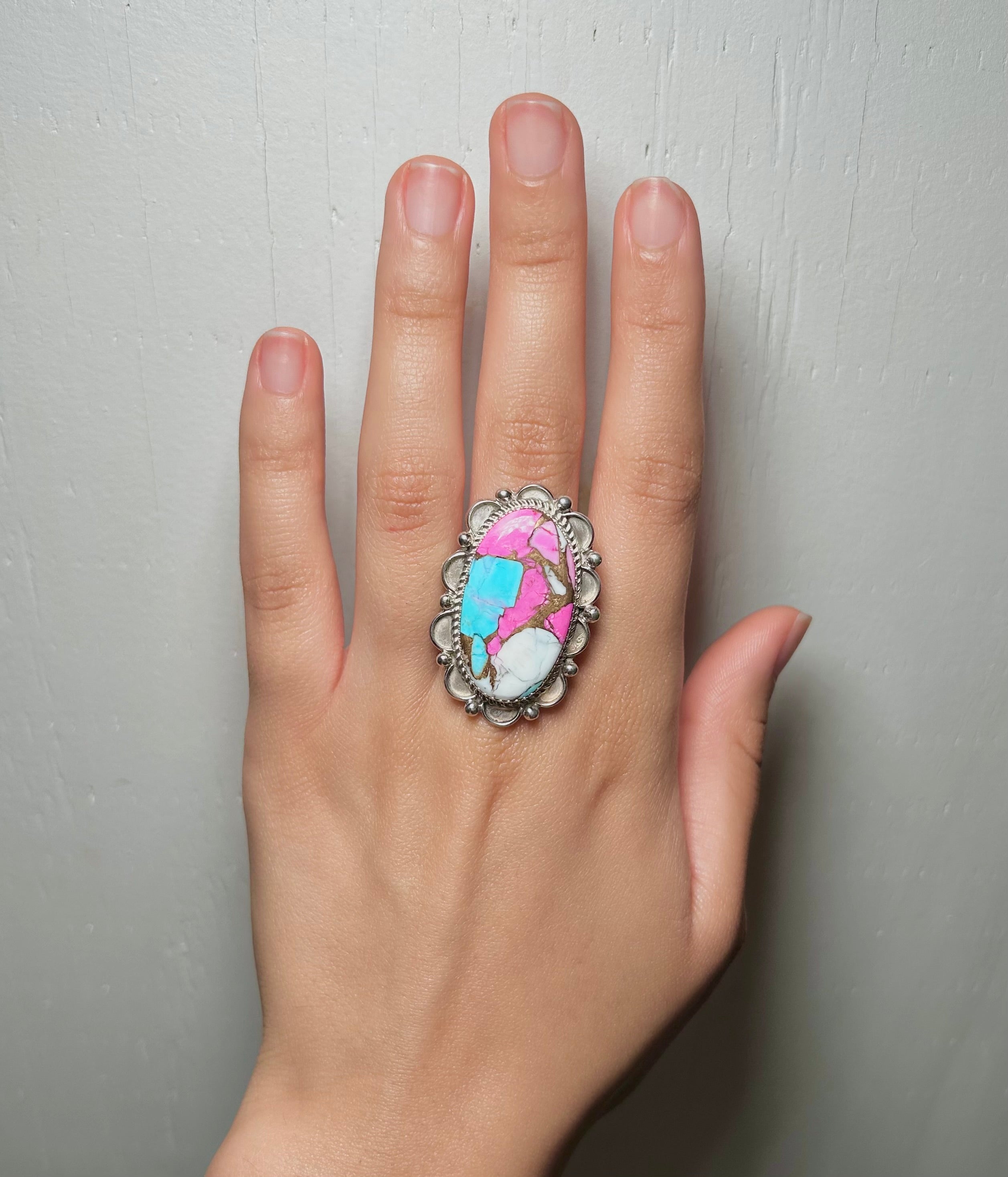 Navajo Made Cotton Candy Dahlia & Sterling Sliver Ring Size 8.25. It measures 1 1/2 inches long and 1 inch wide and Signed by the artist and stamped sterling silver.