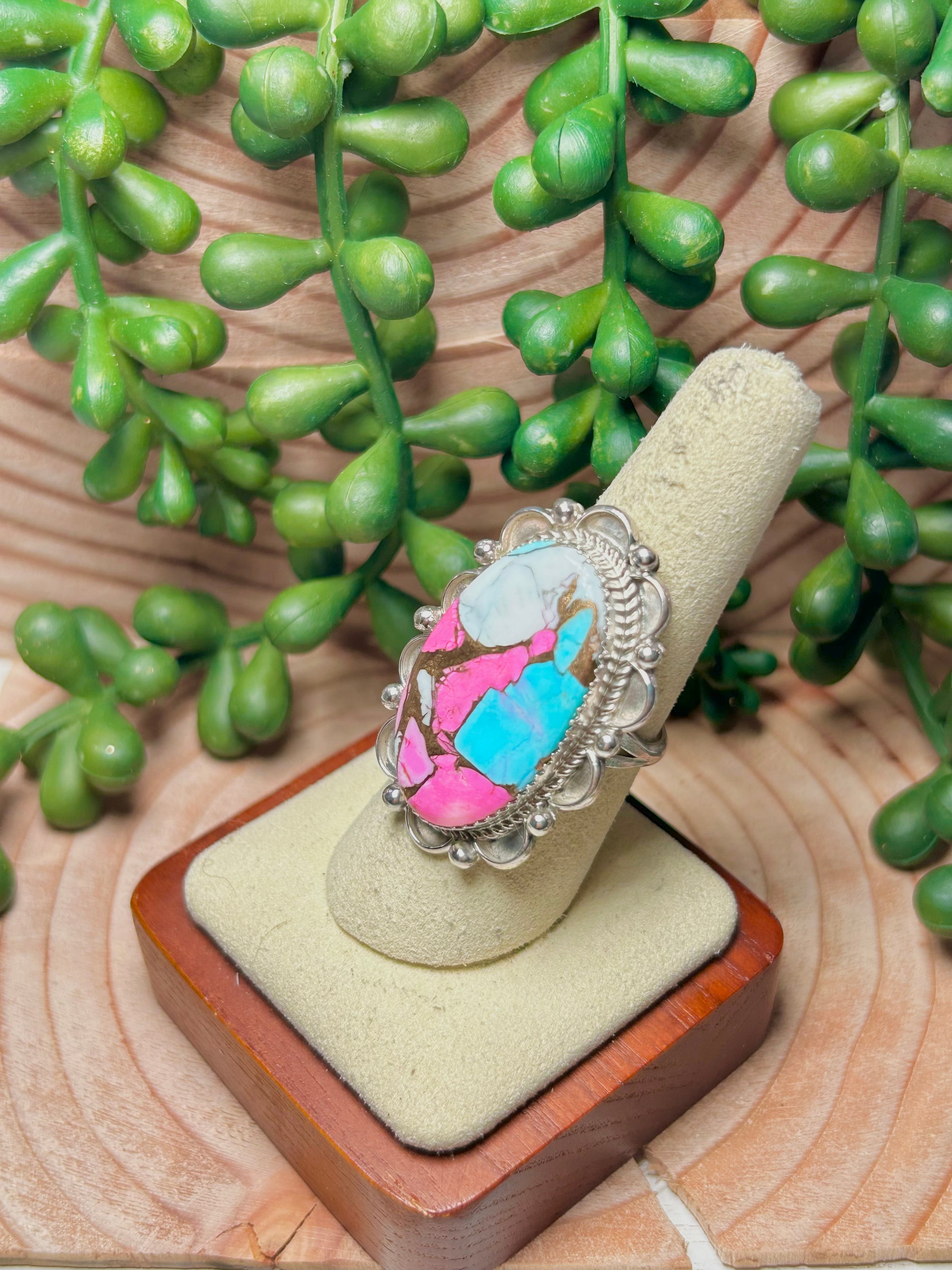 Navajo Made Cotton Candy Dahlia & Sterling Sliver Ring Size 8.25