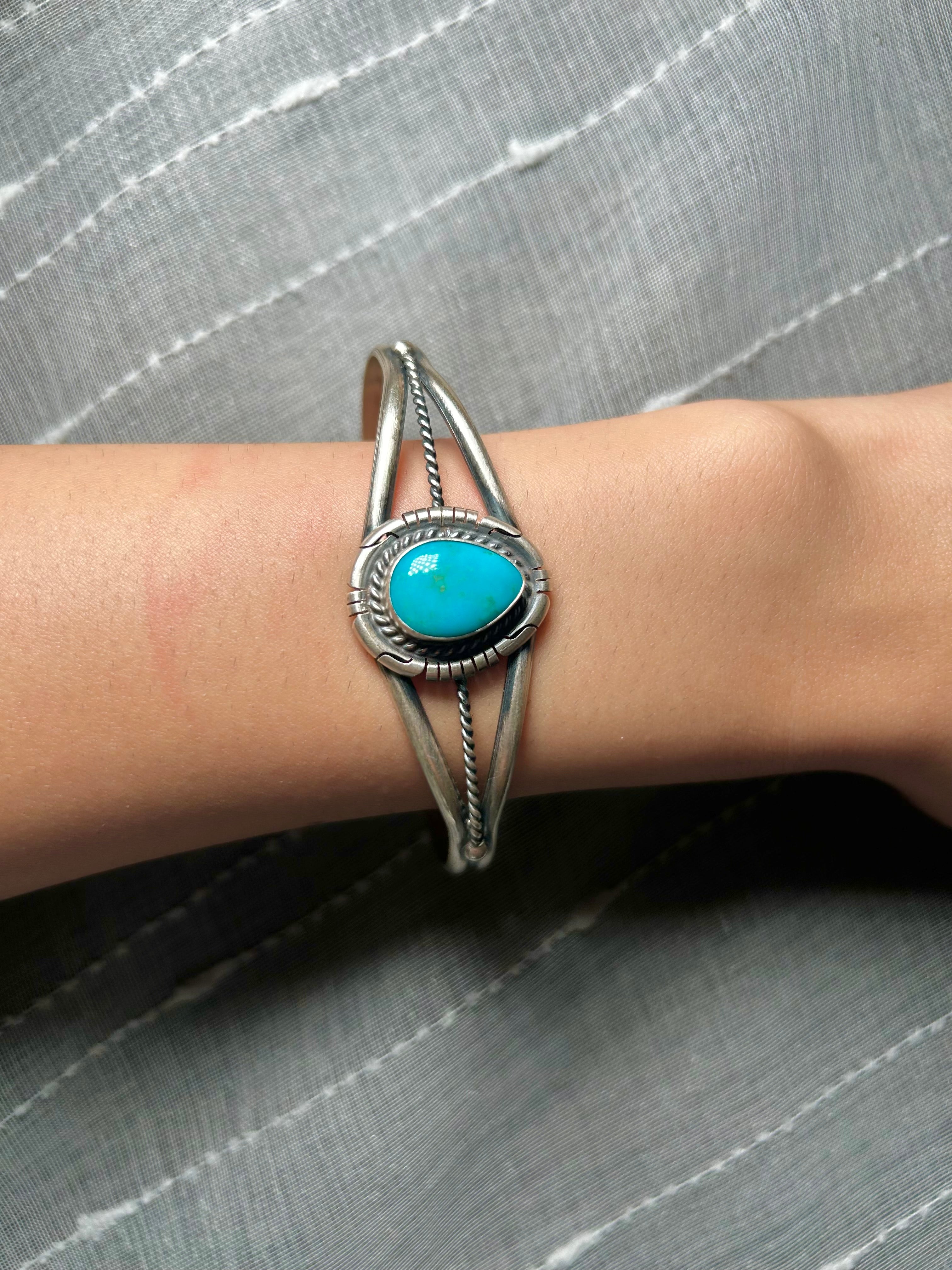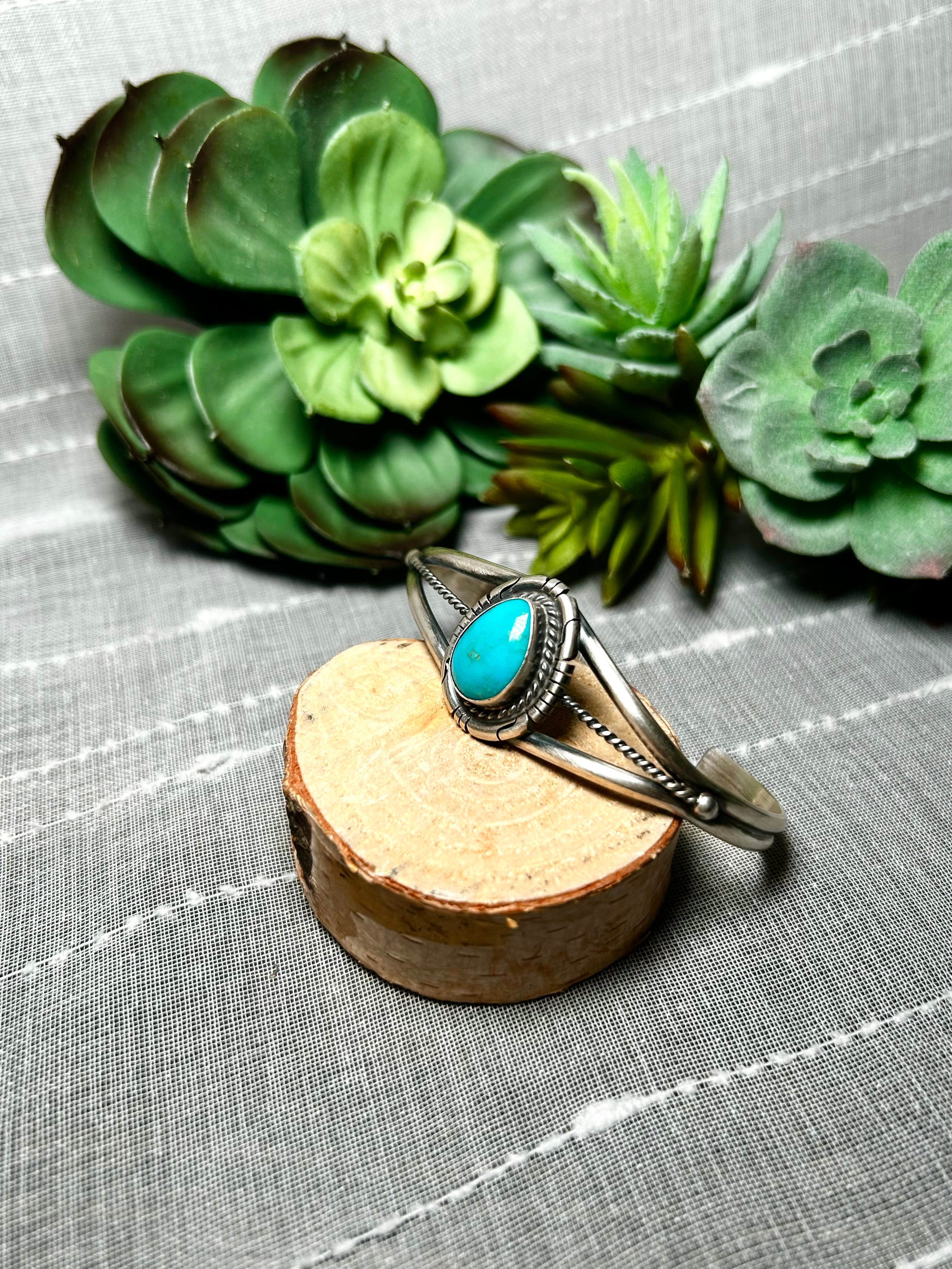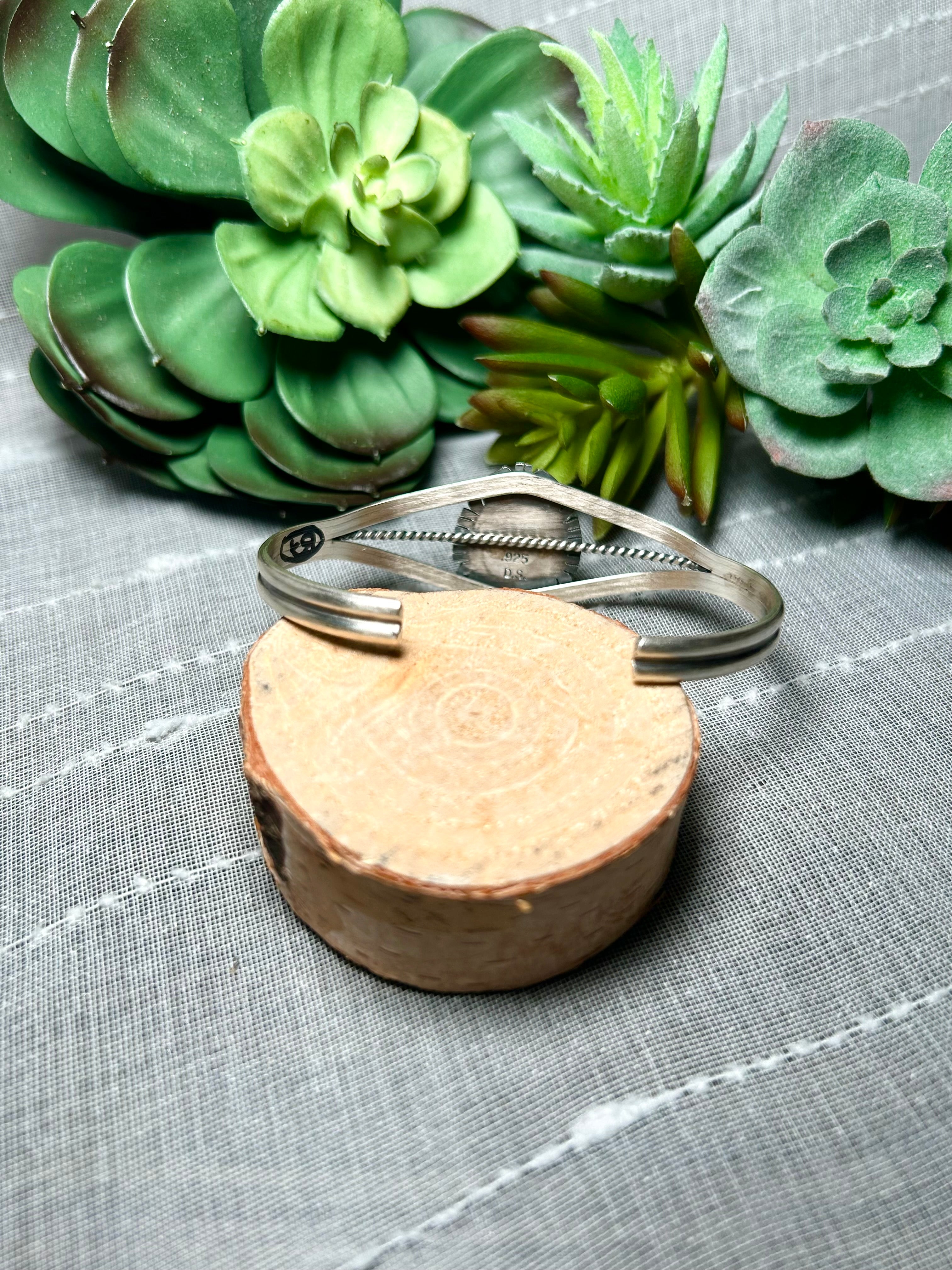Dave Skeets Kingman Turquoise & Sterling Silver Cuff Bracelet. It measures 7/8 of an inch wide with an inside circumference of 5 3/4 inches and a gap of 1 1/8 inches. Signed by the artist and stamped sterling silver.