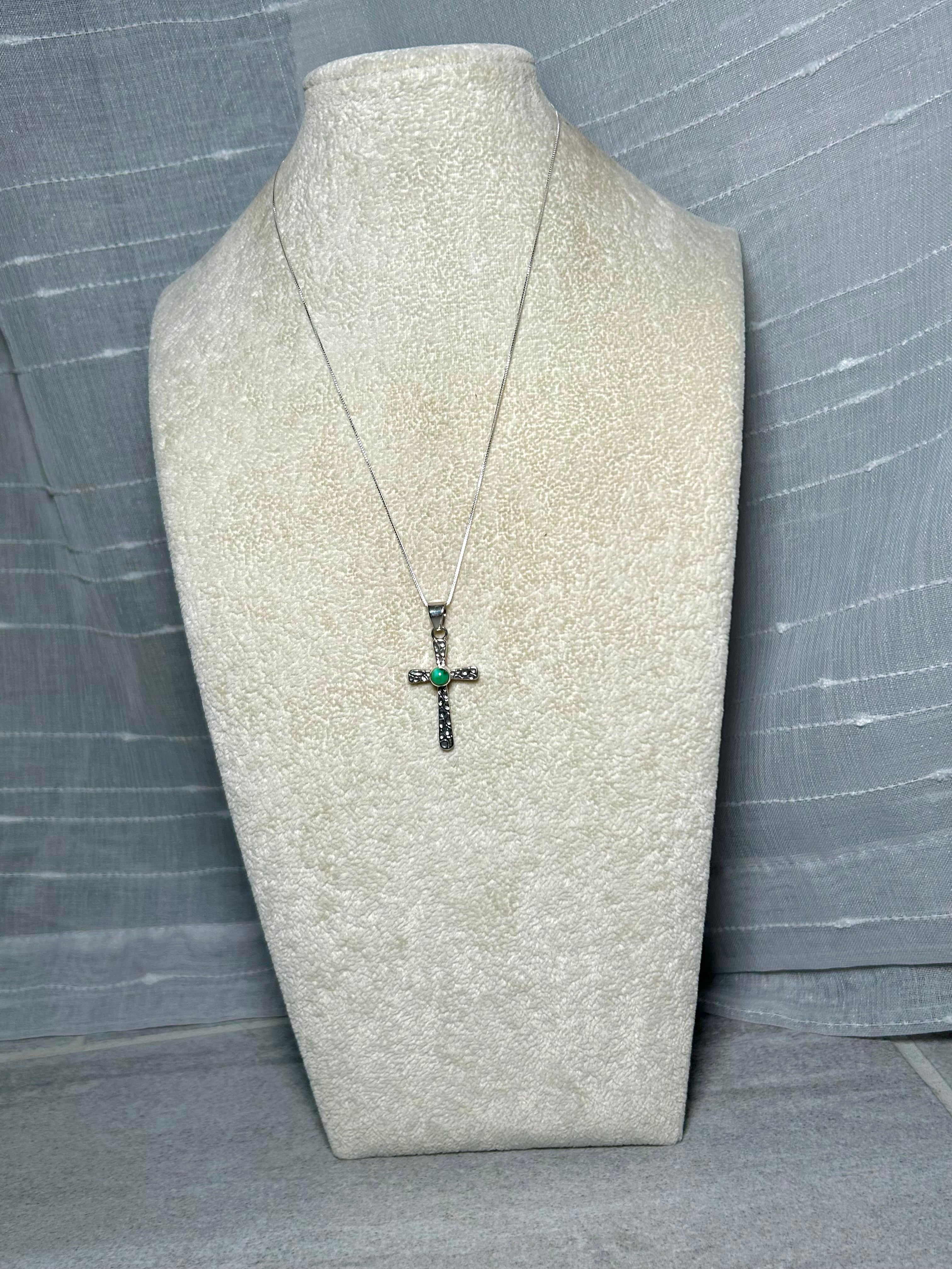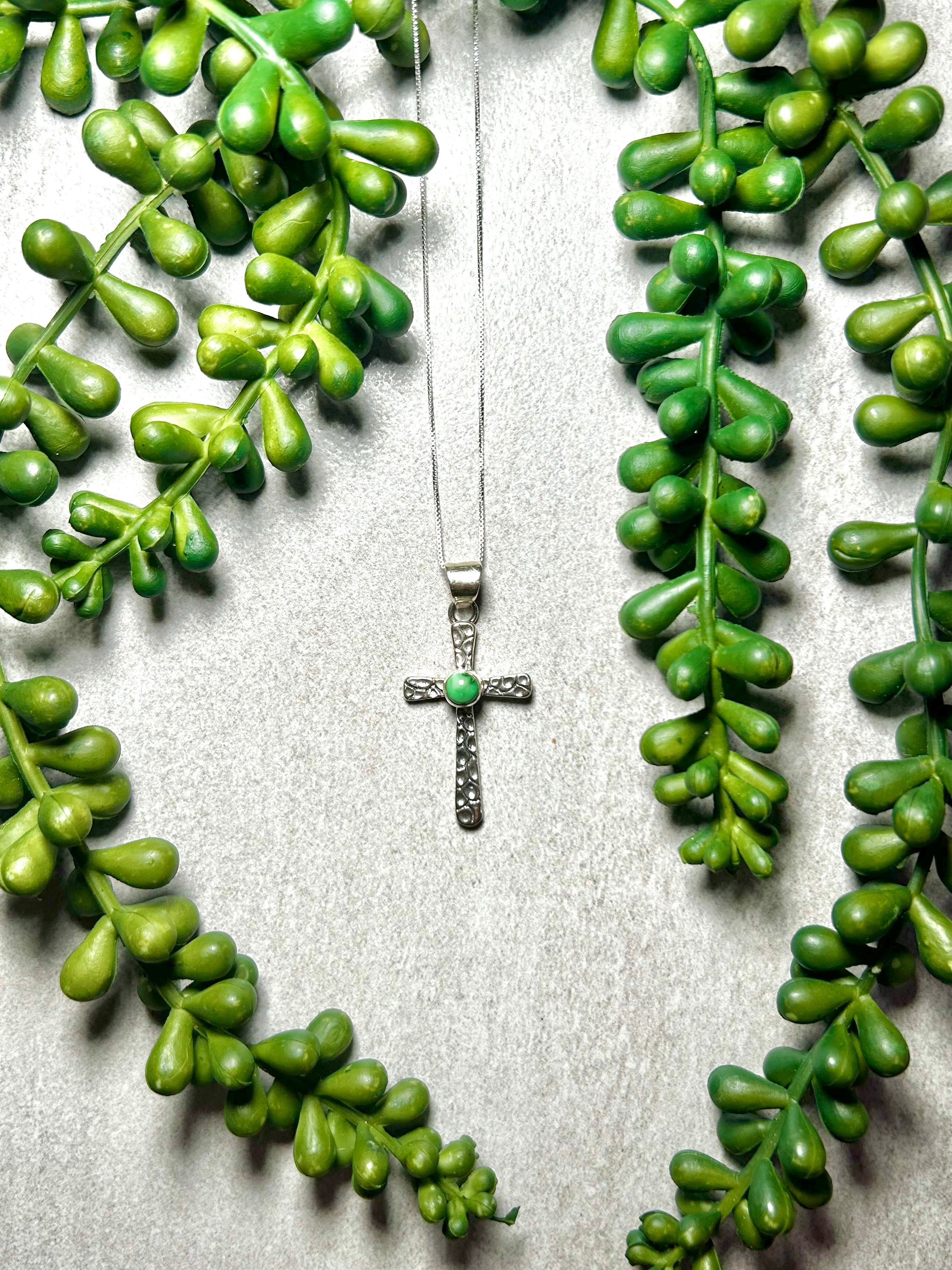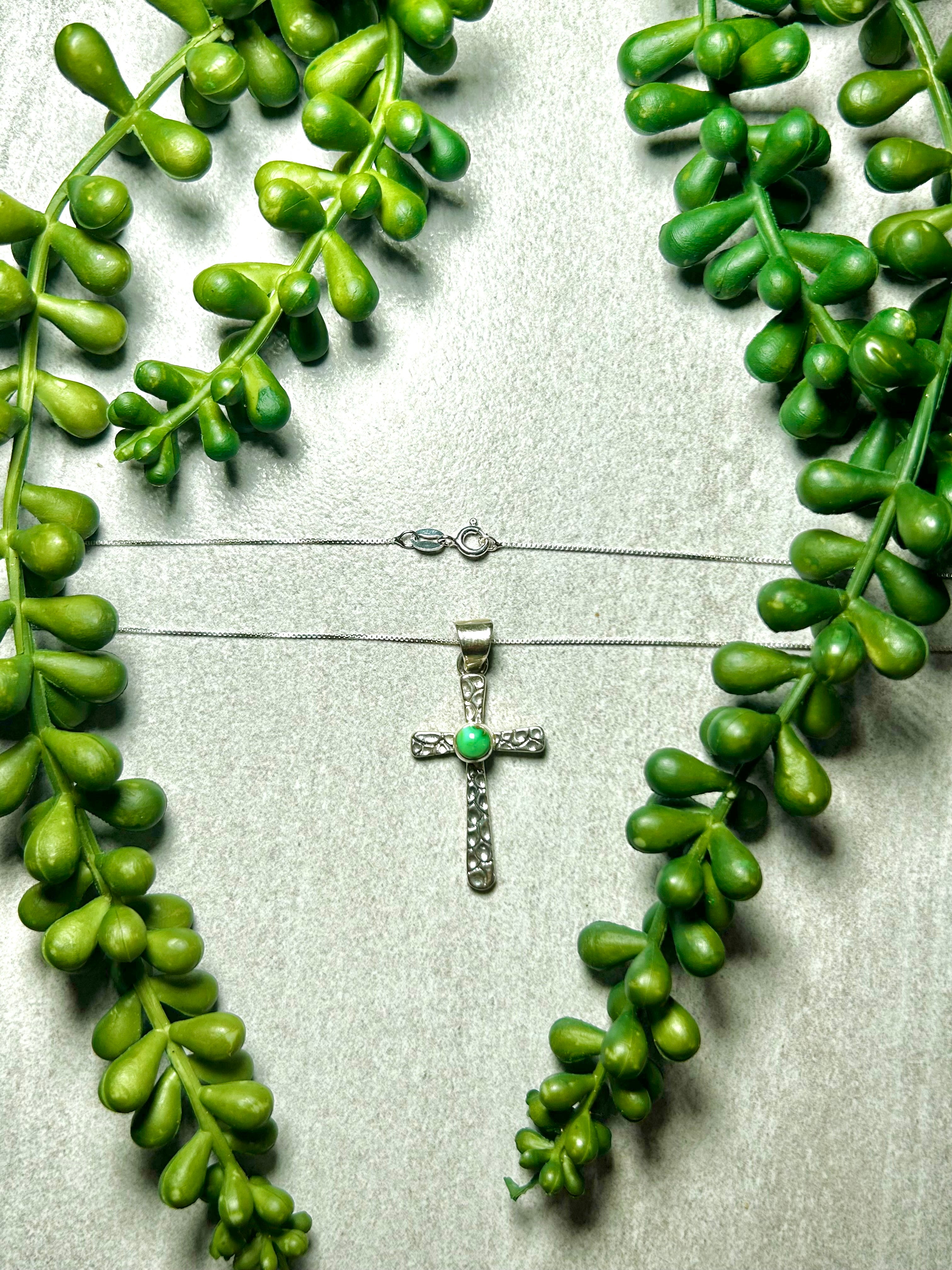 Allen Lee Sonoran Gold Turquoise & Sterling Silver Necklace. It measures 21 inches long with hang while the chain measures 17 1/2 inches long. Signed by the artist and stamped sterling silver.