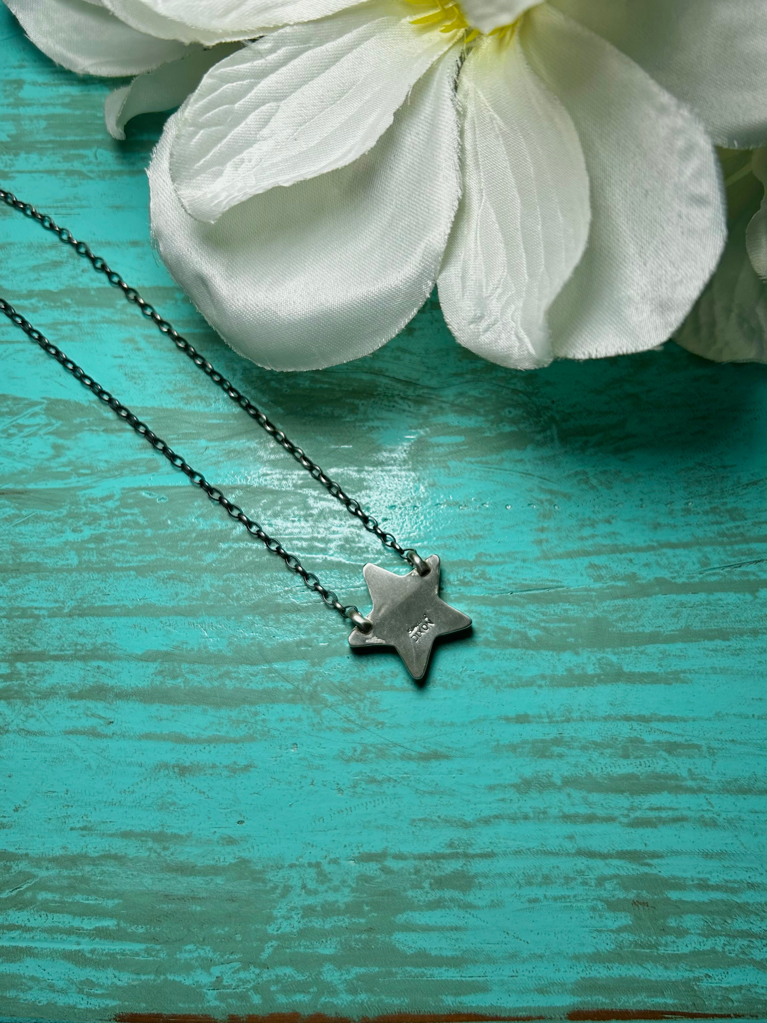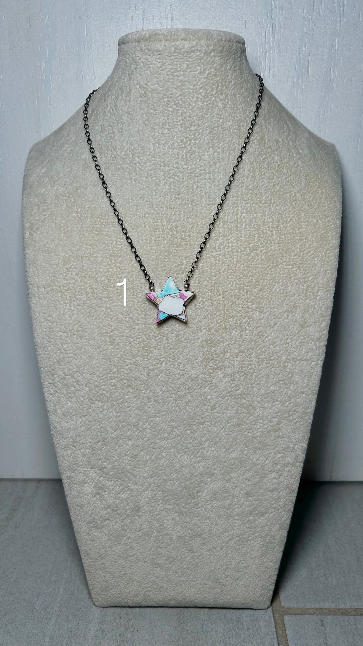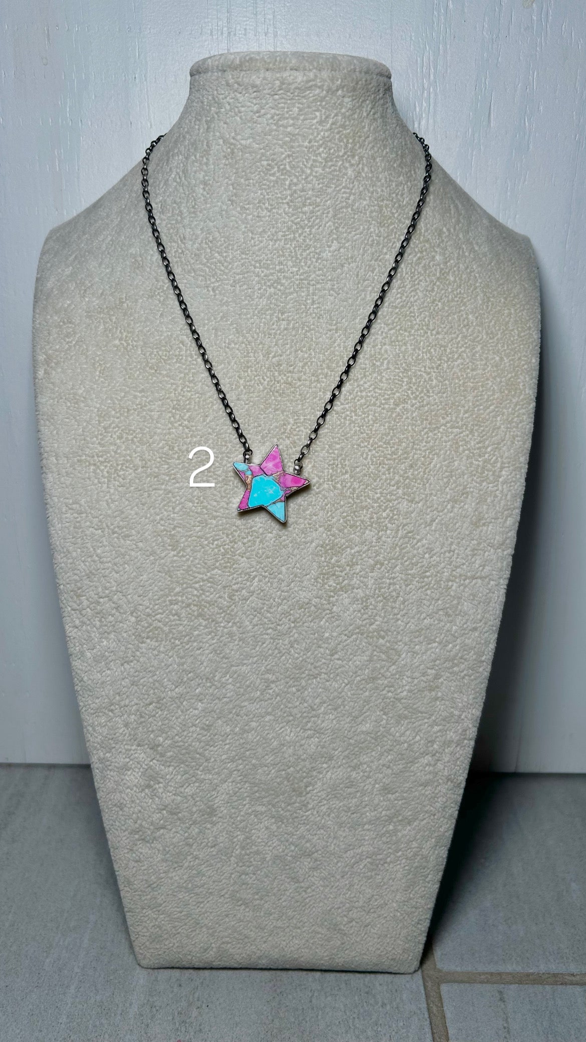 Johnny Dixon Cotton Candy & Sterling Sliver Necklace. It measures 17 3/4 inches long while the chain measure 15 3/4 inches long. Signed by the artist and stamped sterling silver.