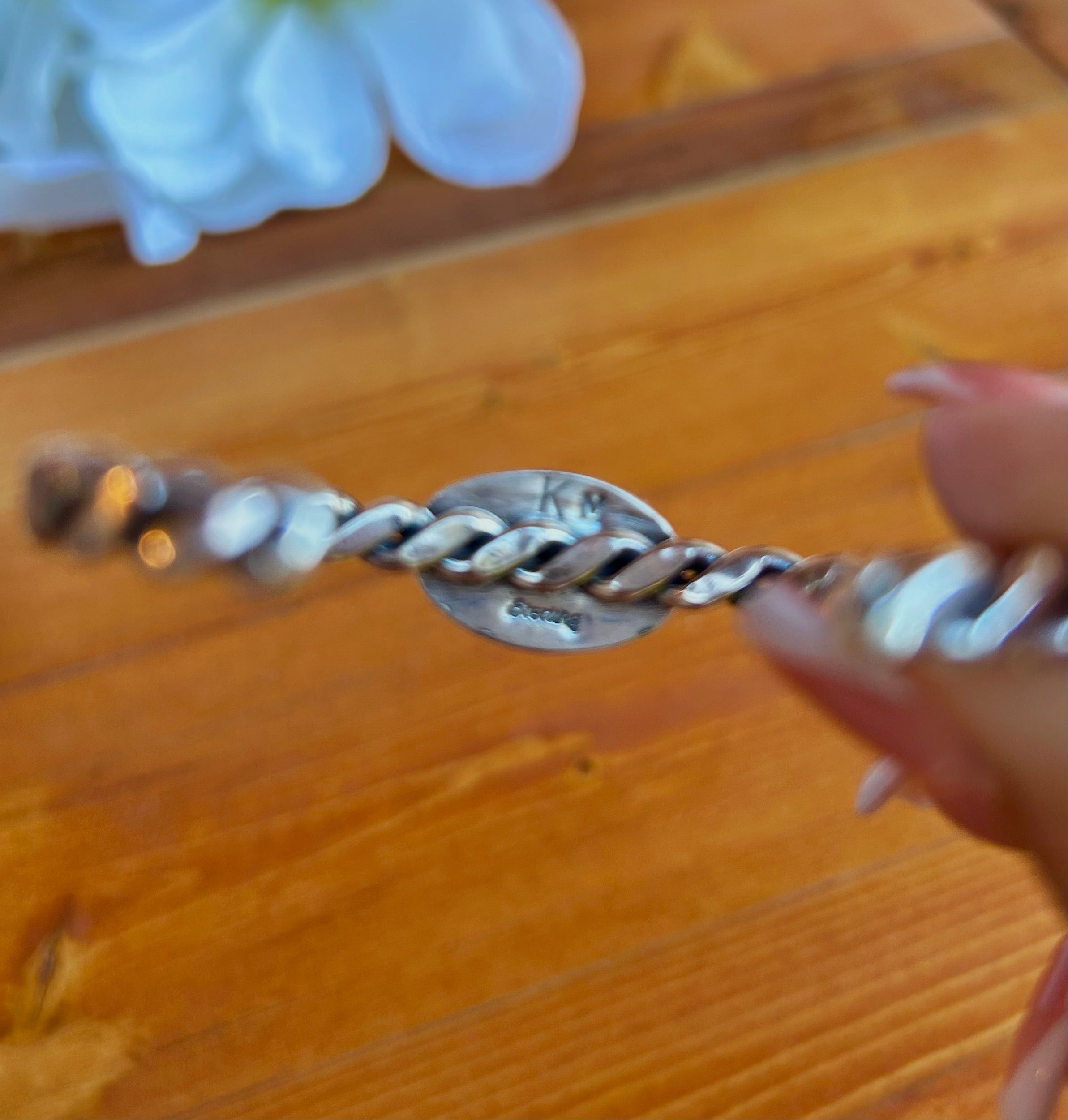 Navajo Made White Buffalo & Sterling Silver Inlay Cuff Bracelet. It measures 1/2 of an inch wide with an inside circumference of 5 1/8 inches and a gap of 1 inch. Signed by artist and stamped sterling silver. Cuff has flex to it.