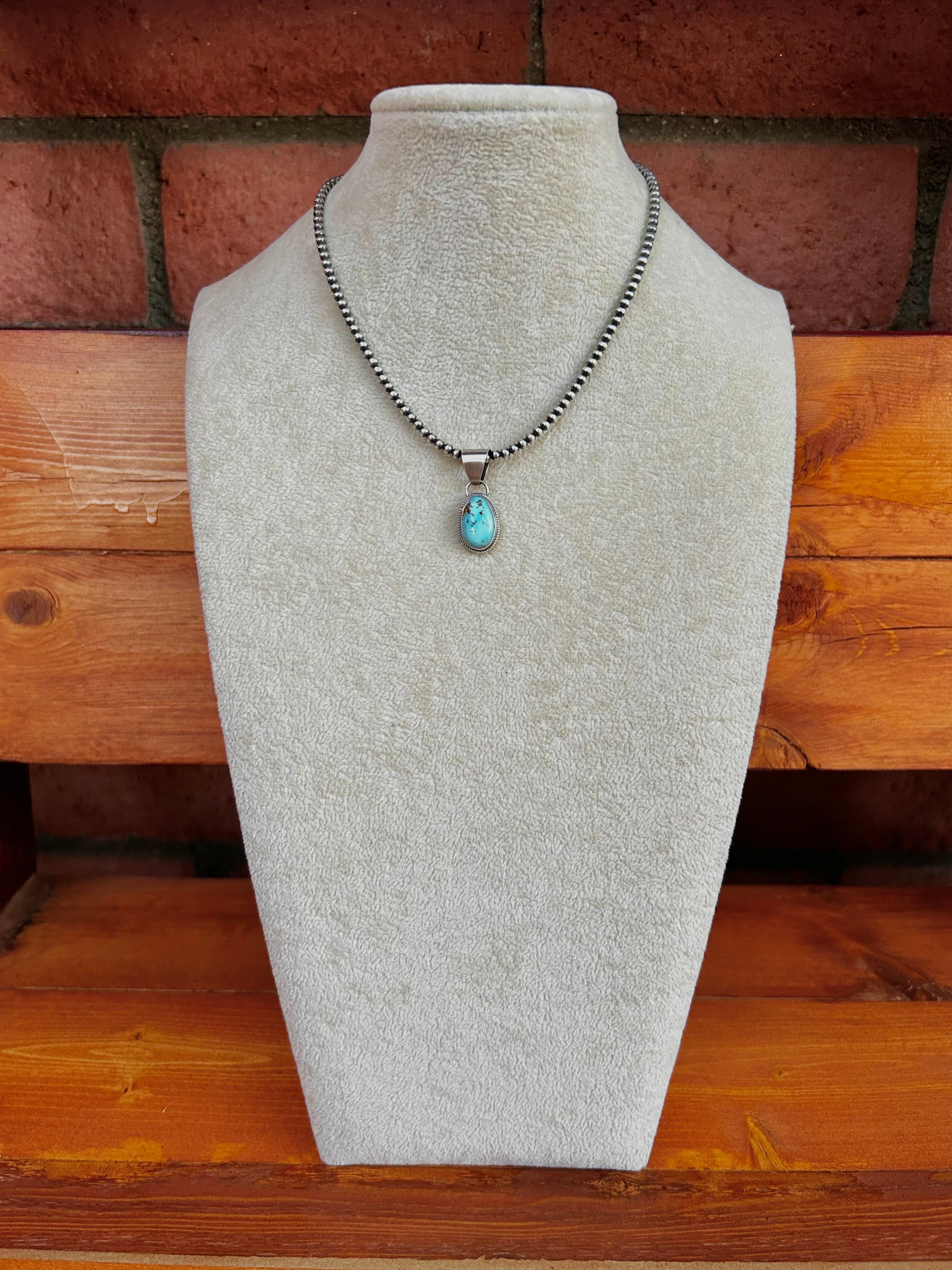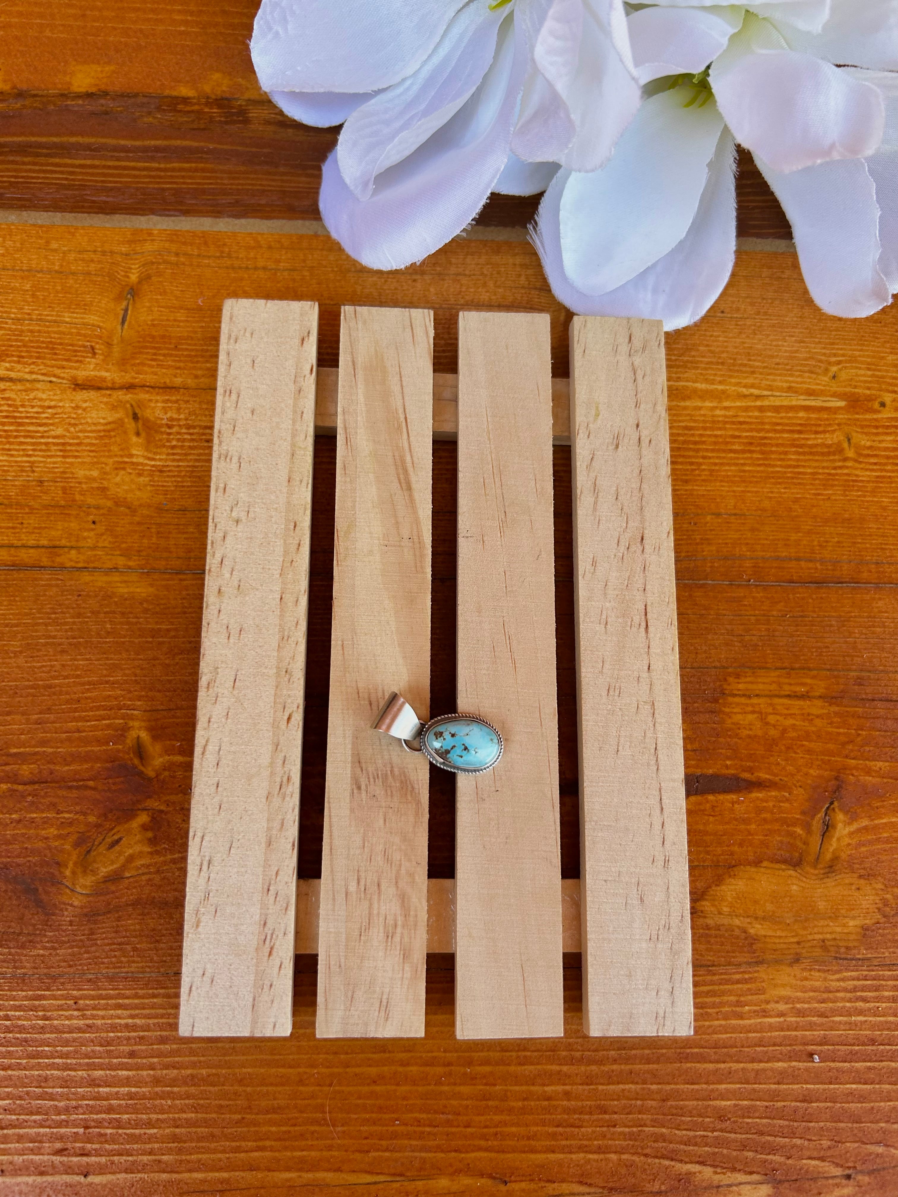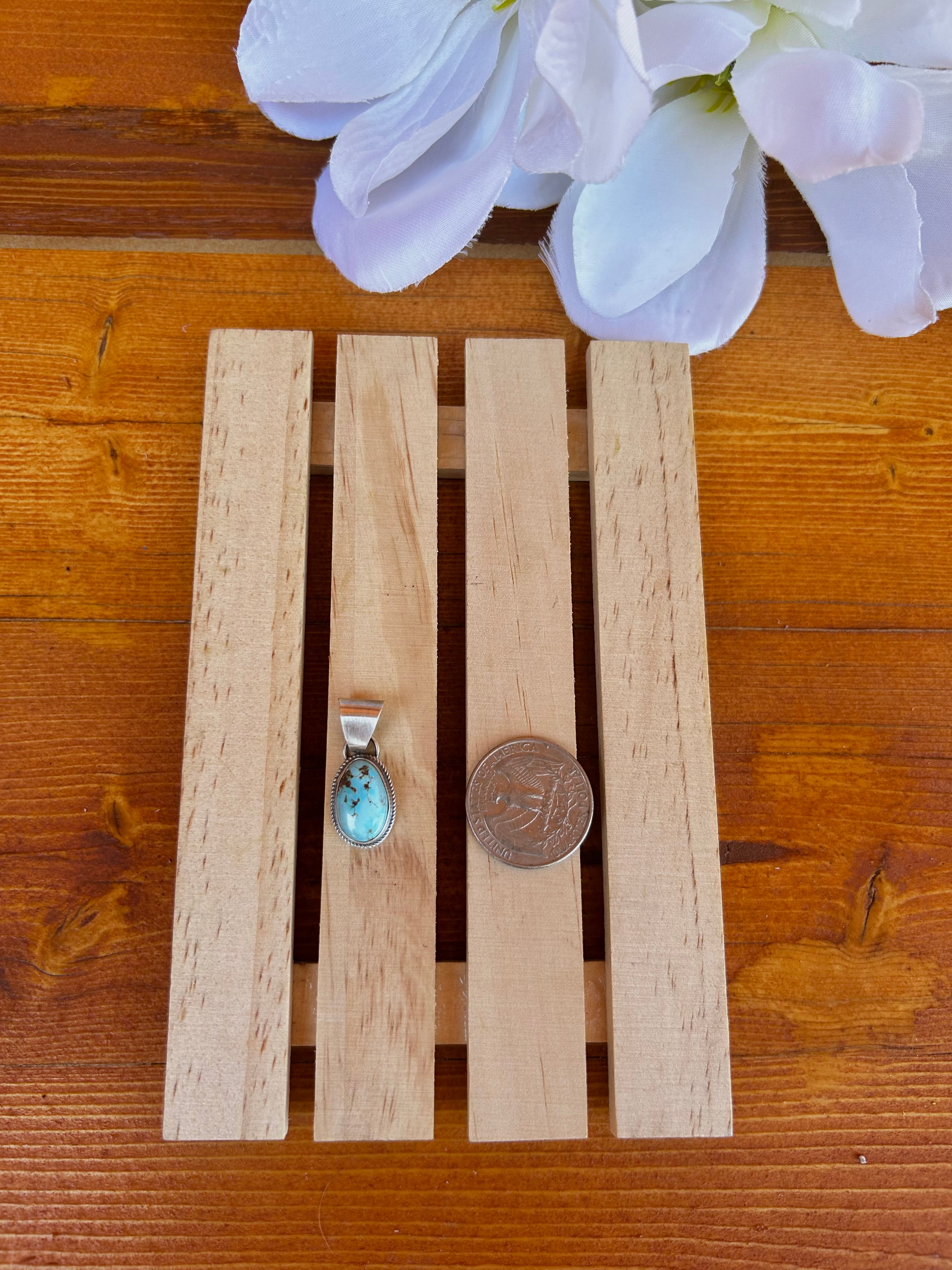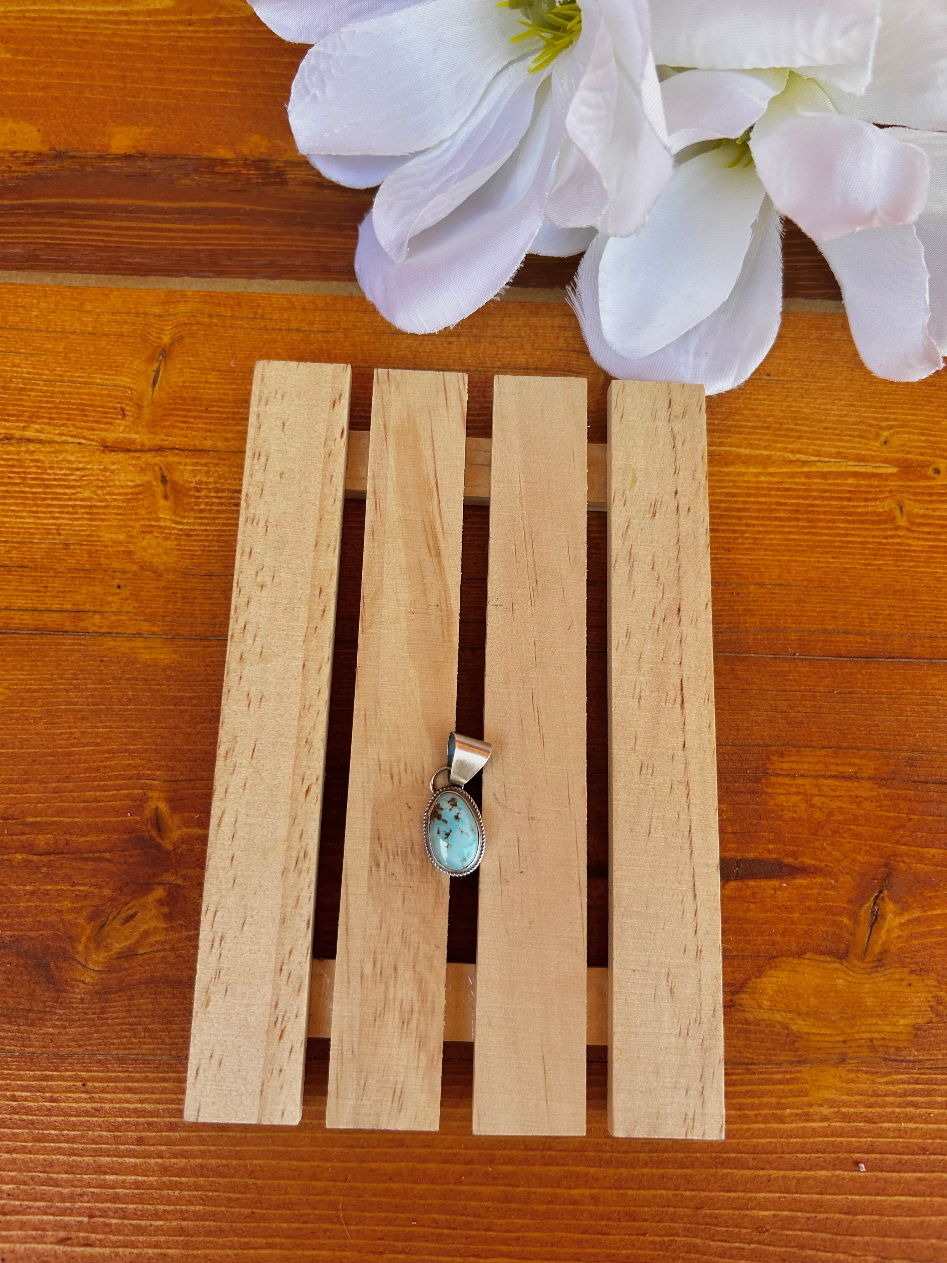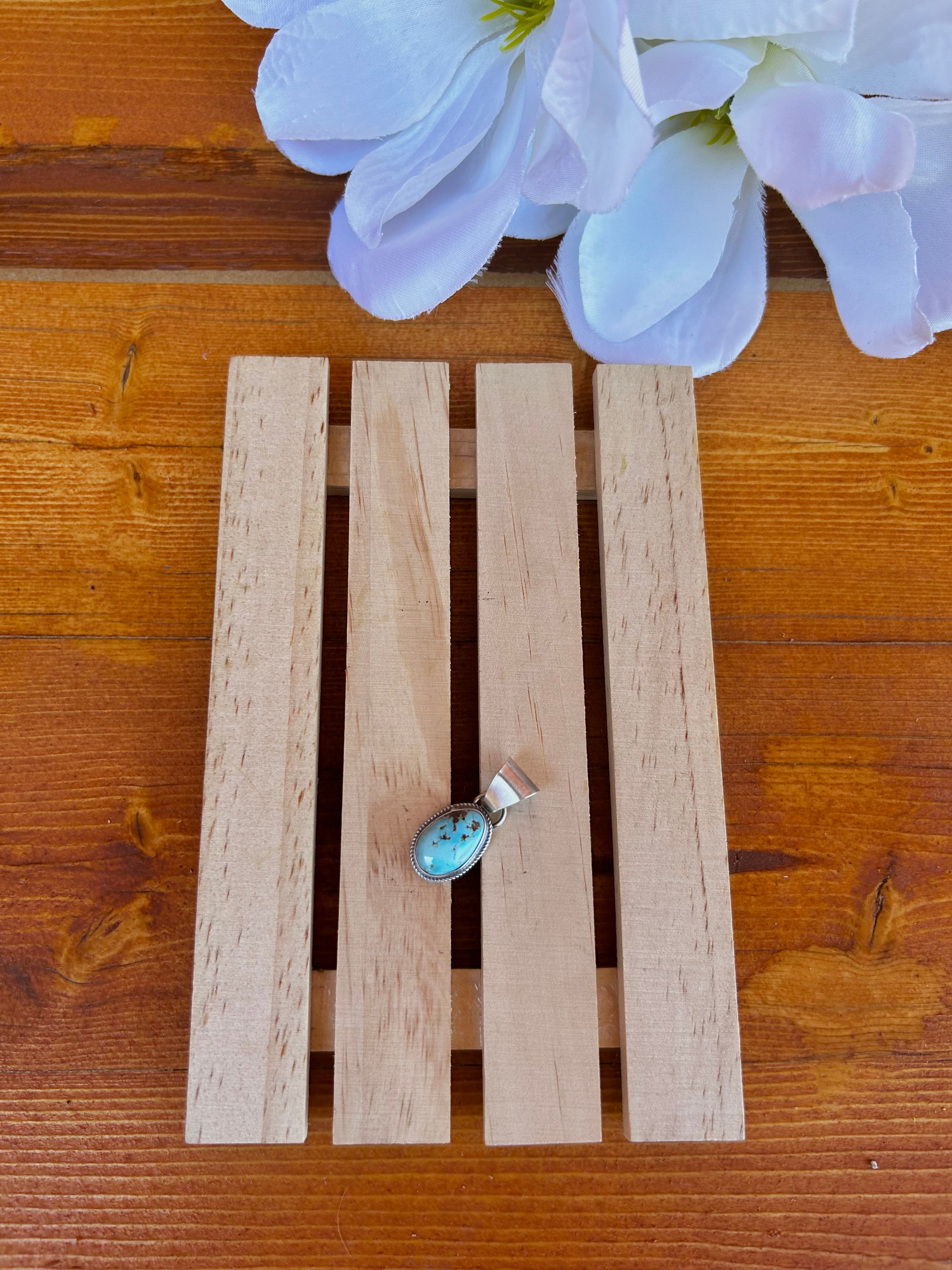 Navajo Made Golden Hill’s Turquoise & Sterling Silver Pendant. It measures 1 1/8 inches long and 1/2 of an inch wide. Pendant Only. Signed by the artist and stamped sterling silver.