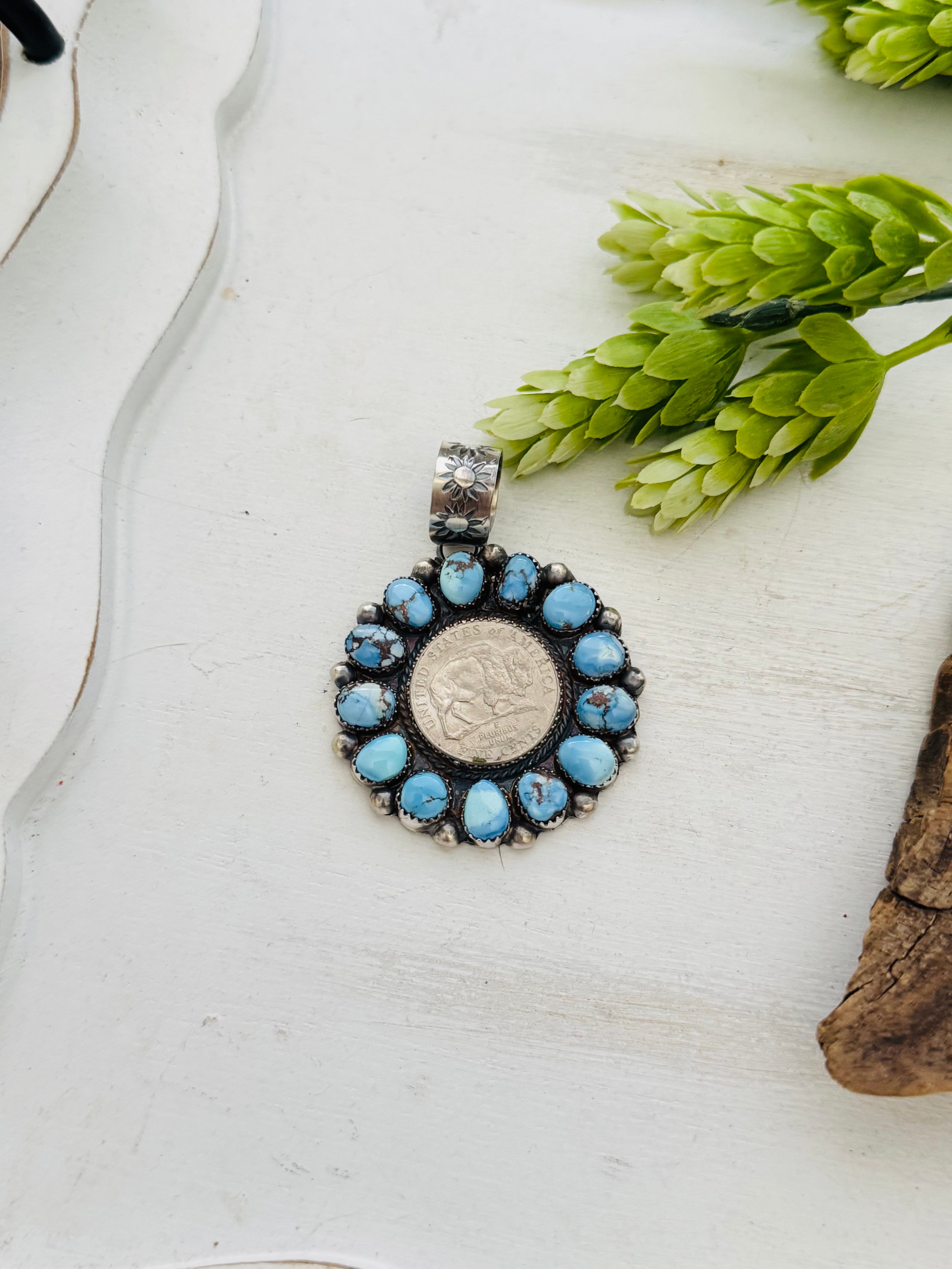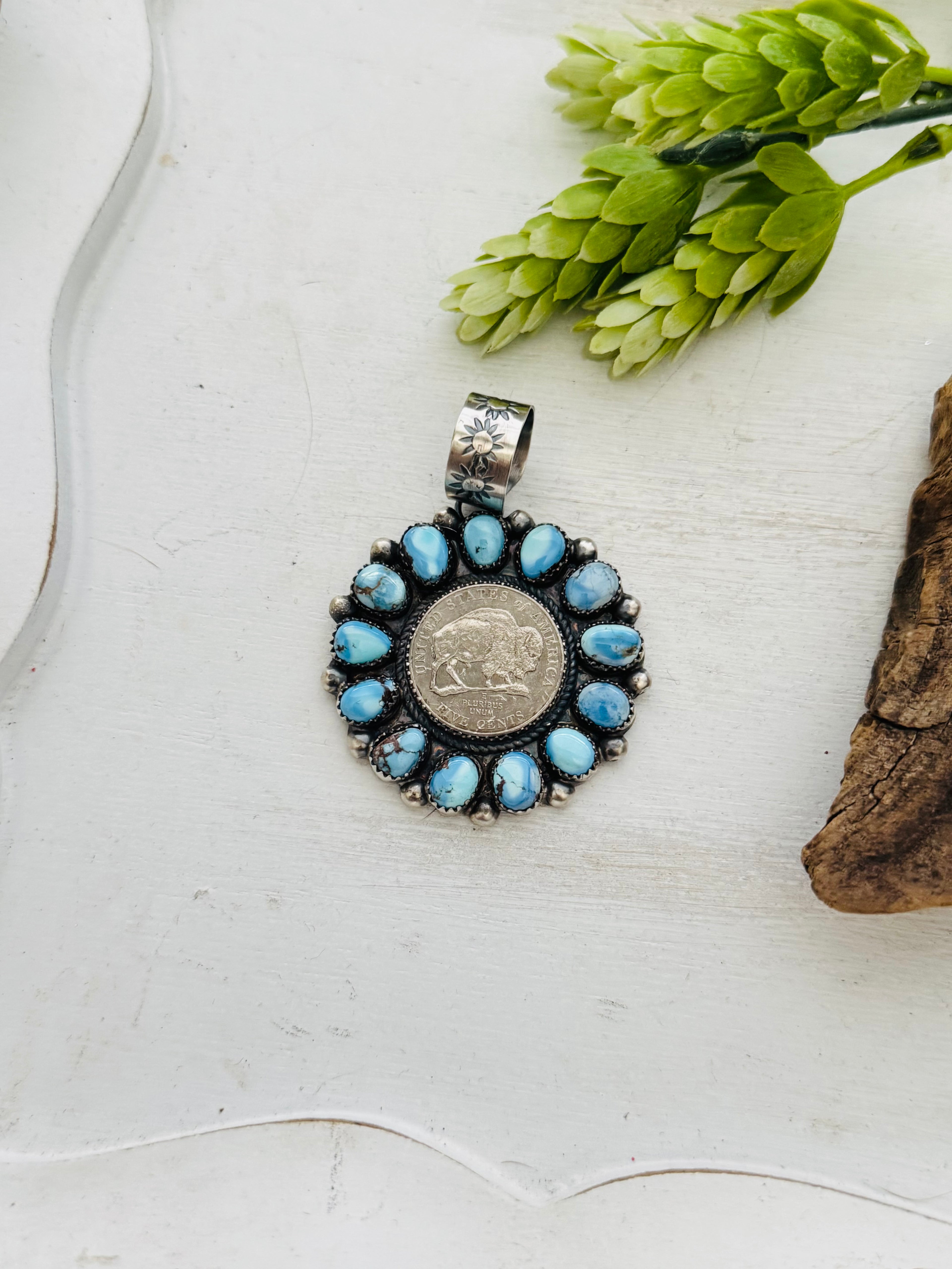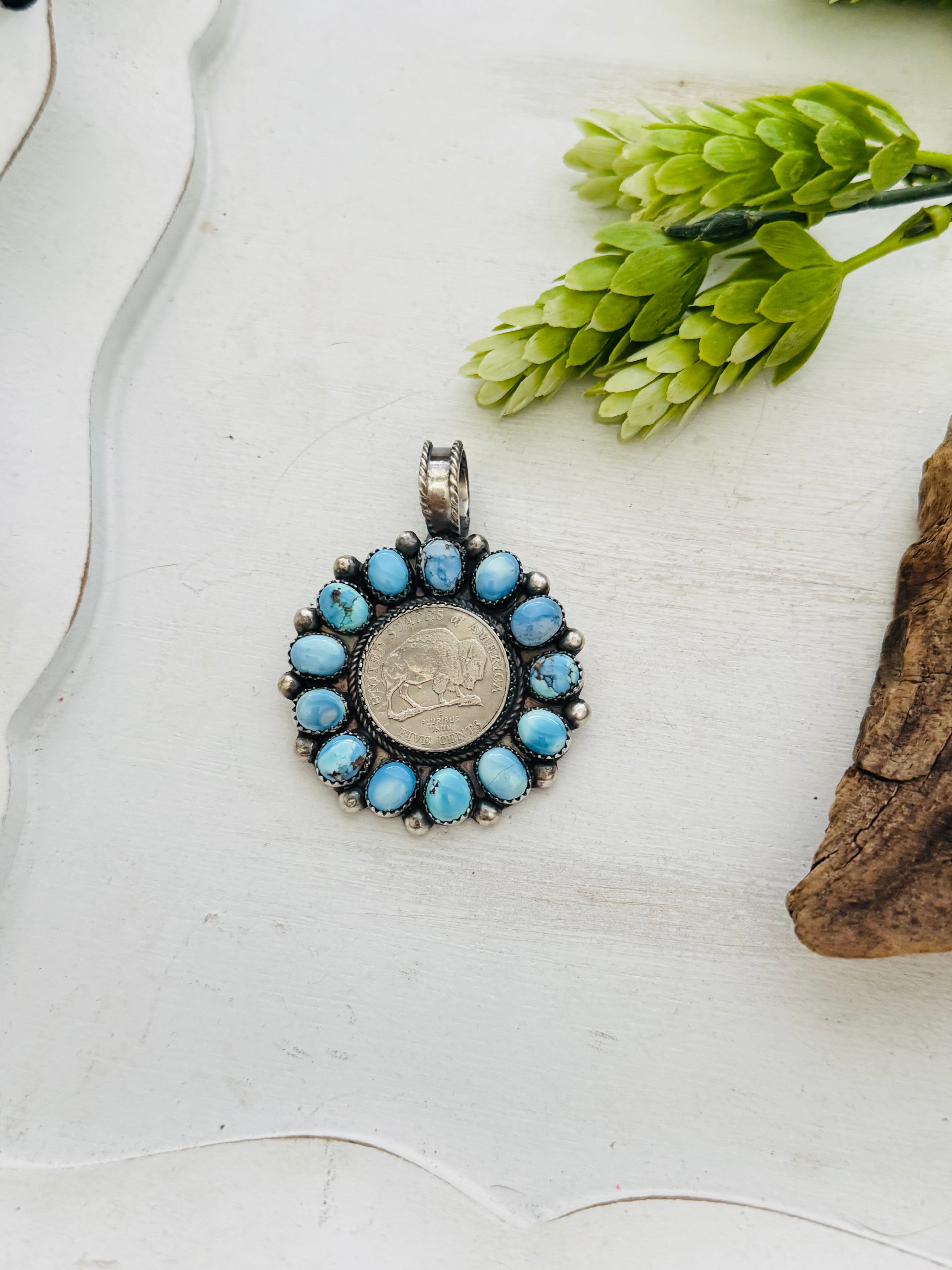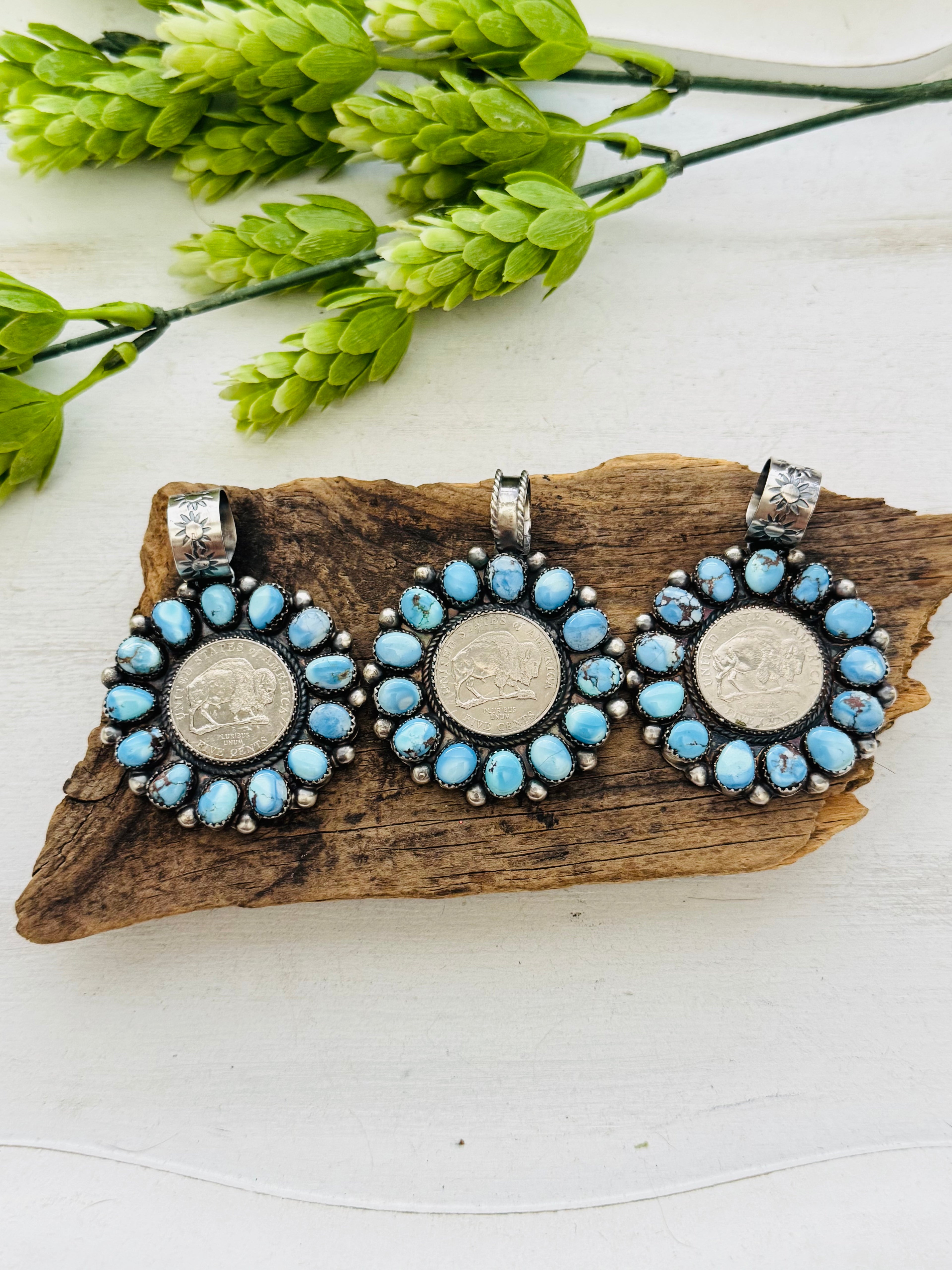 Navajo Made Golden Hill’s Turquoise & Sterling Silver Cluster Buffalo Nickle Pendant
