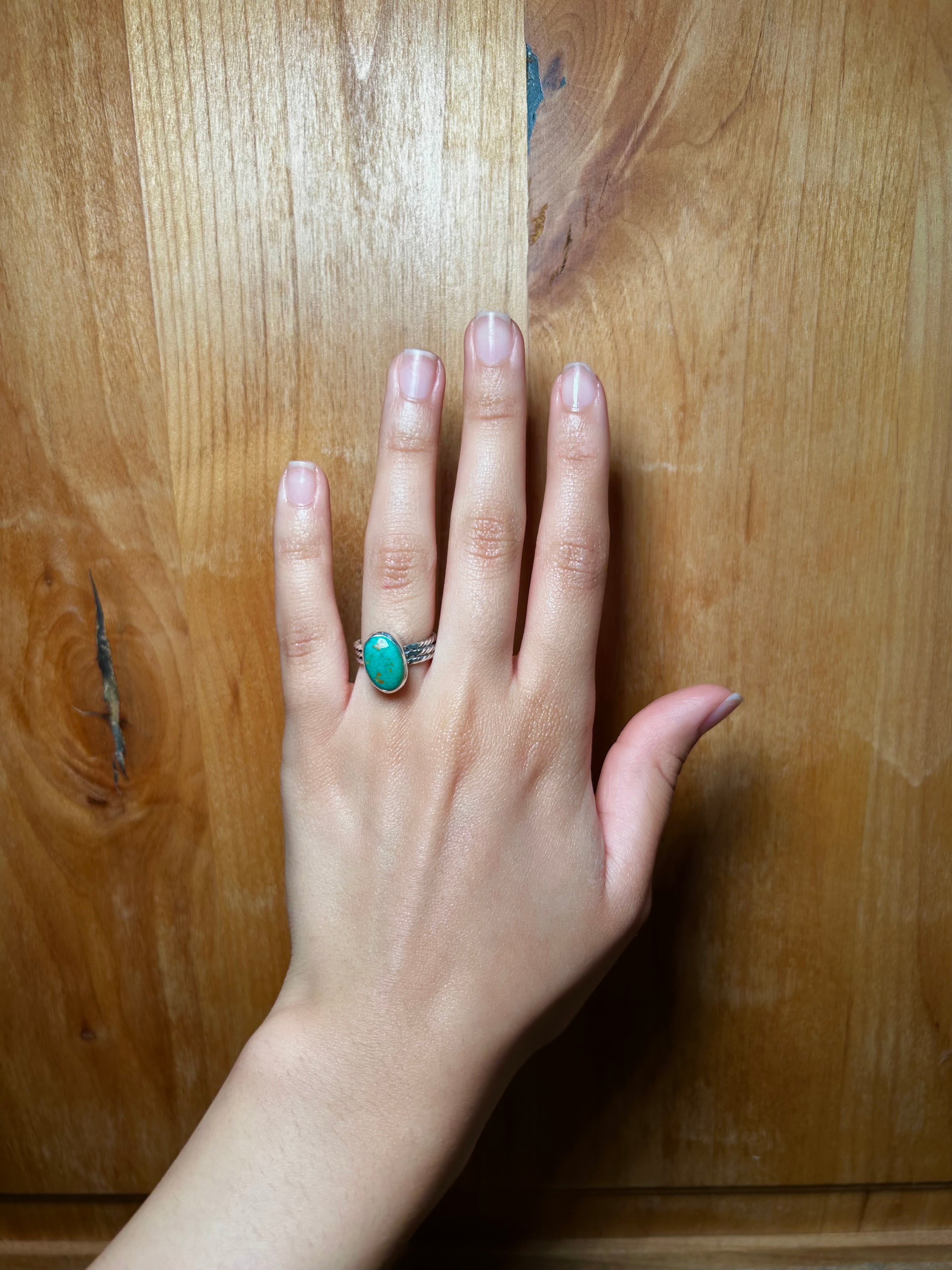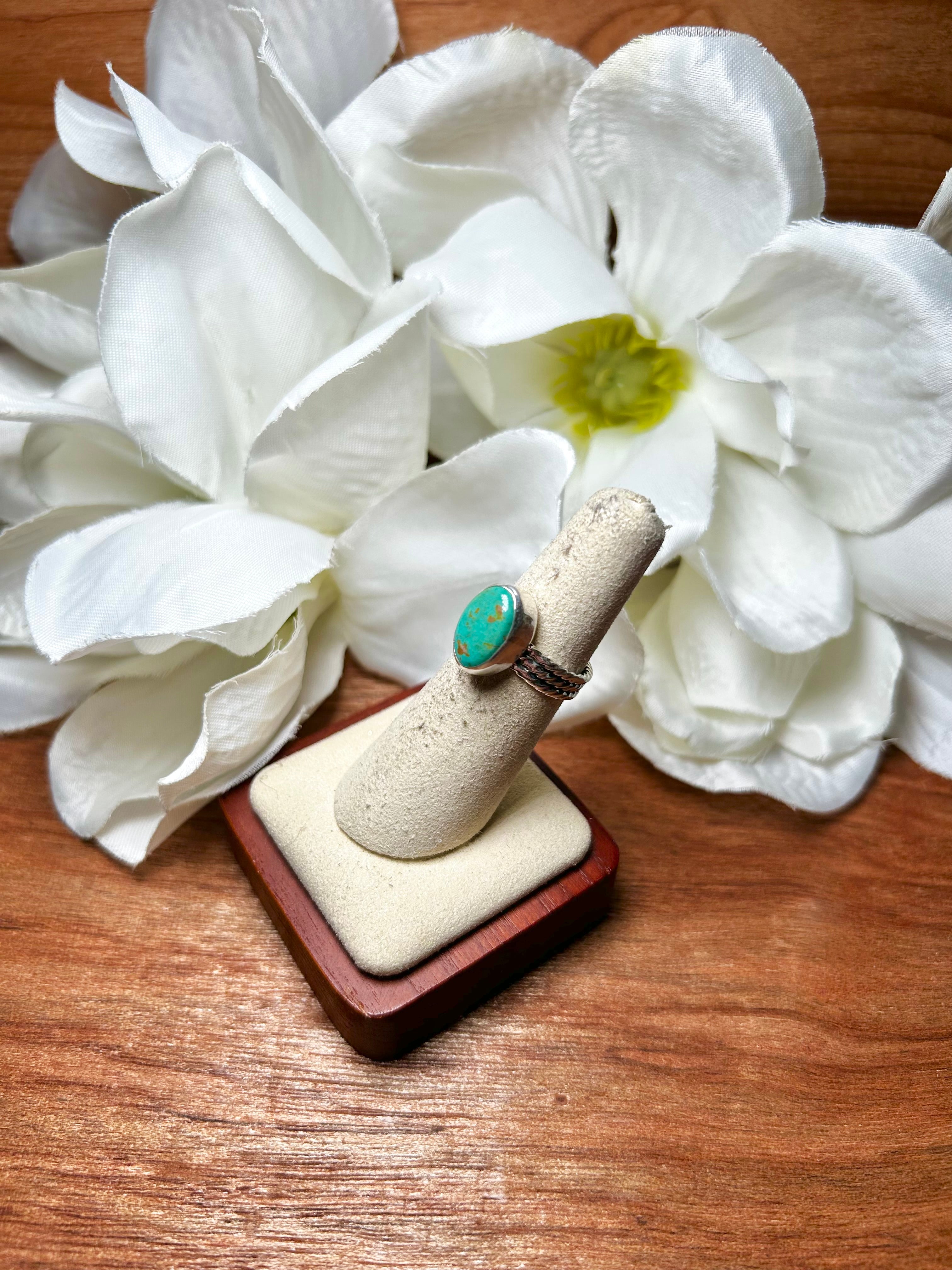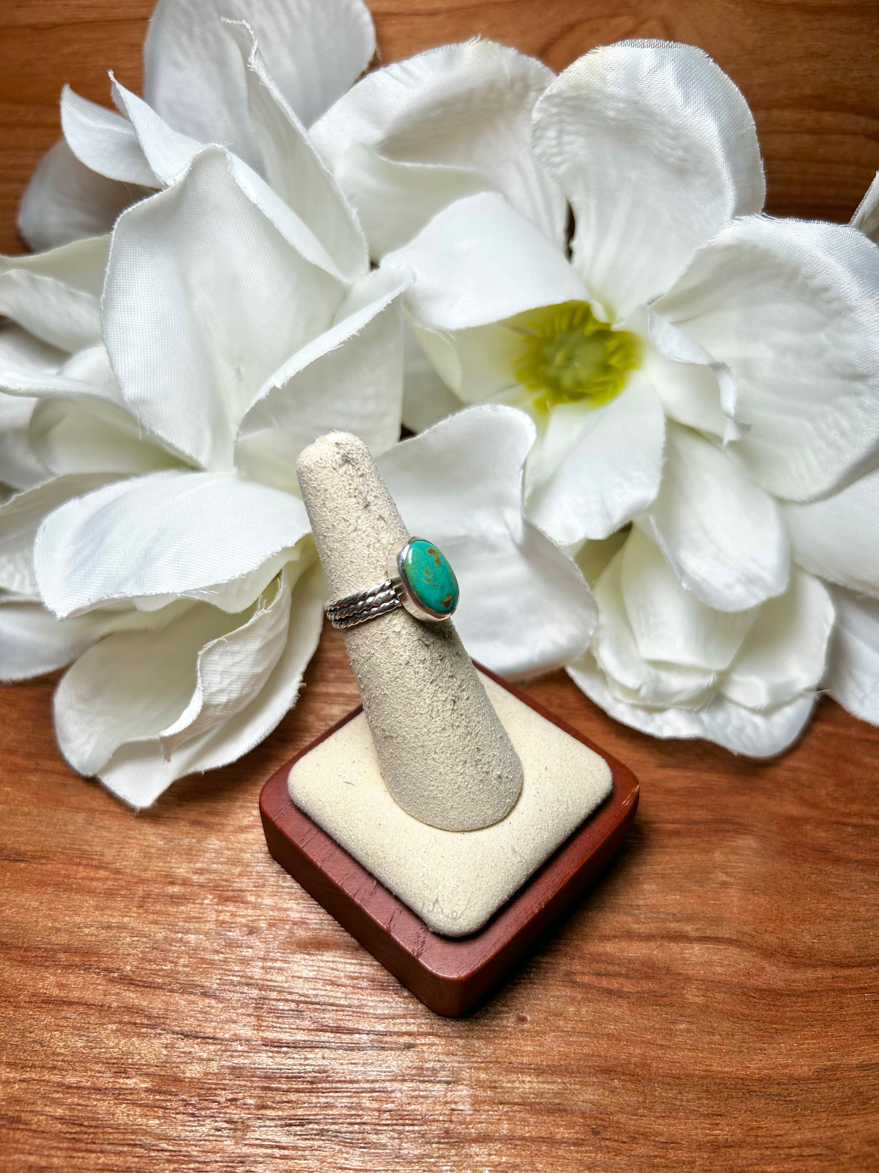 Navajo Made Green Turquoise & Sterling Silver Cluster Ring Size 5.25. It measures 5/8 of an inch long and it measures 3/8 of an inch wide. Signed by the artist and stamped sterling silver.