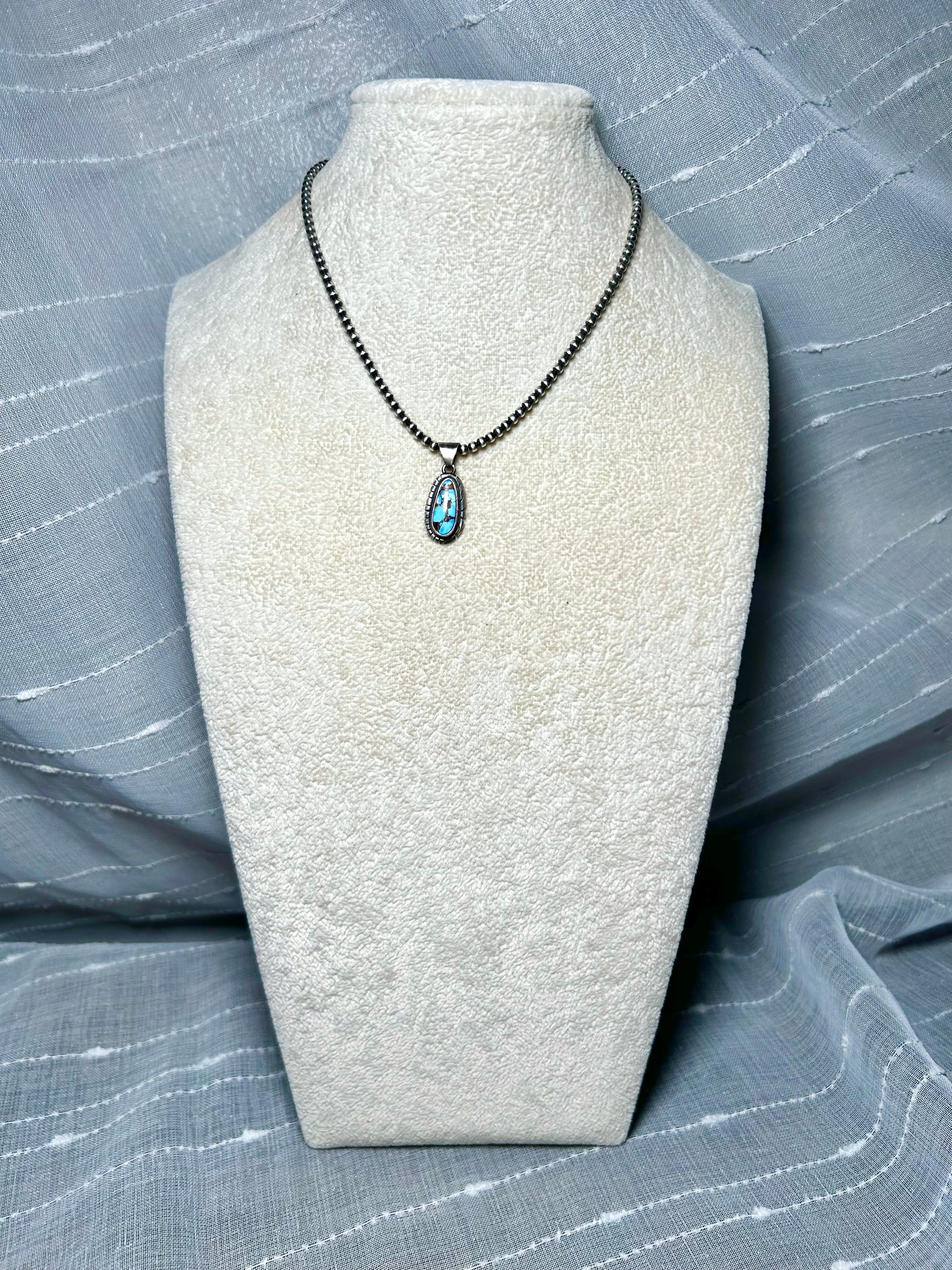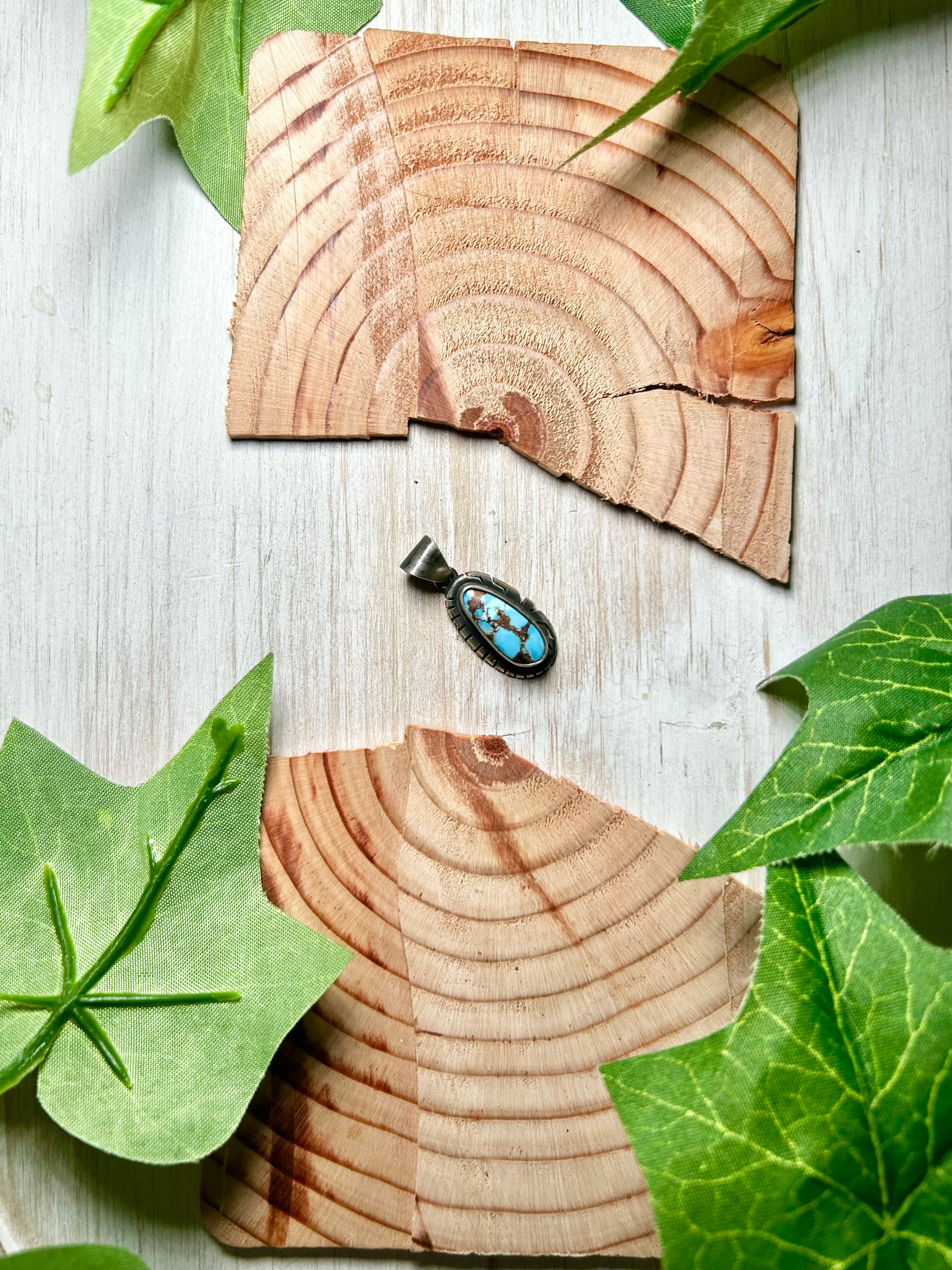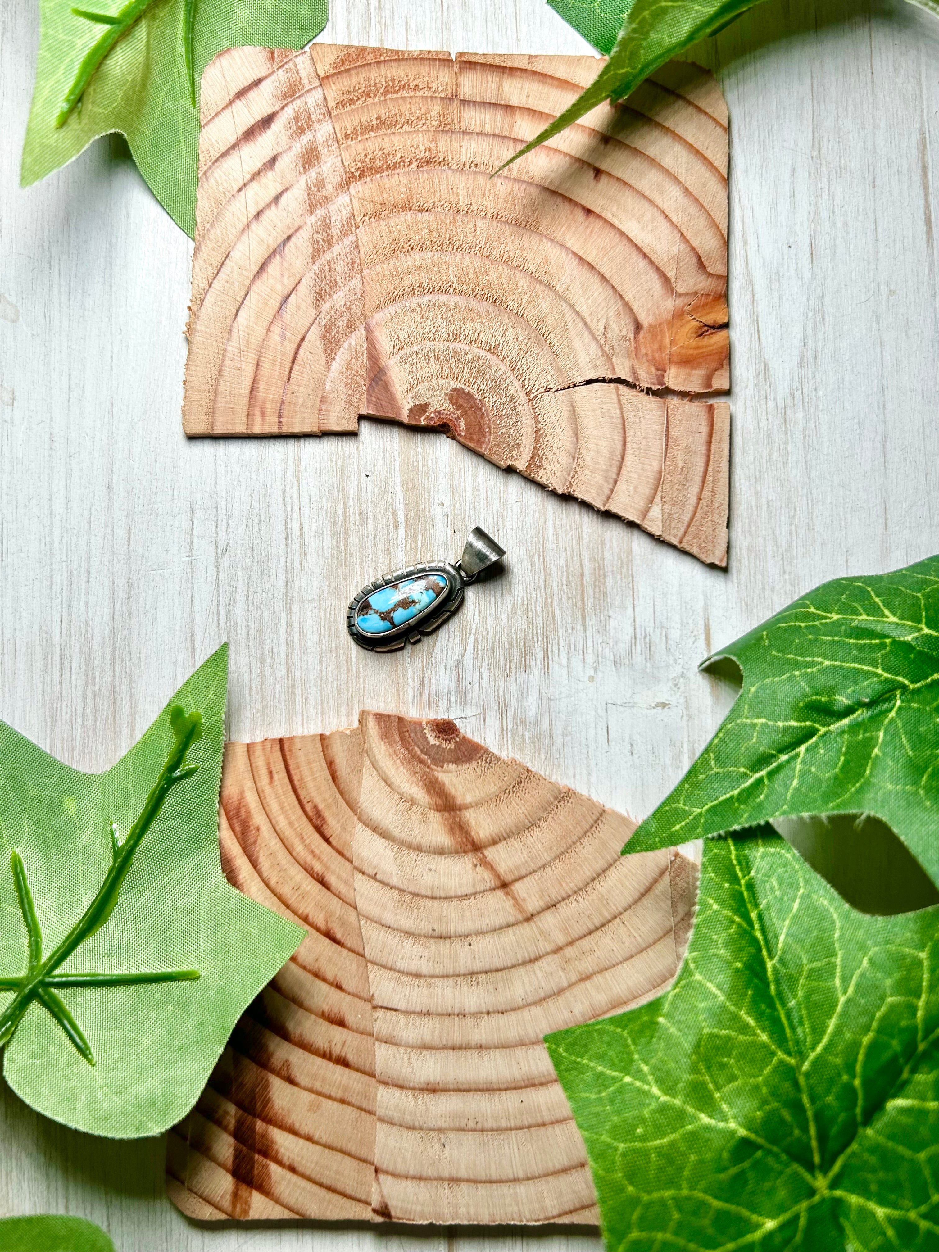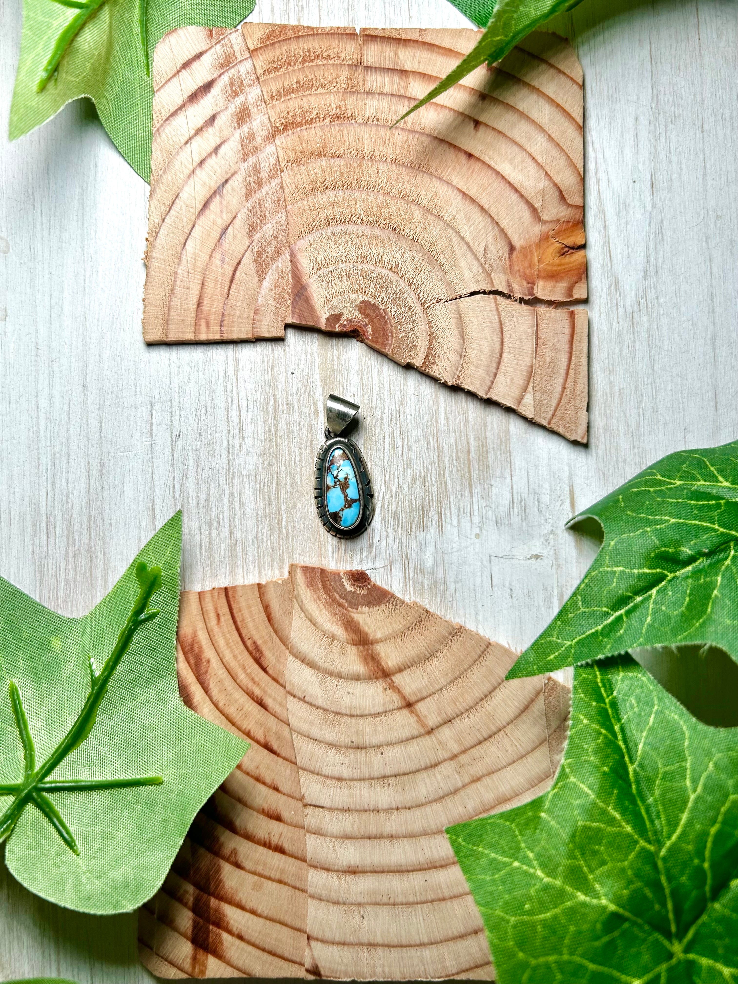 Navajo Made Golden Hill Turquoise & Sterling Silver Pendant. It measures 1 1/8 inches long and 1/2 of an inch wide. Pendant Only! Signed by the artist and stamped sterling silver.