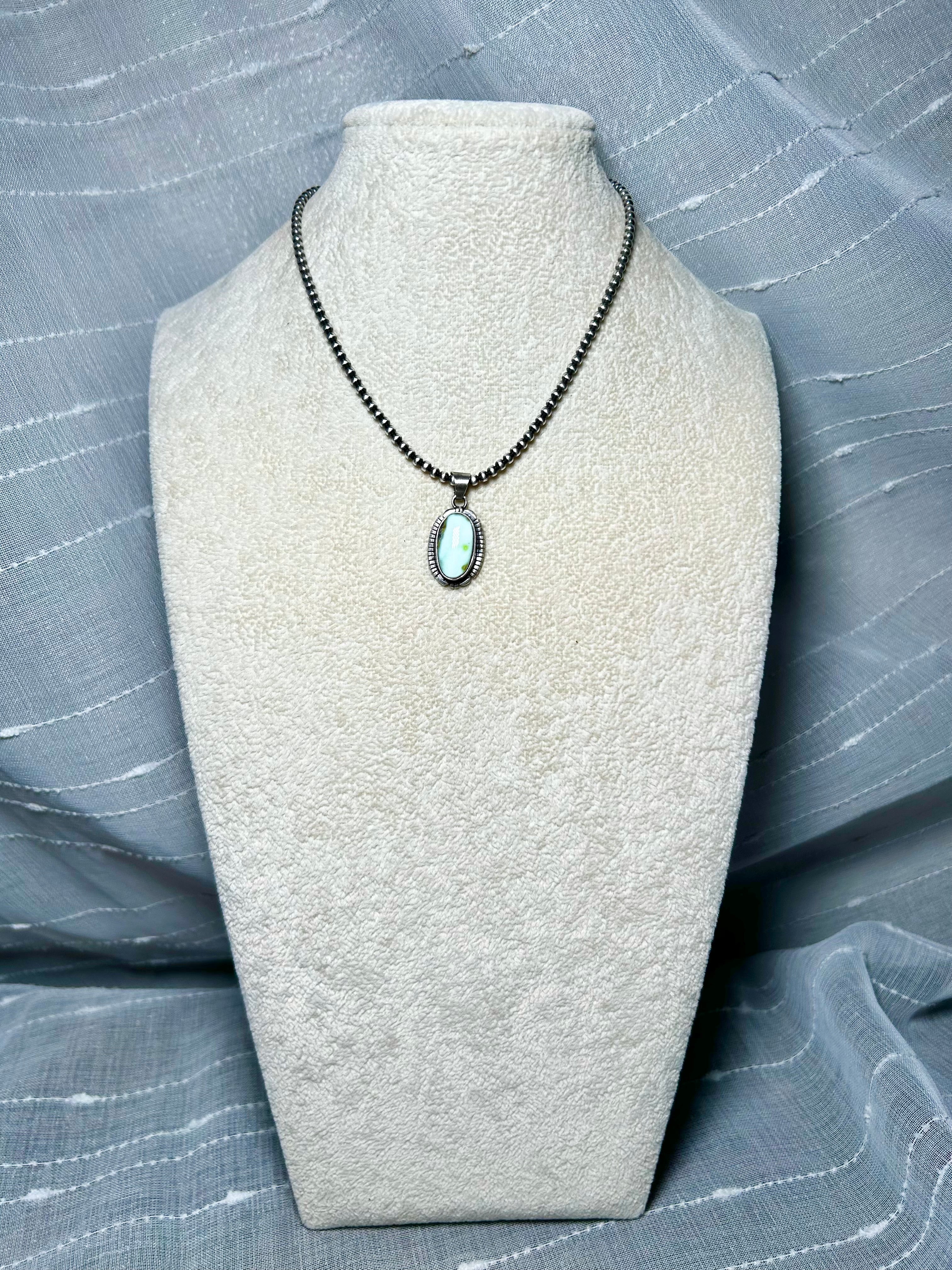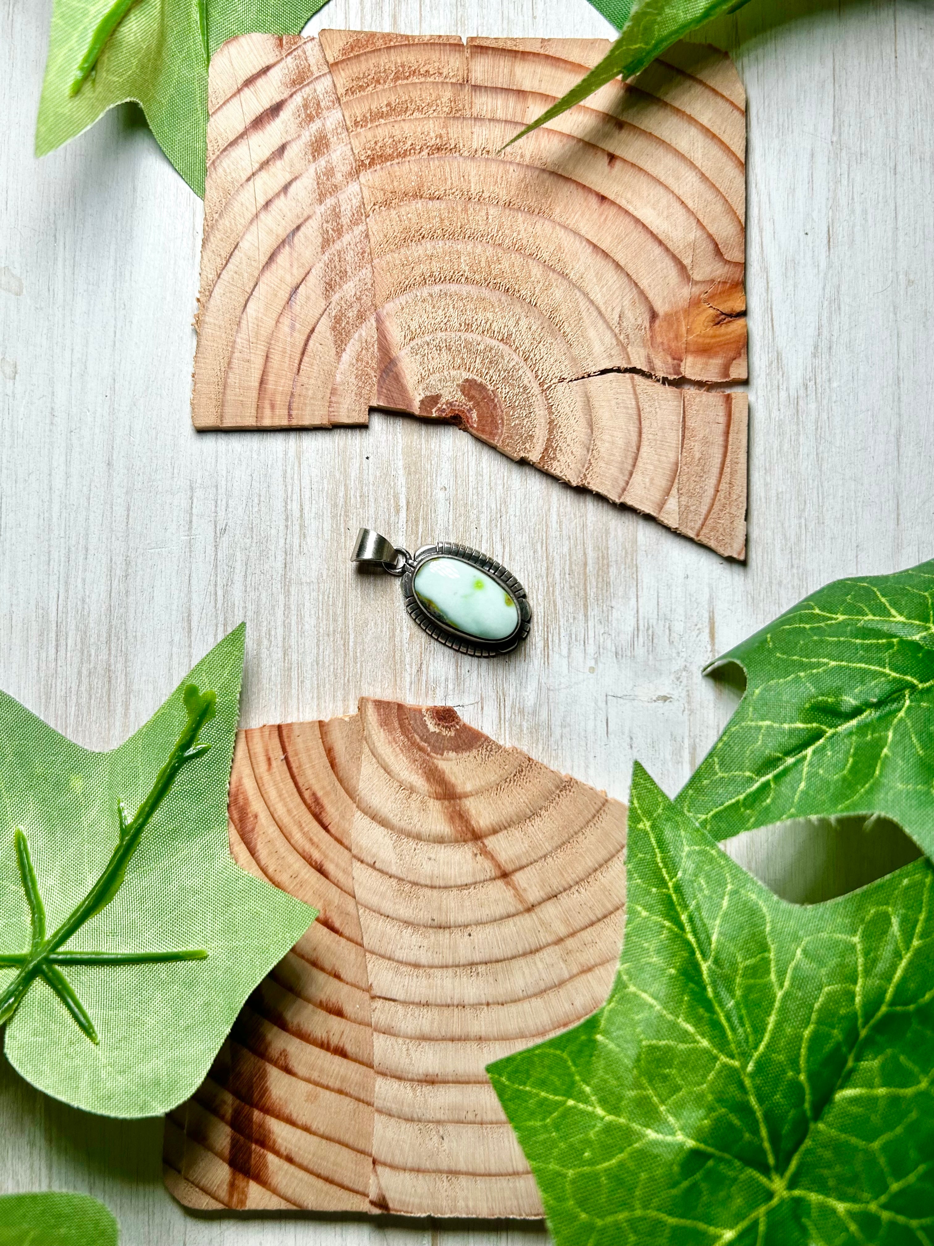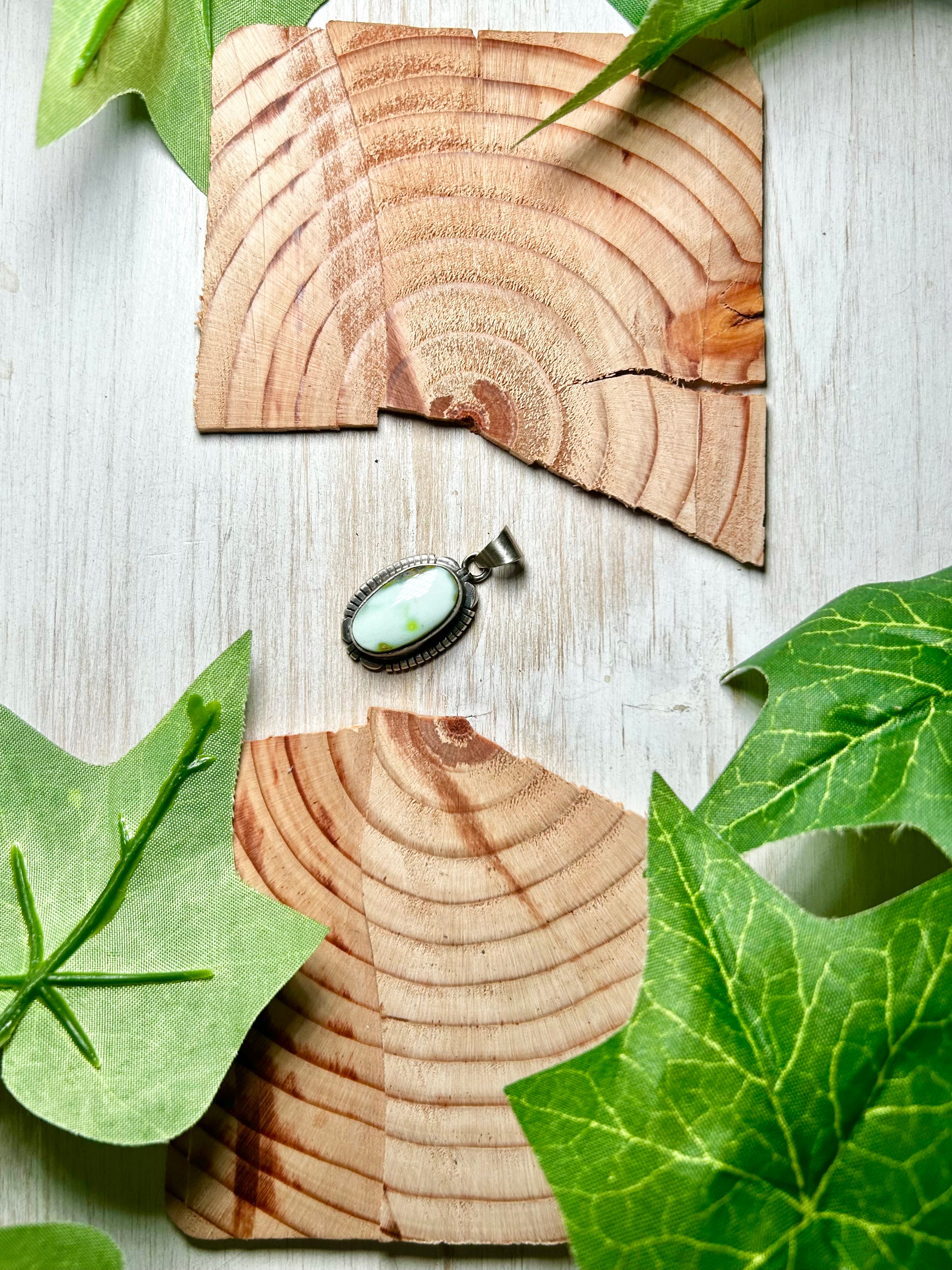 Navajo Made Palomino Variscite & Sterling Silver Pendant. It measures 1 1/4 inches long and 5/8 of an inch wide. Pendant Only! Signed by the artist and stamped sterling silver.