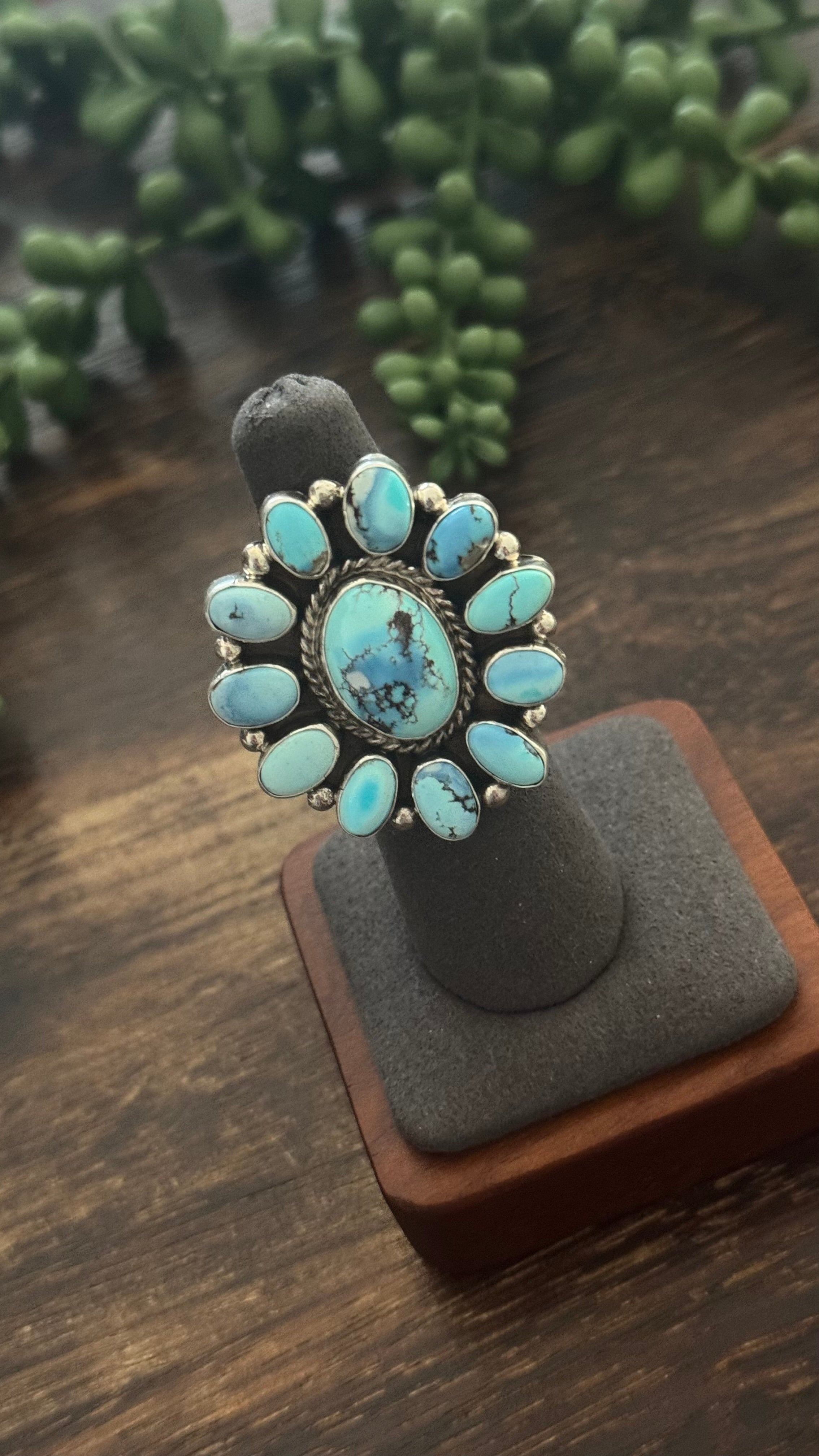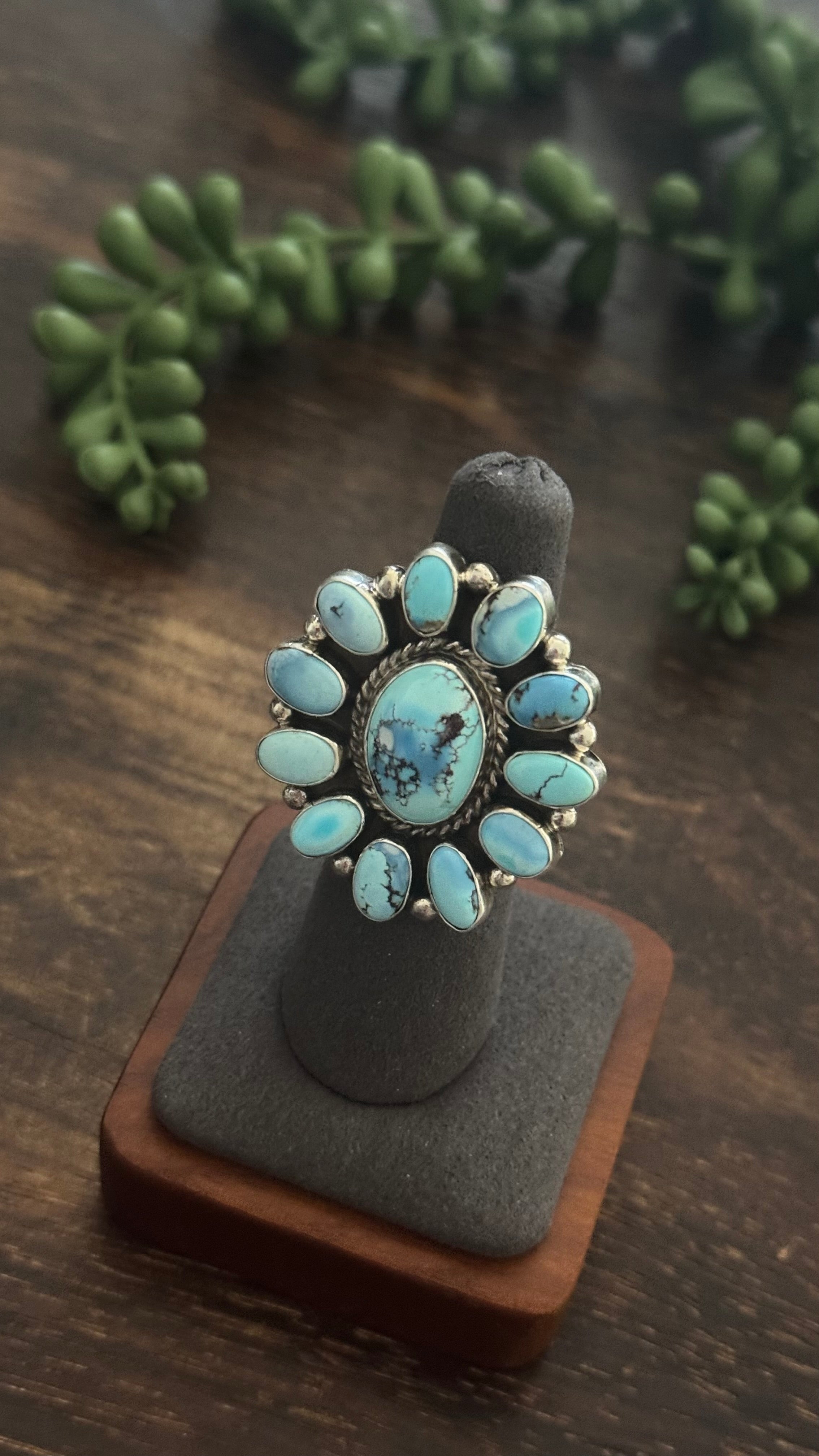 Navajo Made Golden Hill Turquoise & Sterling Silver Cluster Ring Size 6.5. It measures 1 1/2 inches long and 1 3/8 inches wide. Signed by the artist and stamped sterling silver.
