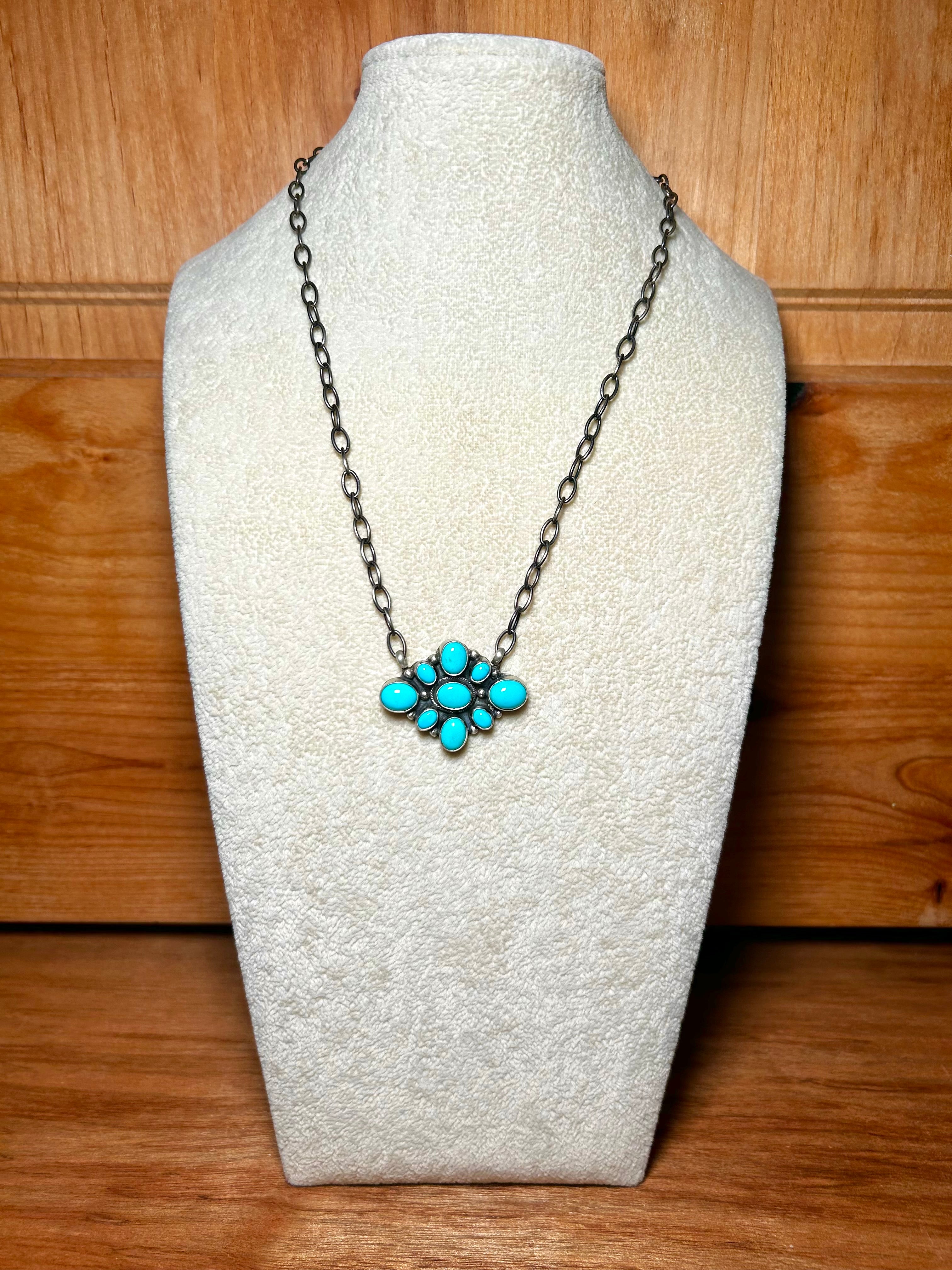 Sheila Becenti Kingman Turquoise & Sterling Sliver Necklace. It measures 19 3/4 inches long while the chain measure 18 inches long. Signed by the artist and stamped sterling silver. Stones will vary due to natural stones.