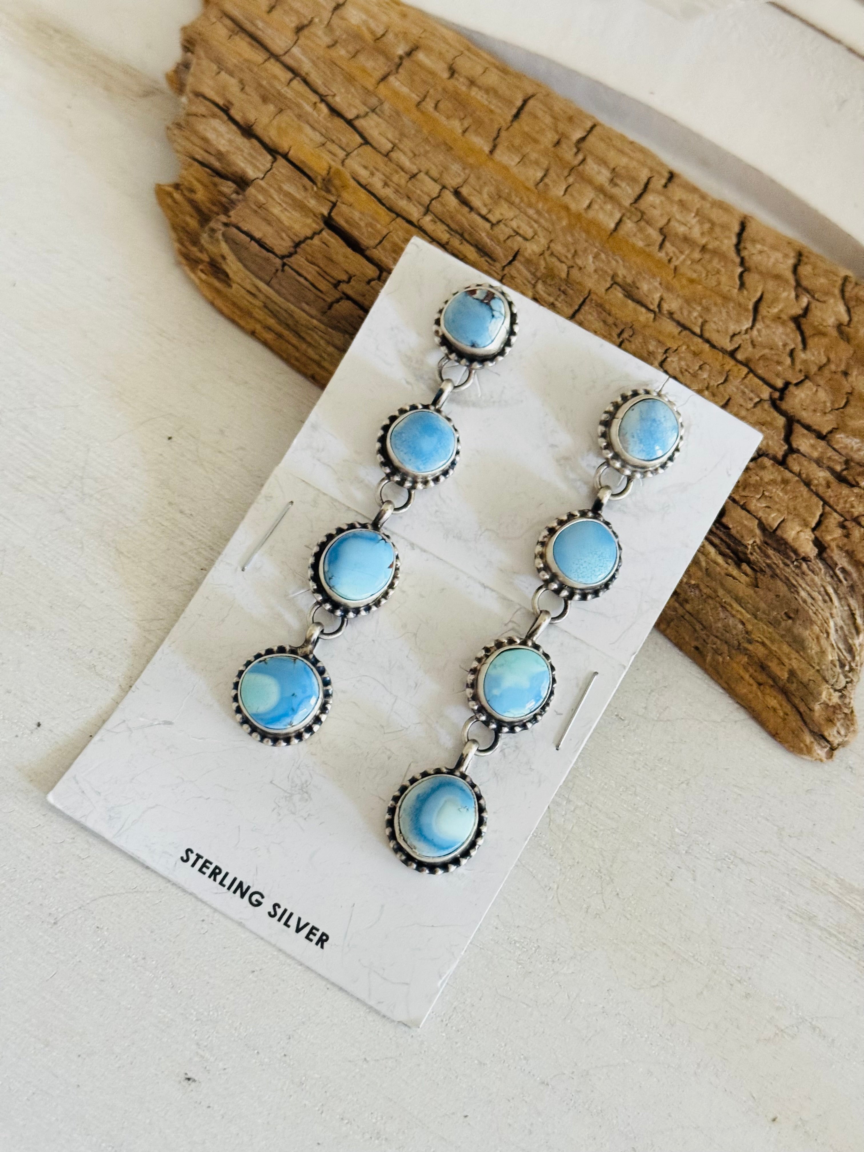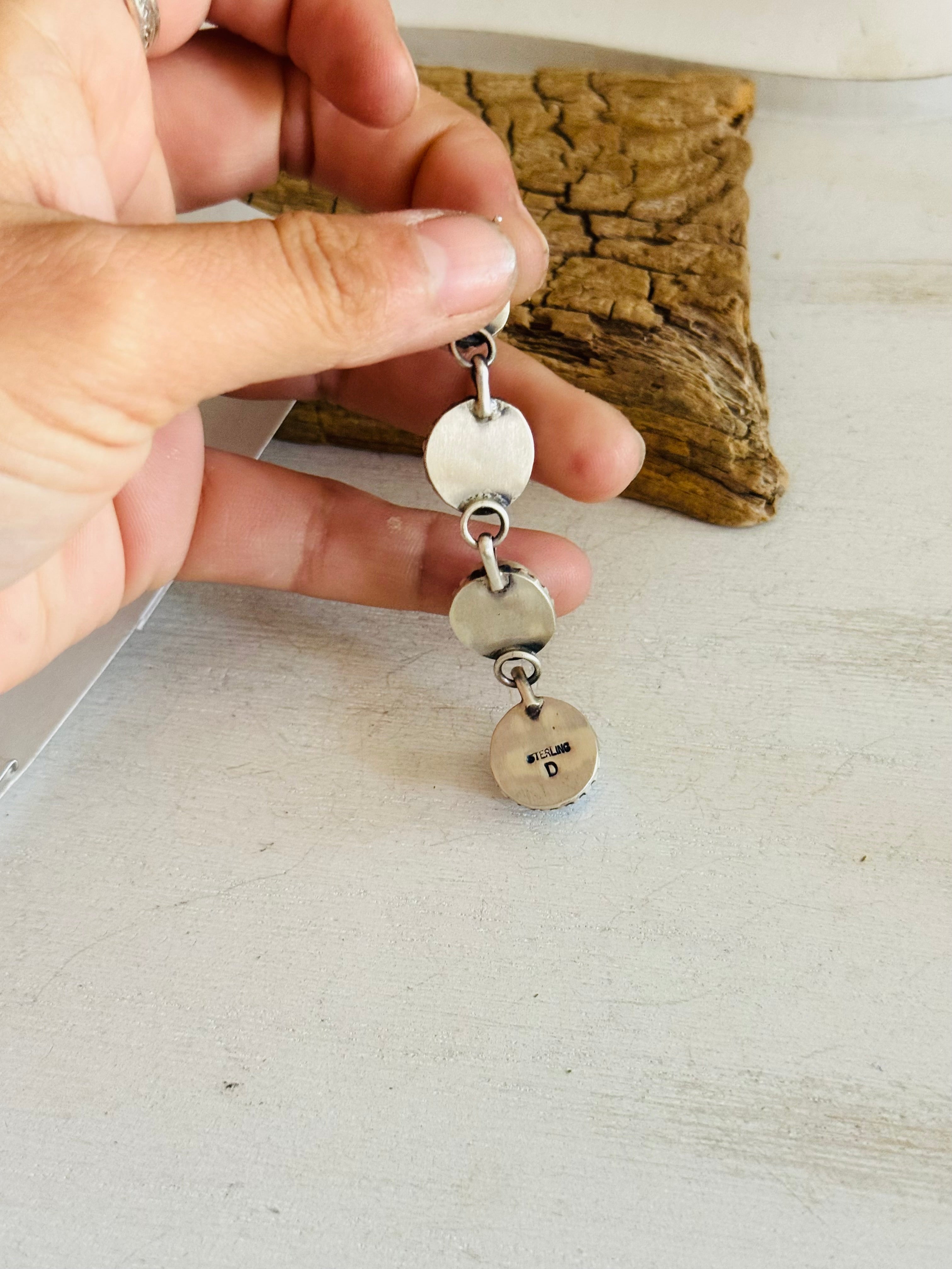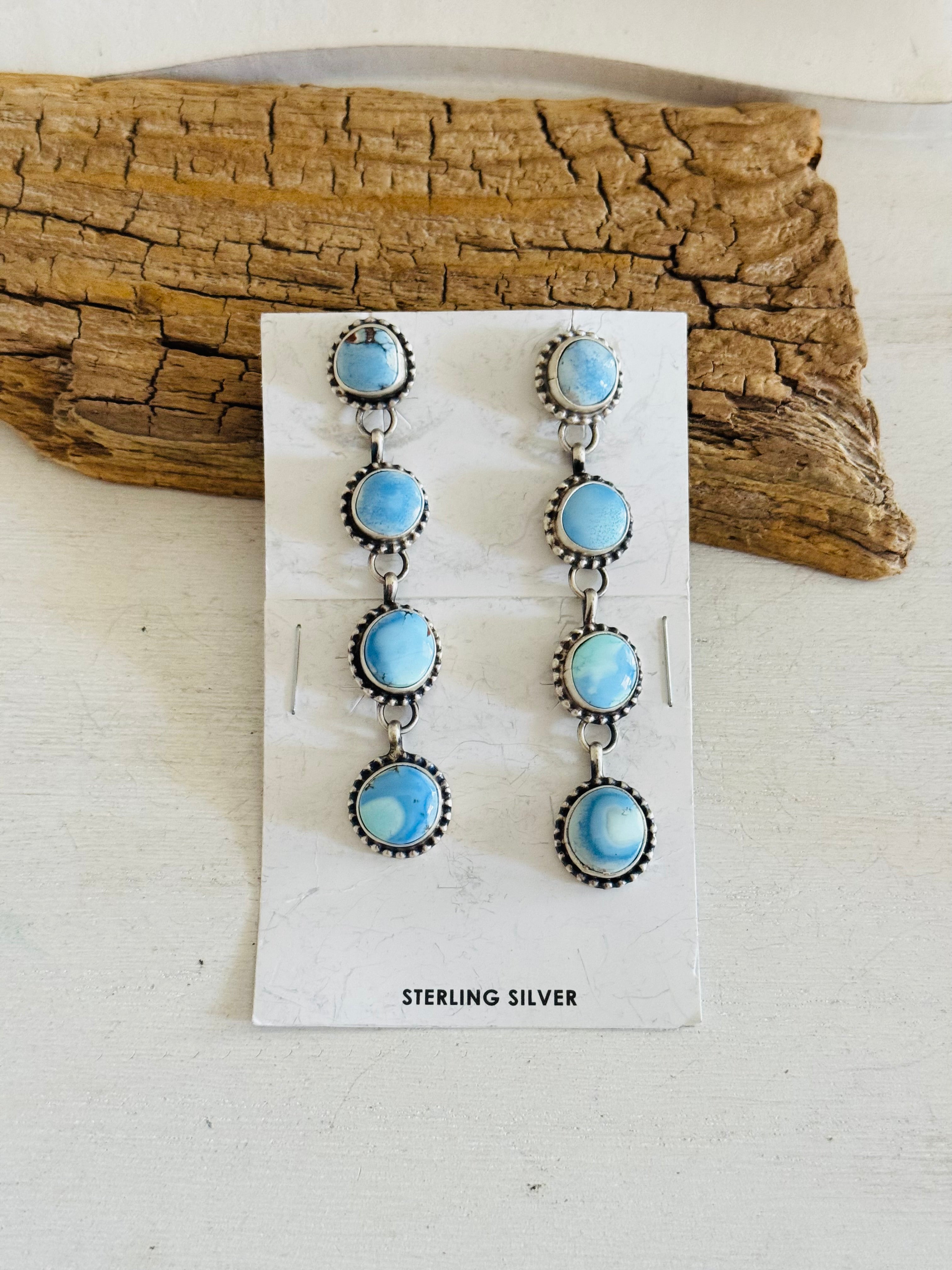 Navajo Made Golden Hills Turquoise & Sterling Silver Post Dangle Earrings. It measures 3 1/8 inches long and 1/2 of an inch wide. Signed by artist and stamped sterling silver.