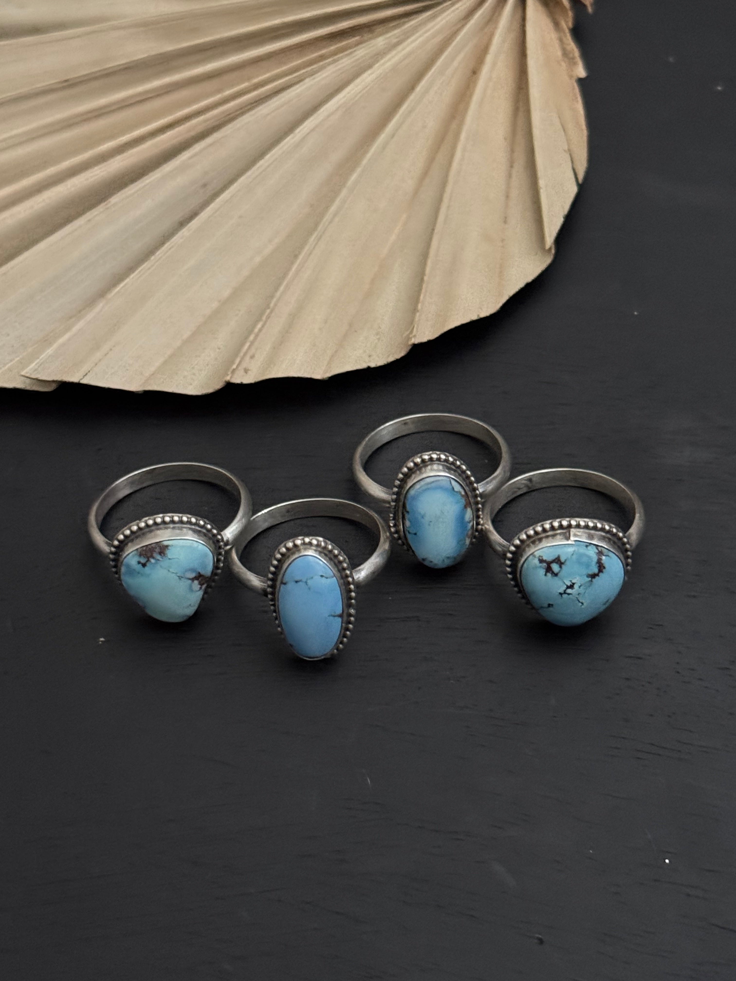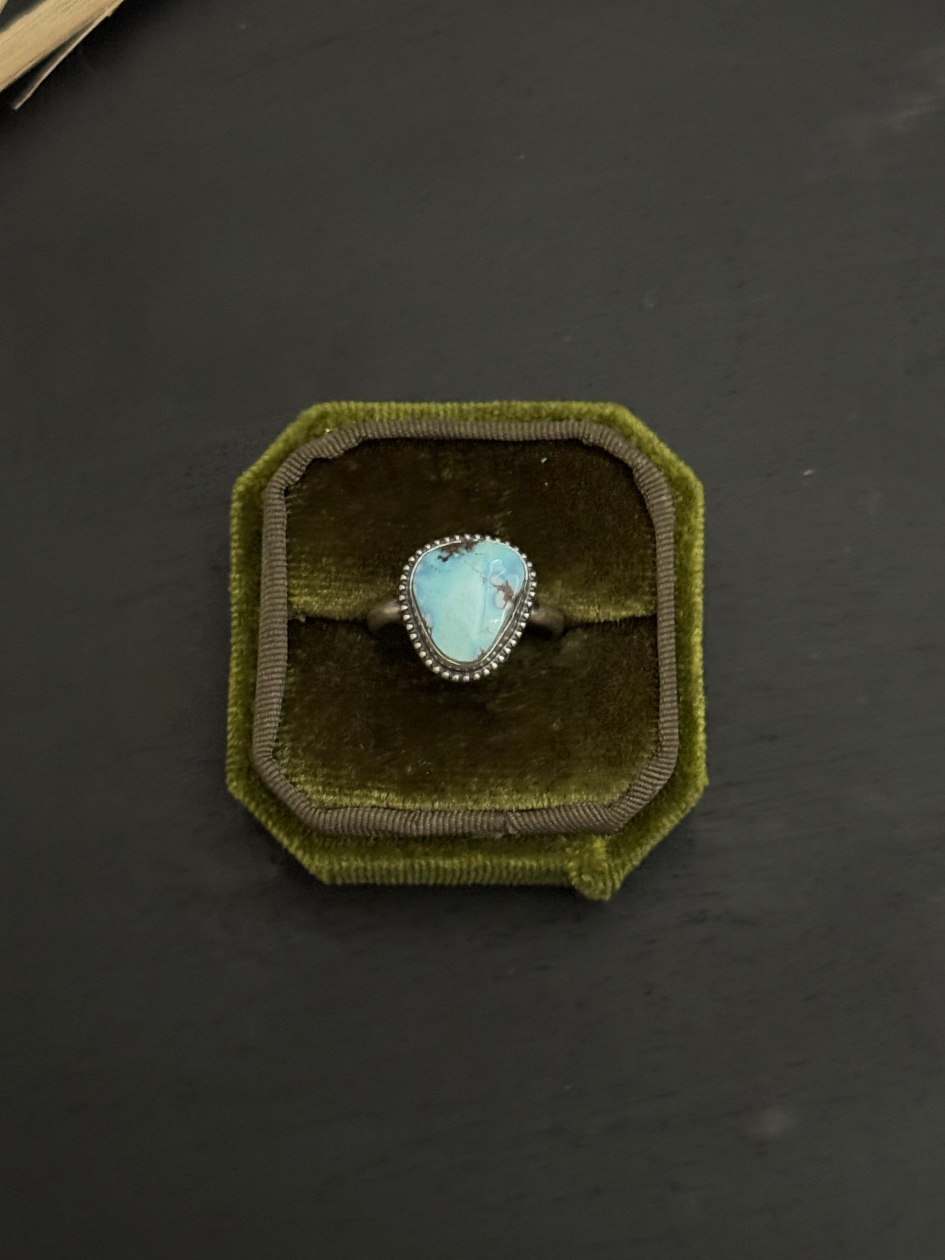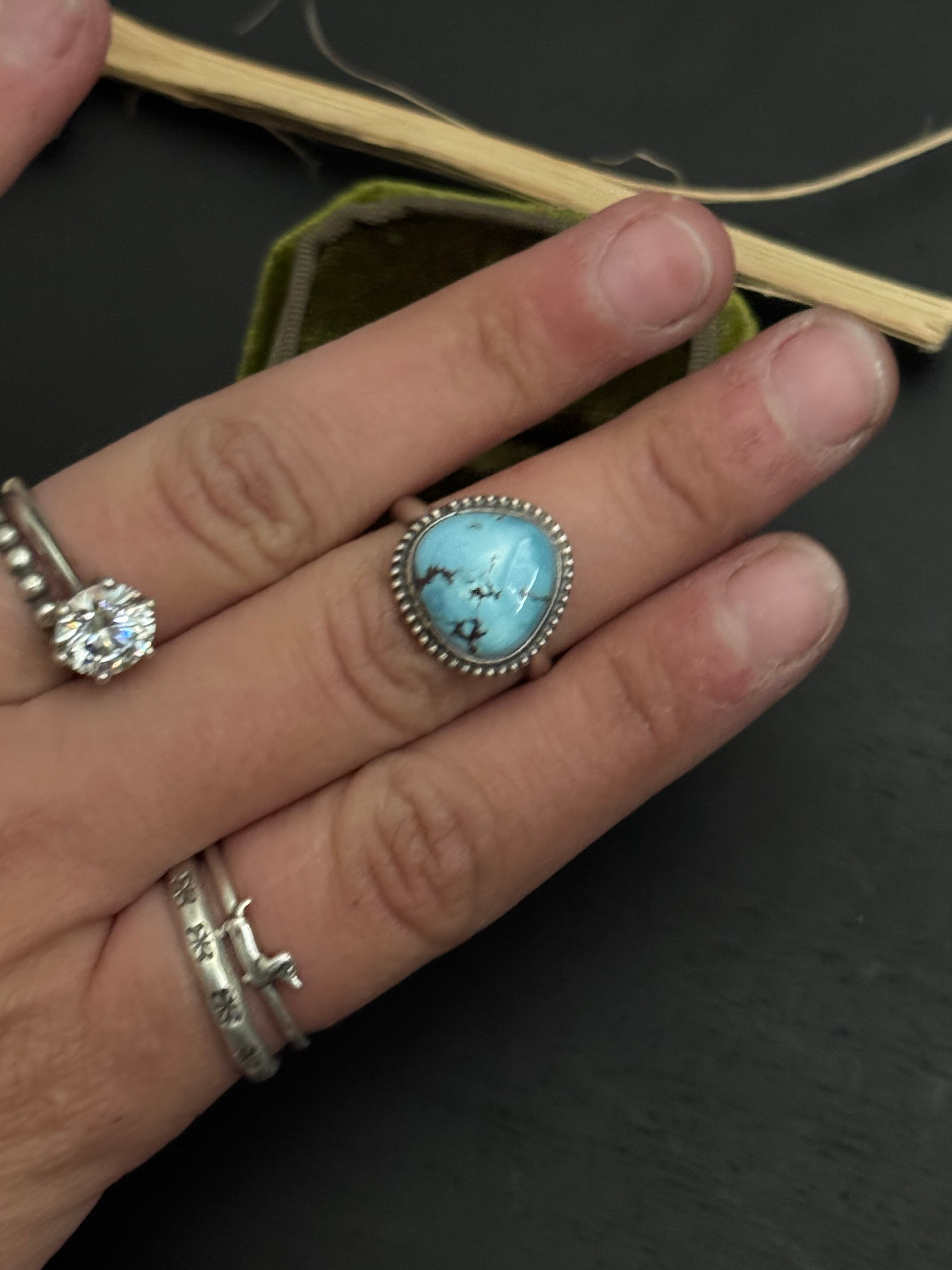 This is an awesome ring. Navajo Made Golden Hills Turquoise & Sterling Silver Ring. It measures 5/8 of an inch long. Stamped and signed. Stones will vary due to natural stones.