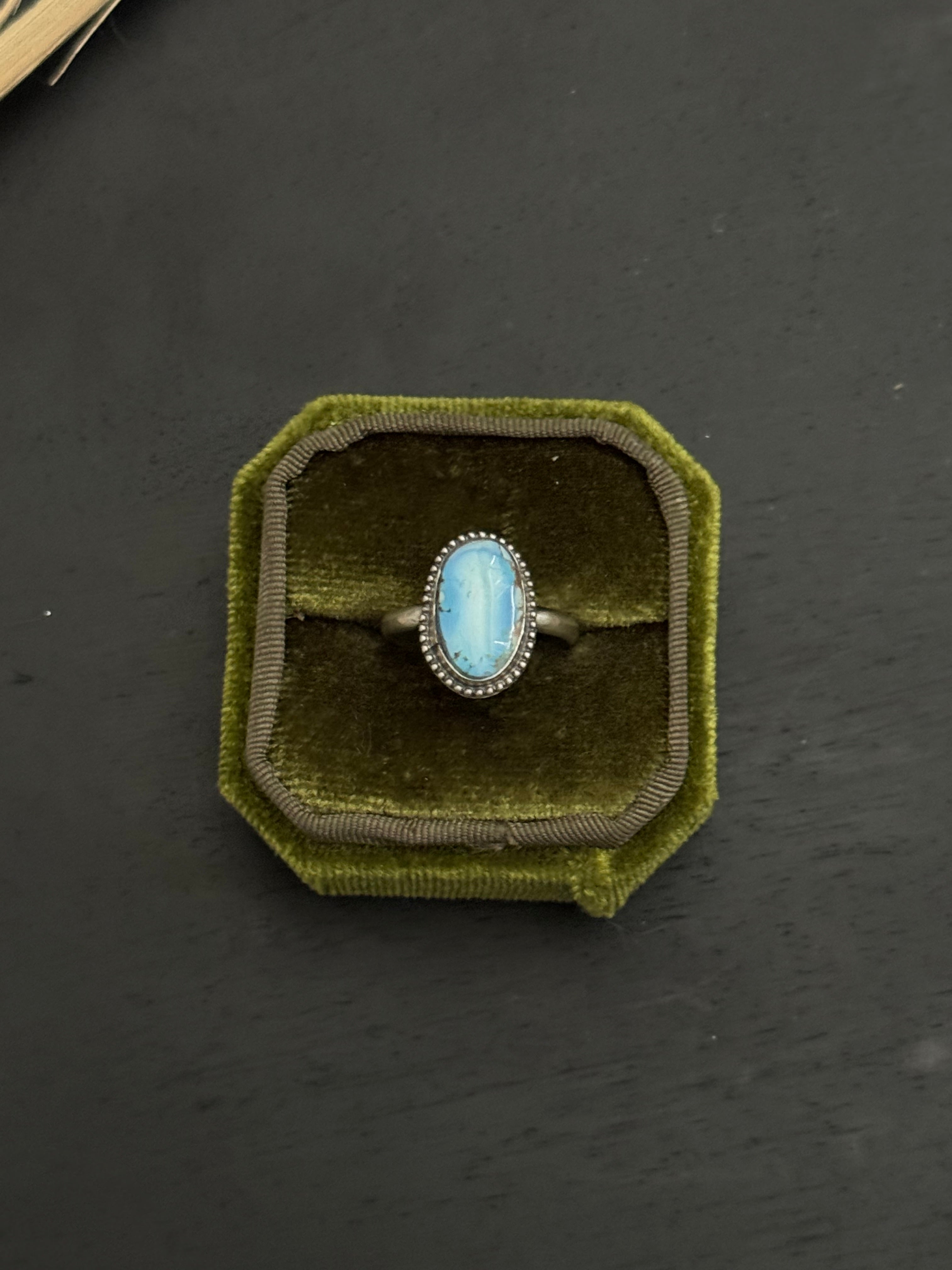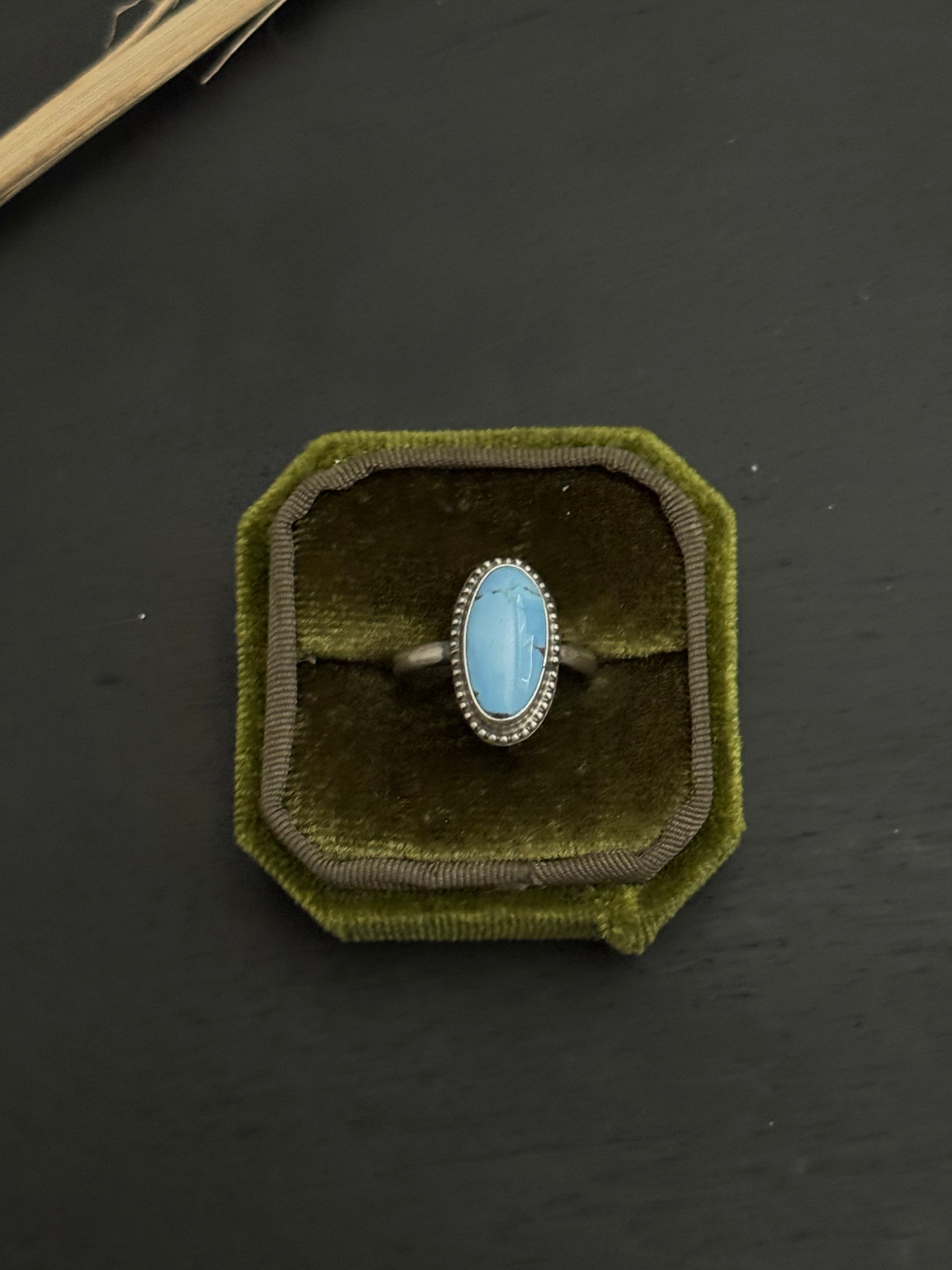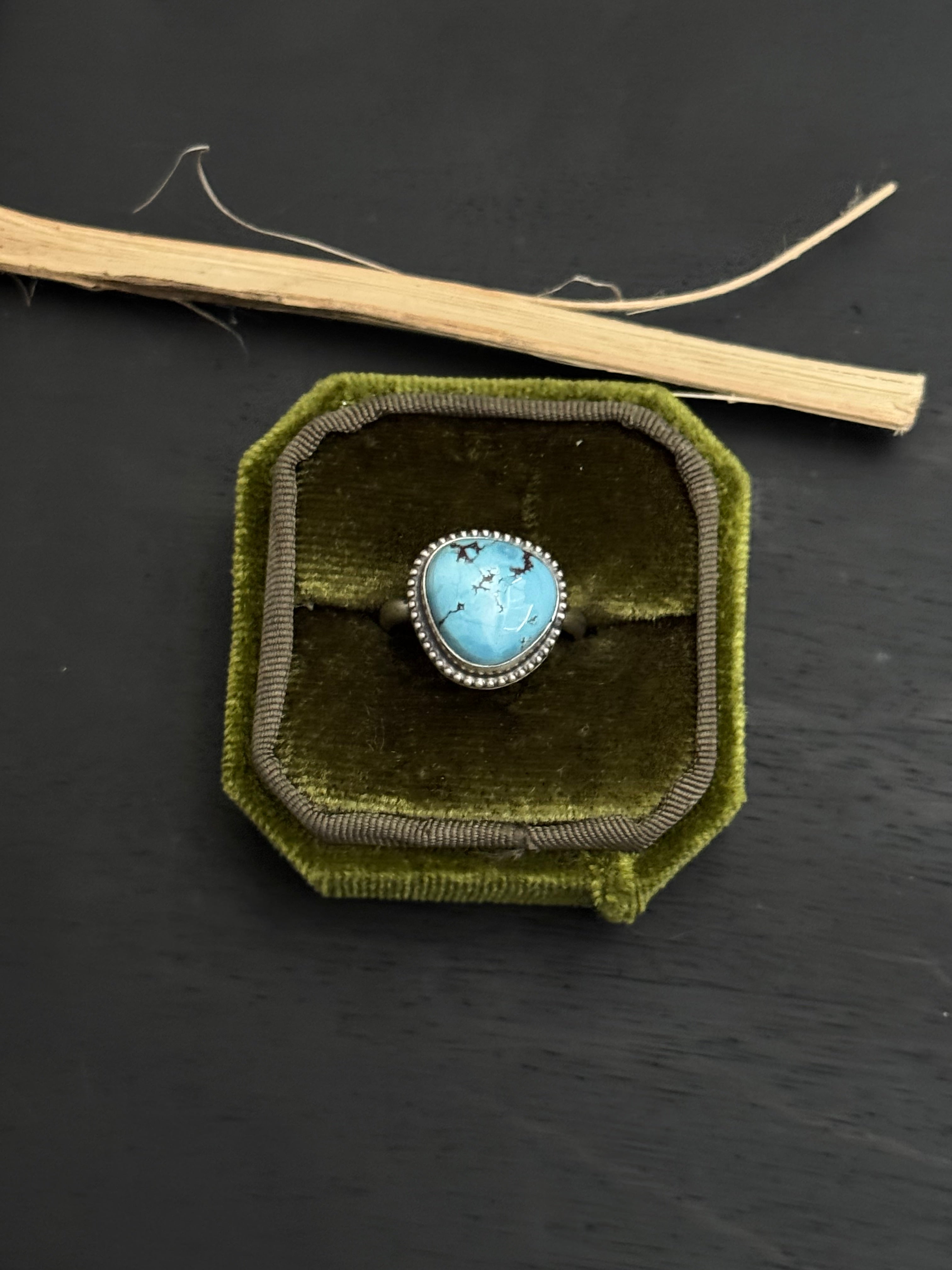 This is an awesome ring. Navajo Made Golden Hills Turquoise & Sterling Silver Ring. It measures 5/8 of an inch long. Stamped and signed. Stones will vary due to natural stones.