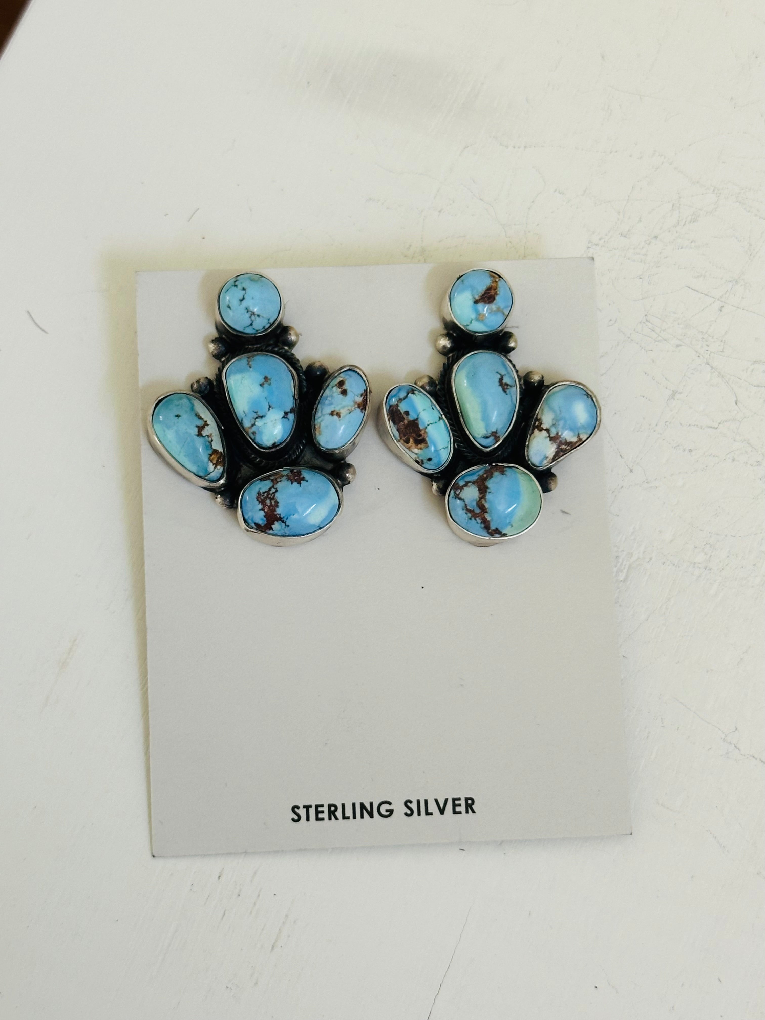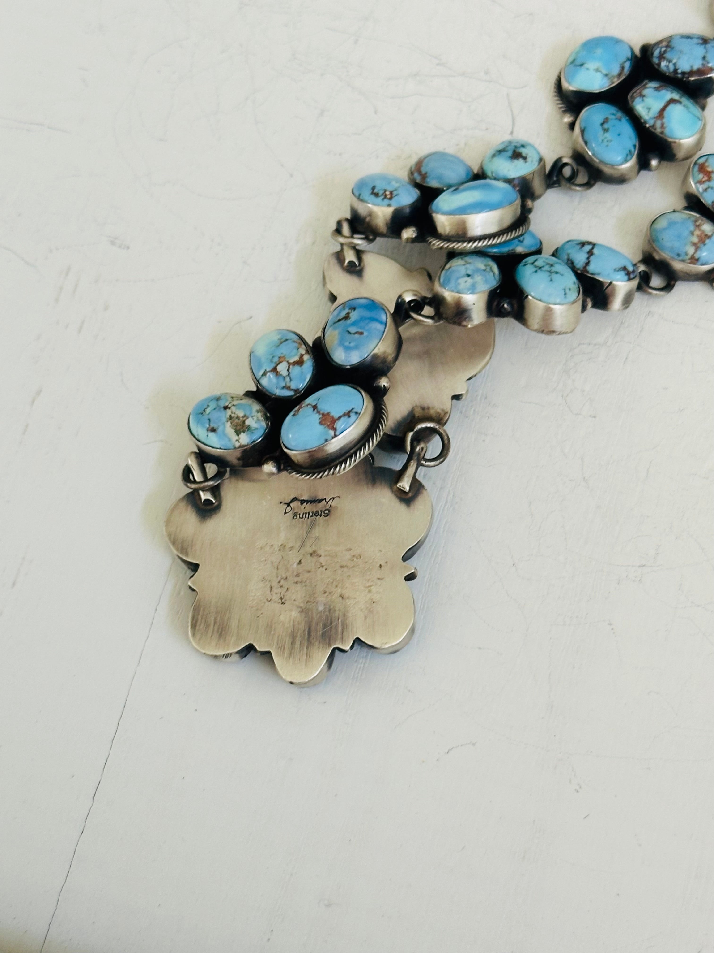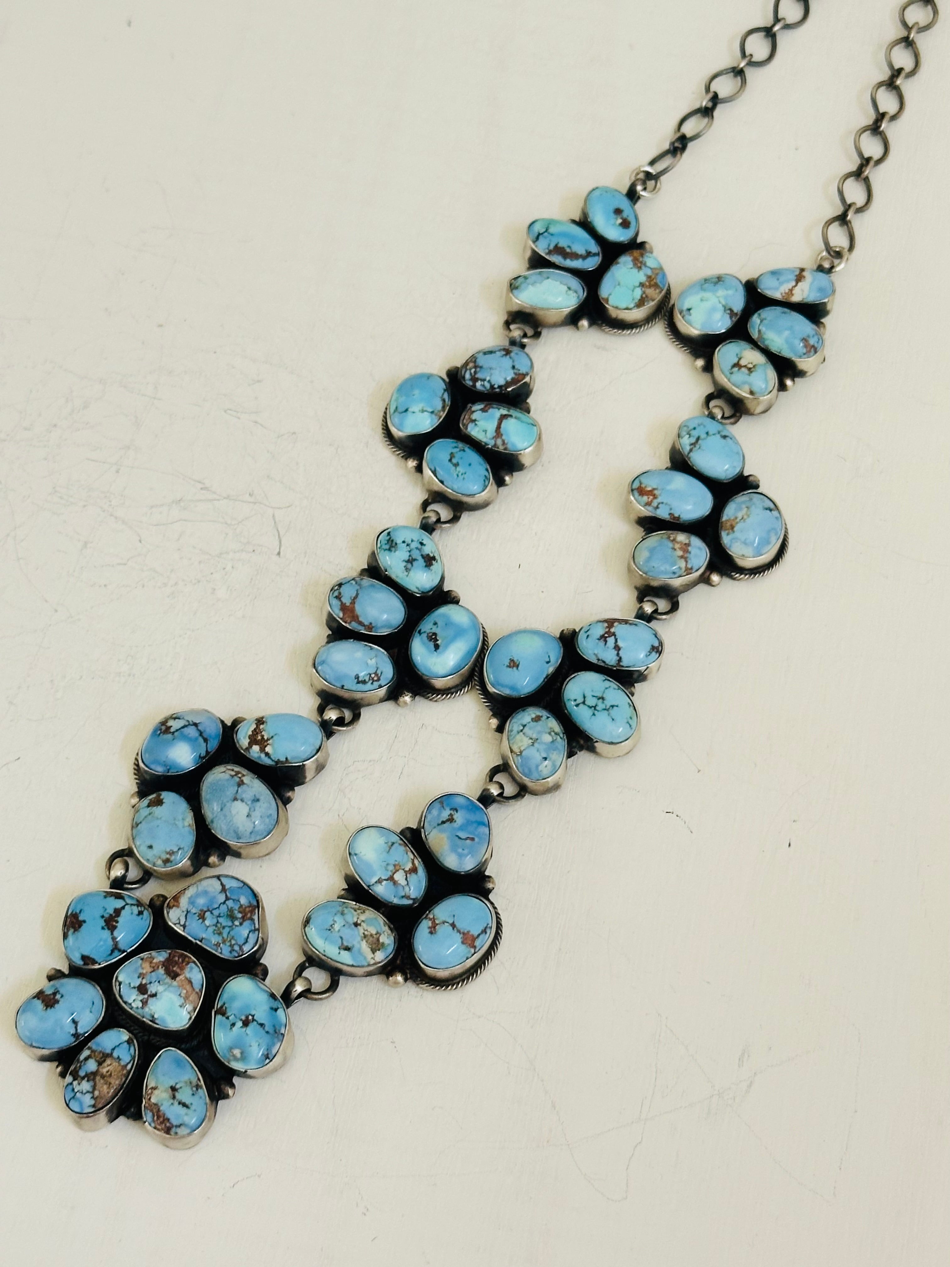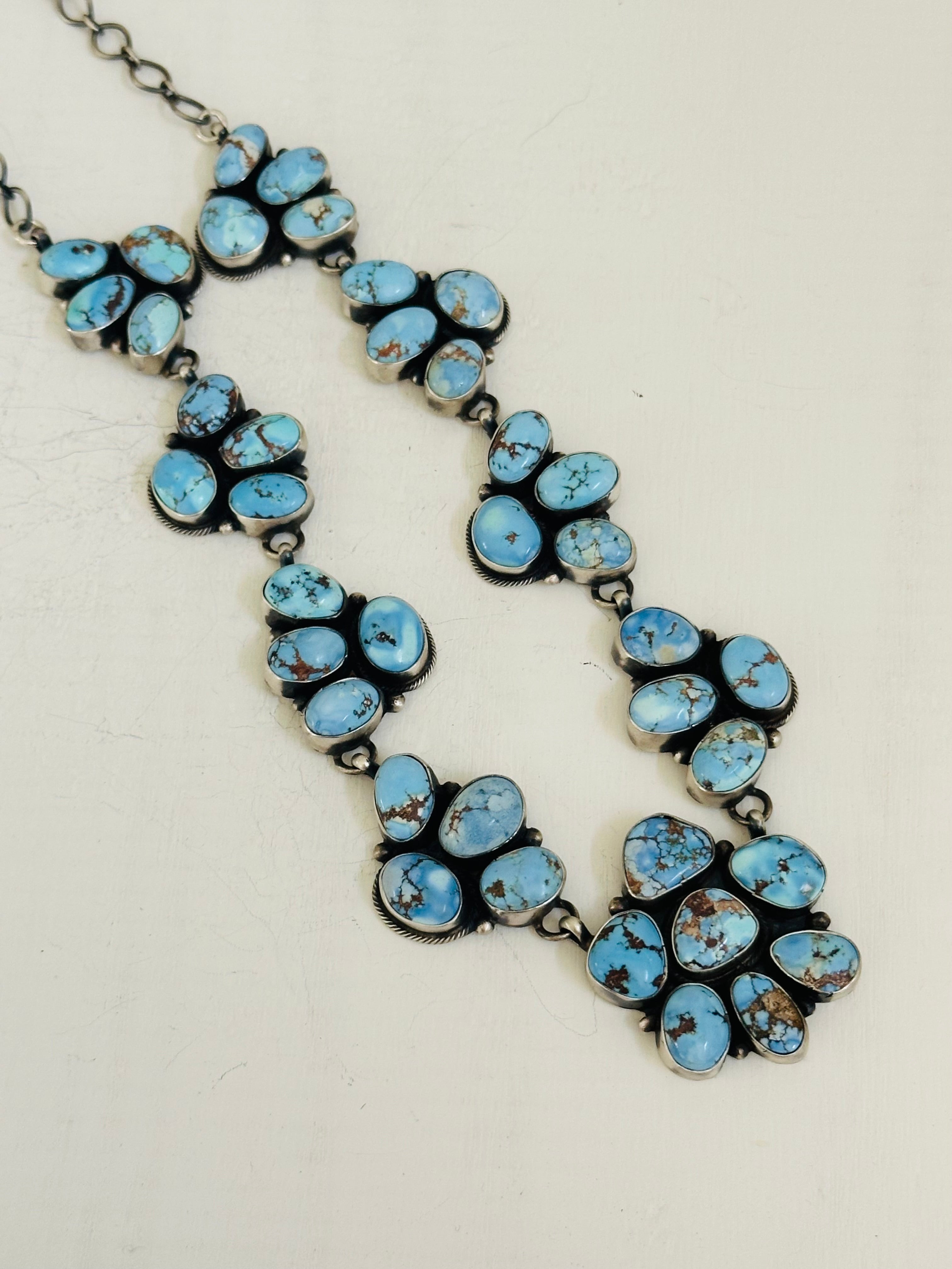 Beautiful Squash Blossom Necklace and Earring set. Navajo Made Golden Hills Turquoise & Sterling Silver Cluster Necklace Set. It measures 27 inches long with hang while the chain measures 24 inches long. Signed by the artist and stamped sterling silver.