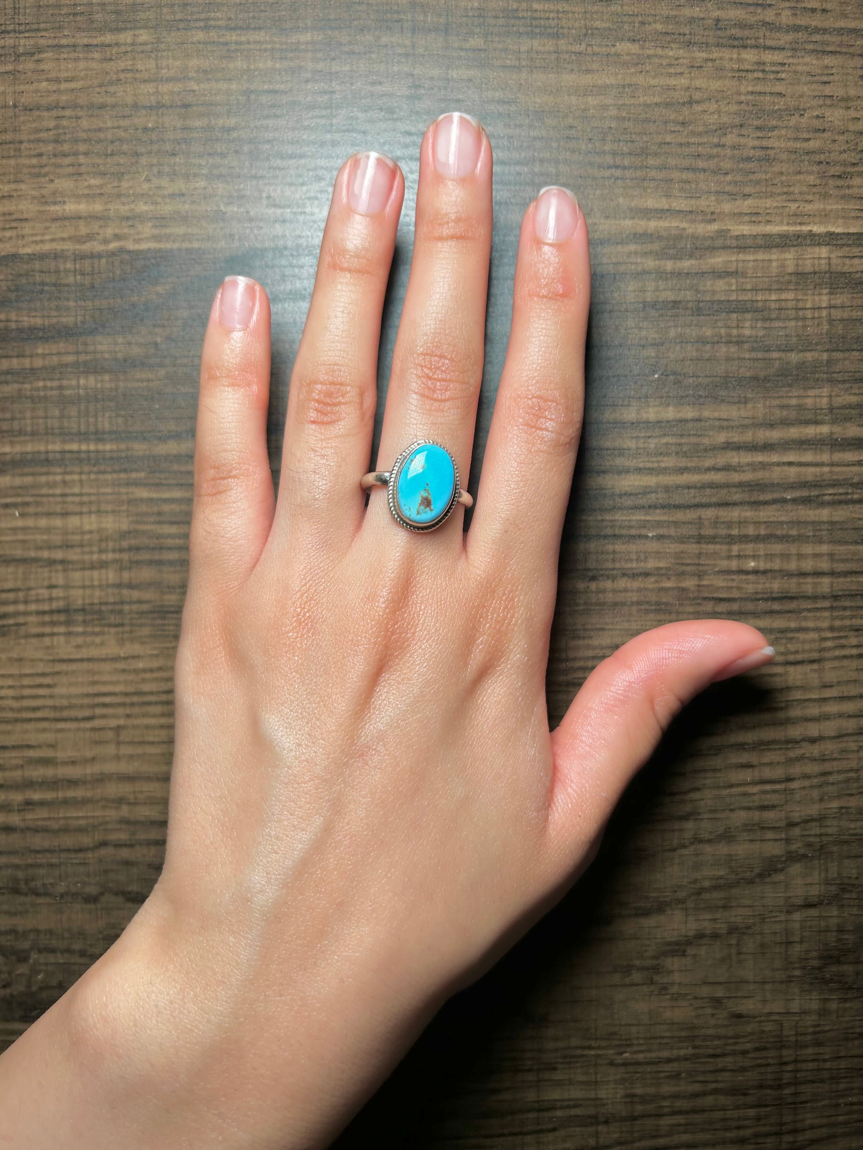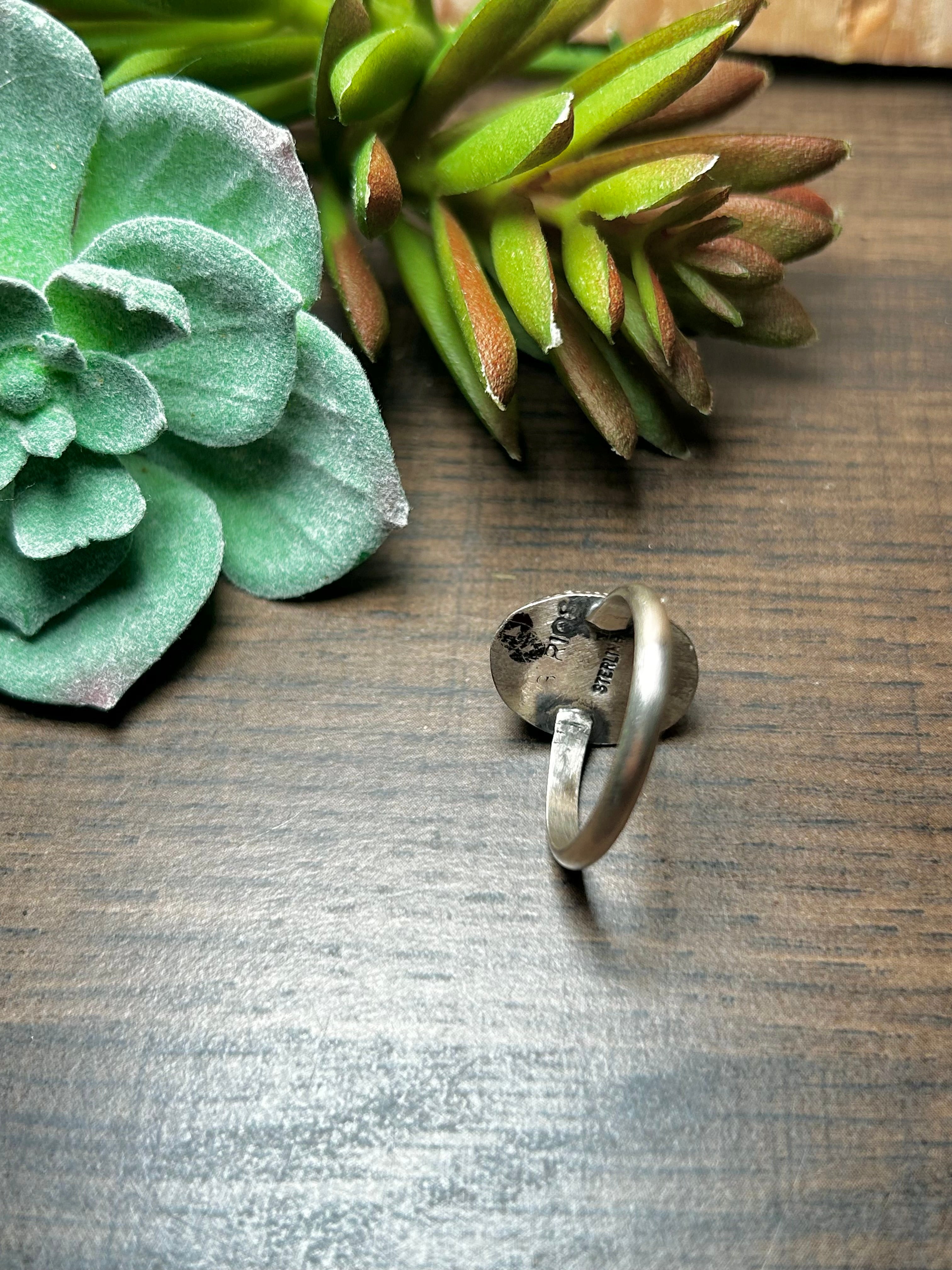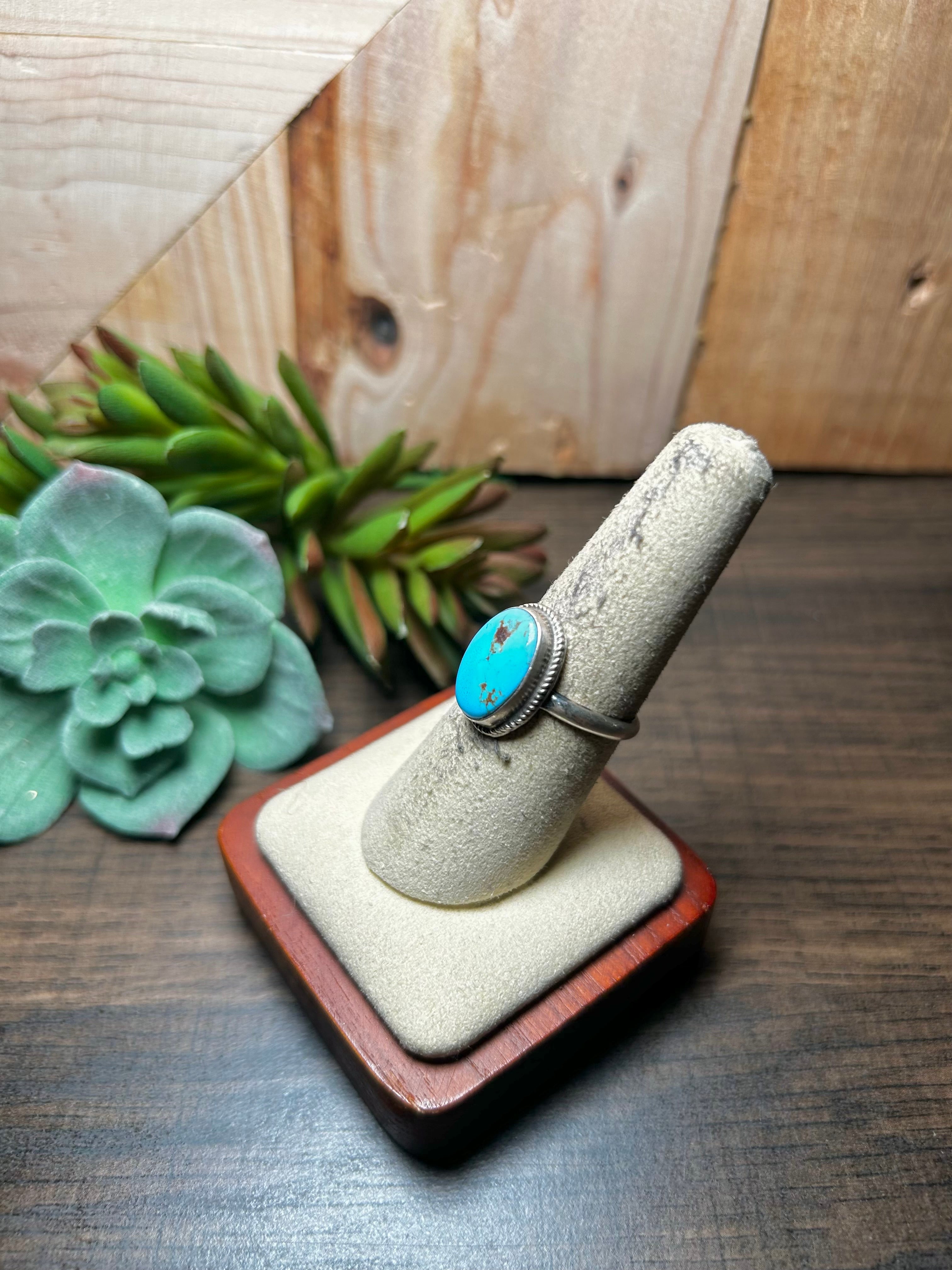 Navajo Made Golden Turquoise & Sterling Silver Ring Size 8. It measures 5/8 of an inch long and 1/2 of an inch wide.